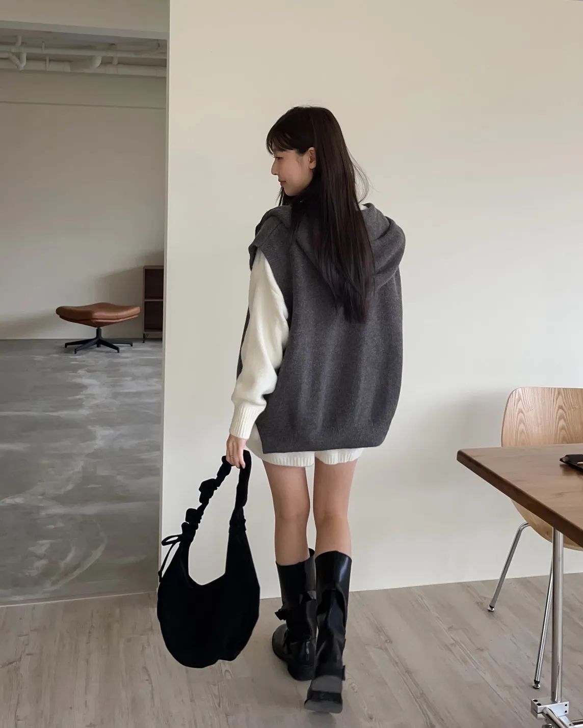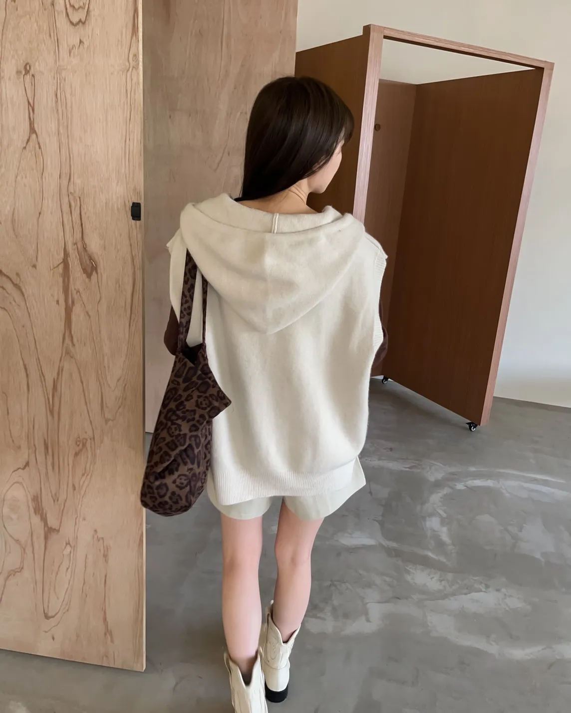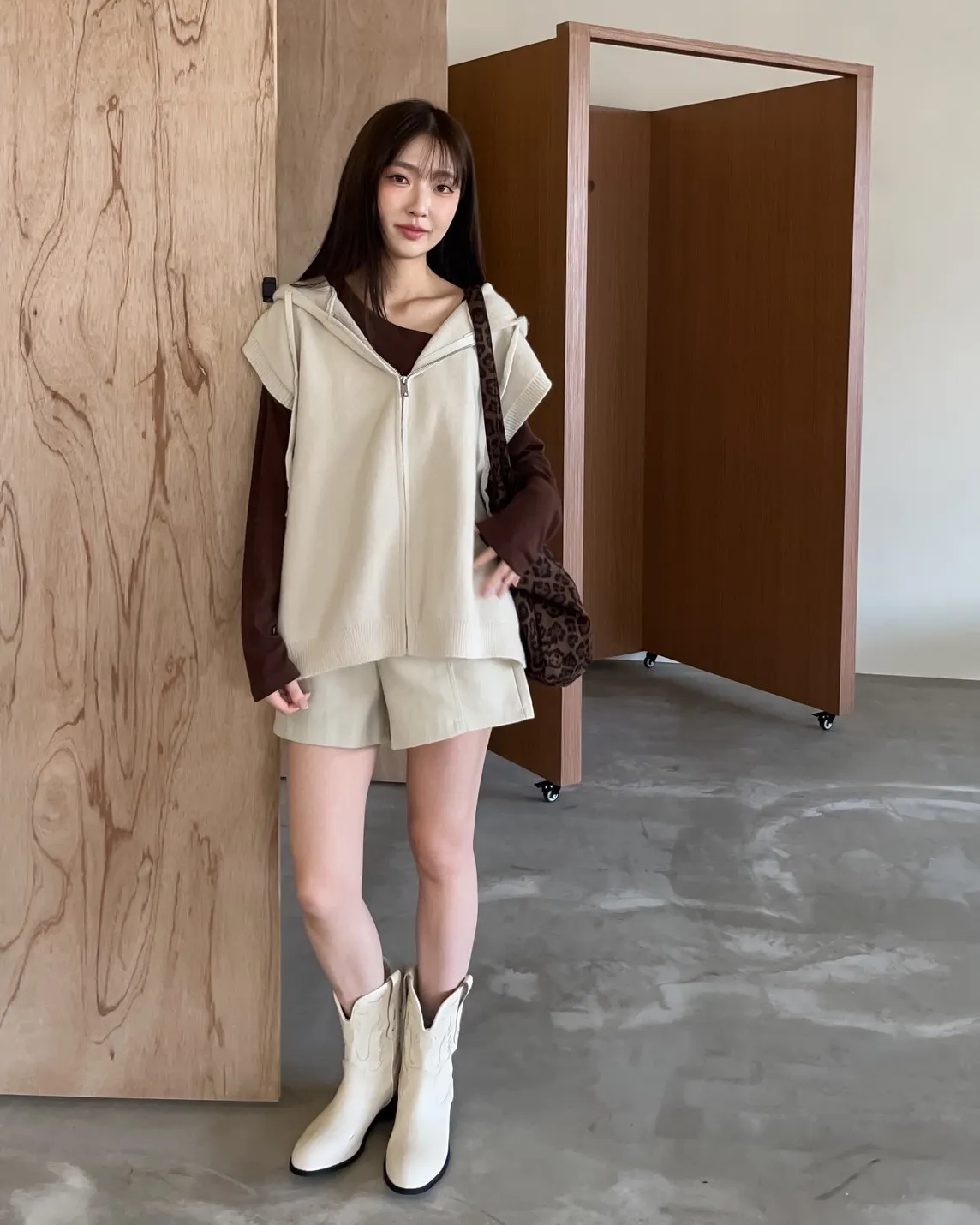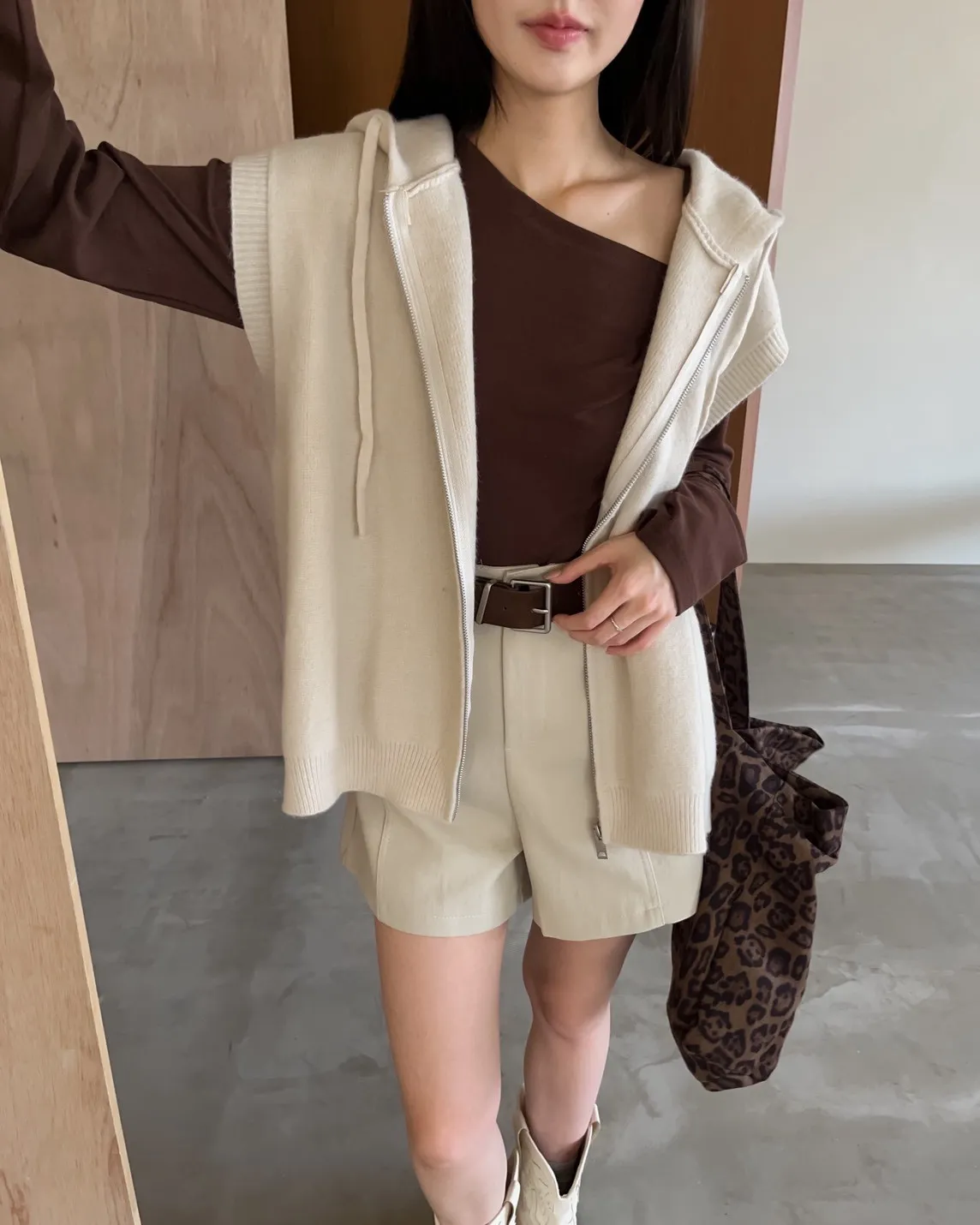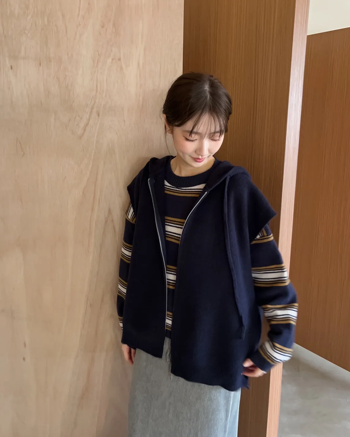 W0009隨性落肩有拉鍊連帽針織背心(杏/綠/灰/深藍)