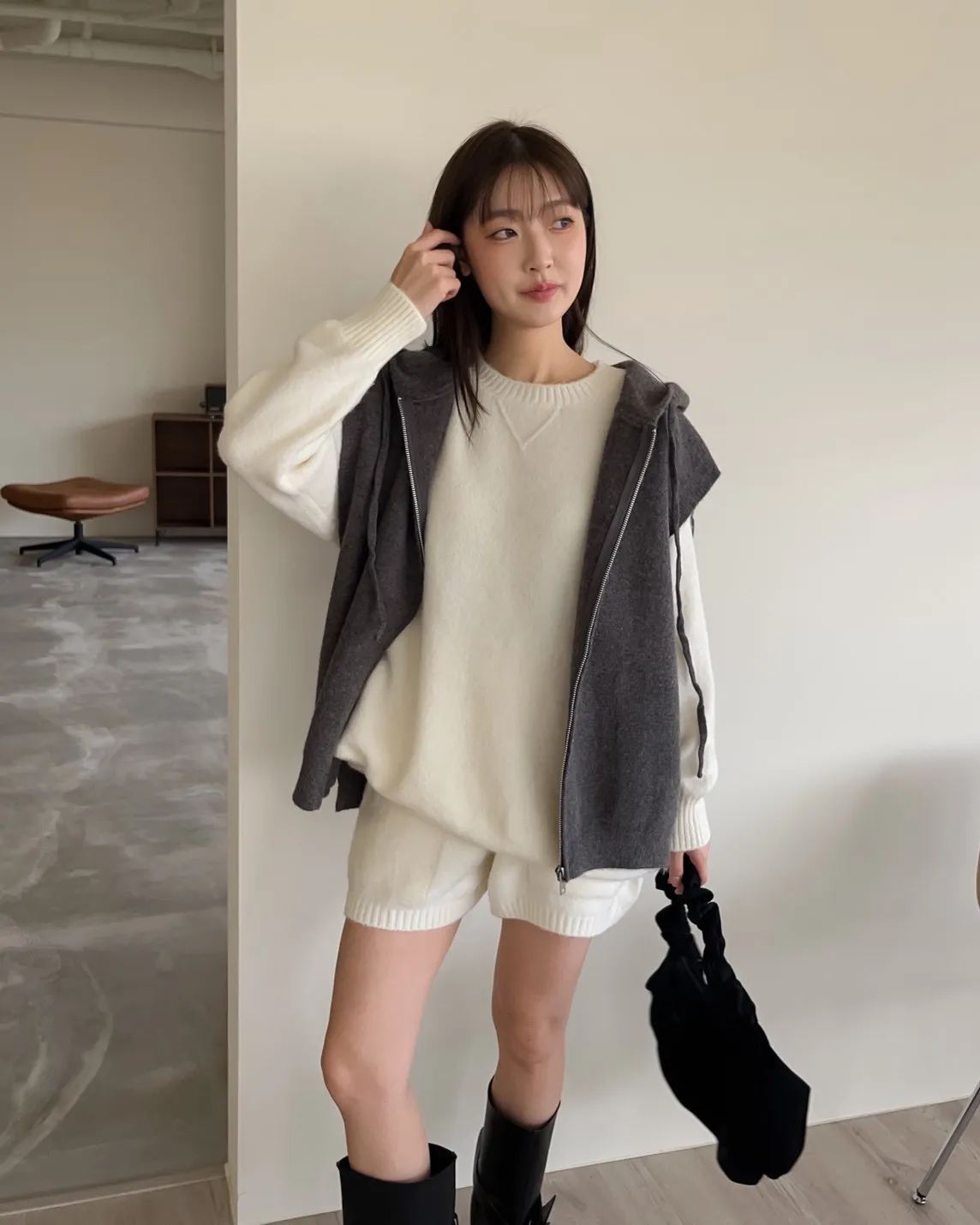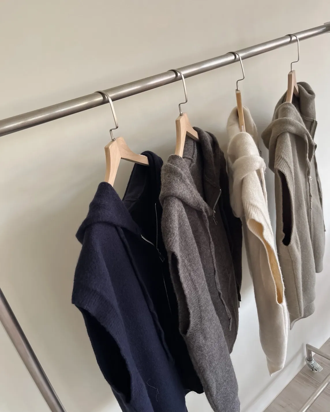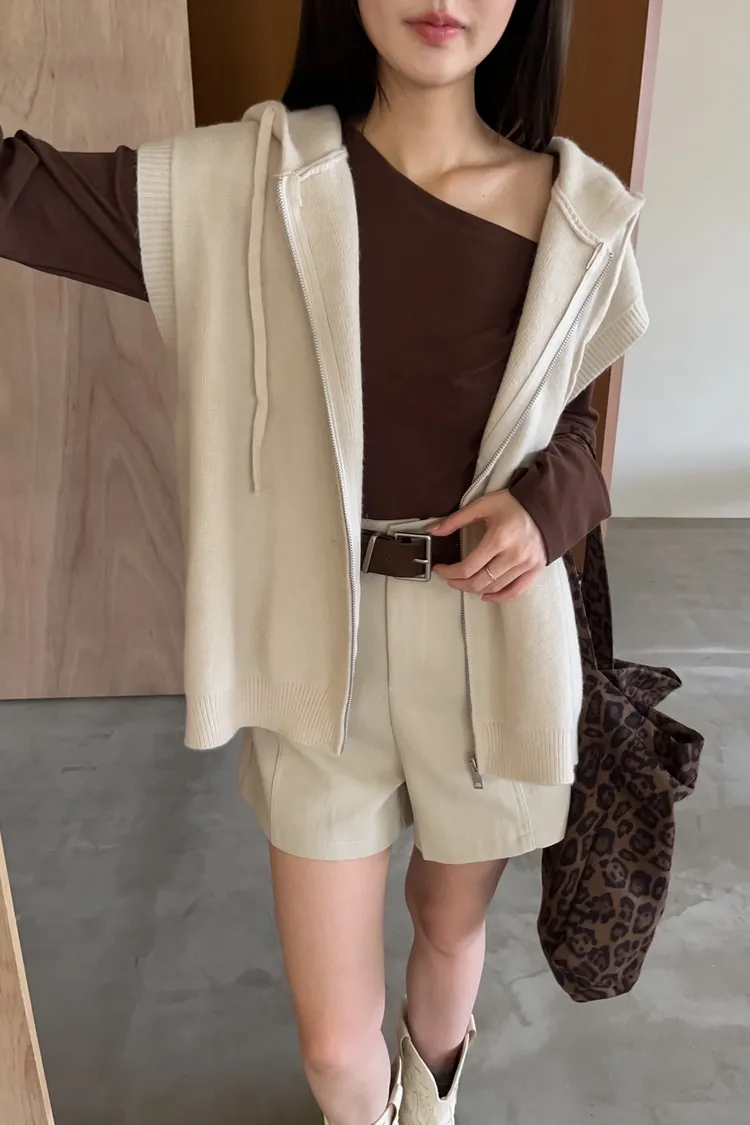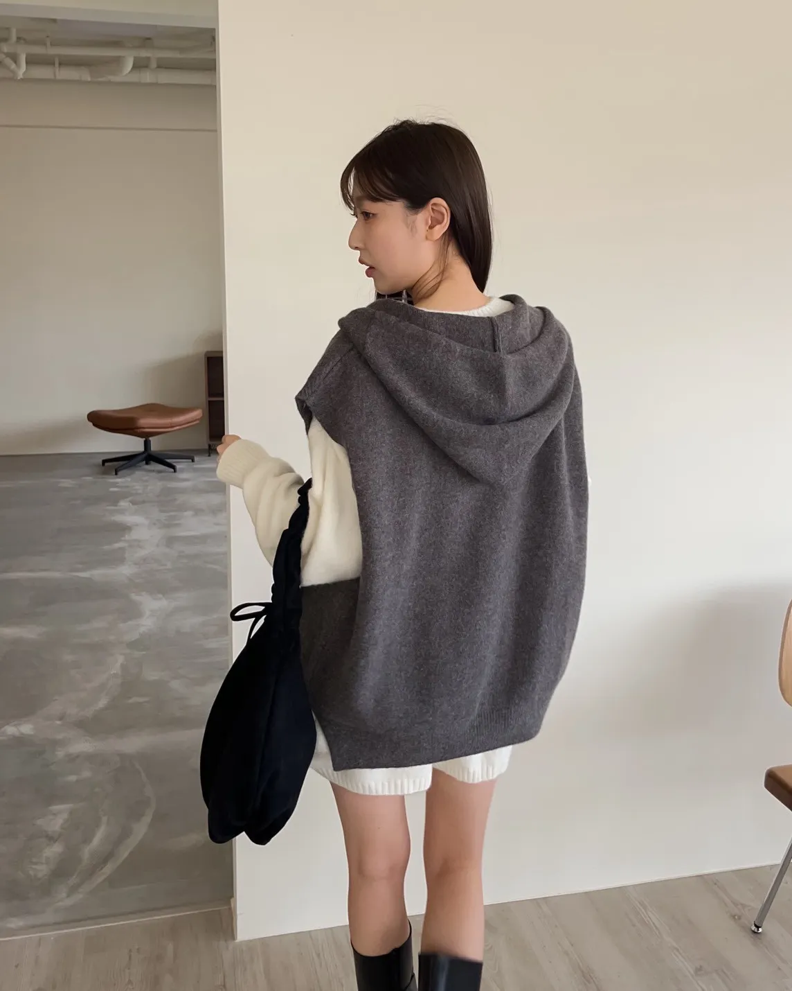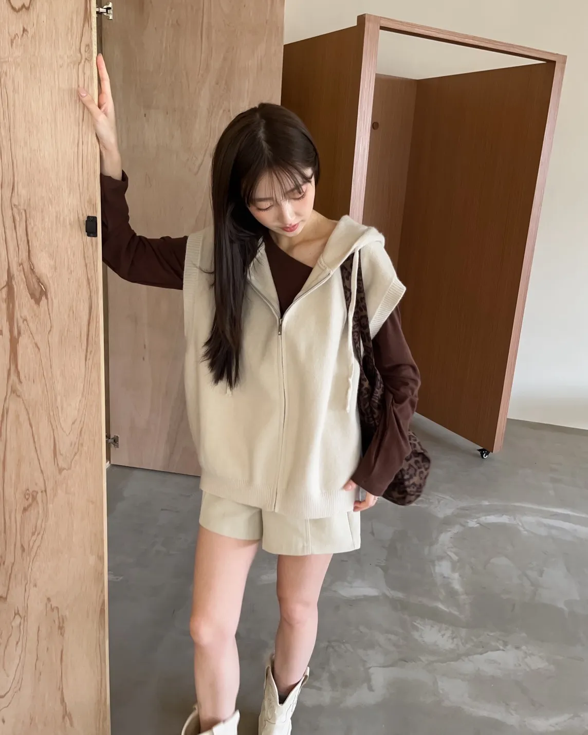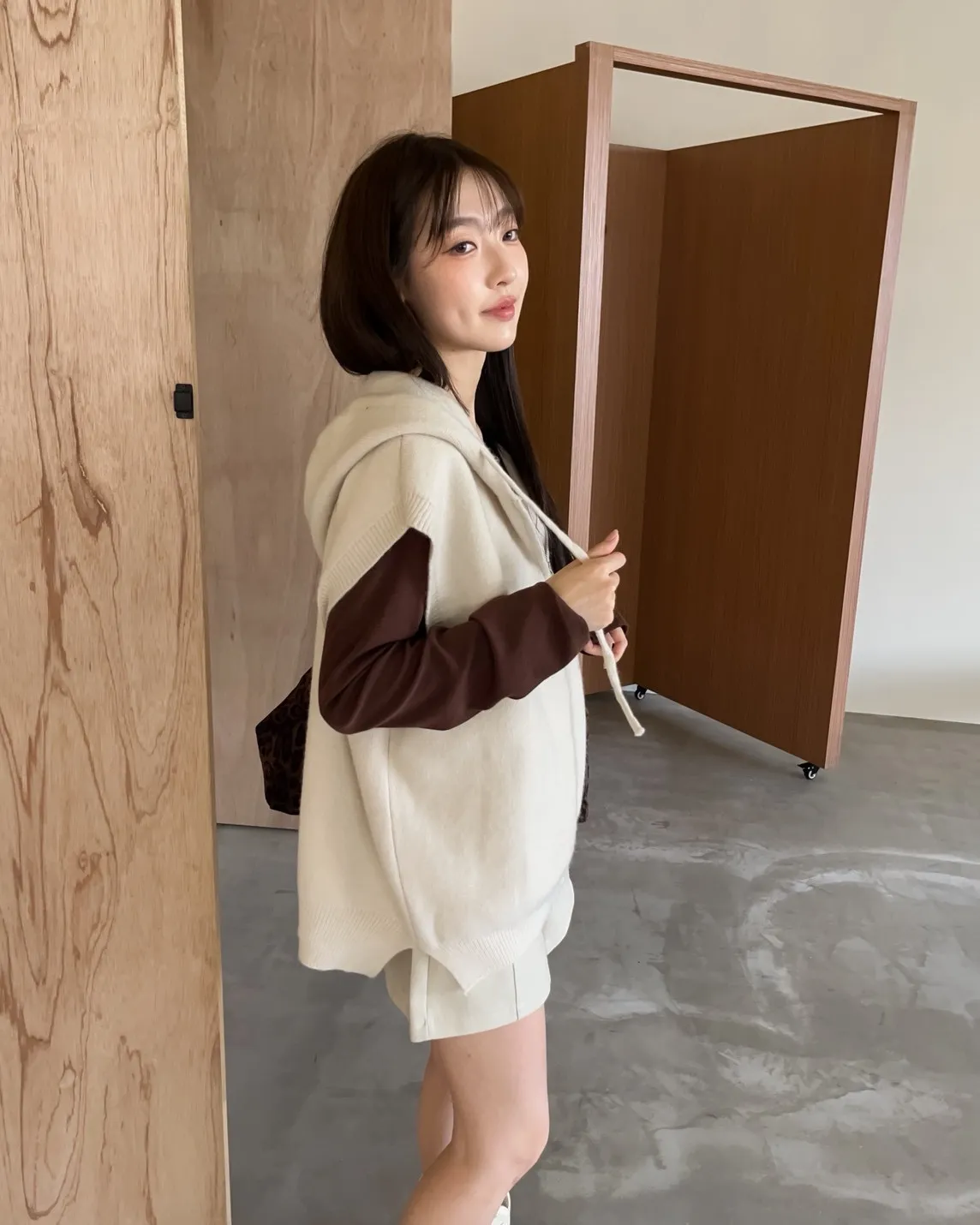 W0009隨性落肩有拉鍊連帽針織背心(杏/綠/灰/深藍)