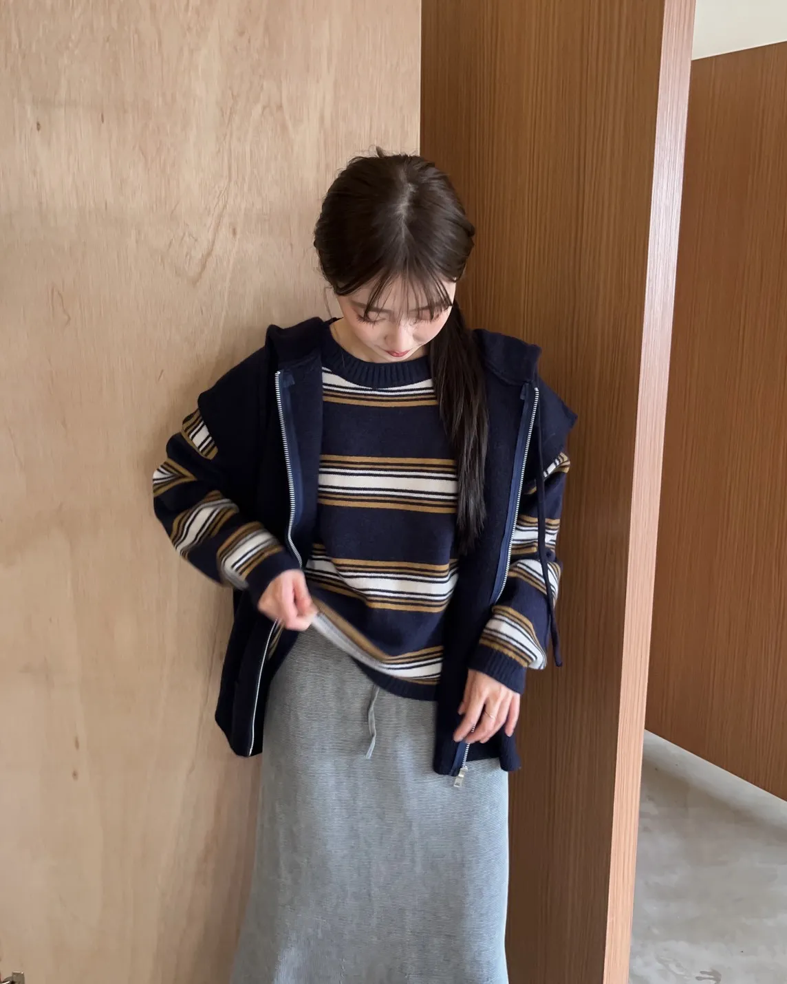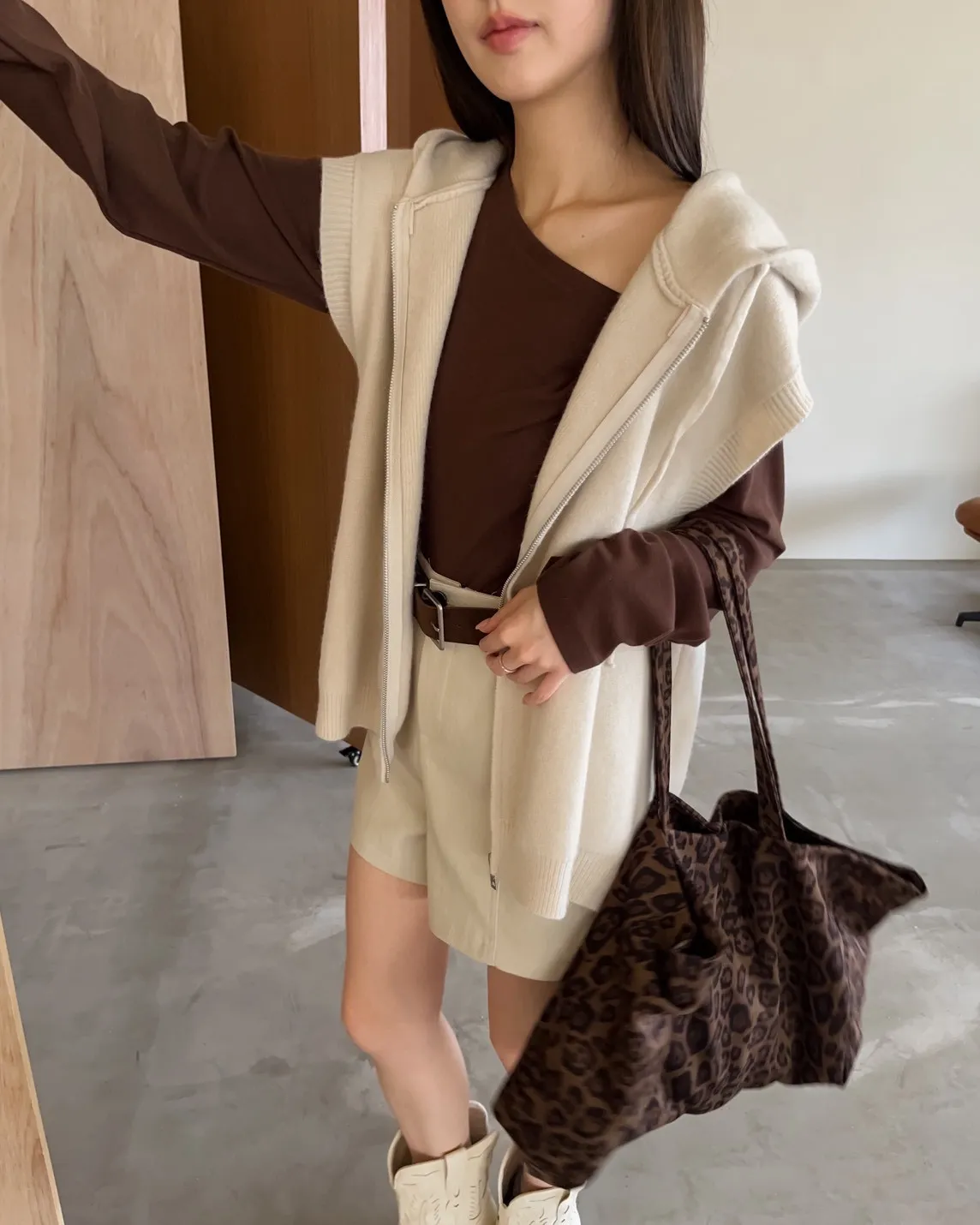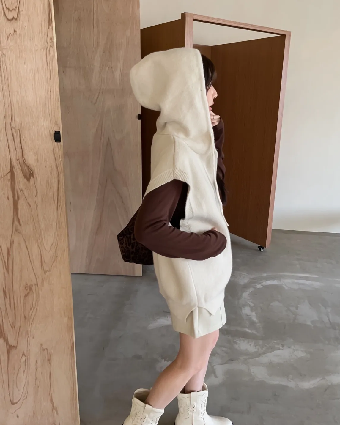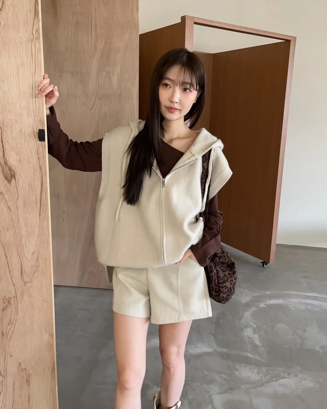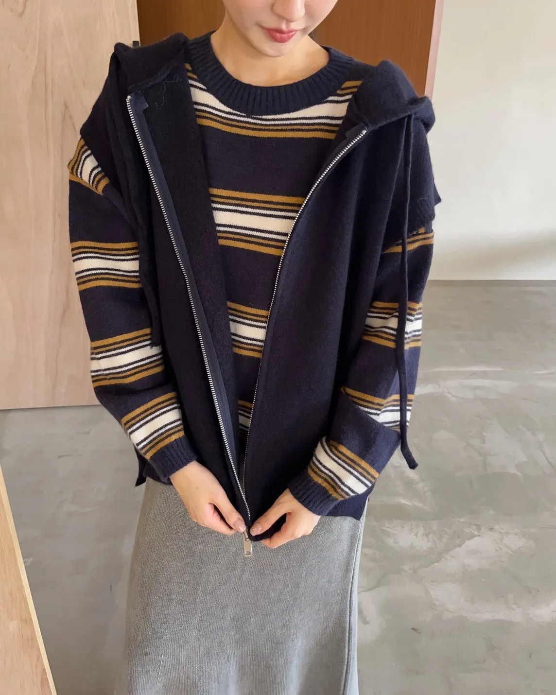 W0009隨性落肩有拉鍊連帽針織背心(杏/綠/灰/深藍)