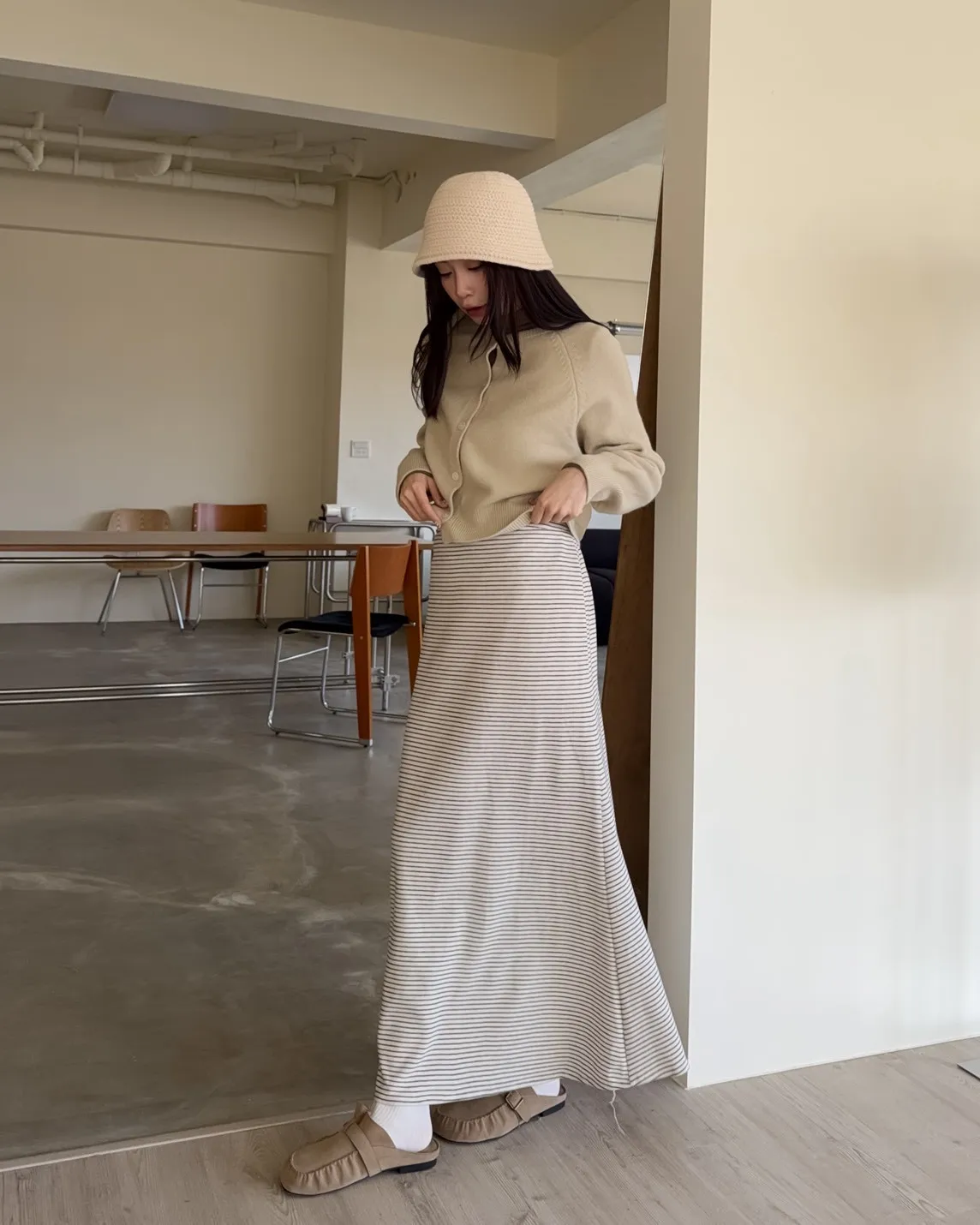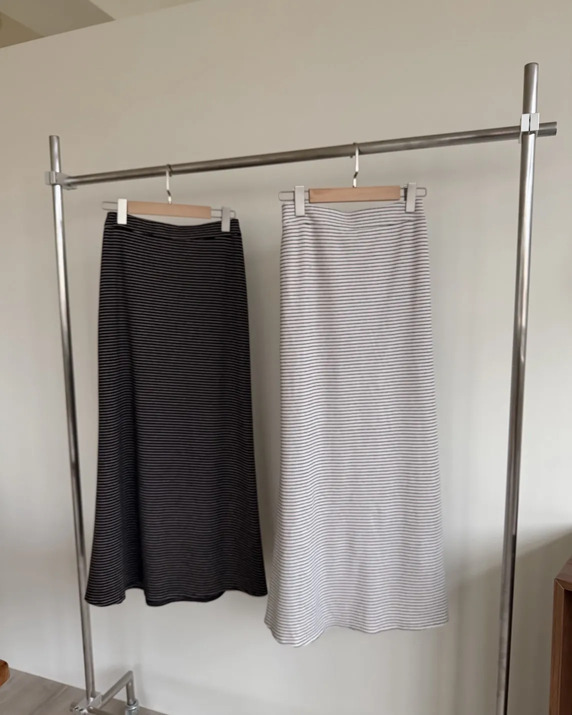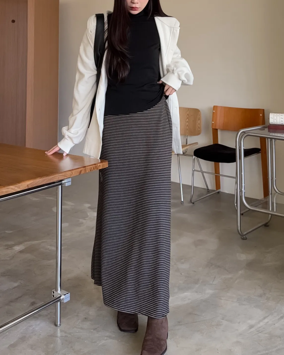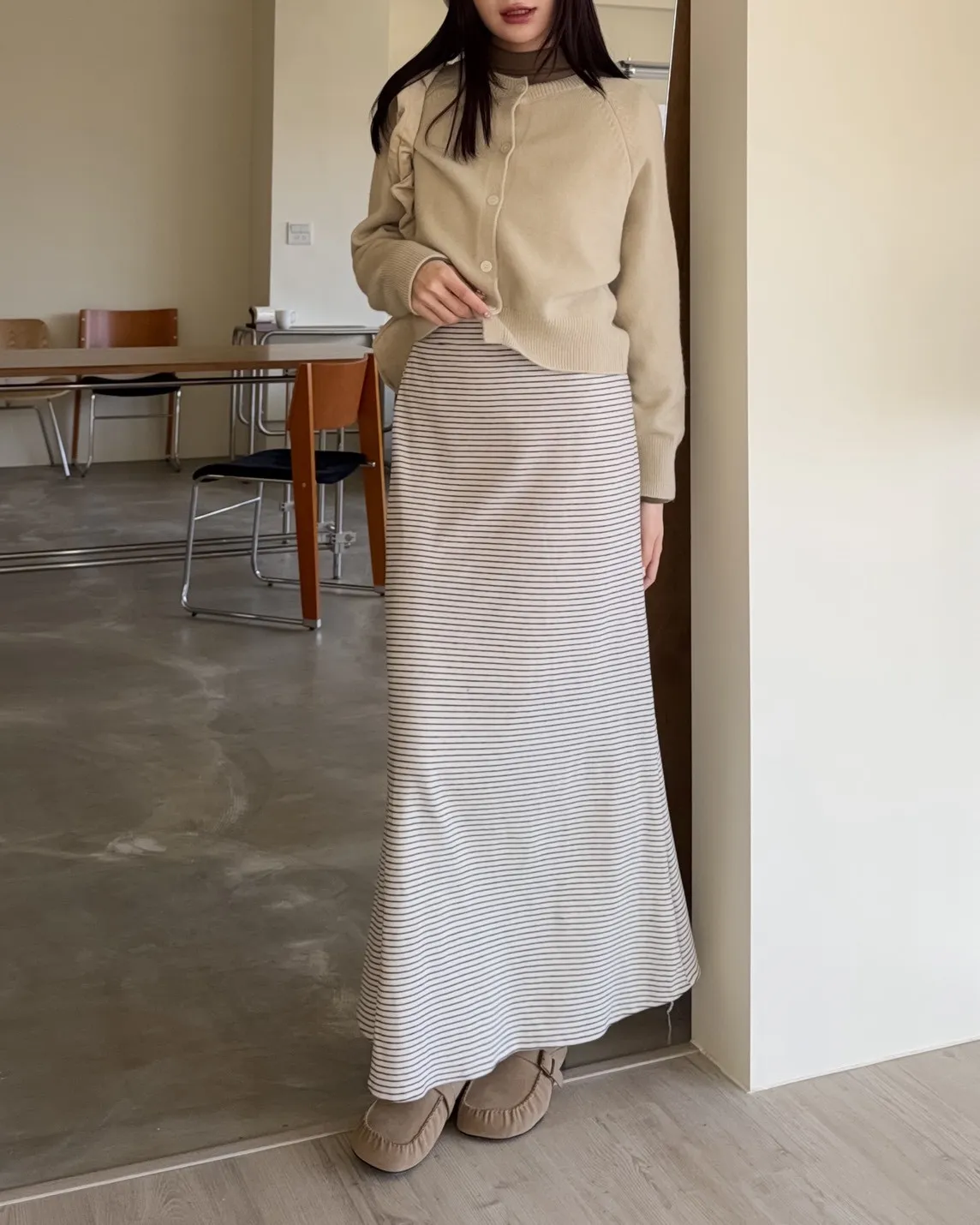 X0008枯枝細橫條短絨A字裙(米白/咖啡)