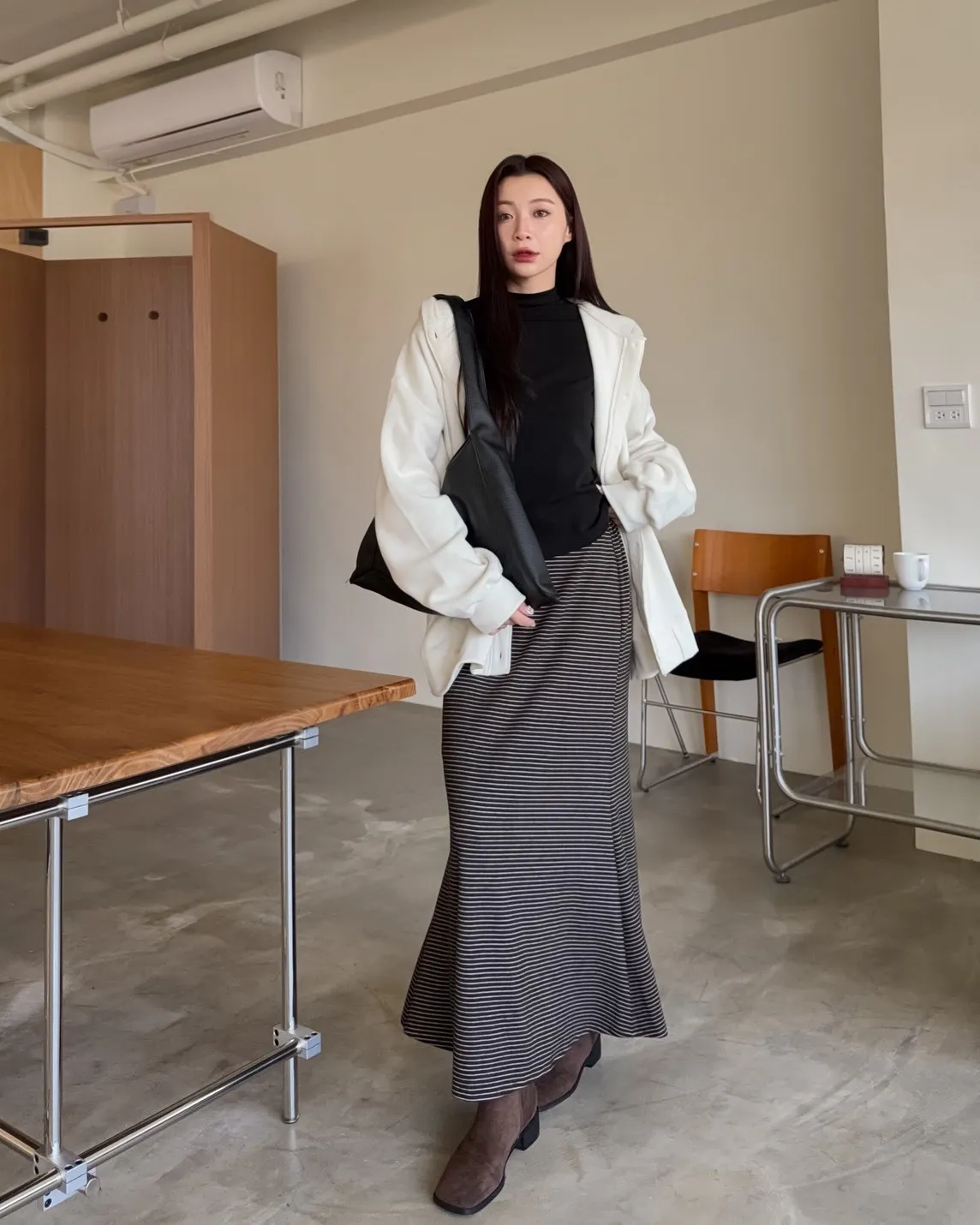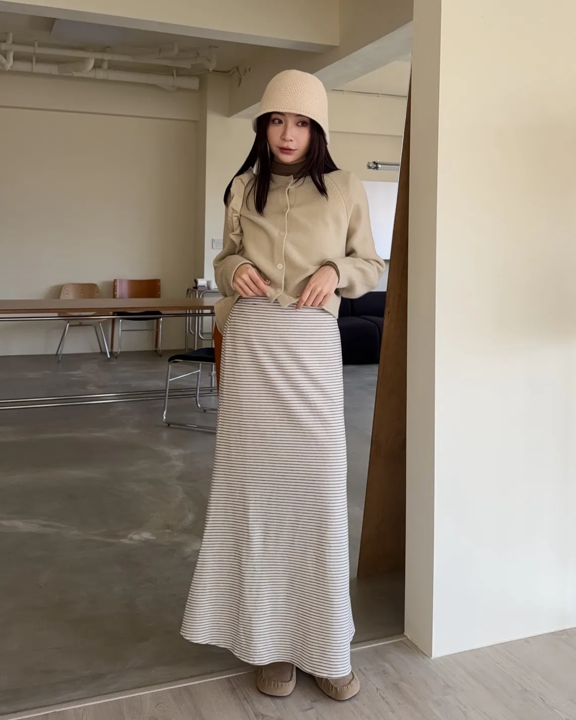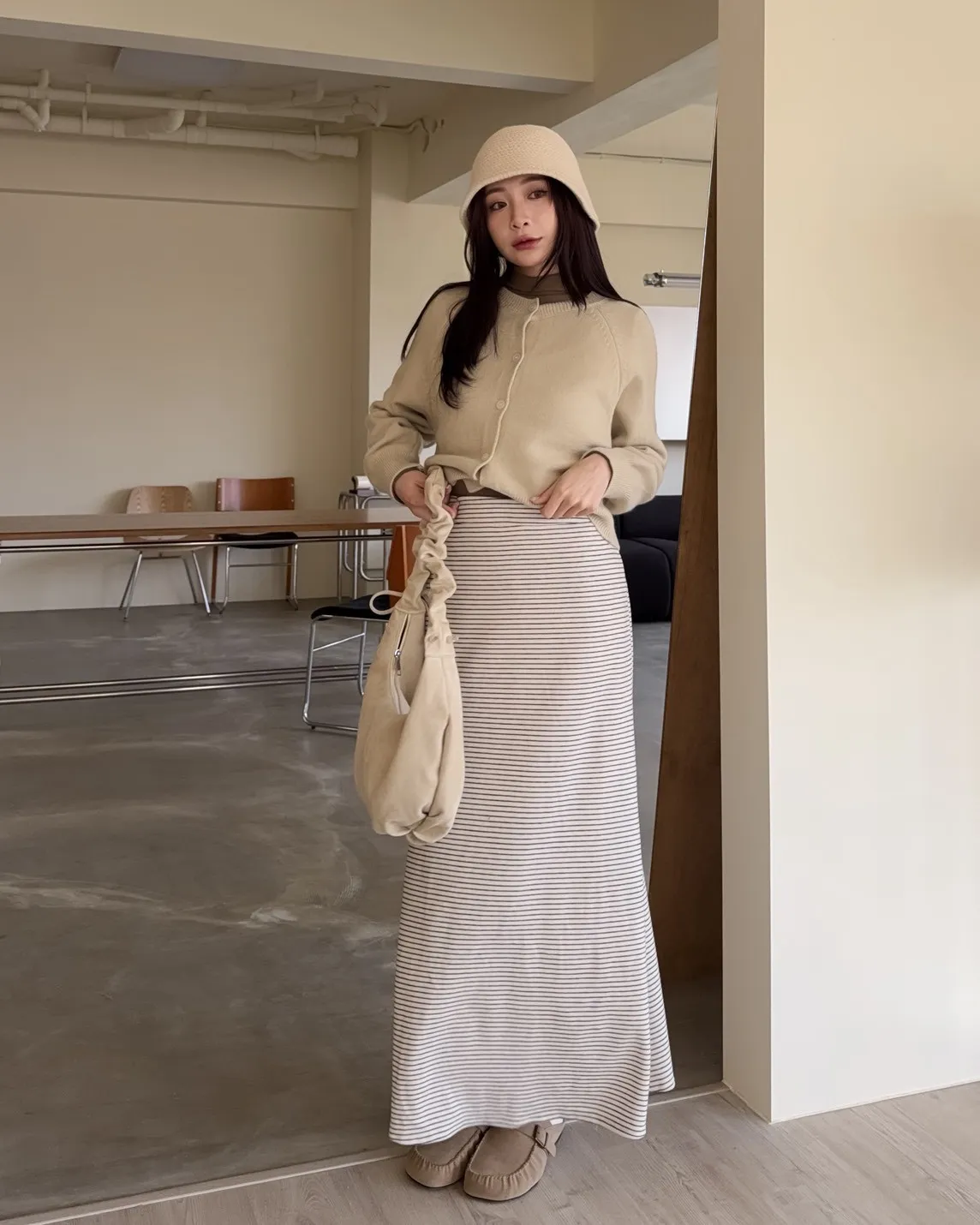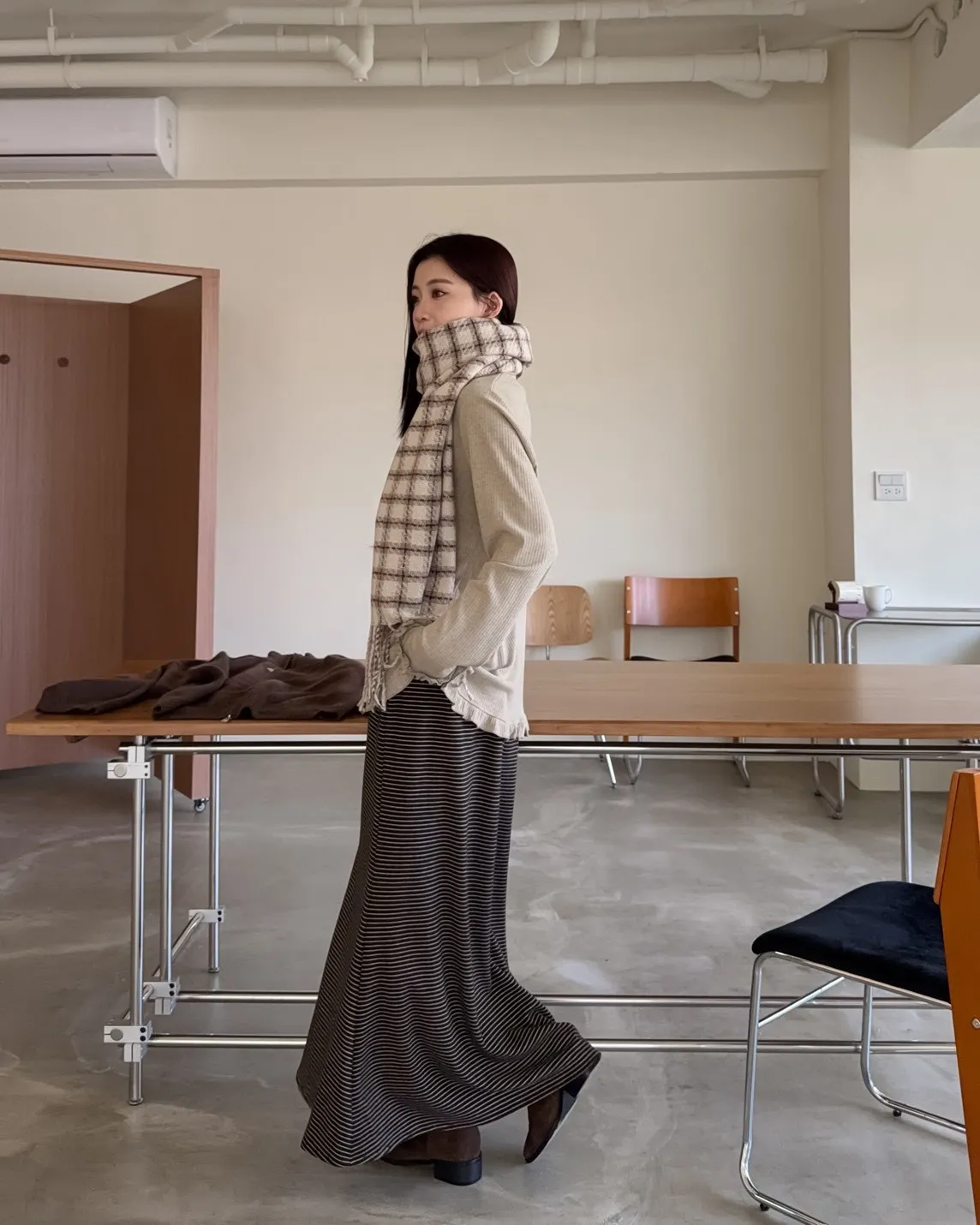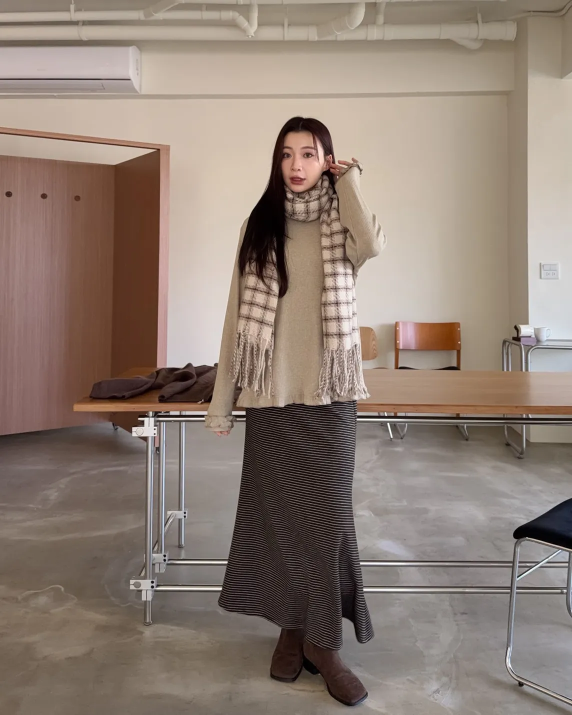 X0008枯枝細橫條短絨A字裙(米白/咖啡)