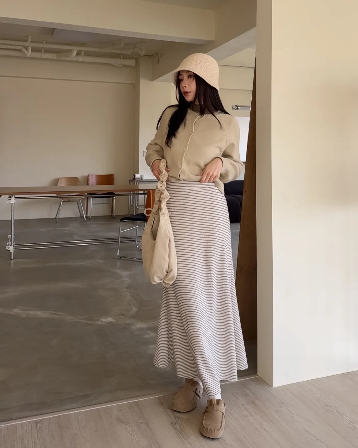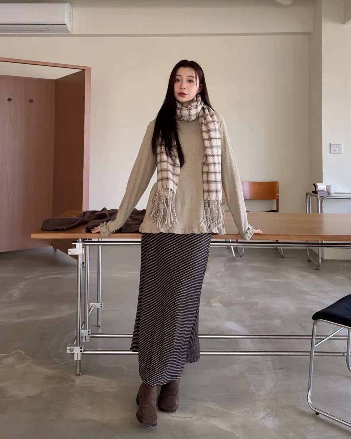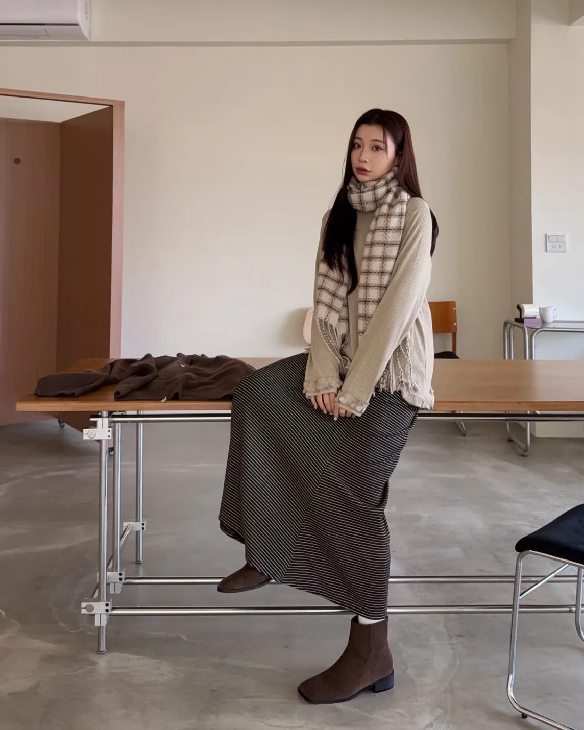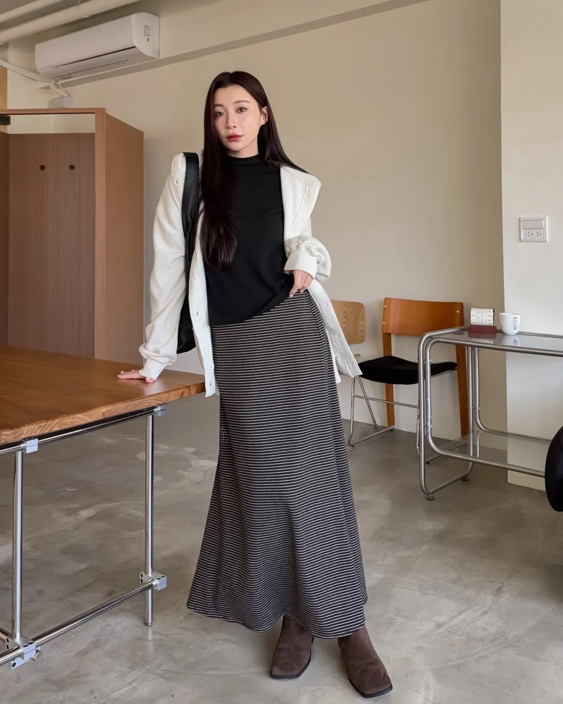 X0008枯枝細橫條短絨A字裙(米白/咖啡)