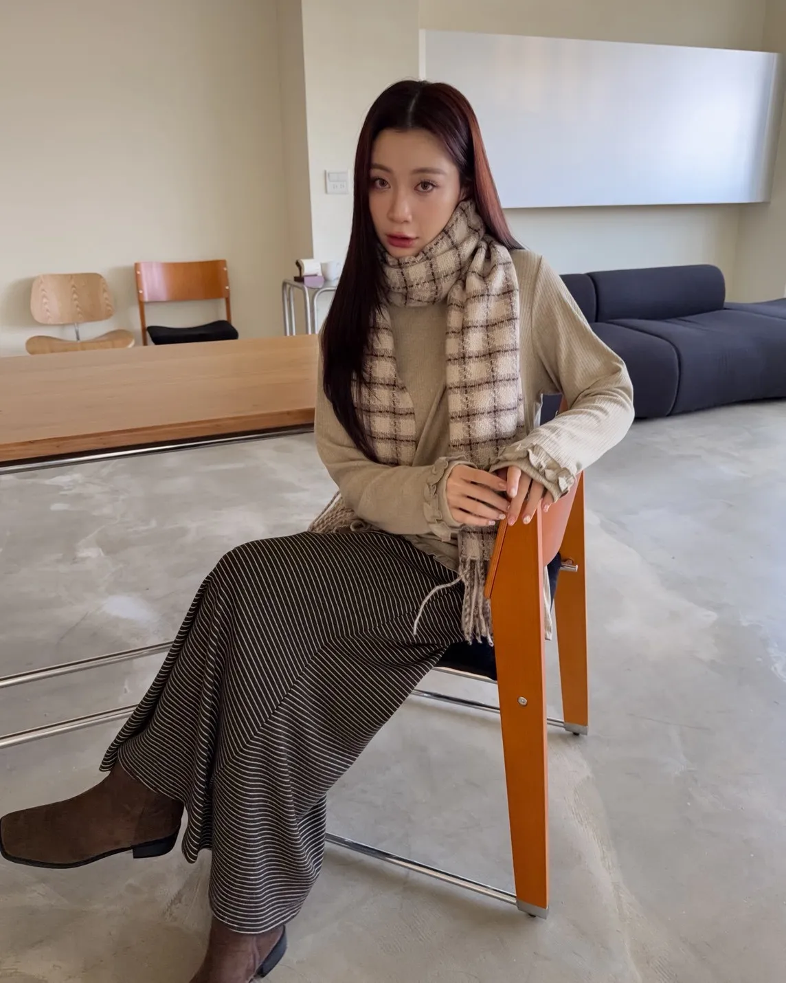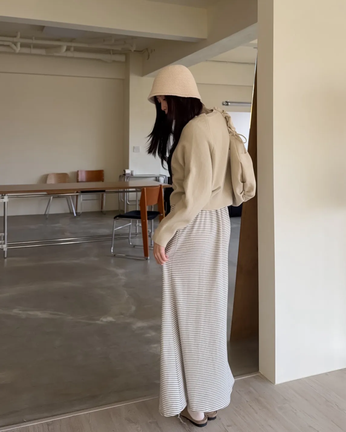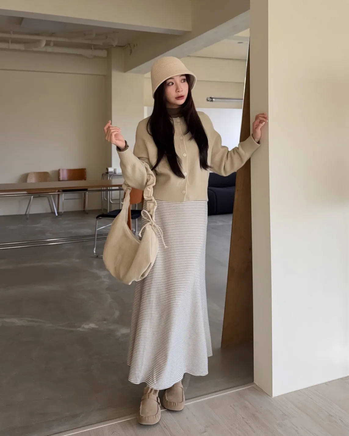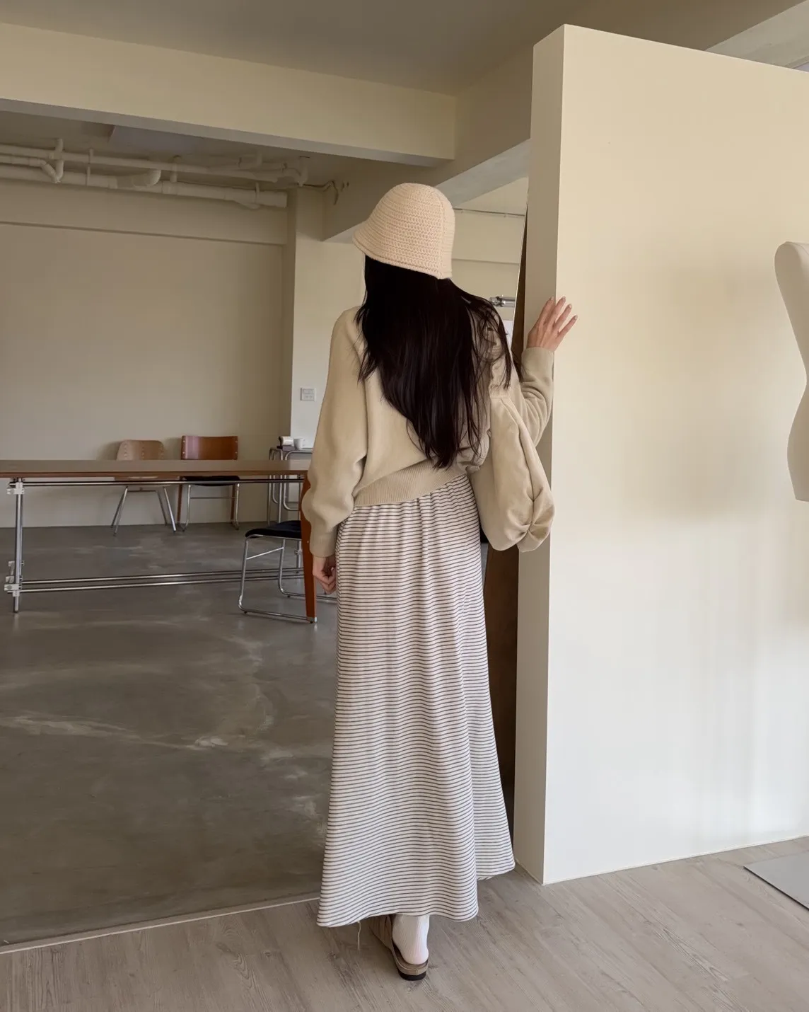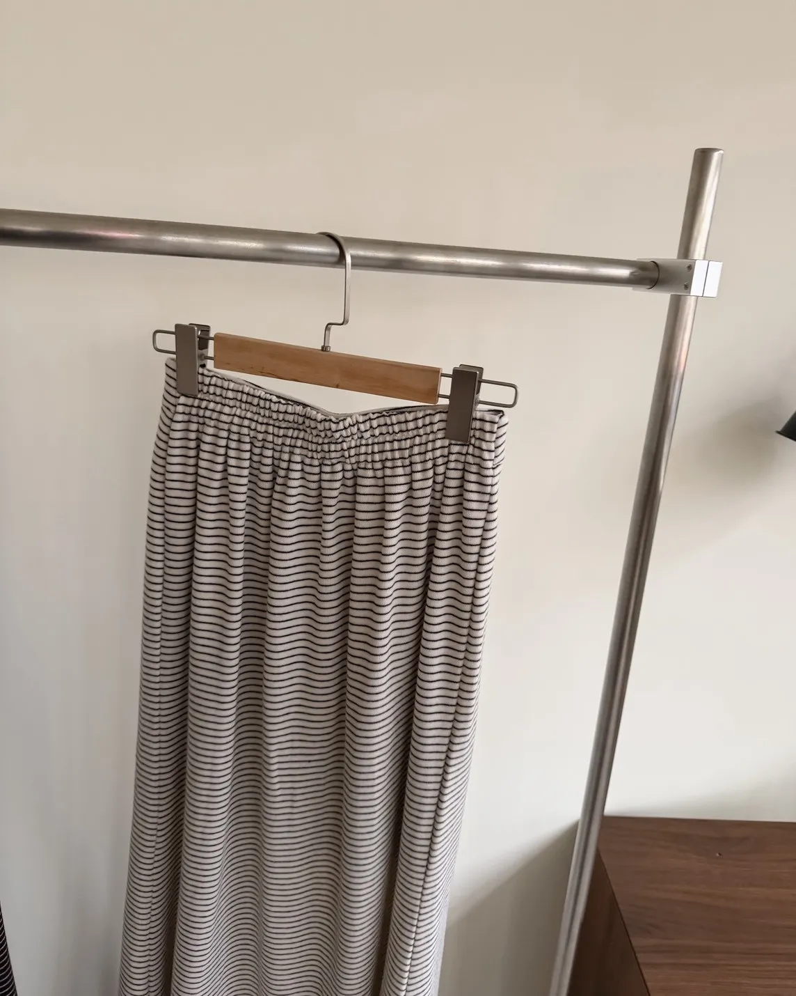 X0008枯枝細橫條短絨A字裙(米白/咖啡)