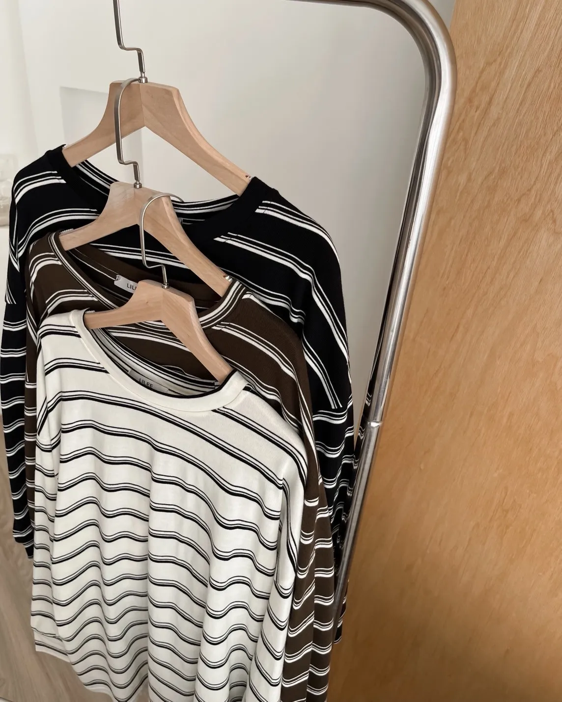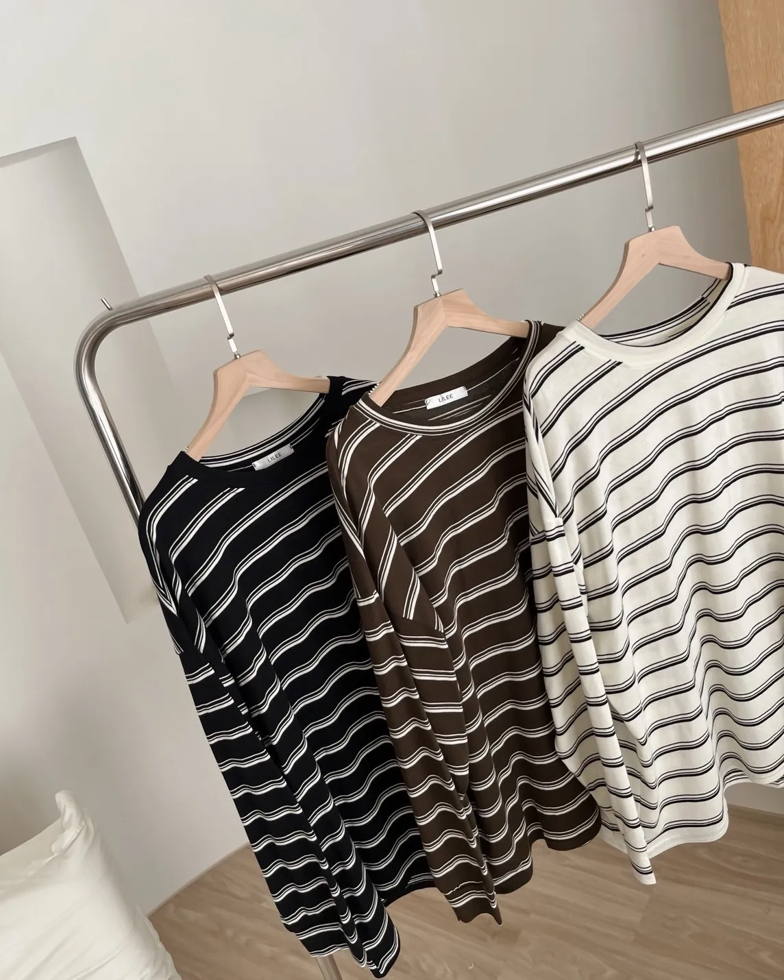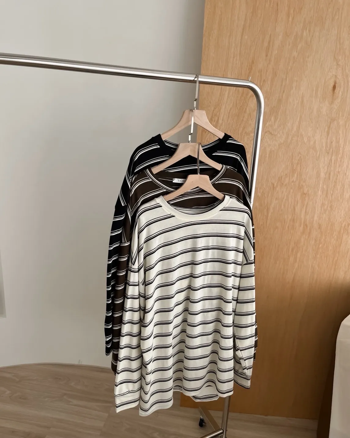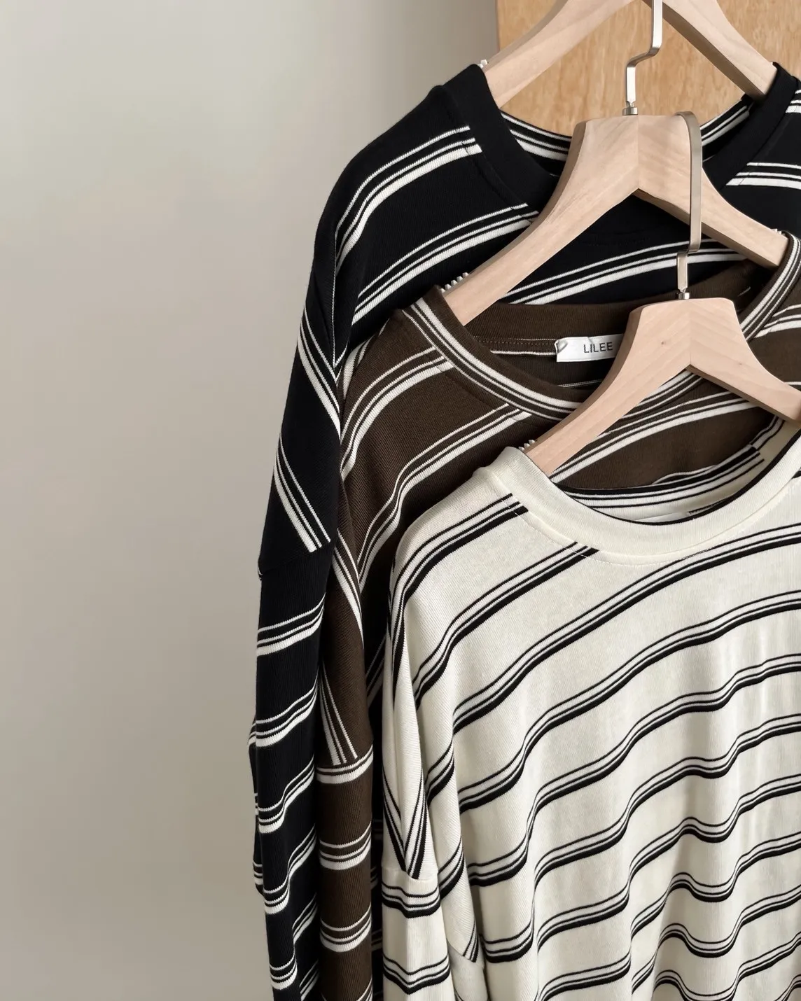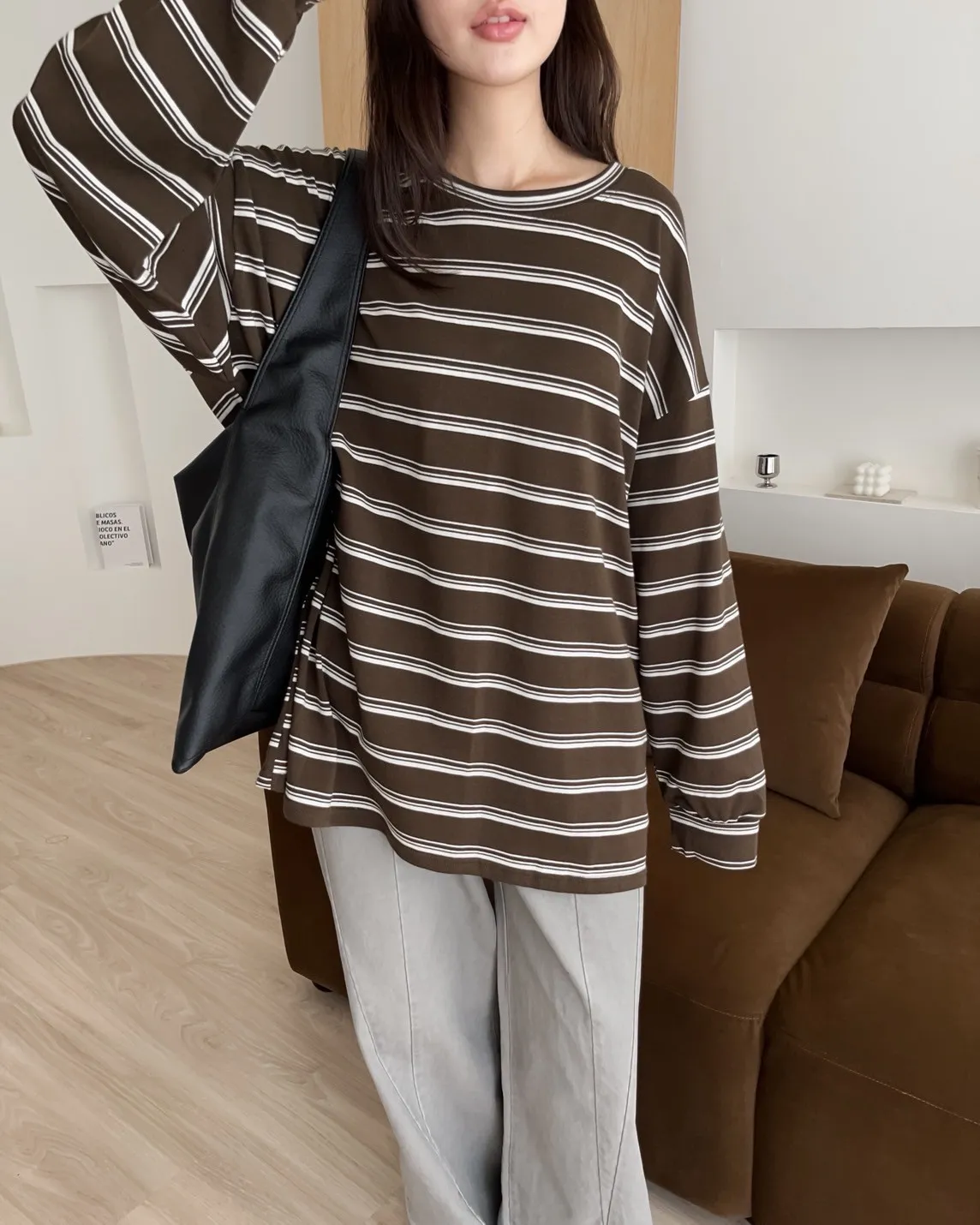 U0004早秋版_寬鬆橫條紋軟棉上衣(米/咖啡/黑)(米售完不補)