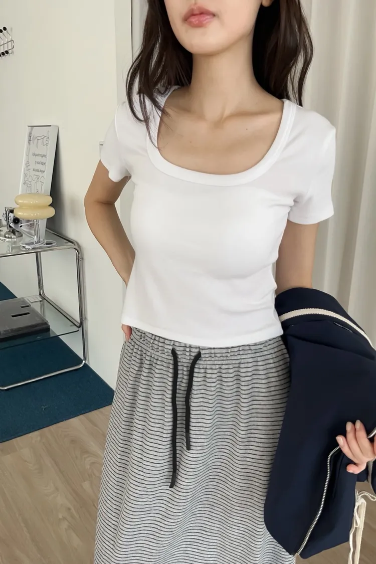 方領 小露鎖骨 有彈性棉料 合腰顯瘦