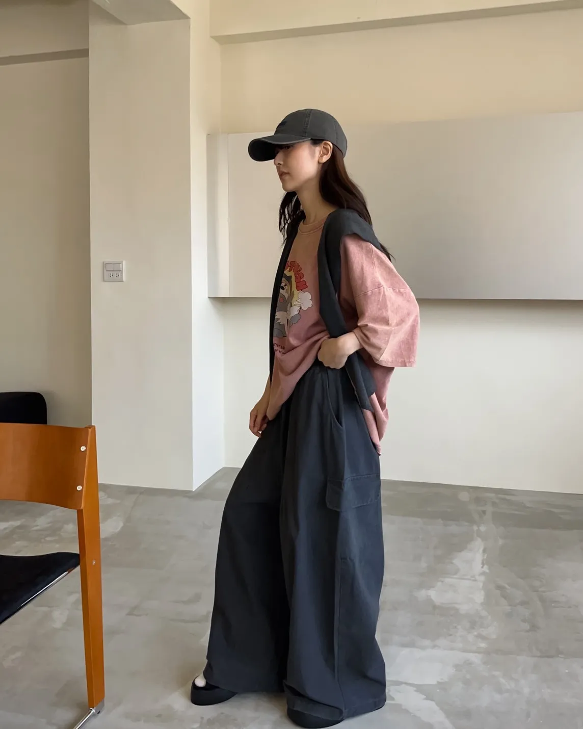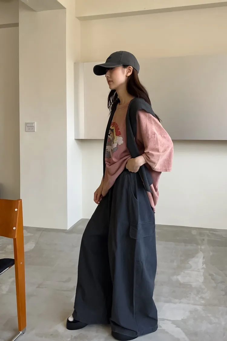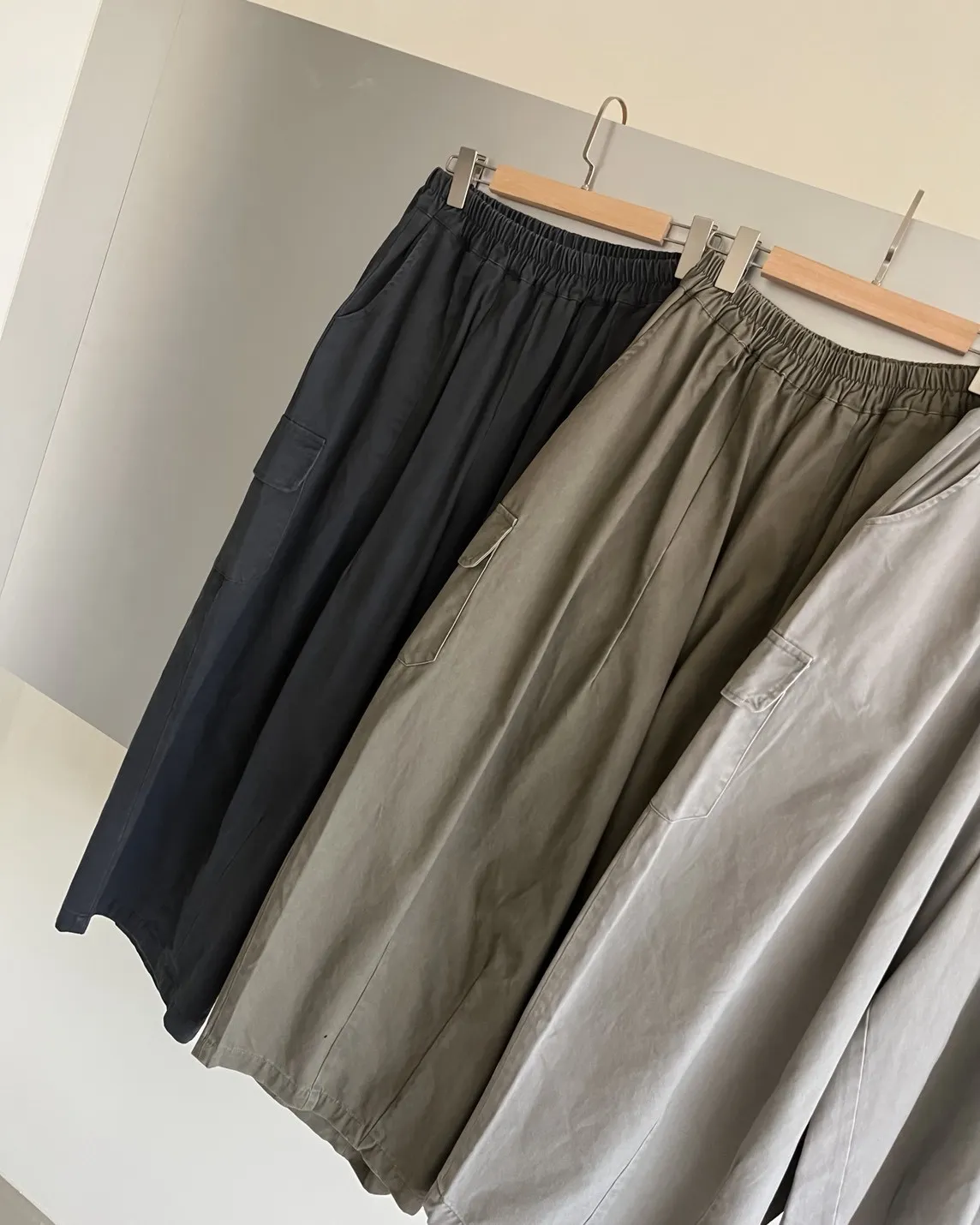 全鬆緊 建議尺寸S-XL 兩側口袋 兩邊翻蓋口袋 壓線造型 褲腳內縮微繭型 很寬很挺 布料本身無彈性