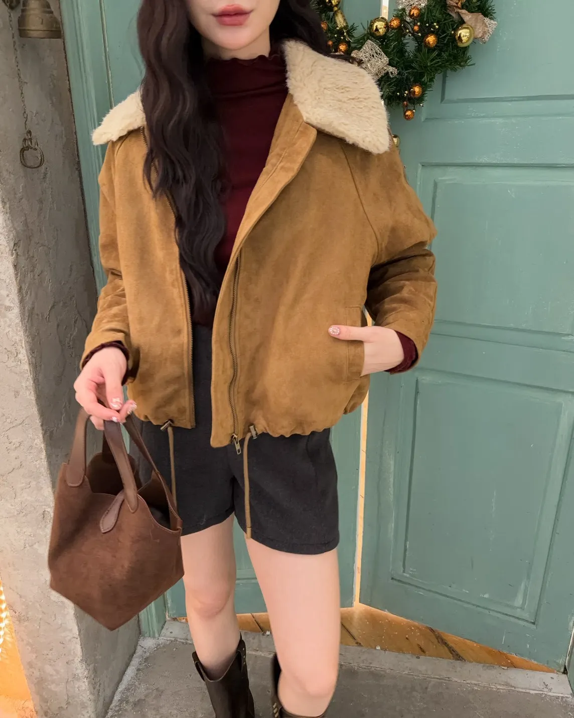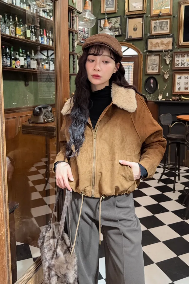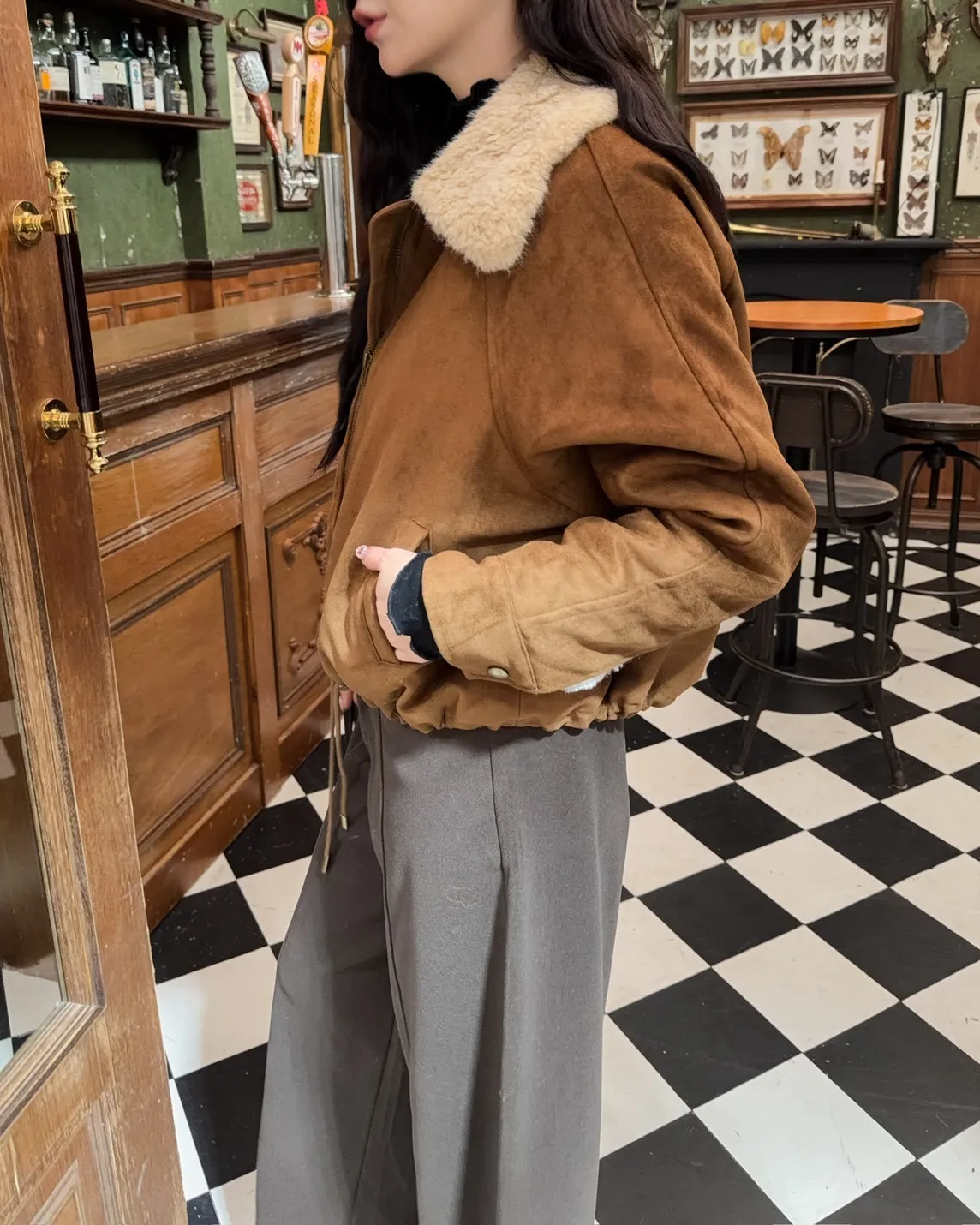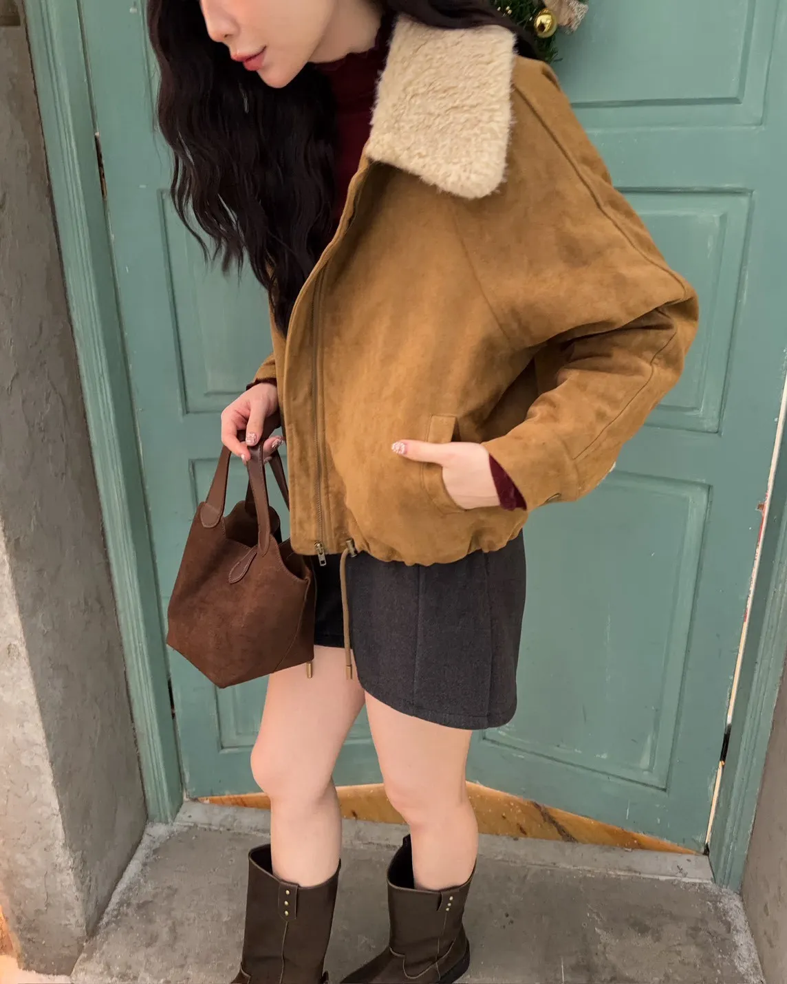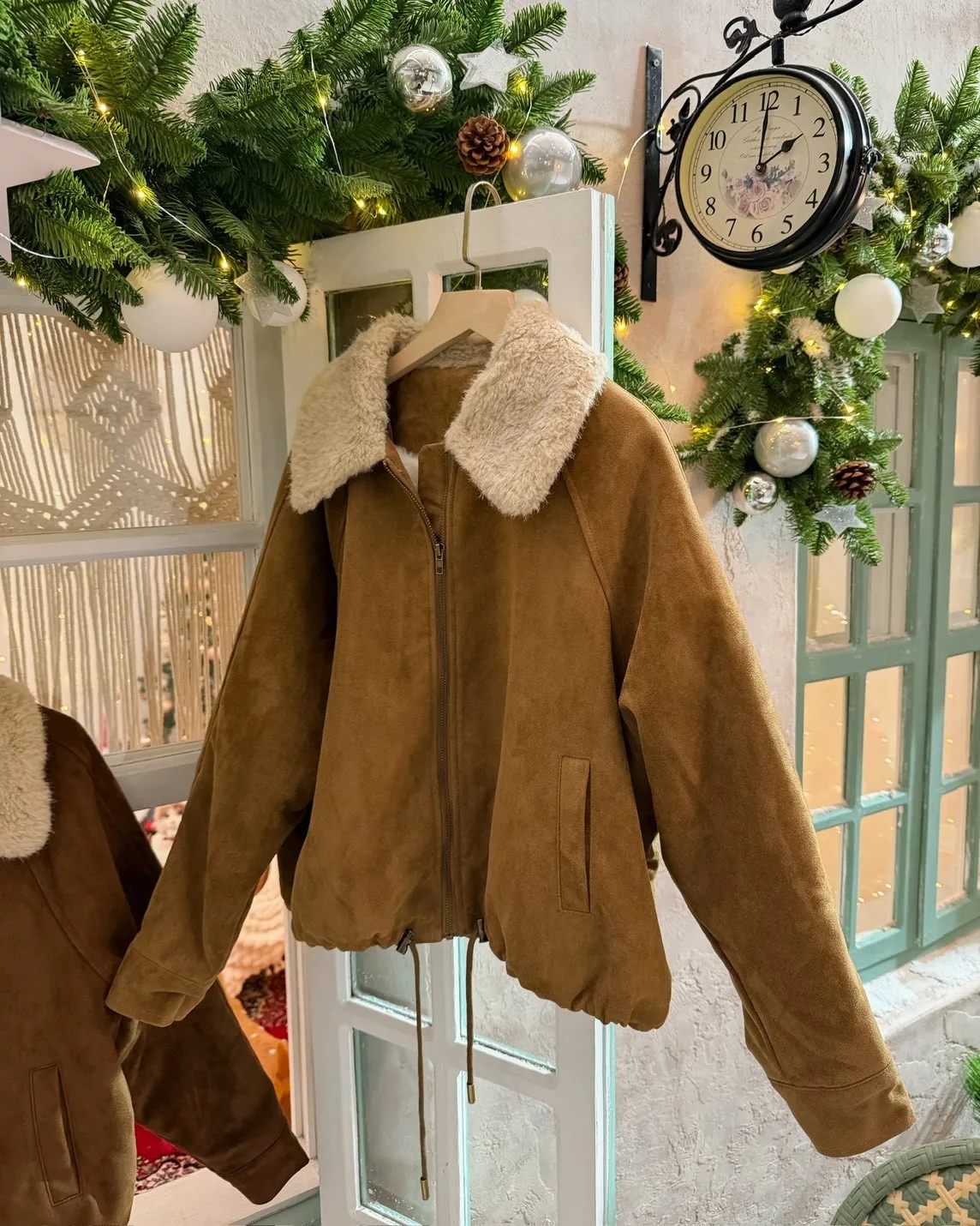 X0054首爾街頭_鋪毛翻領麂皮外套(卡其/咖啡)