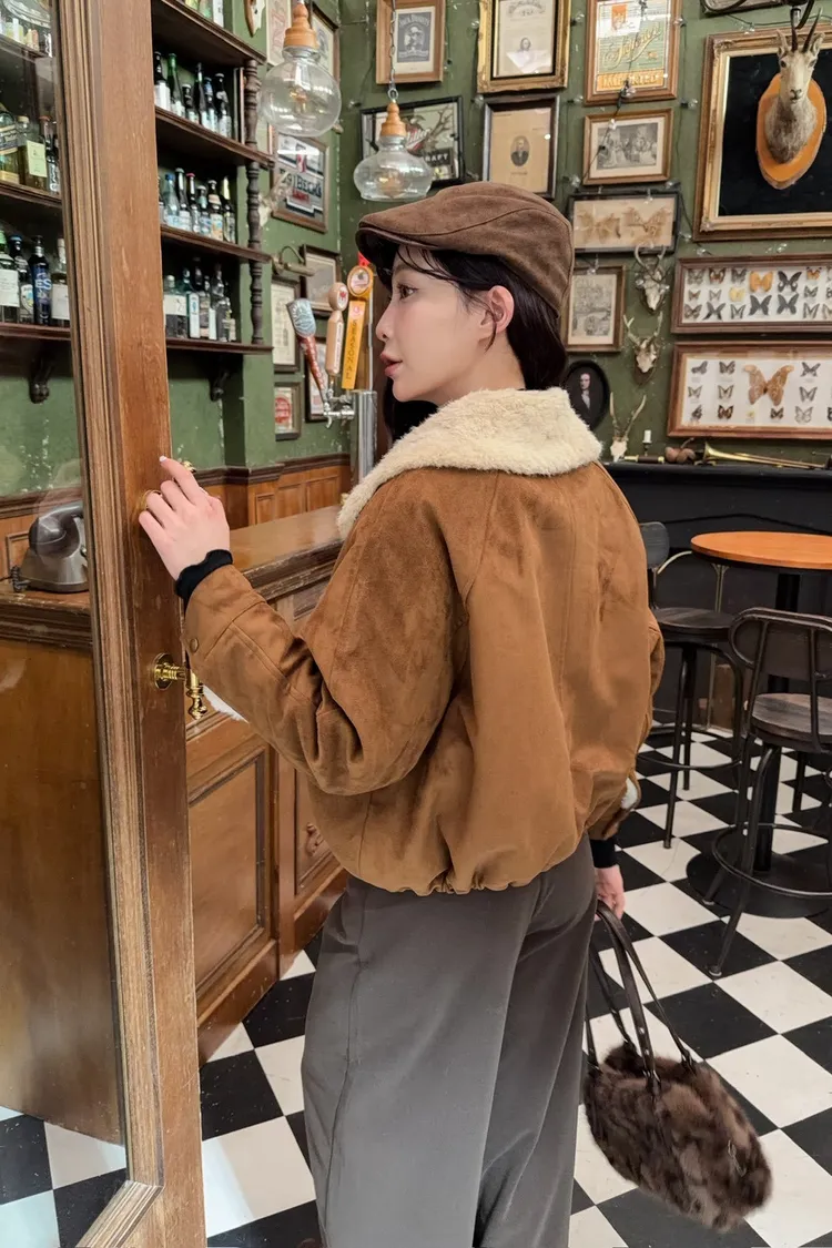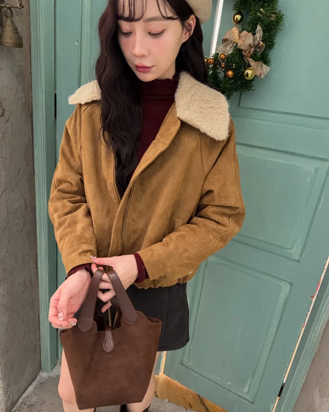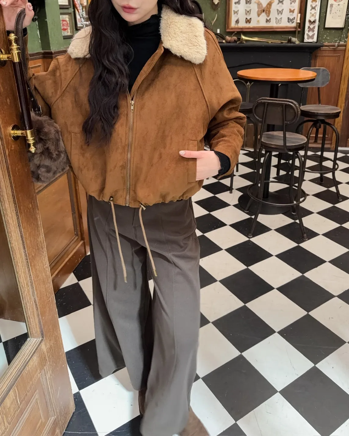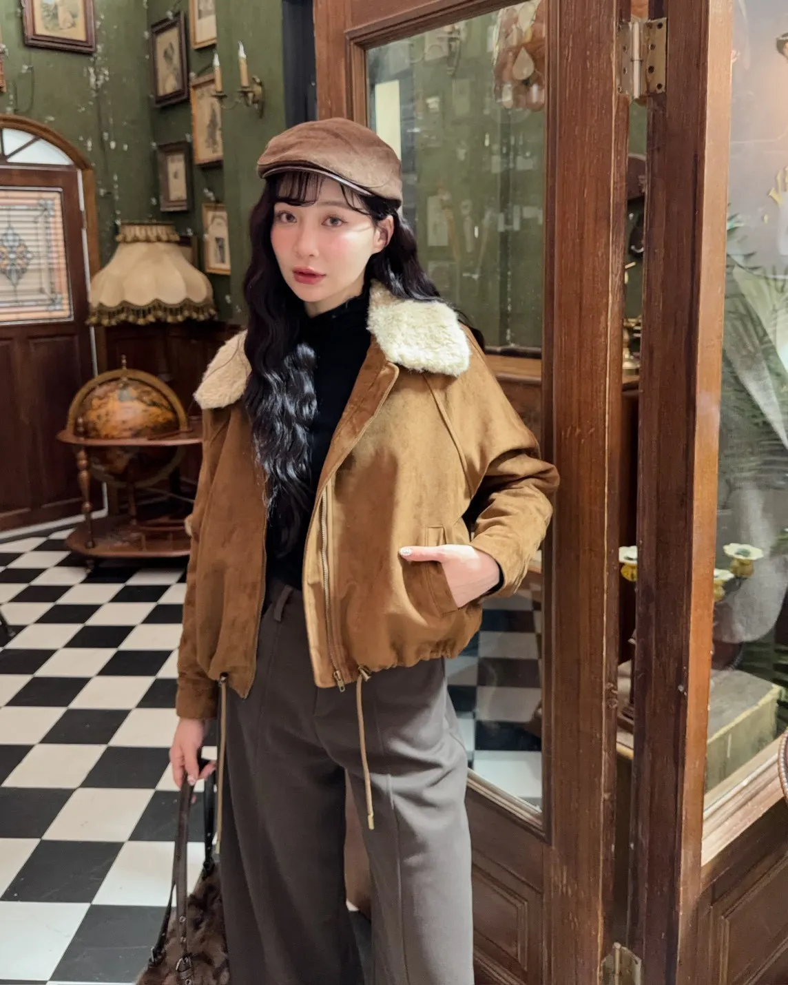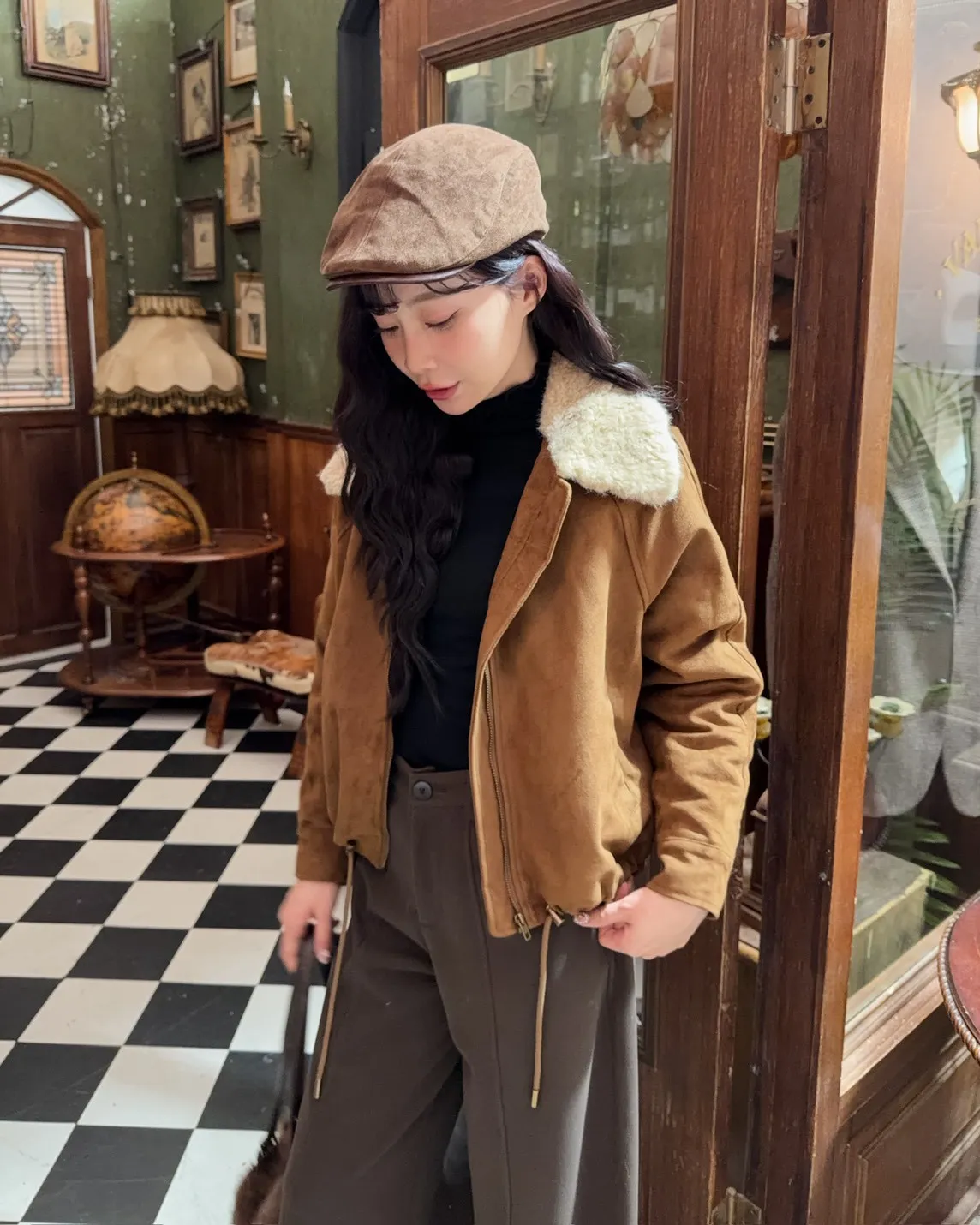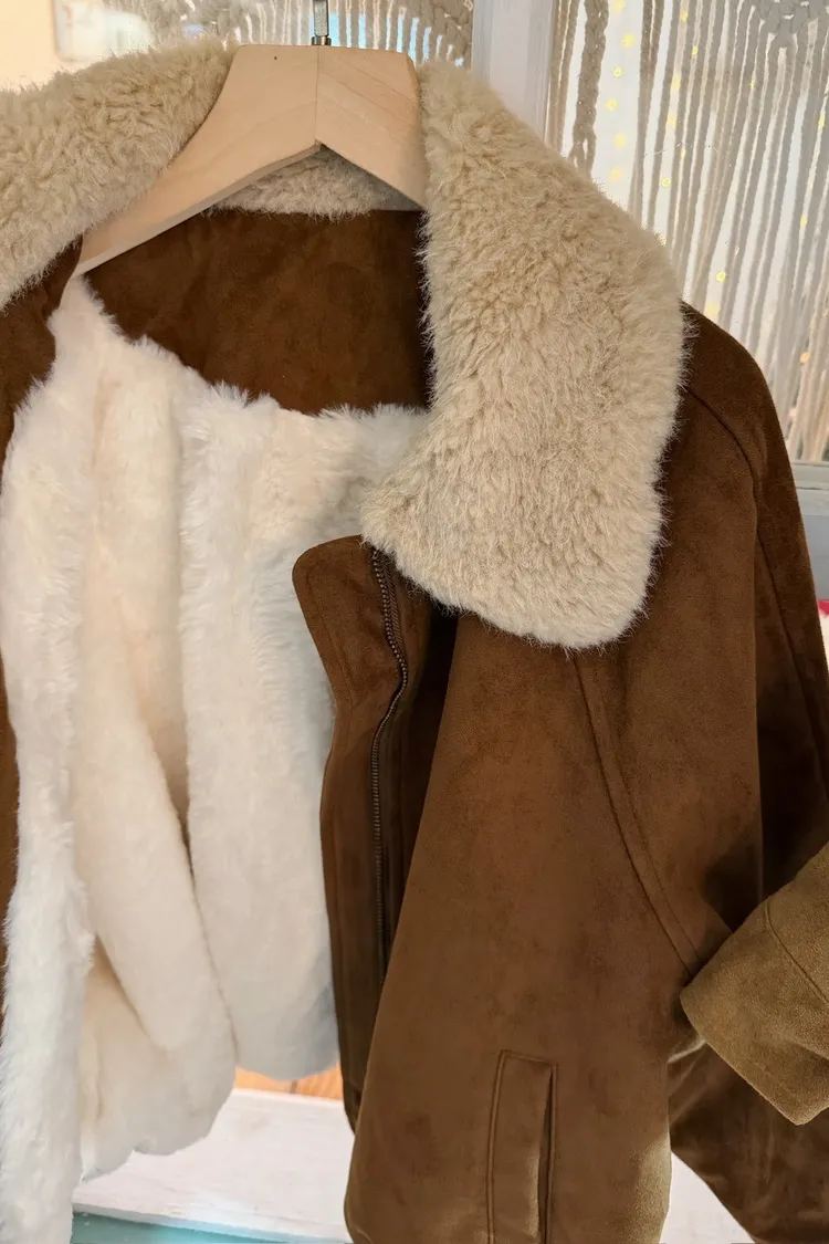 X0054首爾街頭_鋪毛翻領麂皮外套(卡其/咖啡)