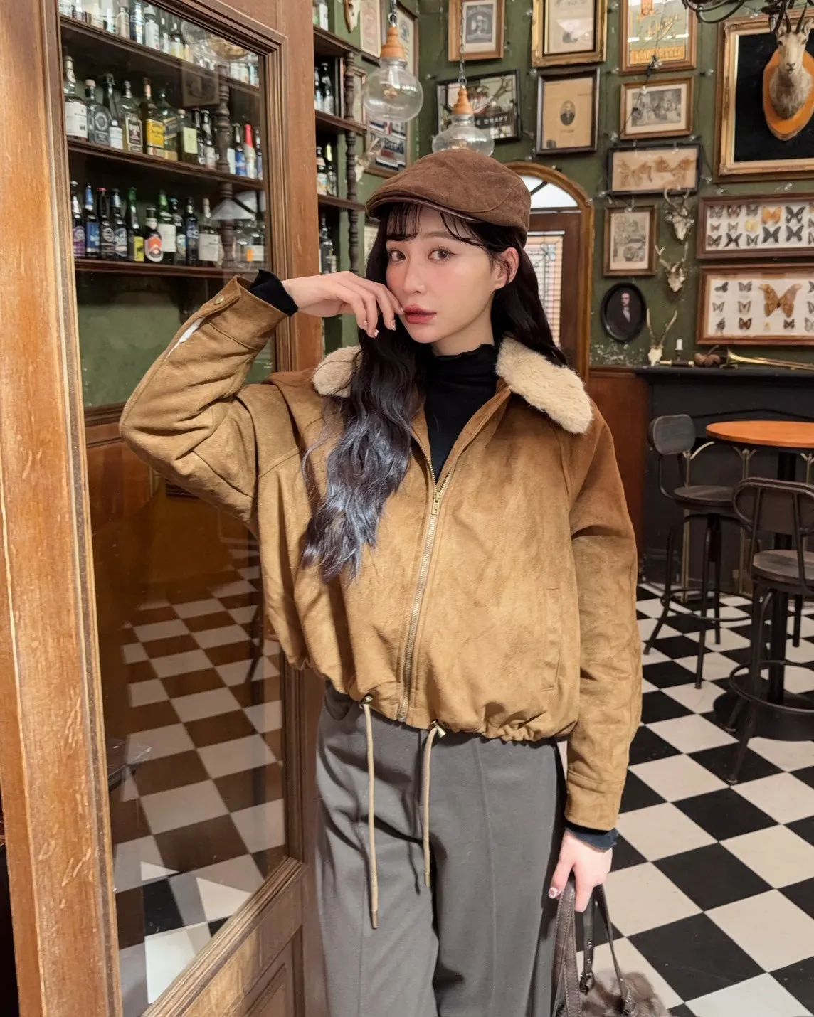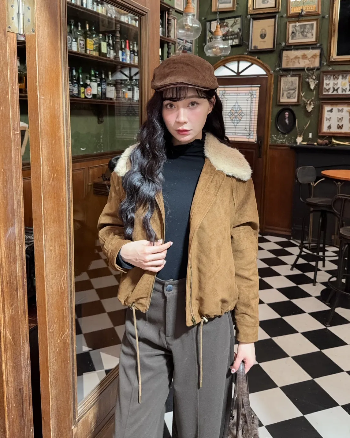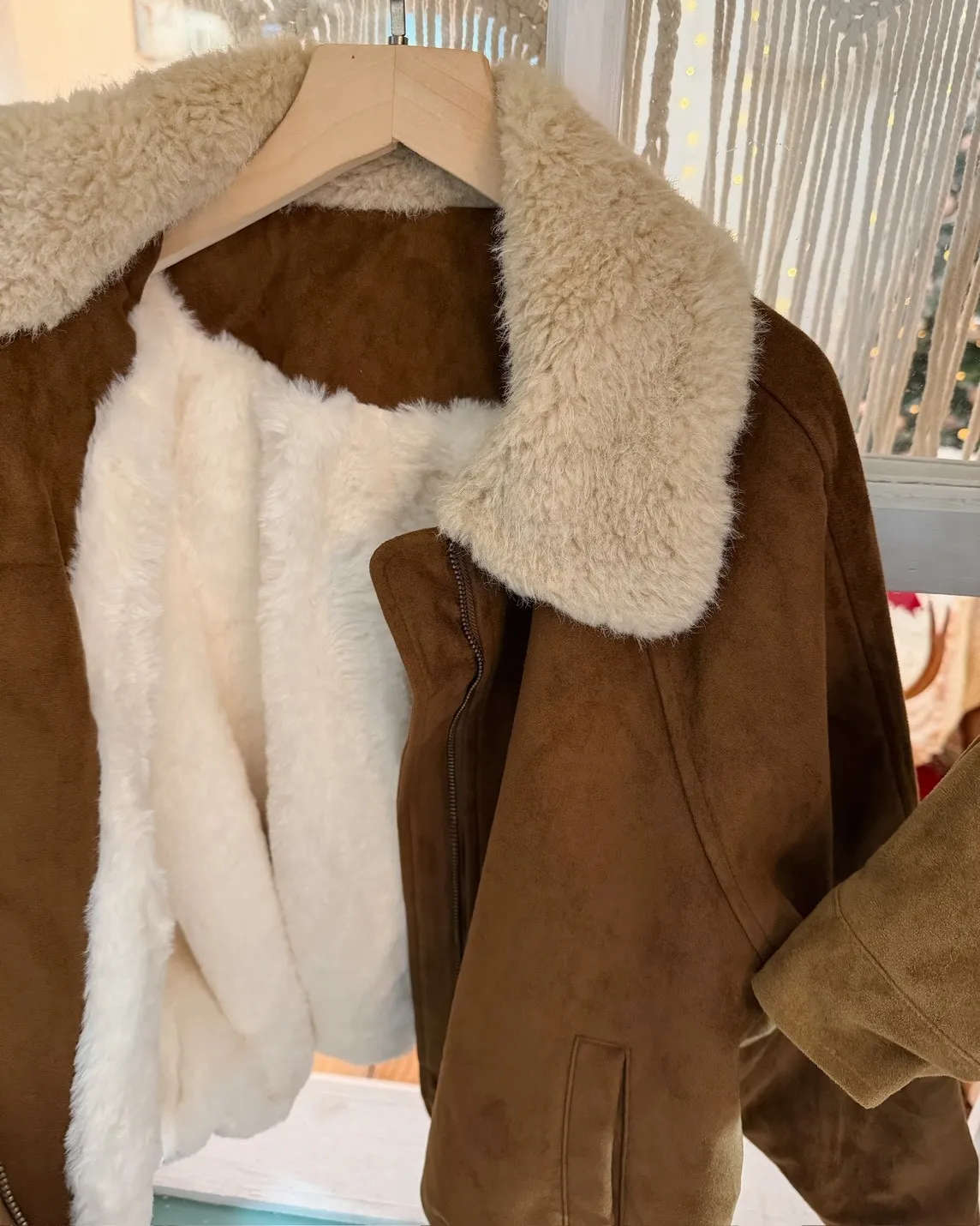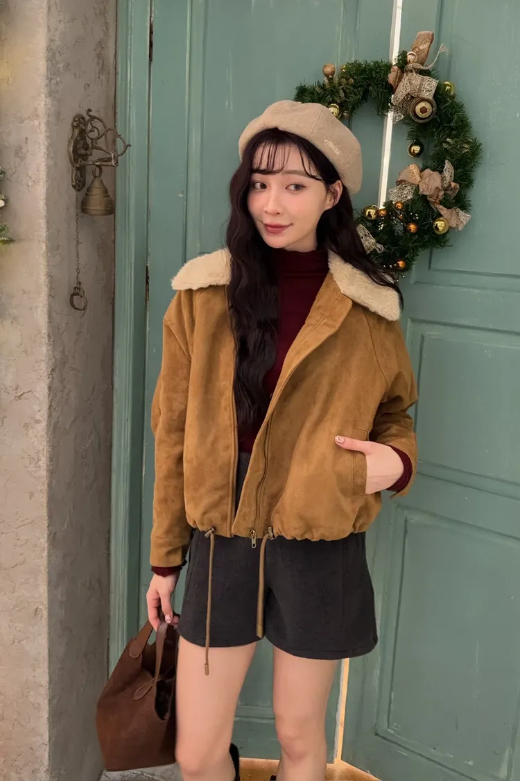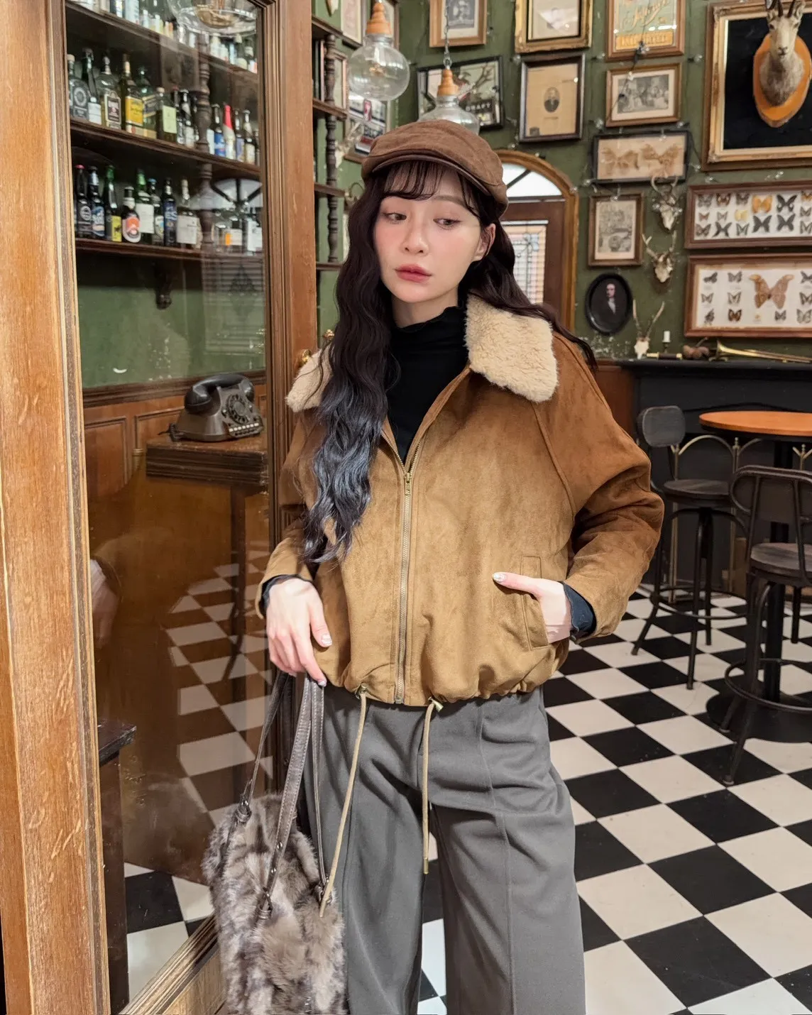 X0054首爾街頭_鋪毛翻領麂皮外套(卡其/咖啡)