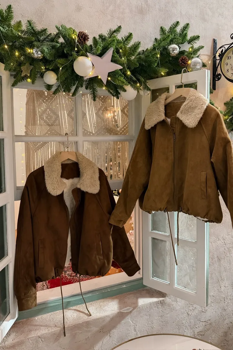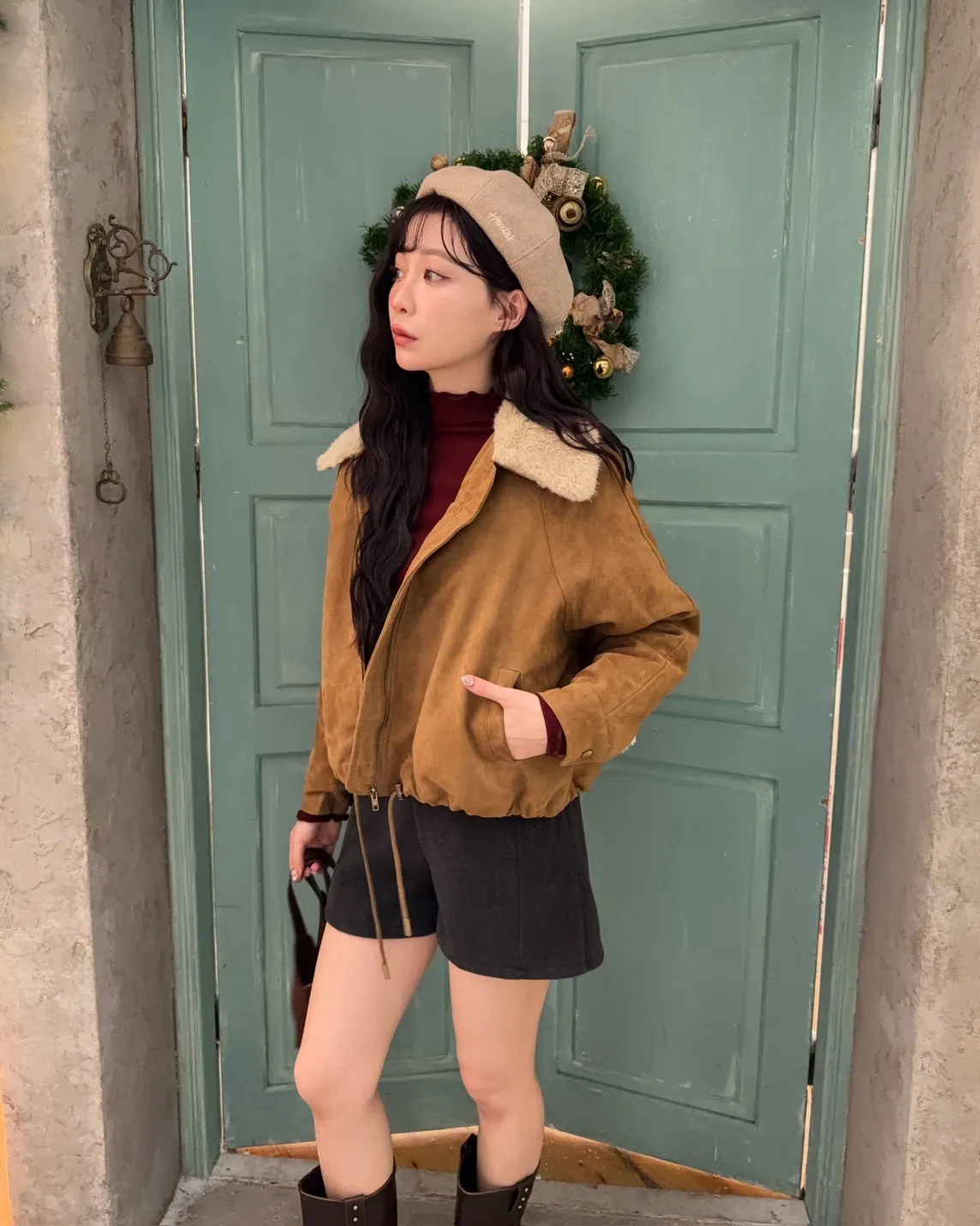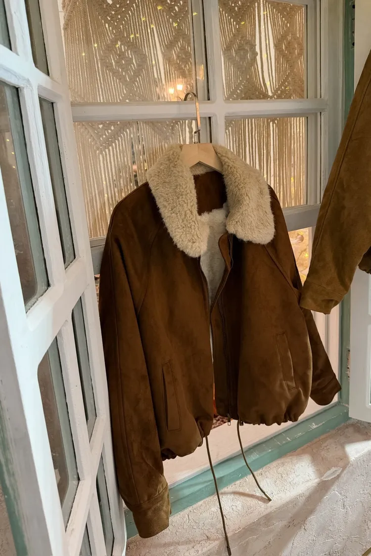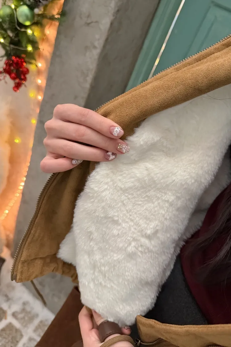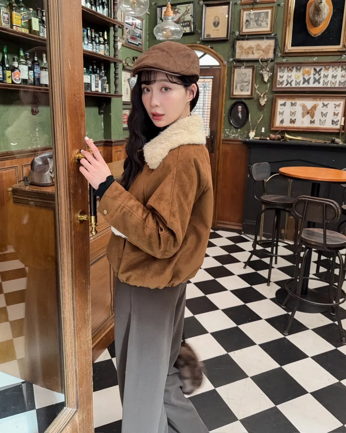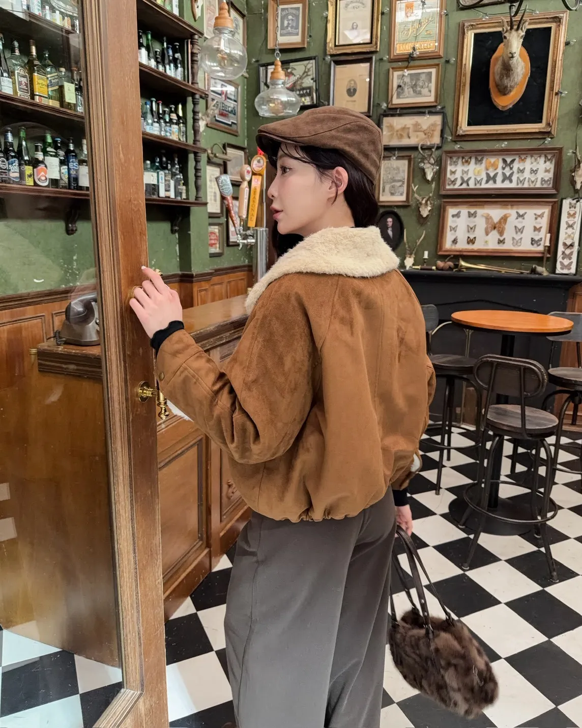X0054首爾街頭_鋪毛翻領麂皮外套(卡其/咖啡)