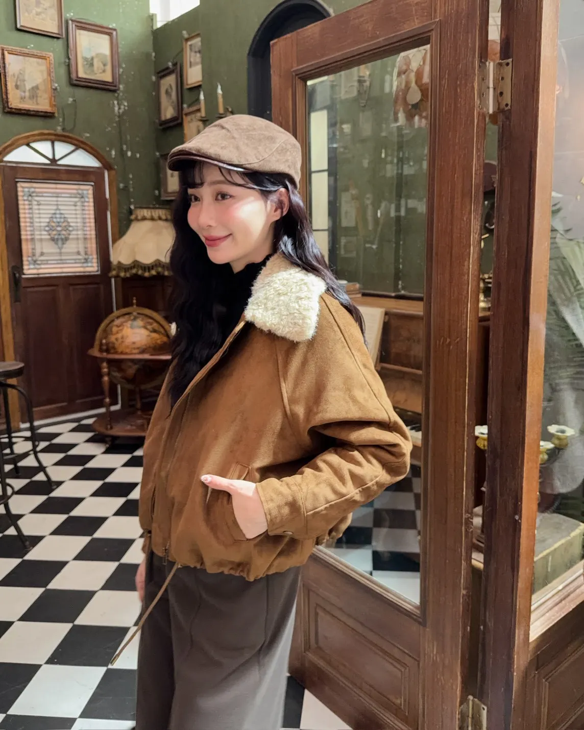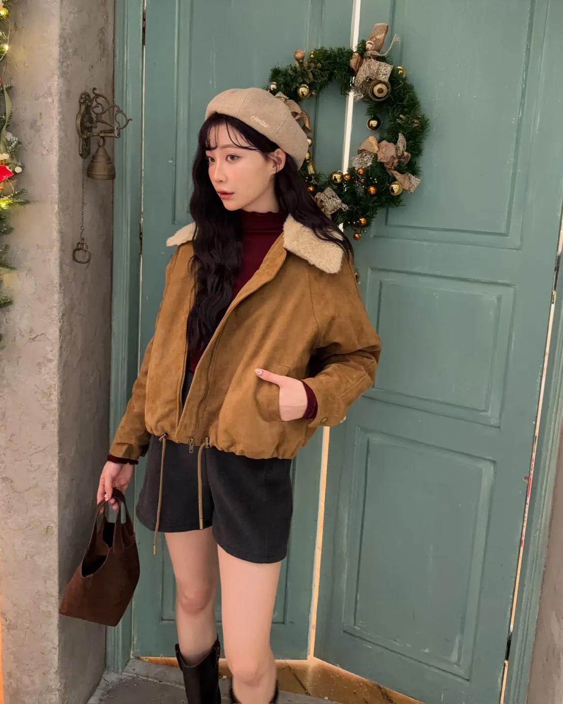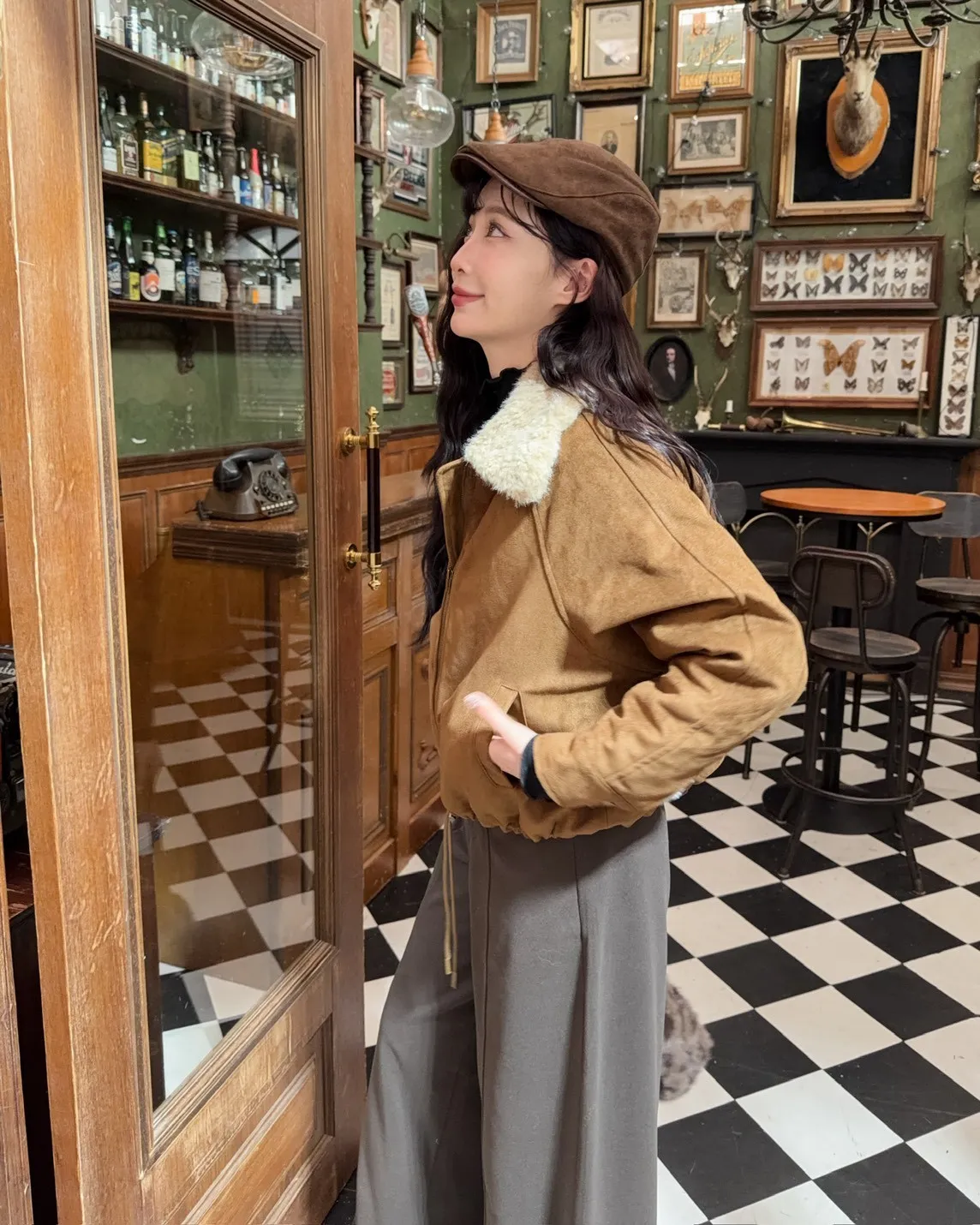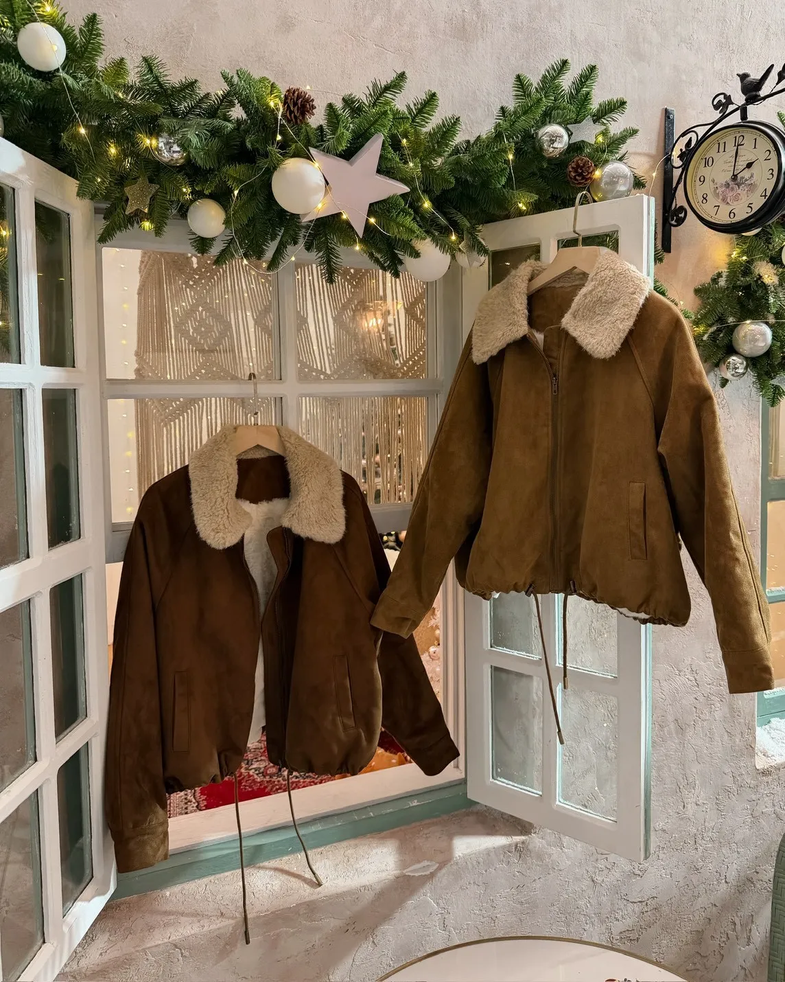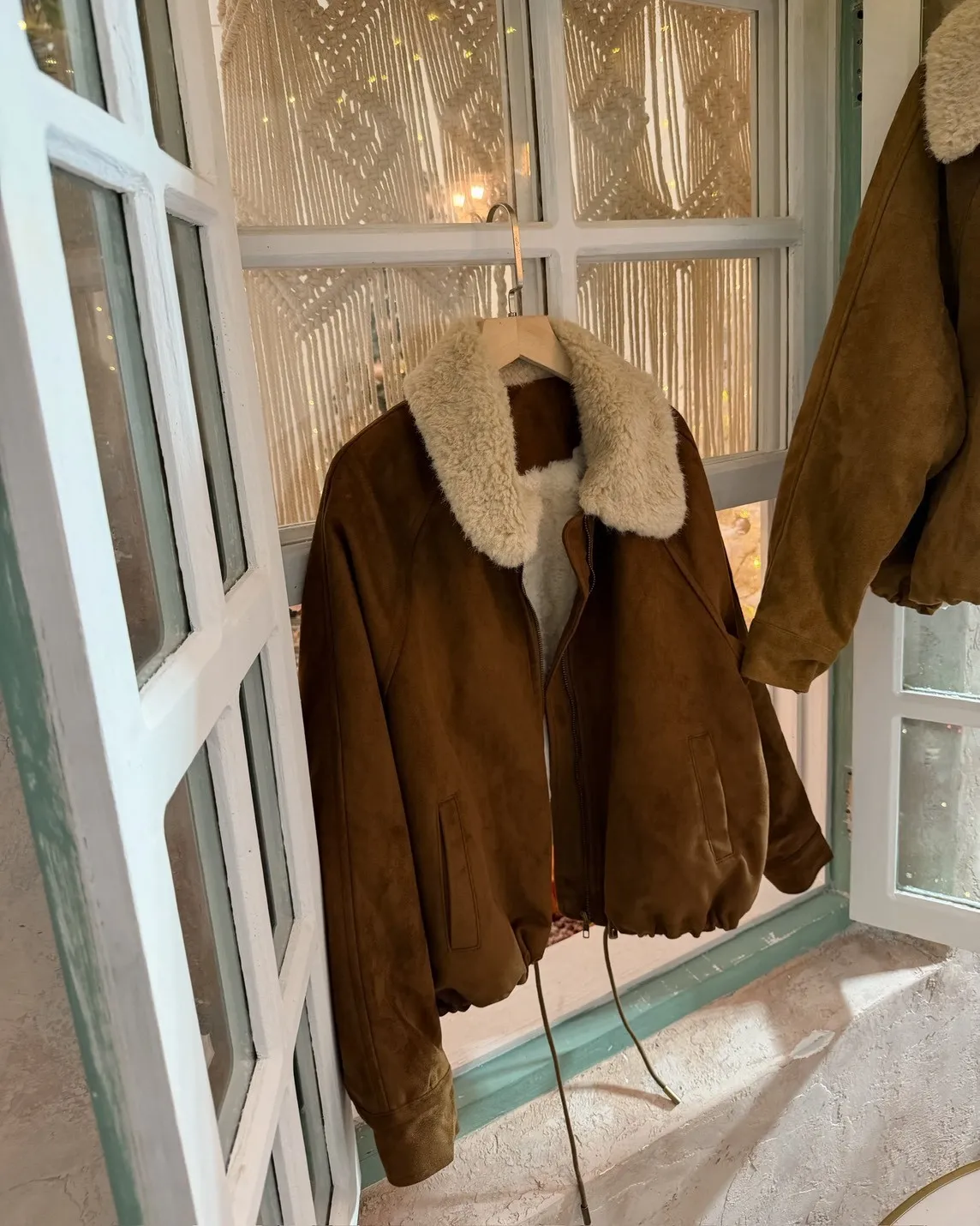 X0054首爾街頭_鋪毛翻領麂皮外套(卡其/咖啡)