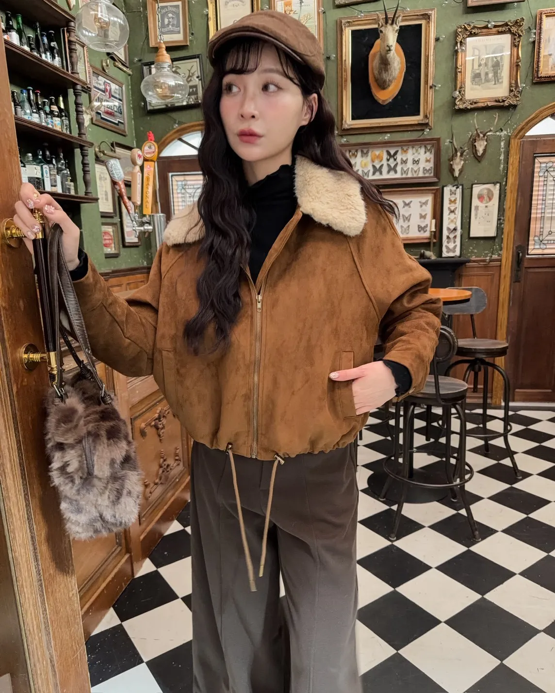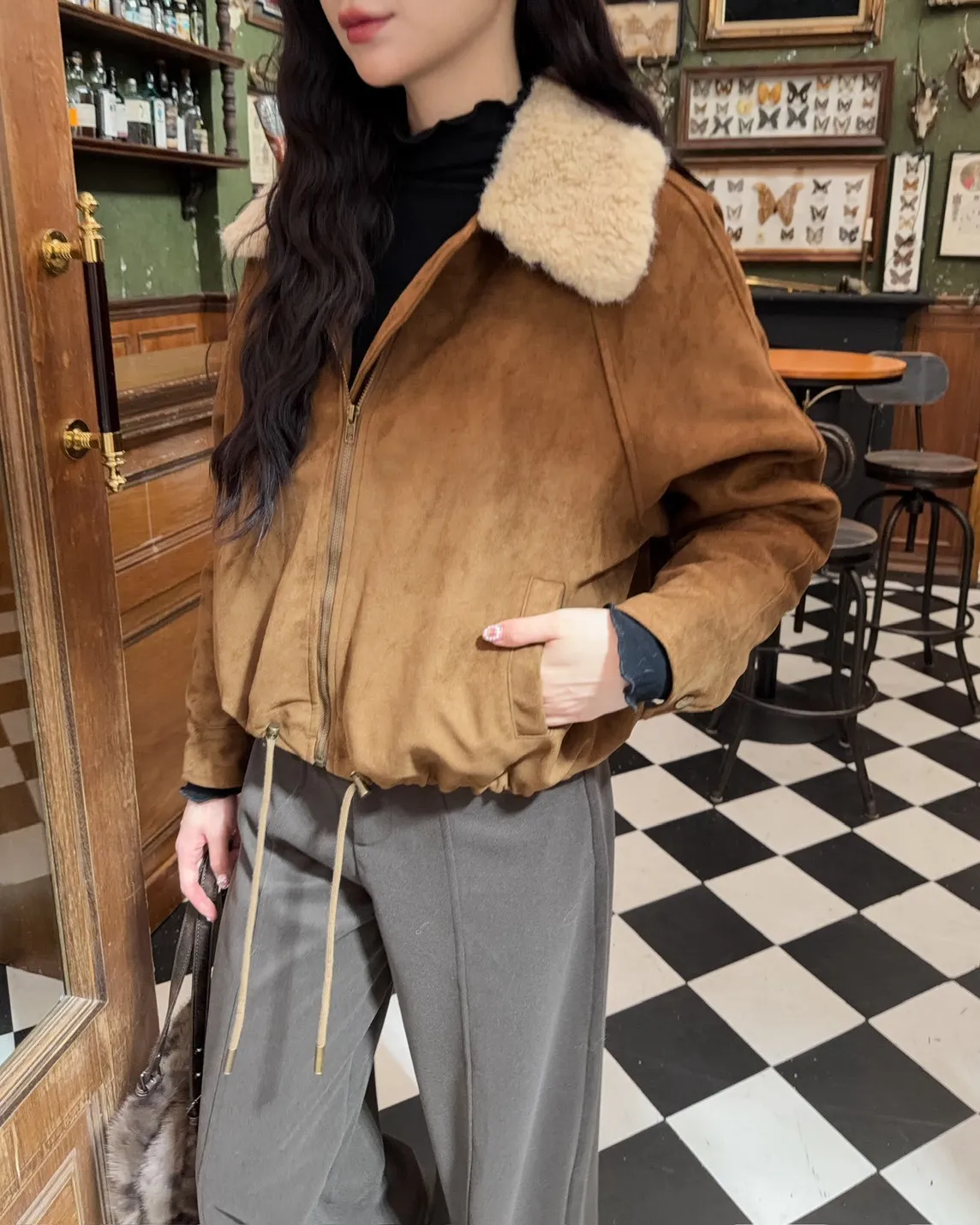 鋪厚厚毛 翻領 表面麂皮 兩側口袋 做舊拉鍊 下擺抽繩可縮緊