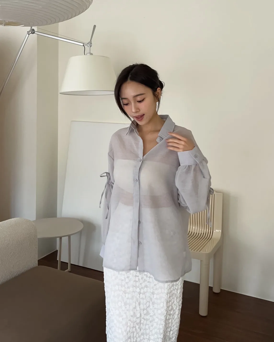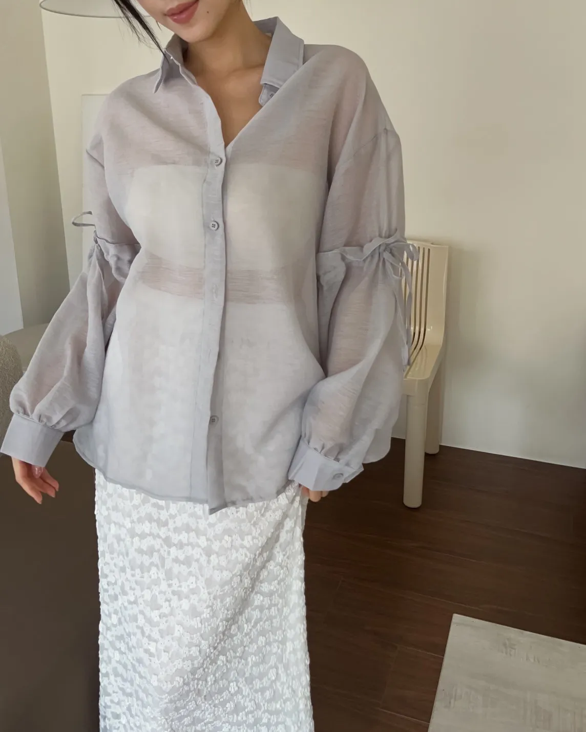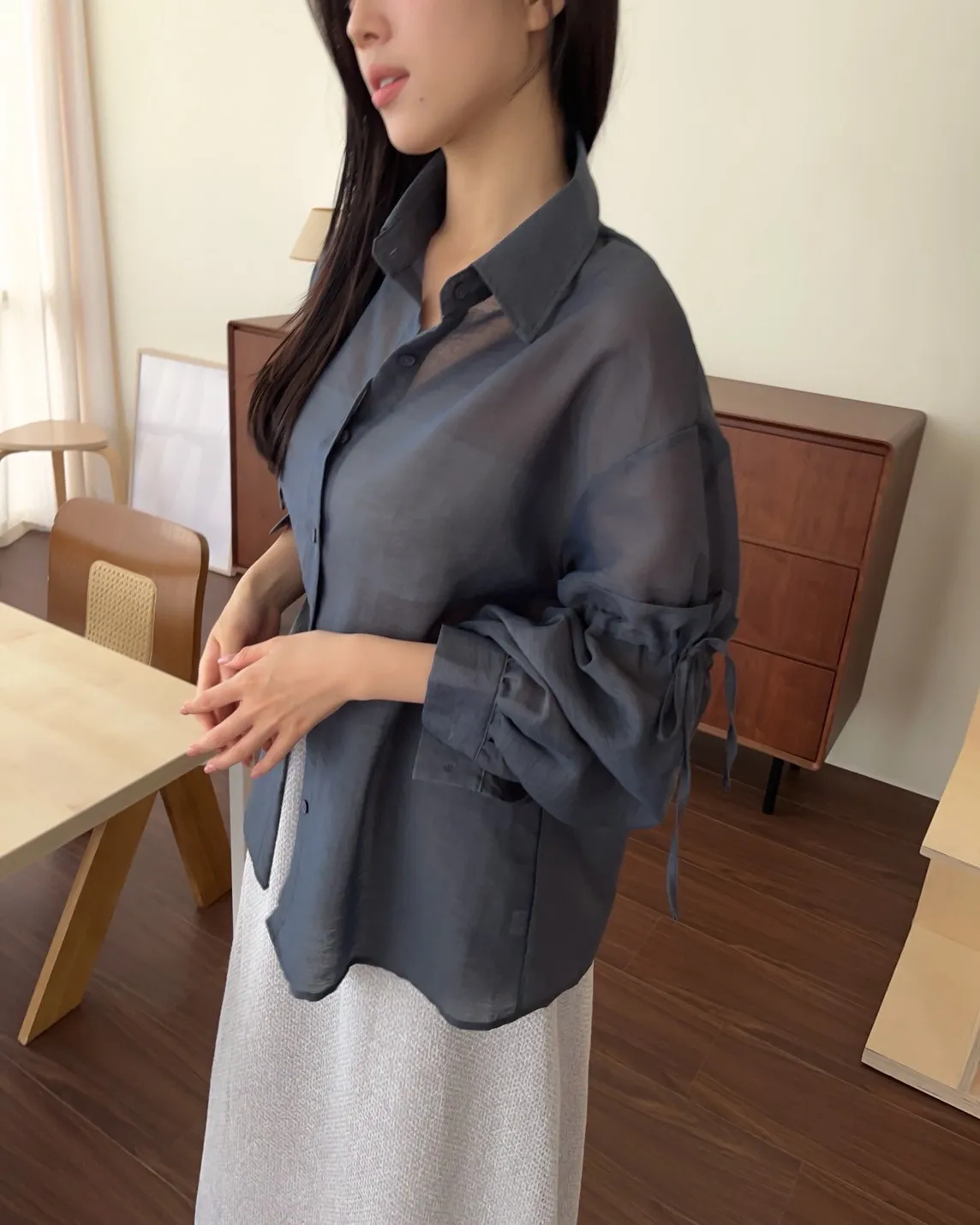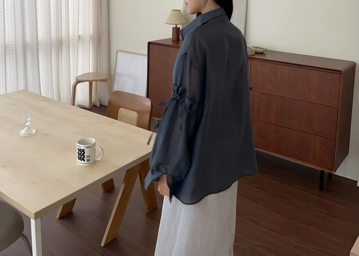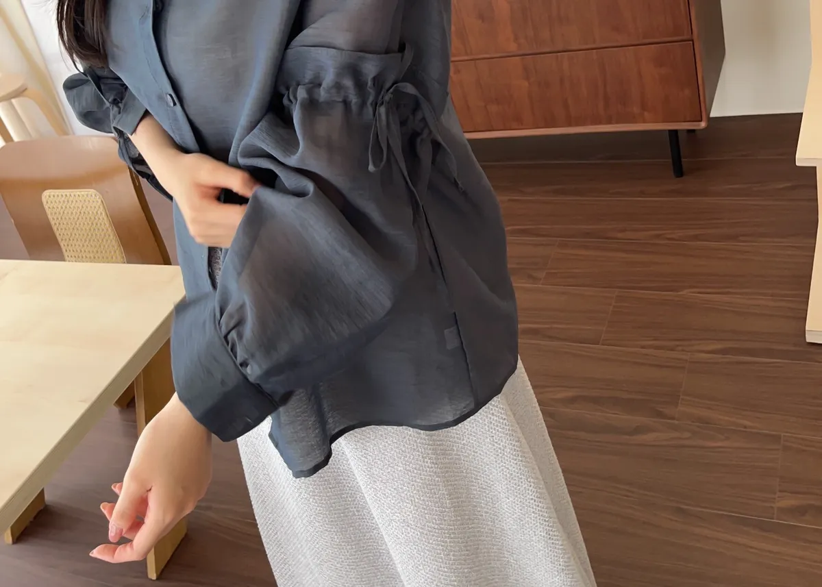 T0057清透感手袖抽繩透膚襯衫(米/淺灰/深灰)(售完不補)