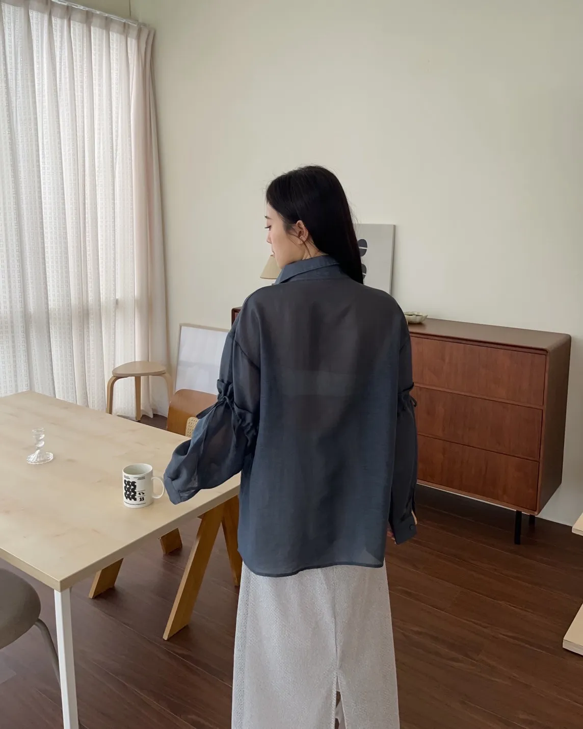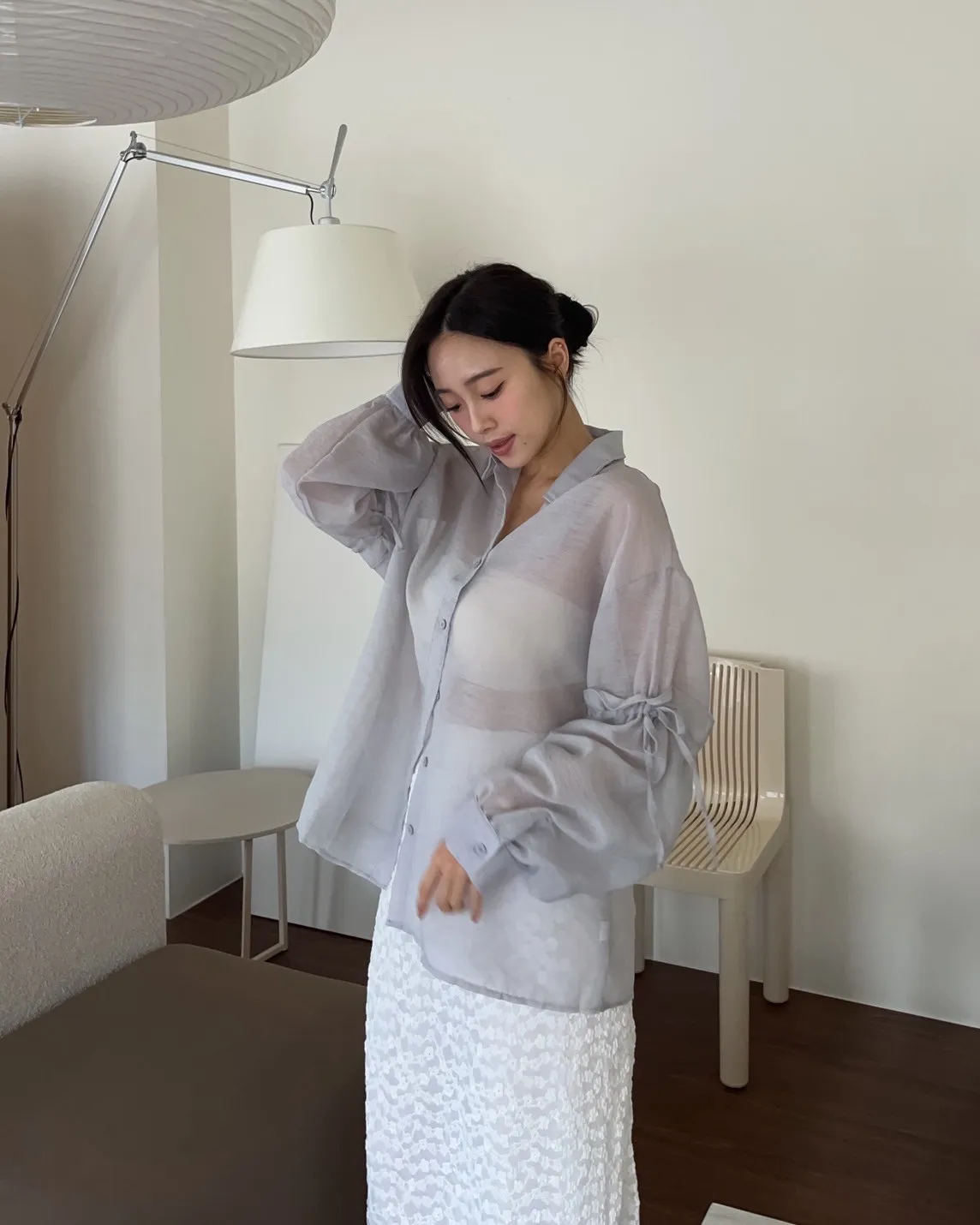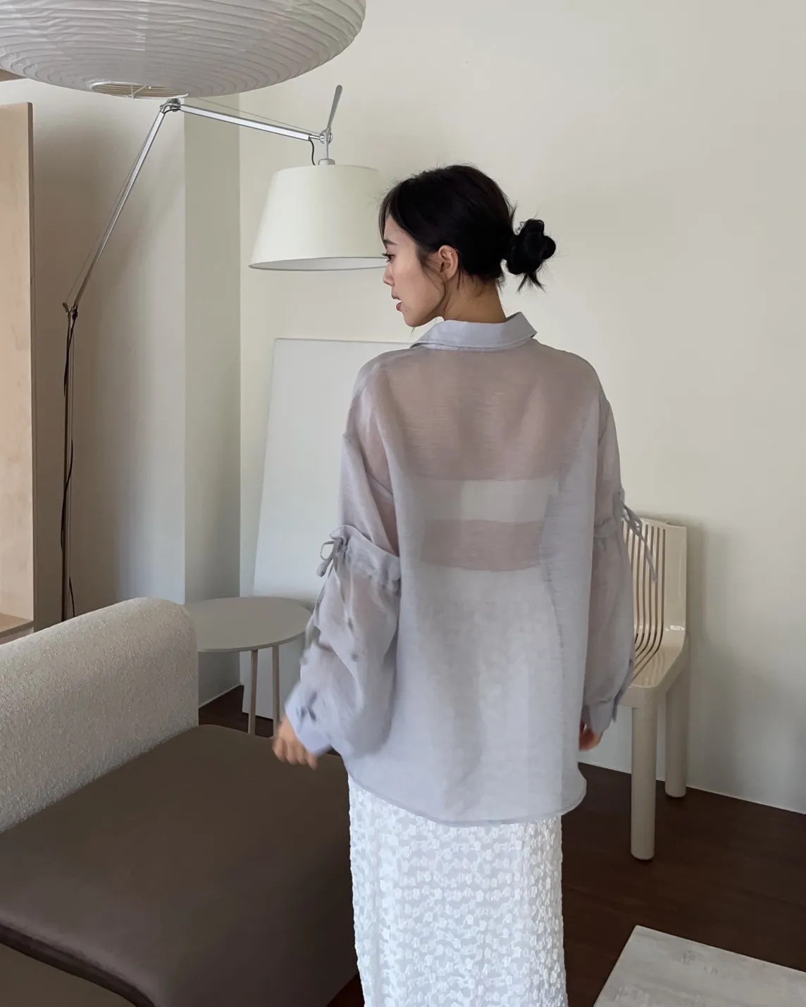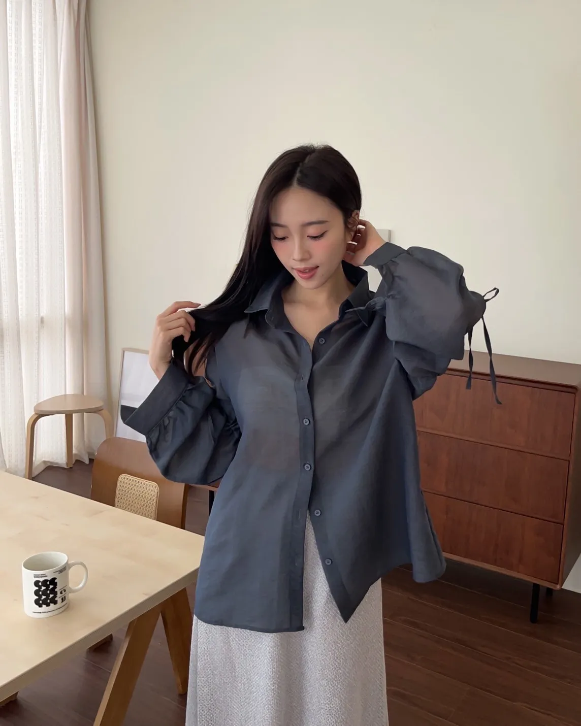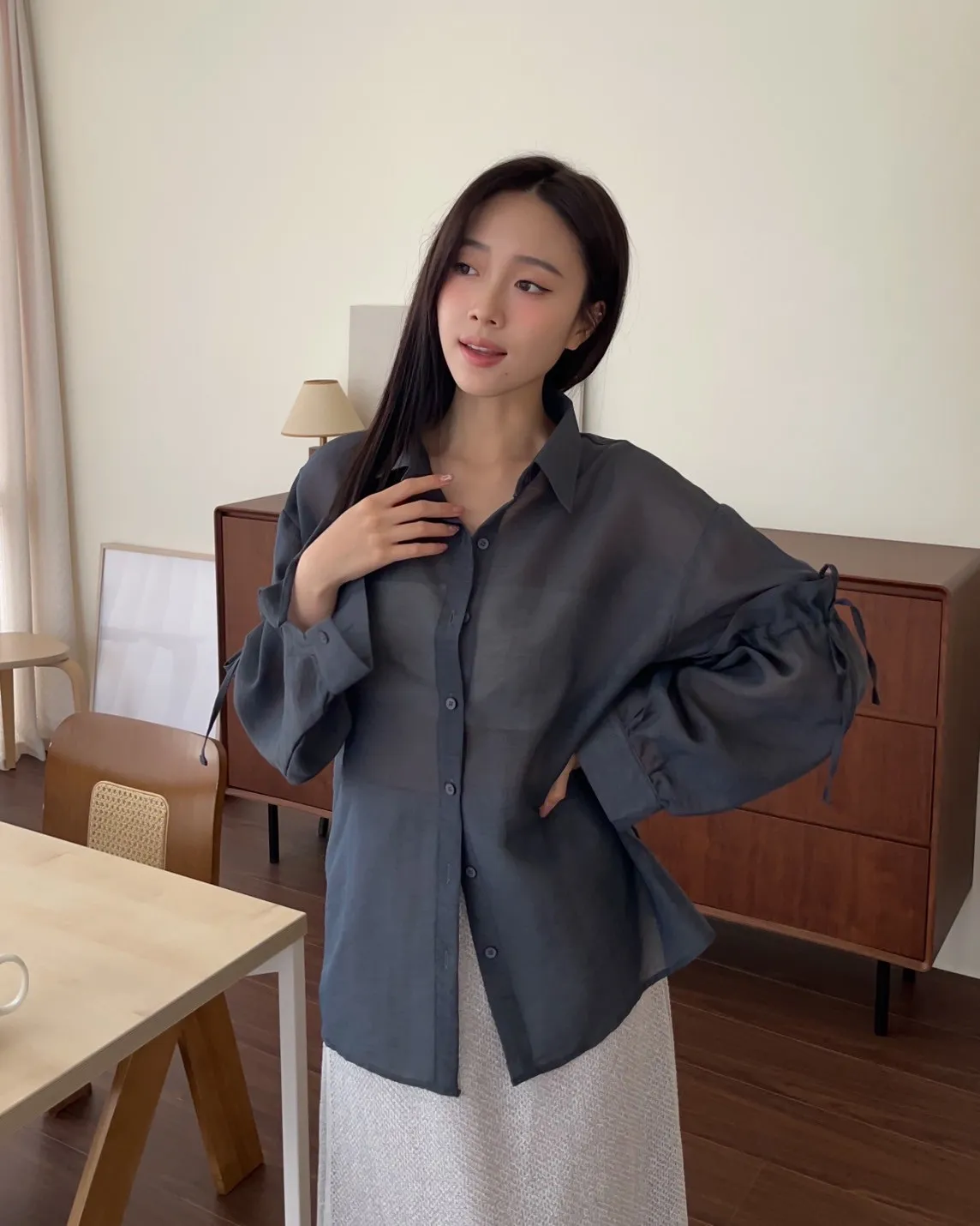 T0057清透感手袖抽繩透膚襯衫(米/淺灰/深灰)(售完不補)