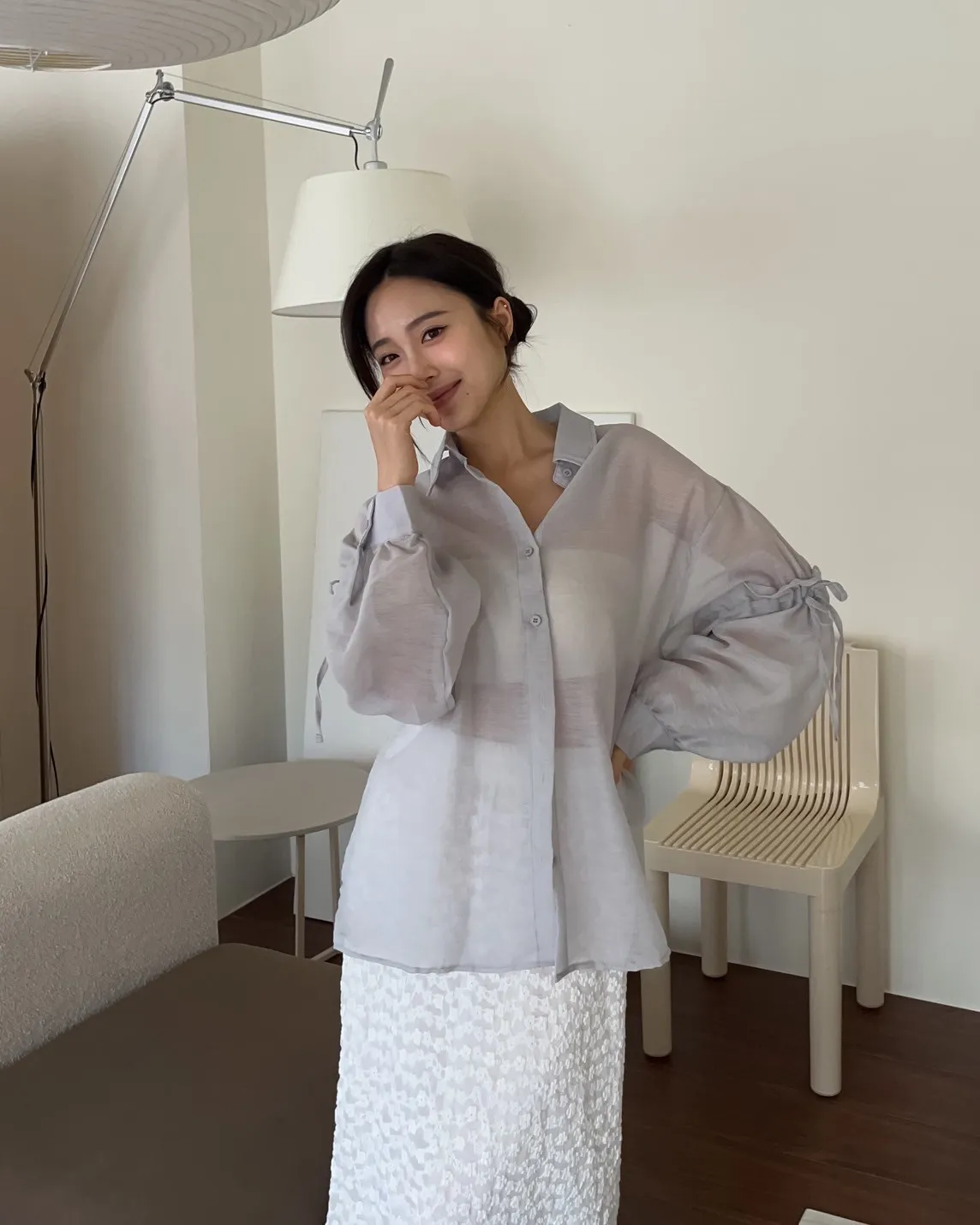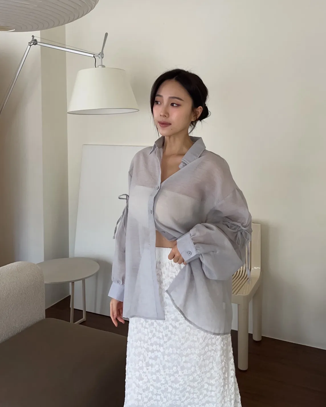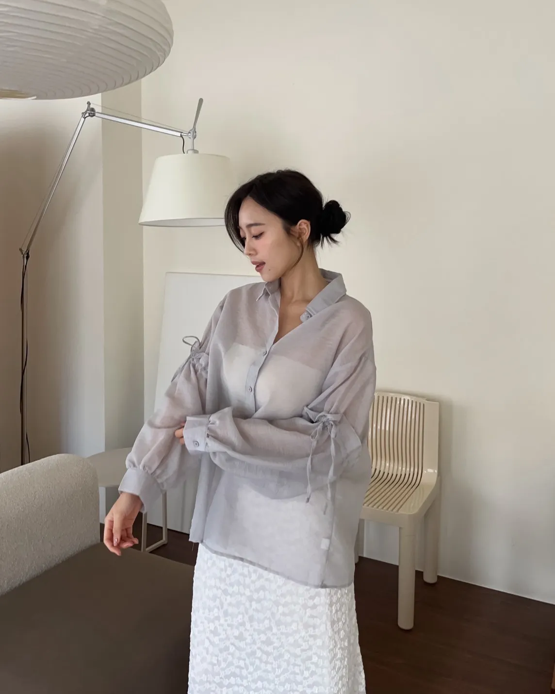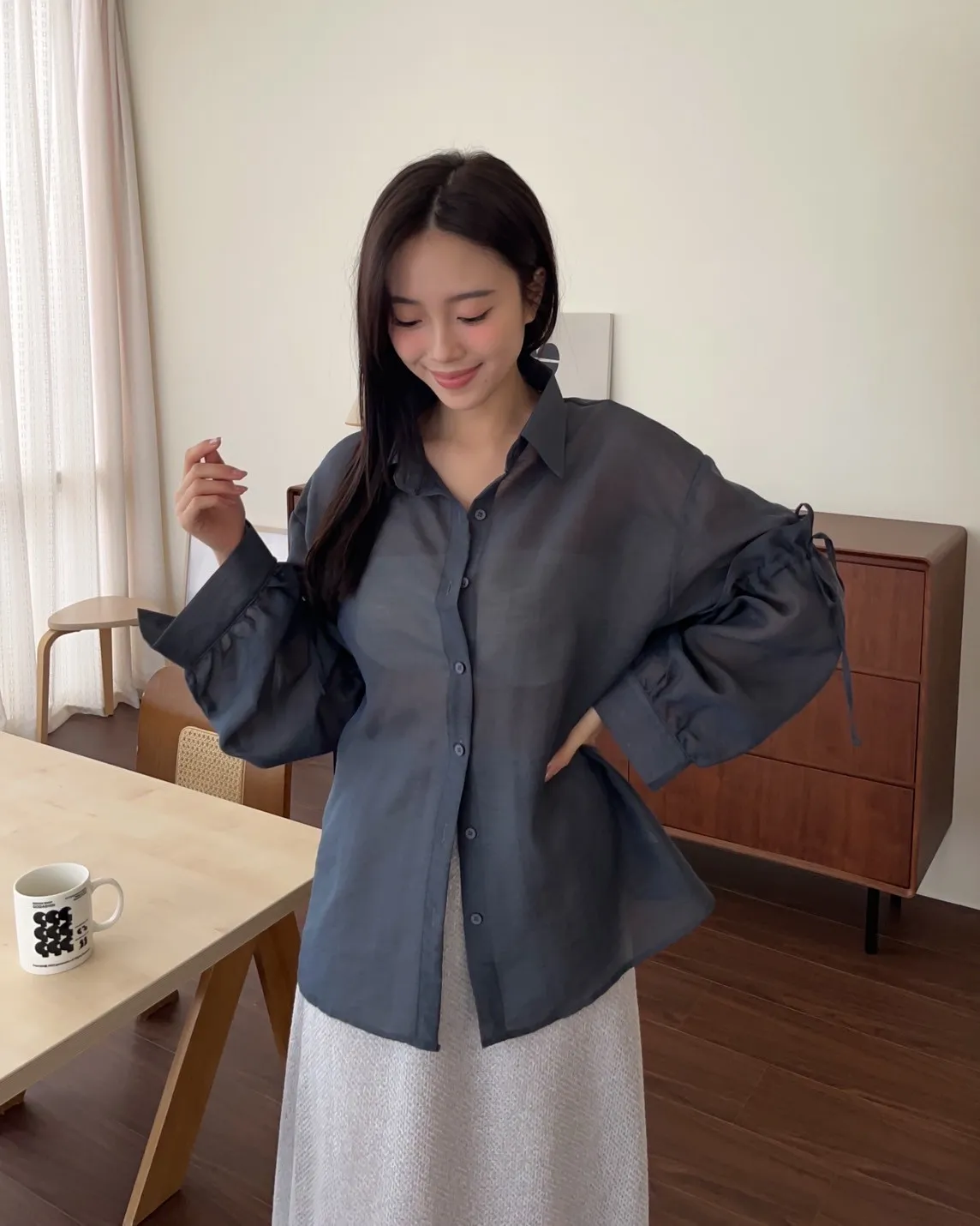 T0057清透感手袖抽繩透膚襯衫(米/淺灰/深灰)(售完不補)
