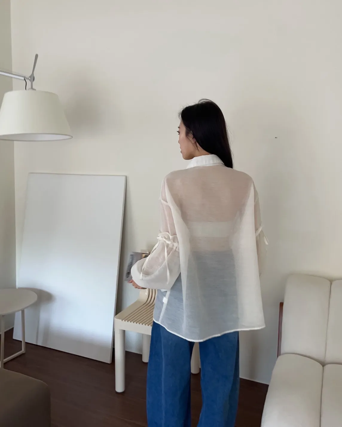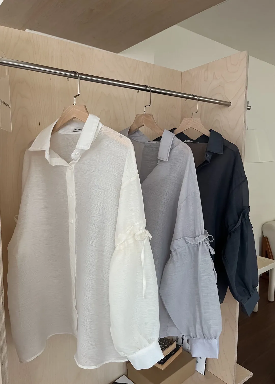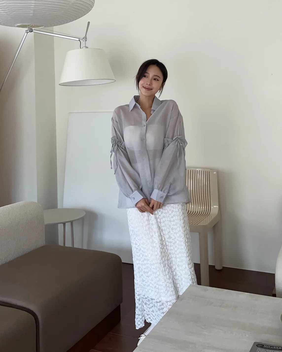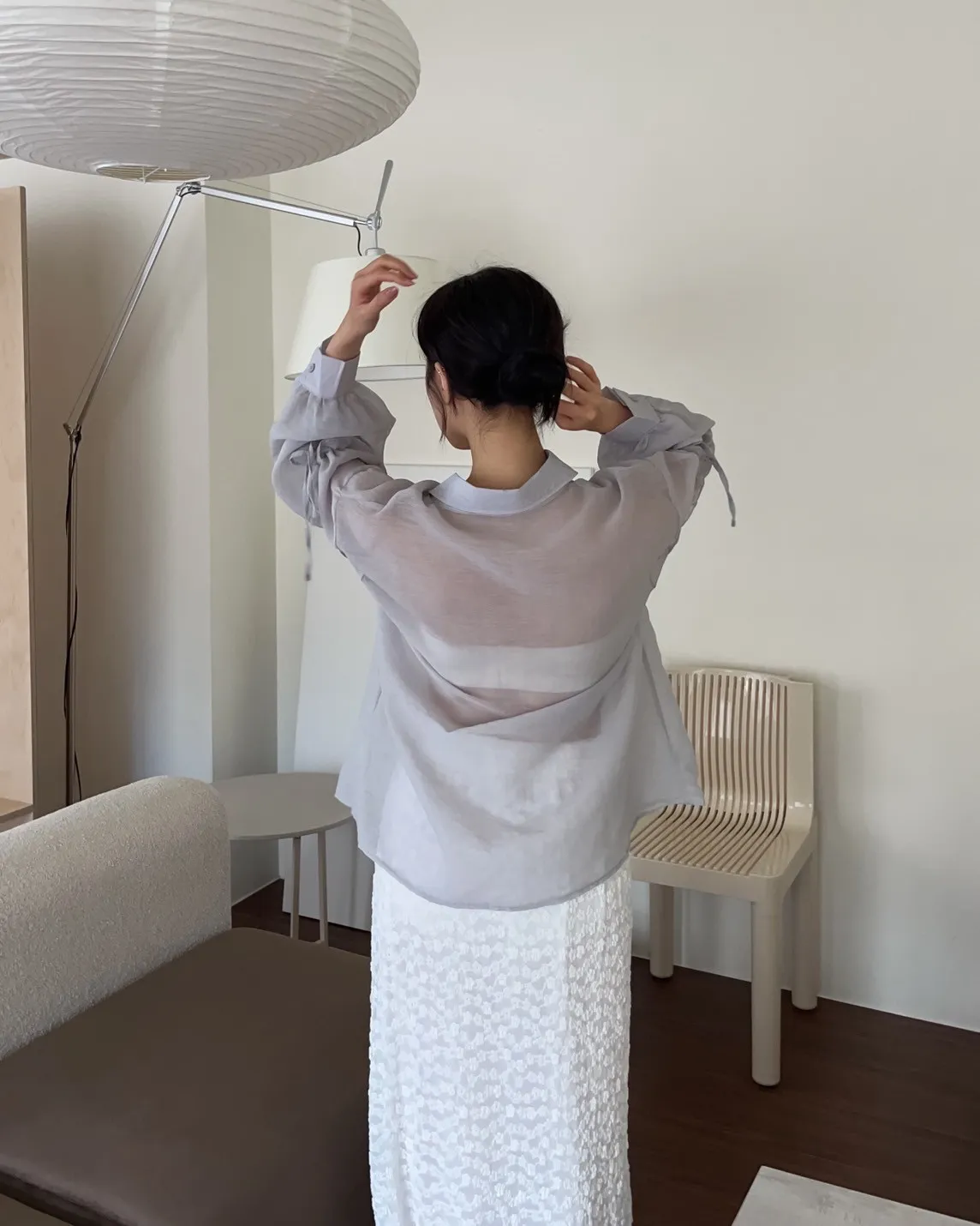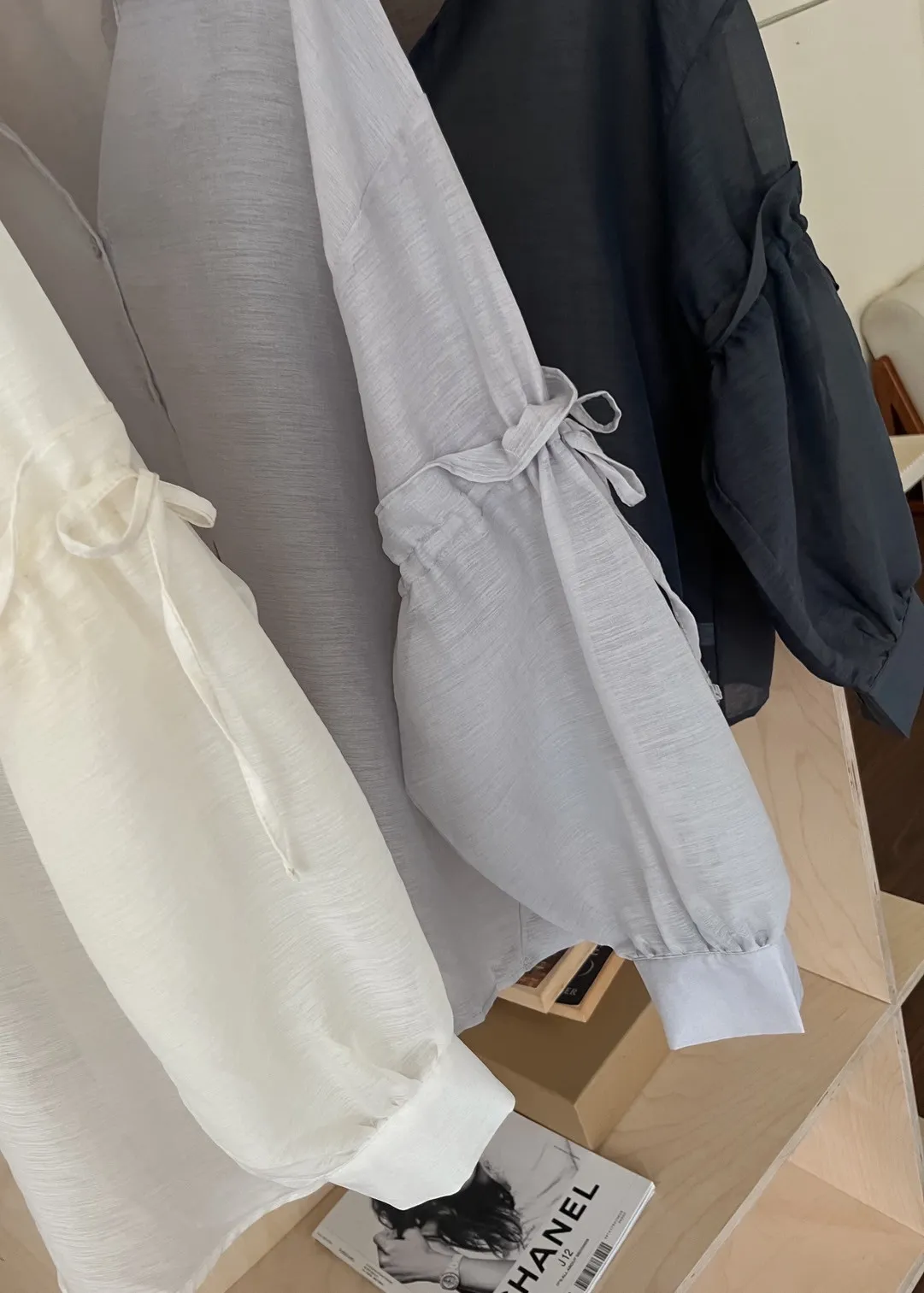 T0057清透感手袖抽繩透膚襯衫(米/淺灰/深灰)(售完不補)