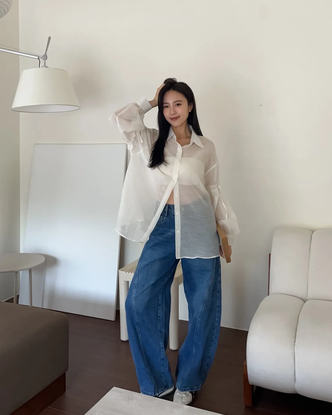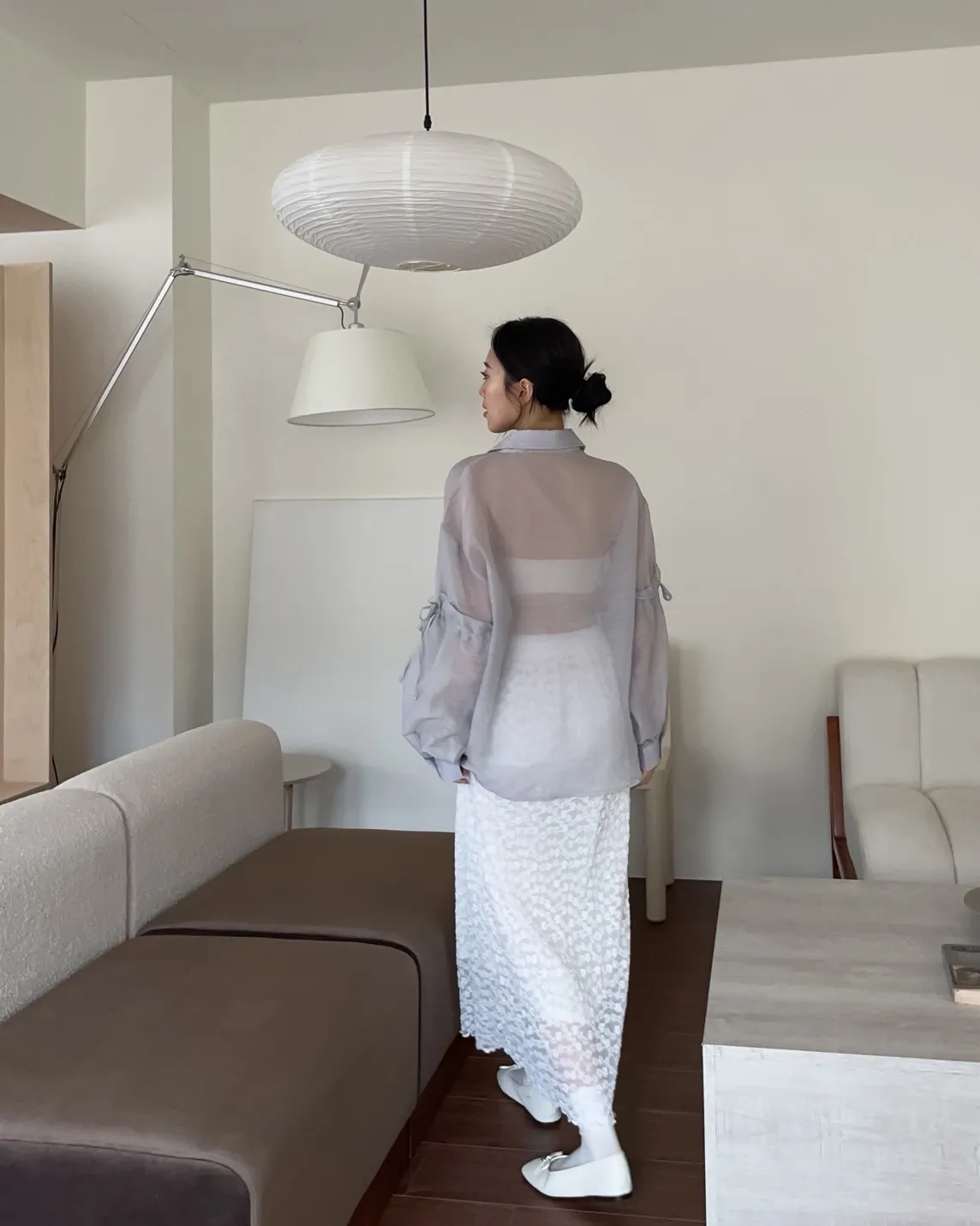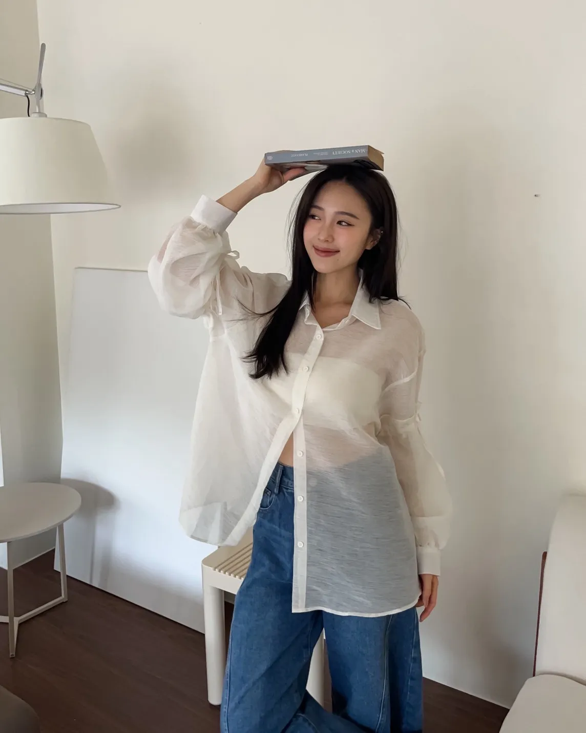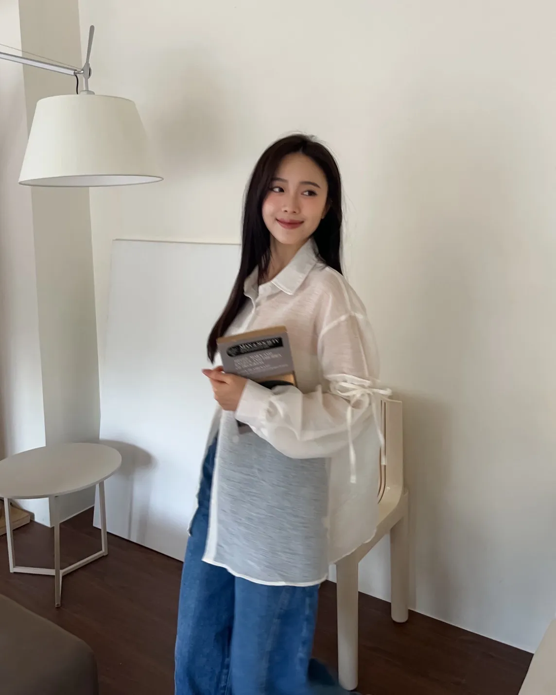 T0057清透感手袖抽繩透膚襯衫(米/淺灰/深灰)(售完不補)
