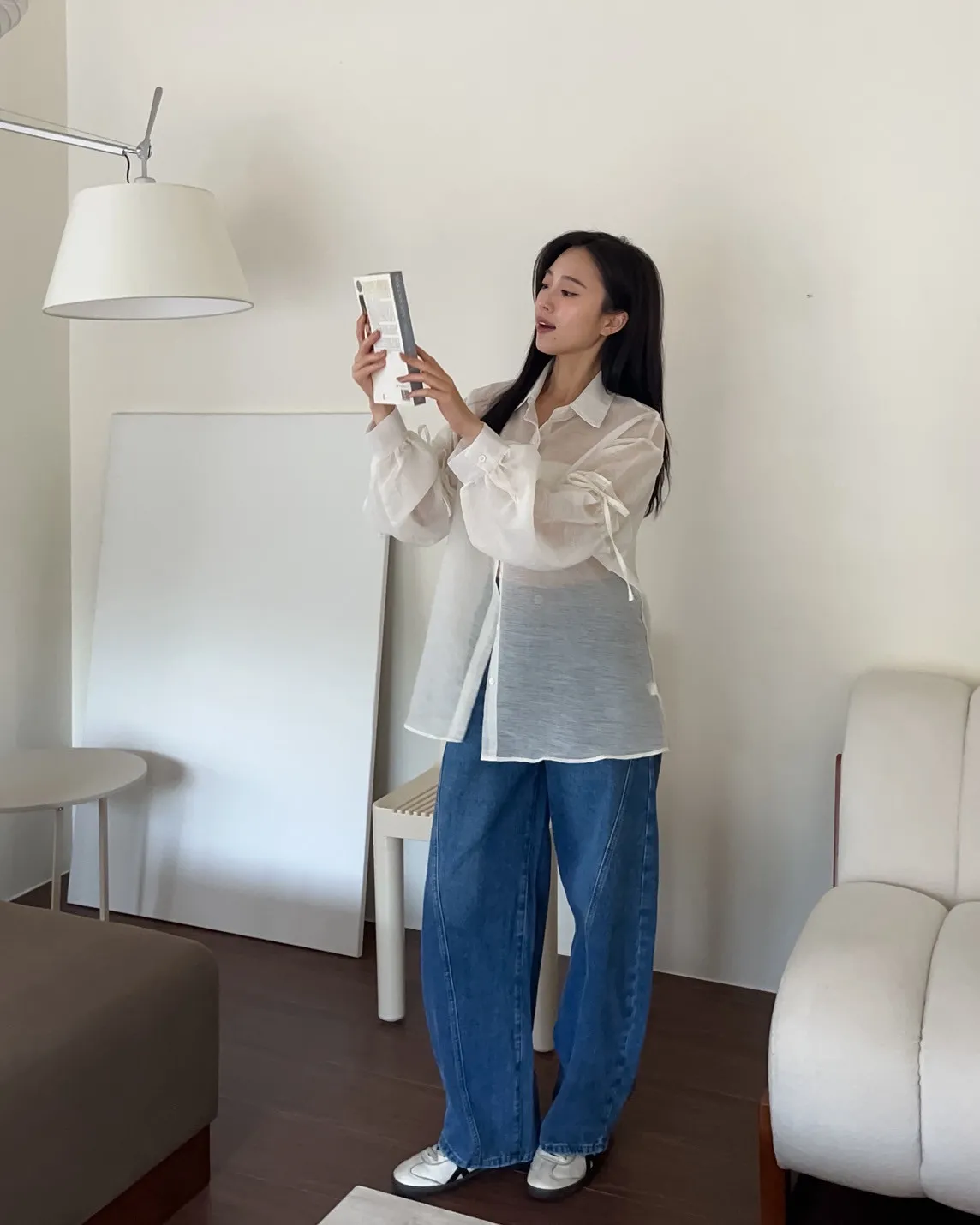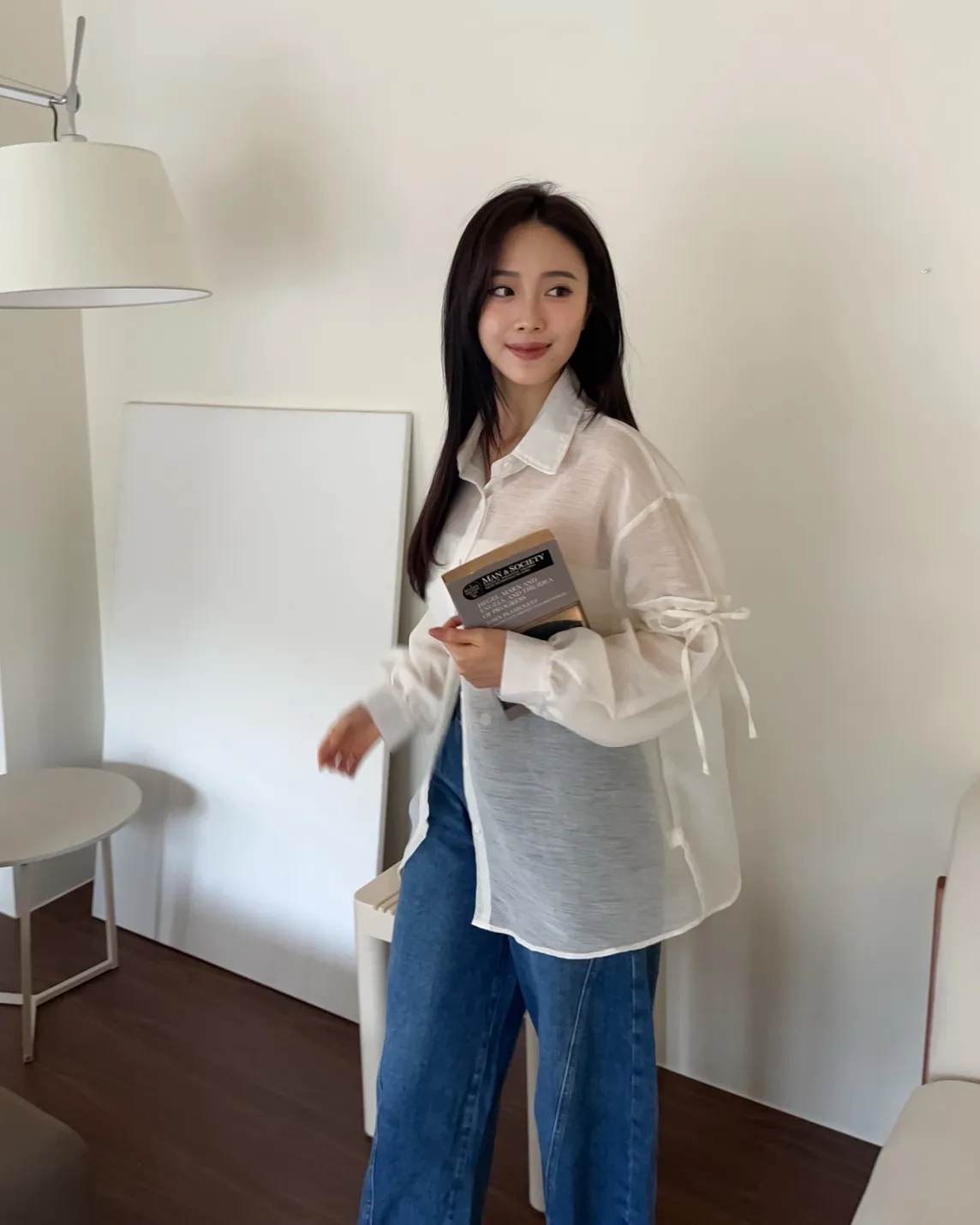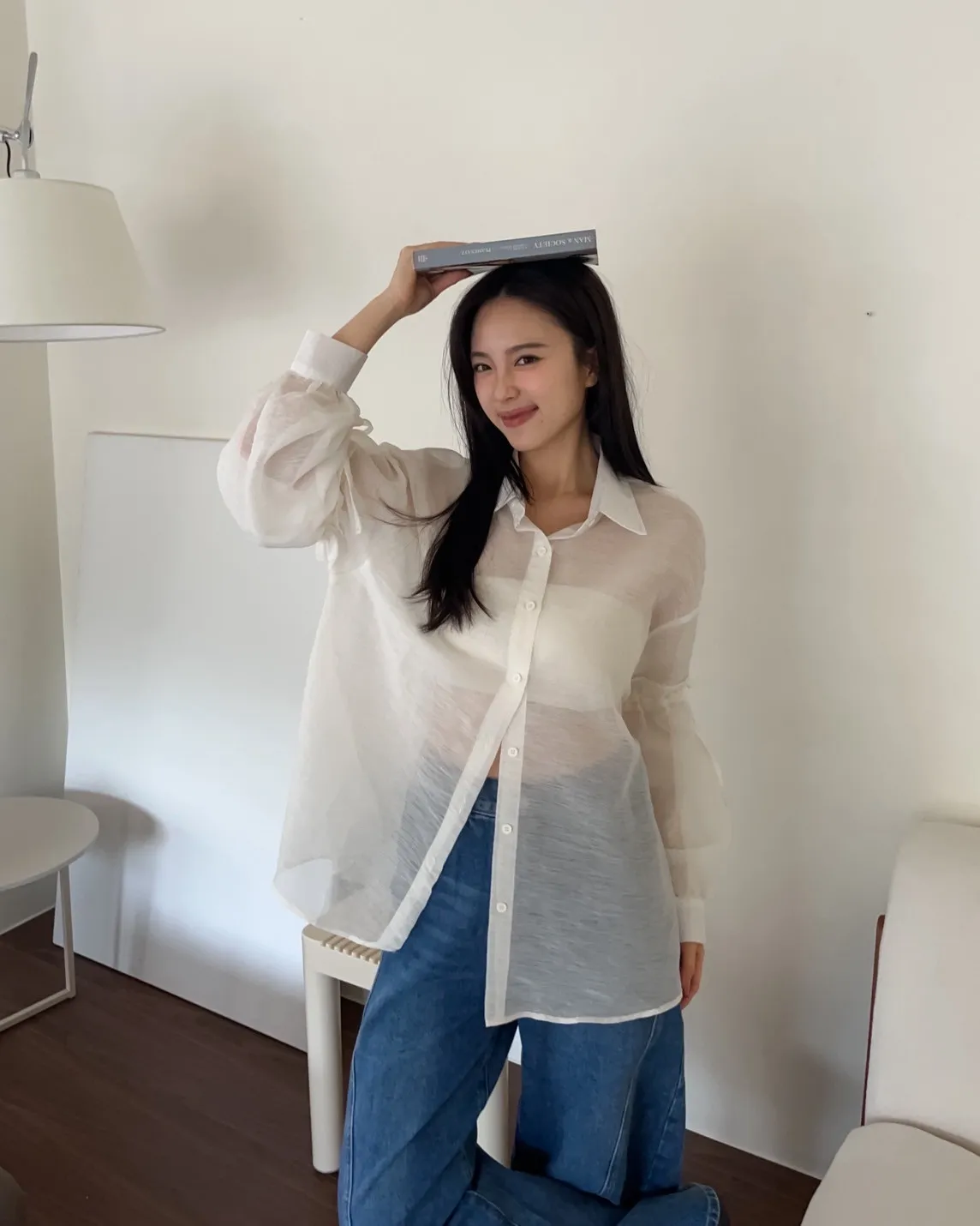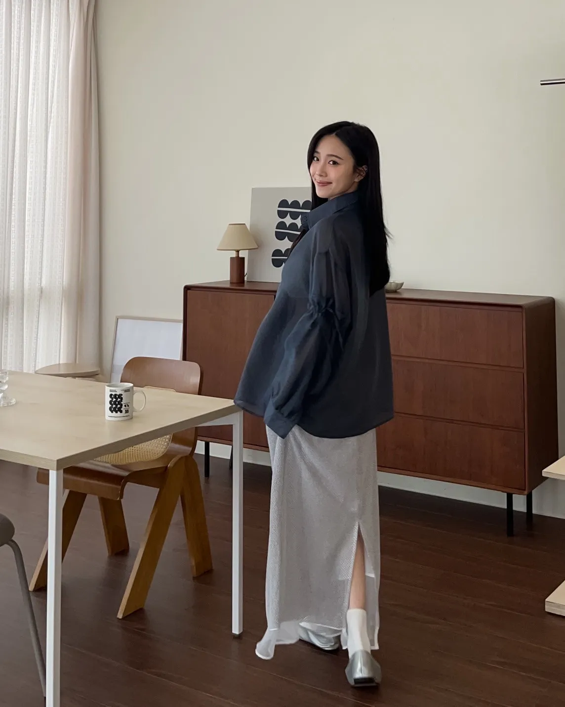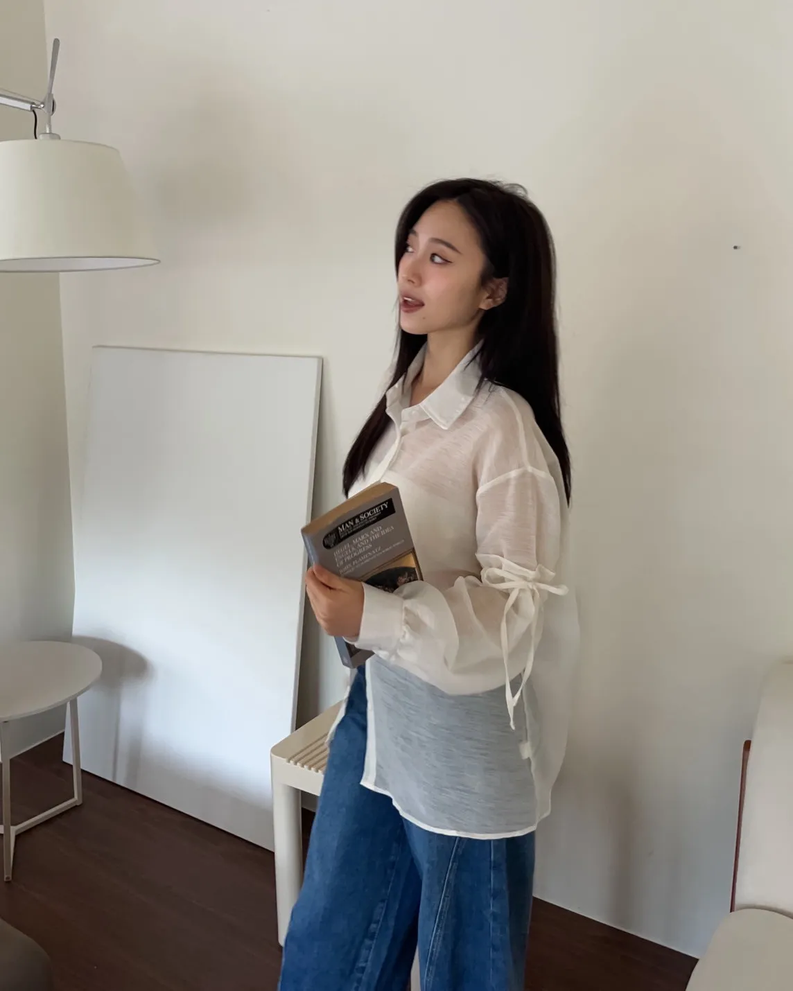 T0057清透感手袖抽繩透膚襯衫(米/淺灰/深灰)(售完不補)