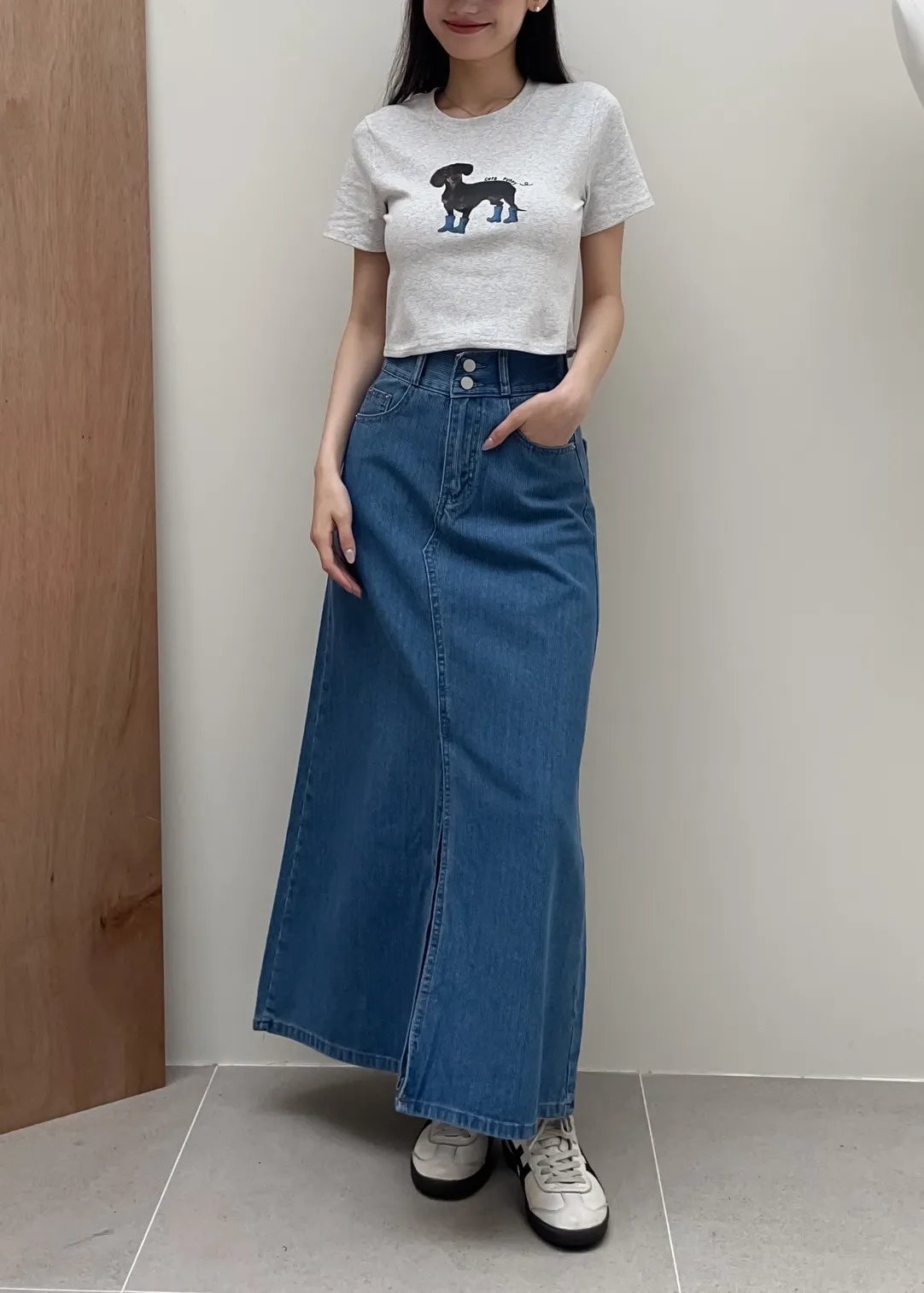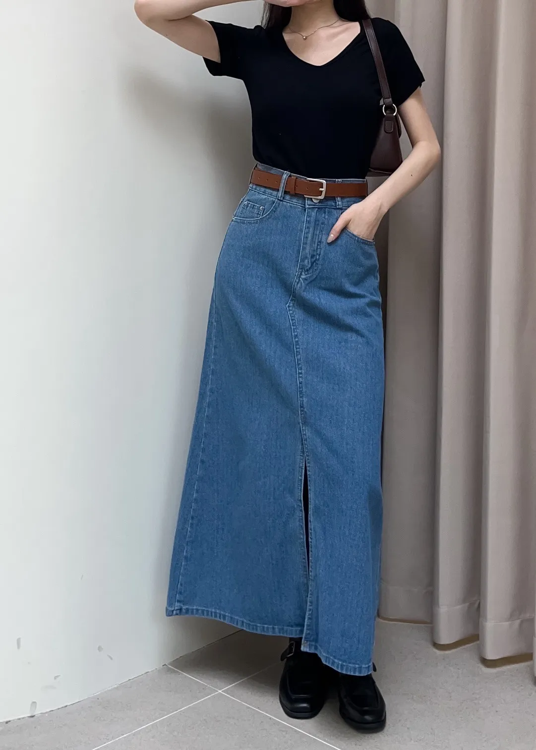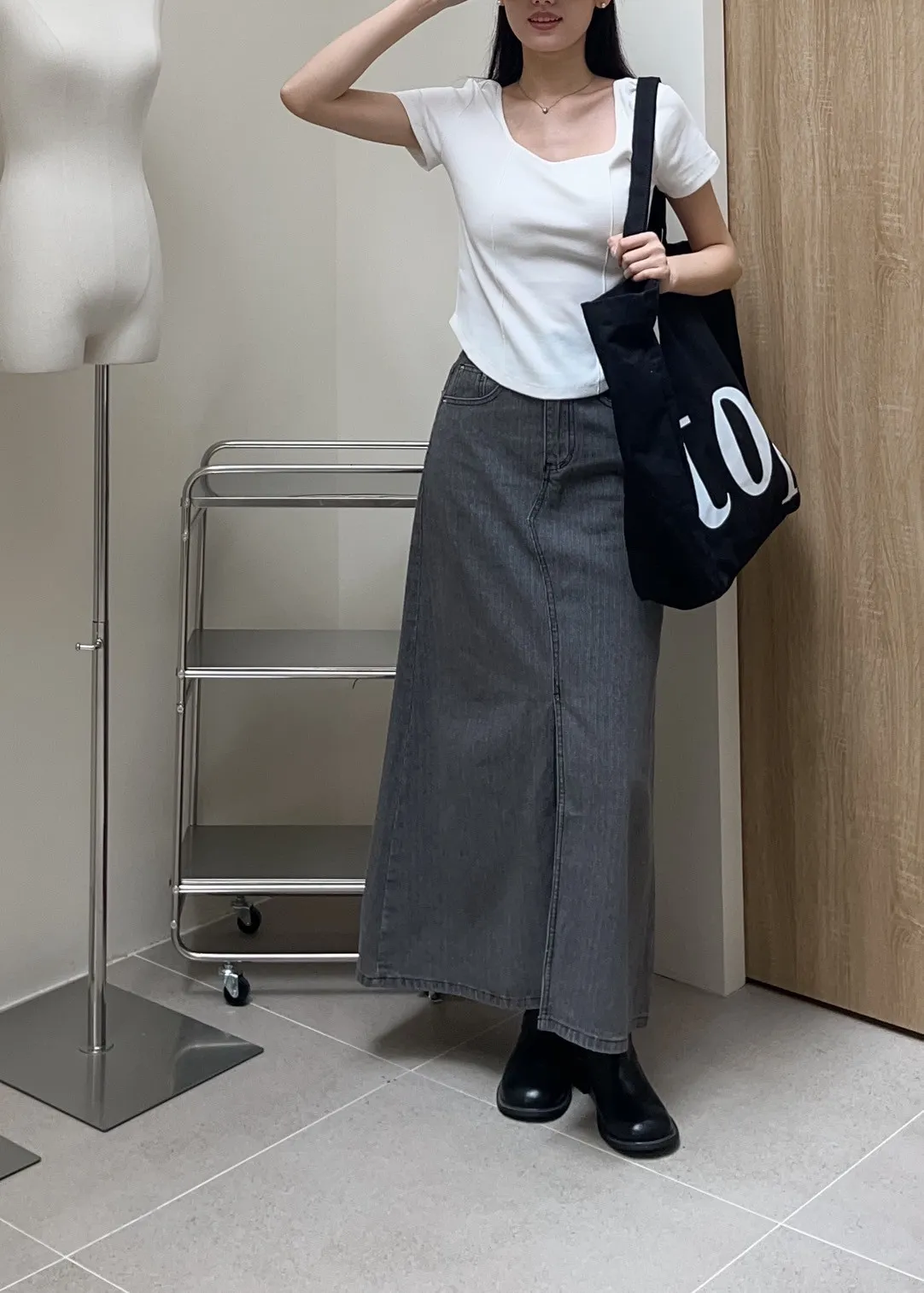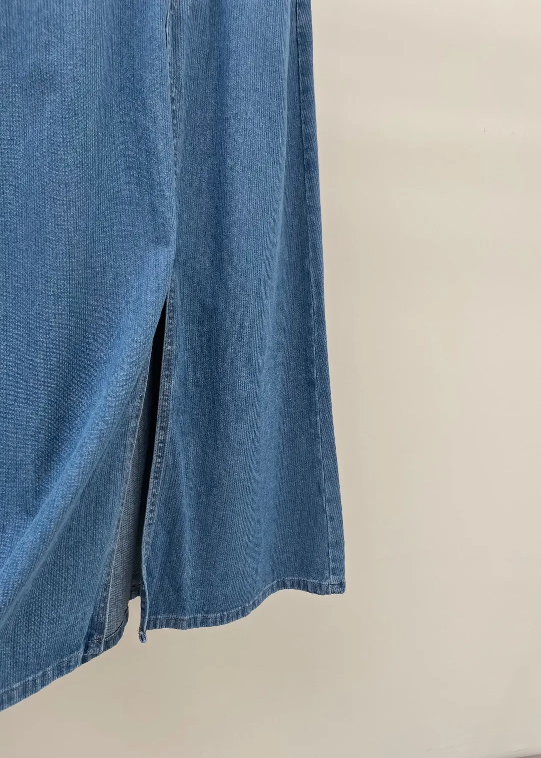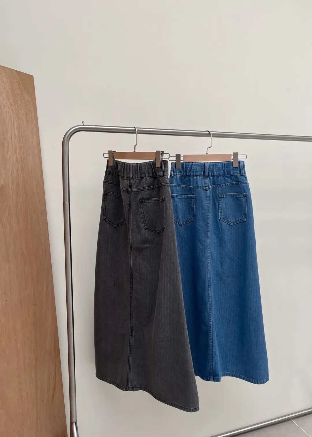 R0074[S-XL]立體直紋前開岔牛仔長裙(藍/灰)(售完不補)