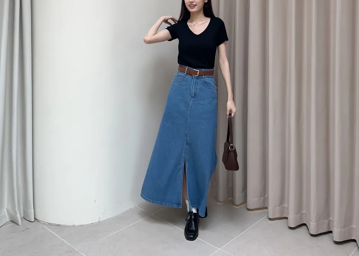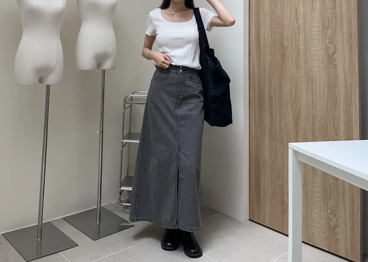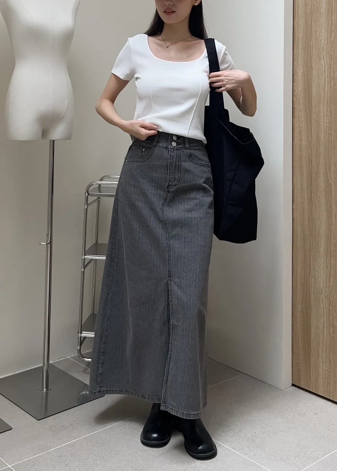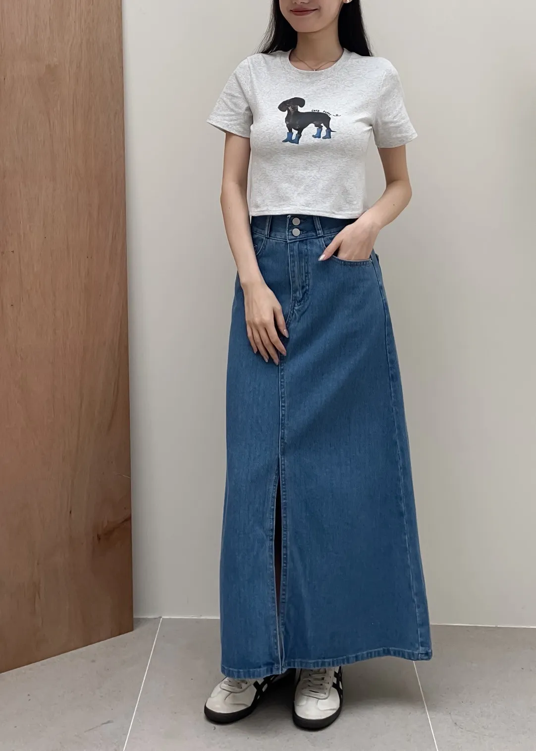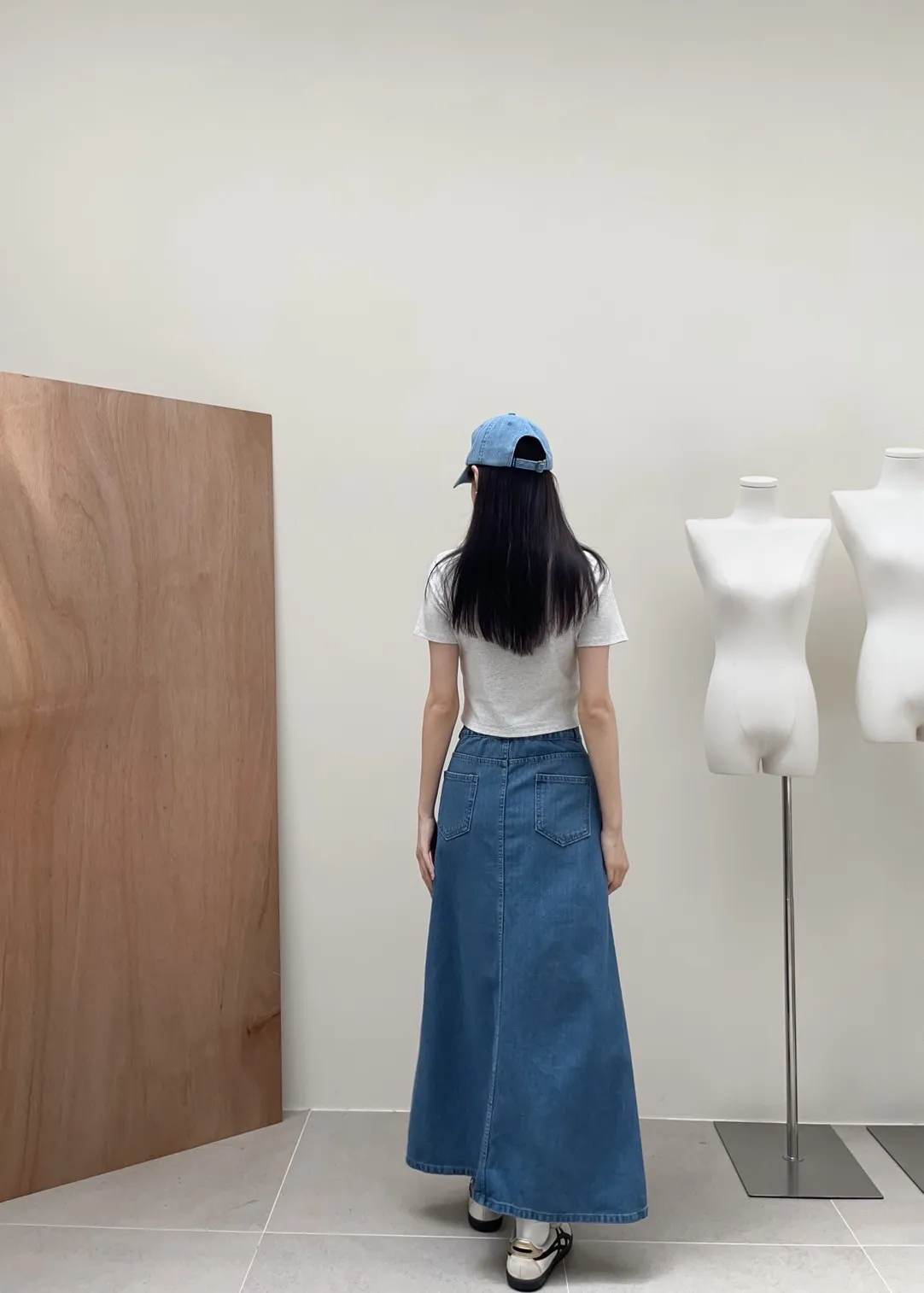 R0074[S-XL]立體直紋前開岔牛仔長裙(藍/灰)(售完不補)