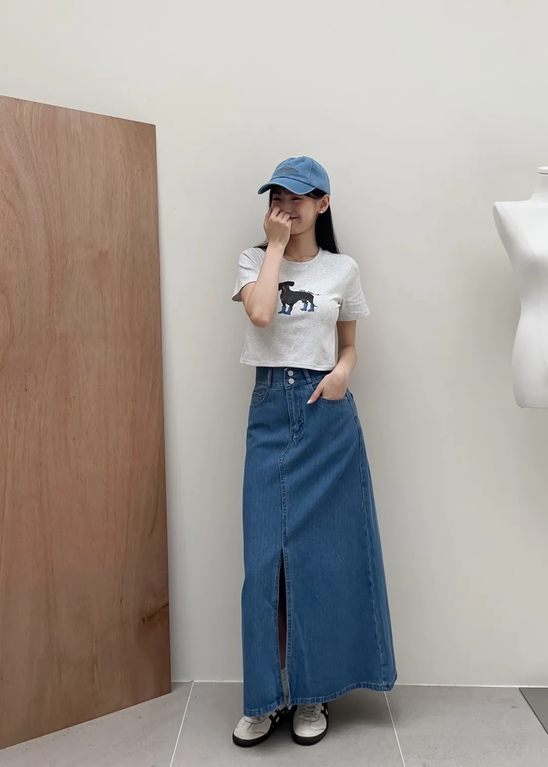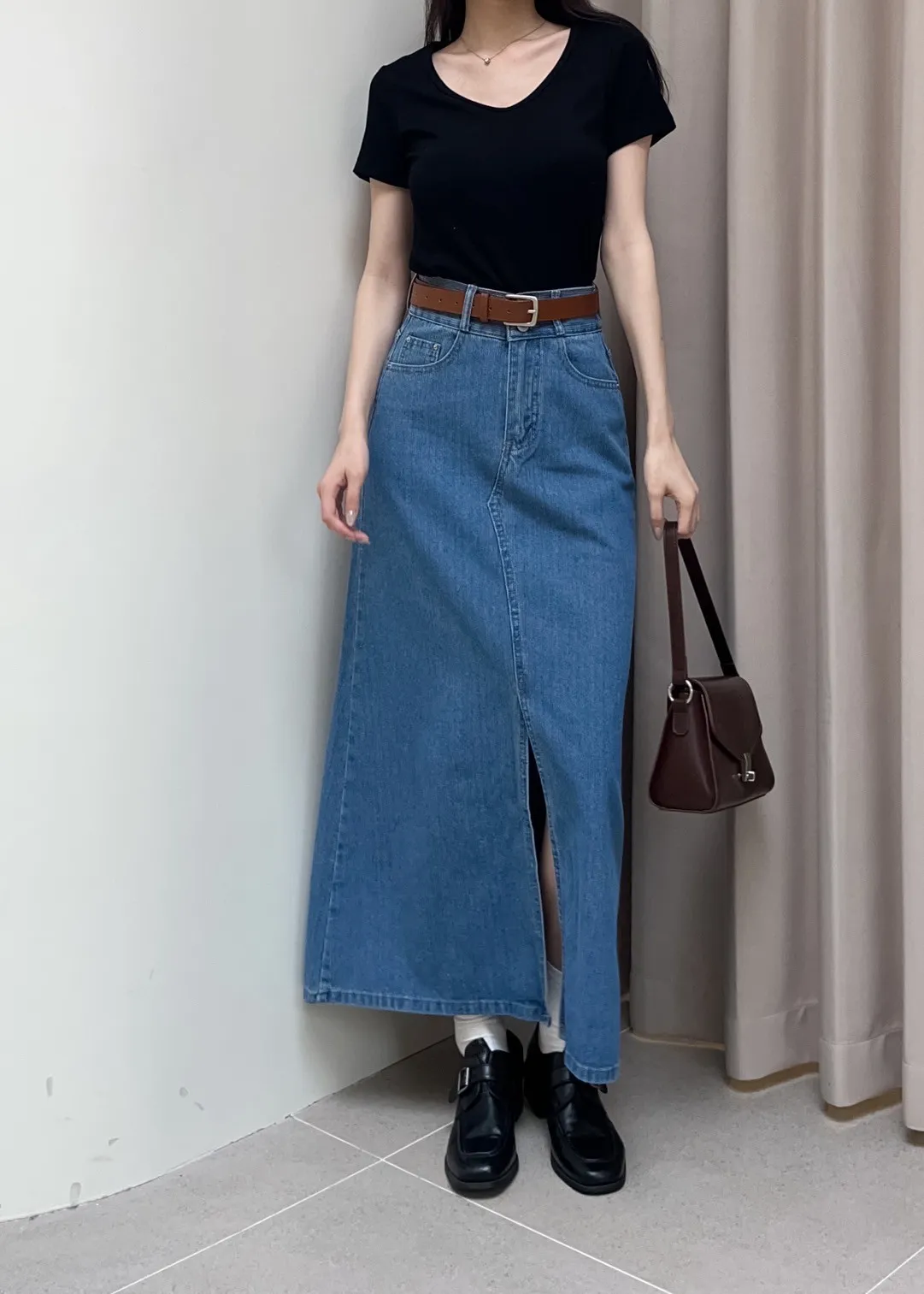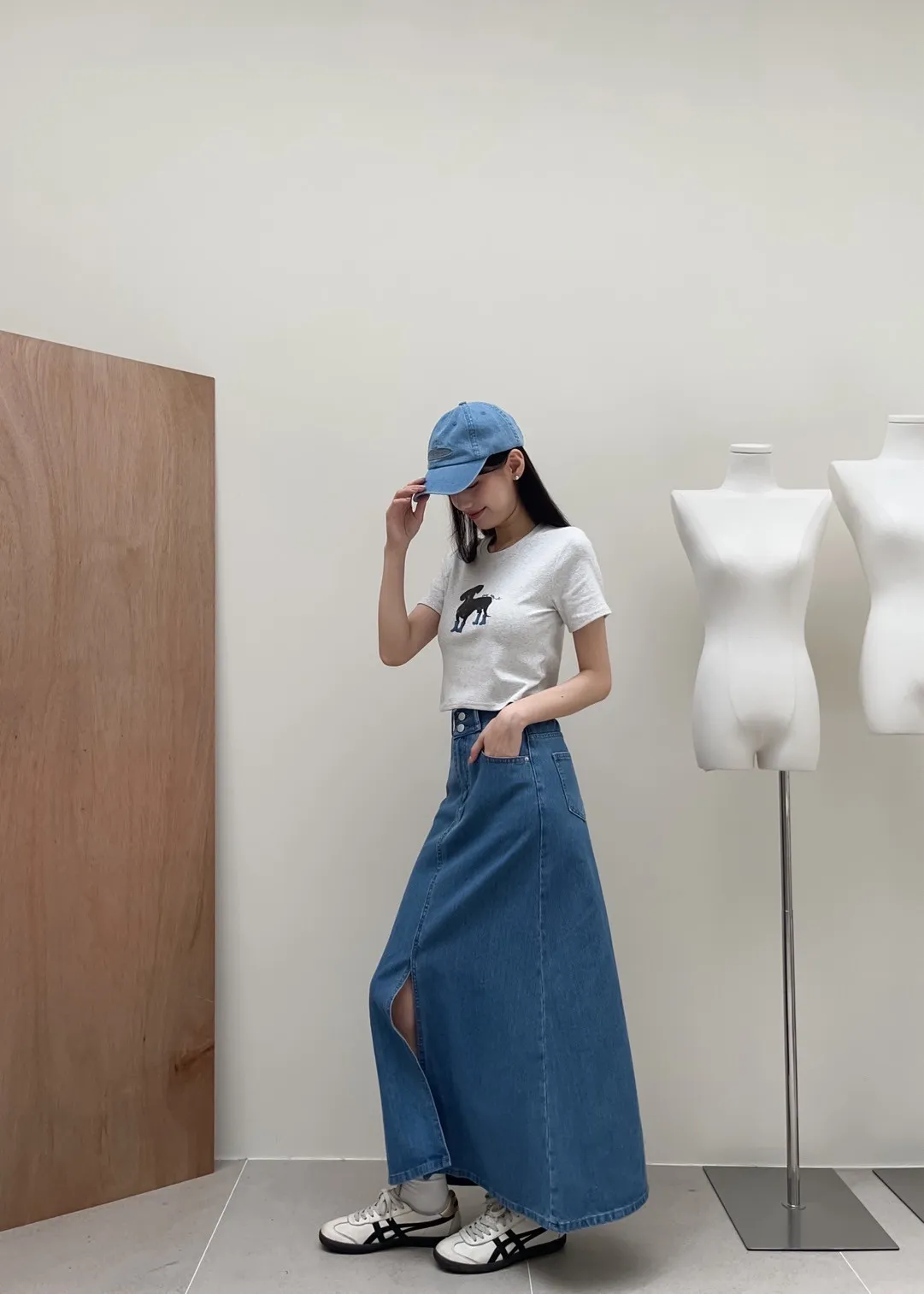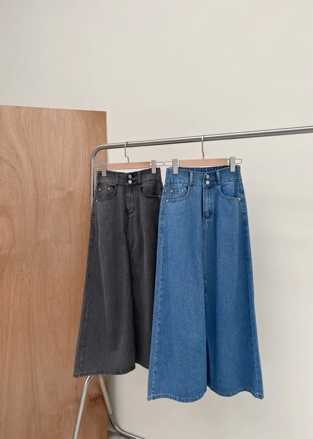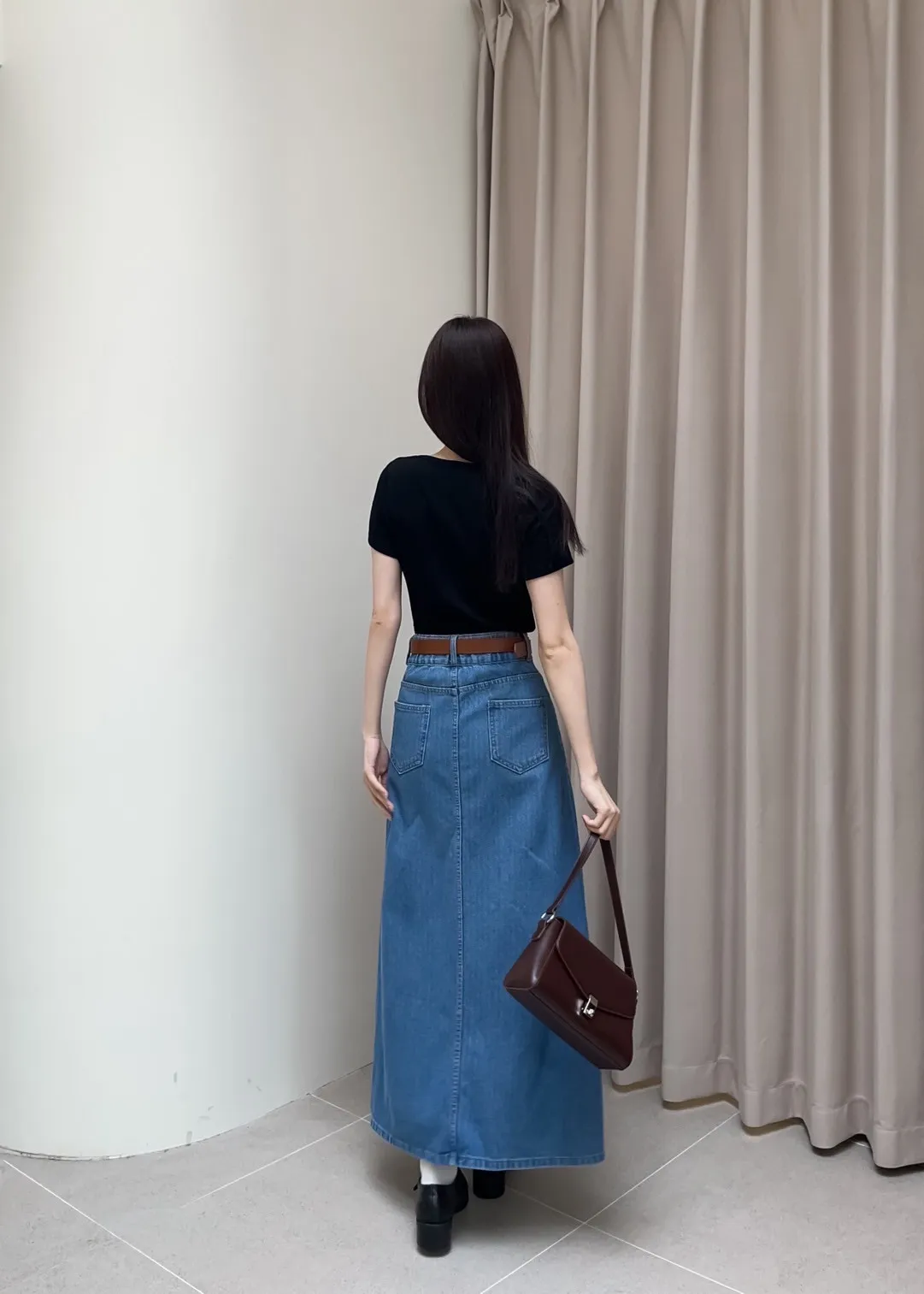 R0074[S-XL]立體直紋前開岔牛仔長裙(藍/灰)(售完不補)