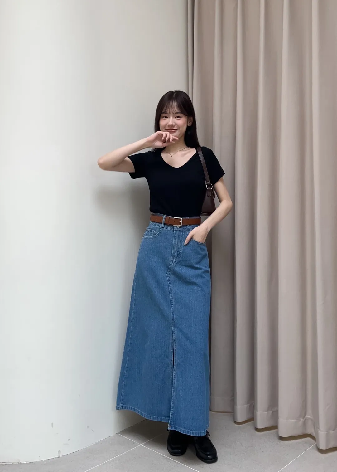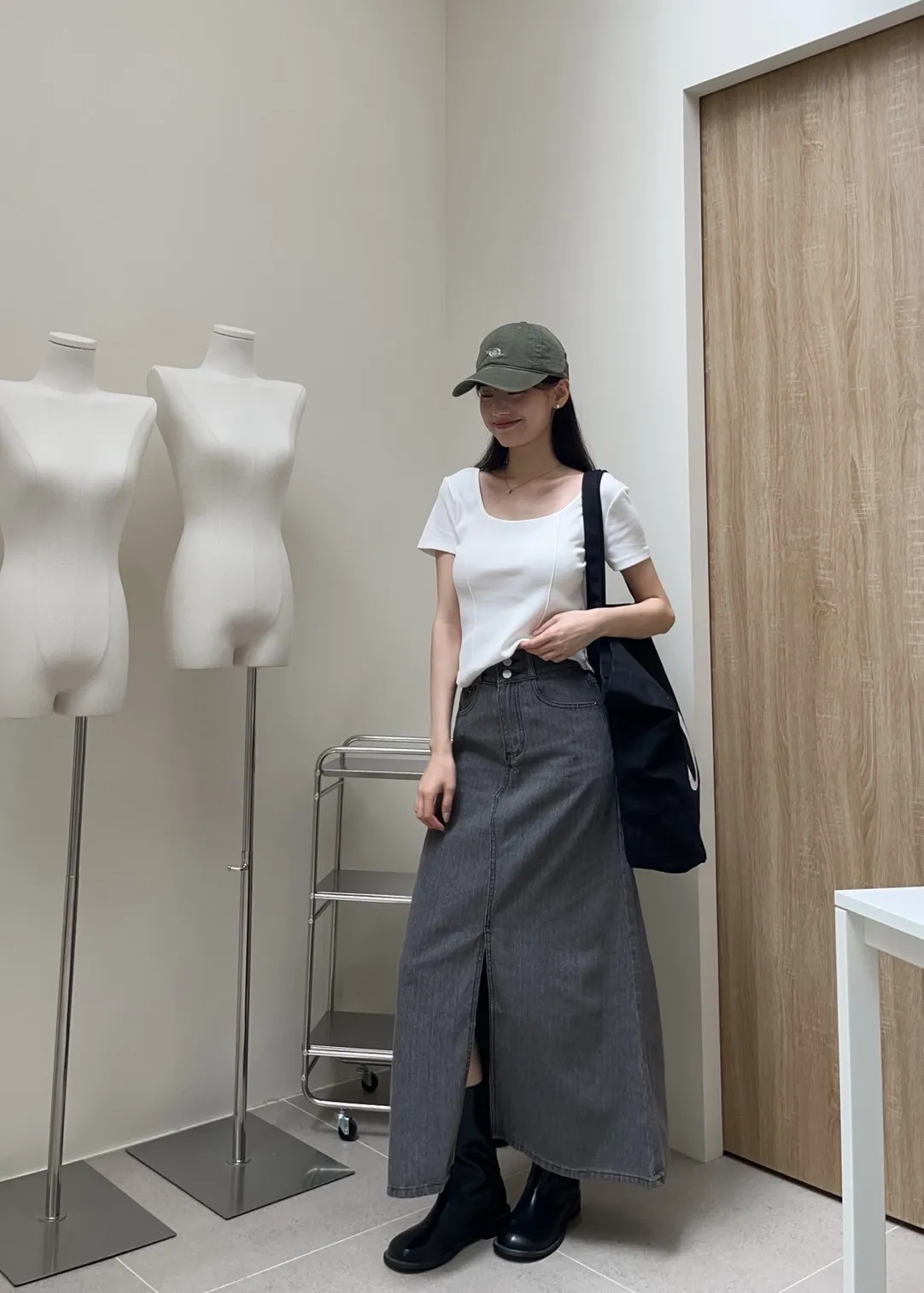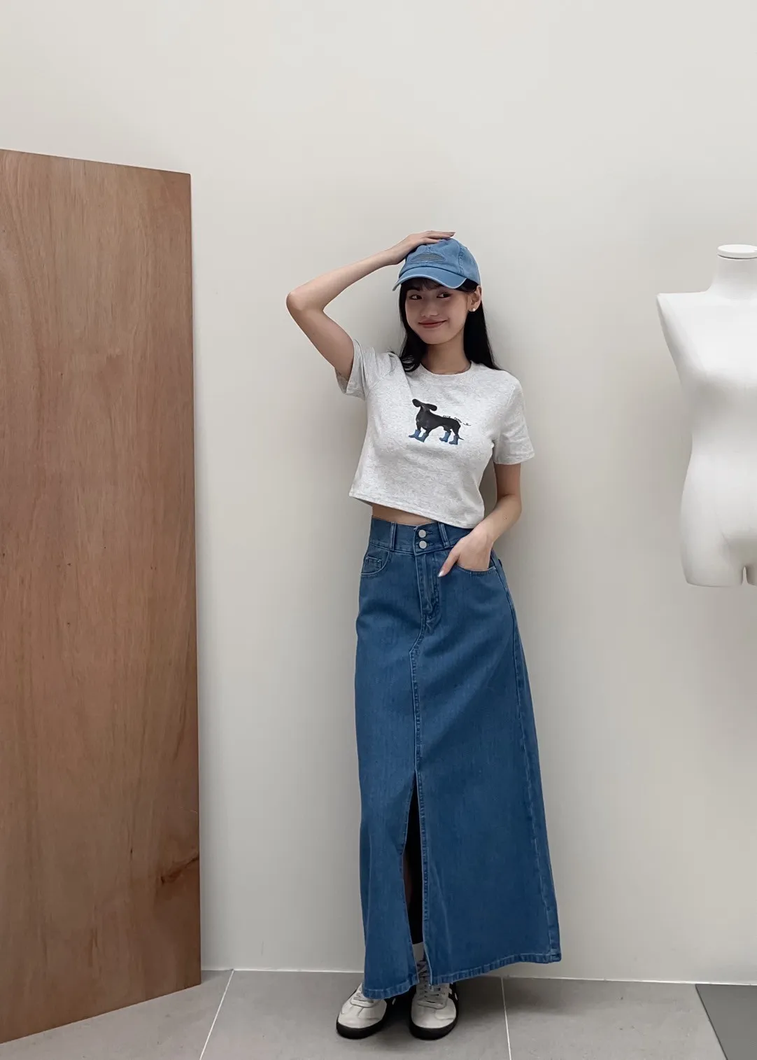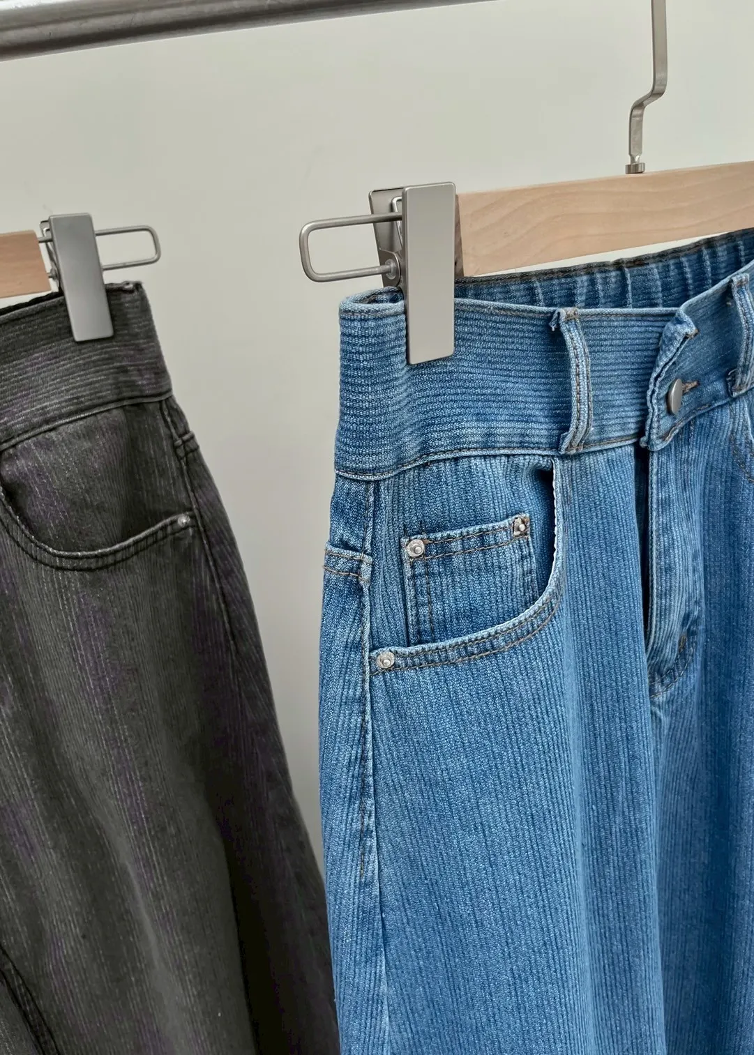 R0074[S-XL]立體直紋前開岔牛仔長裙(藍/灰)(售完不補)