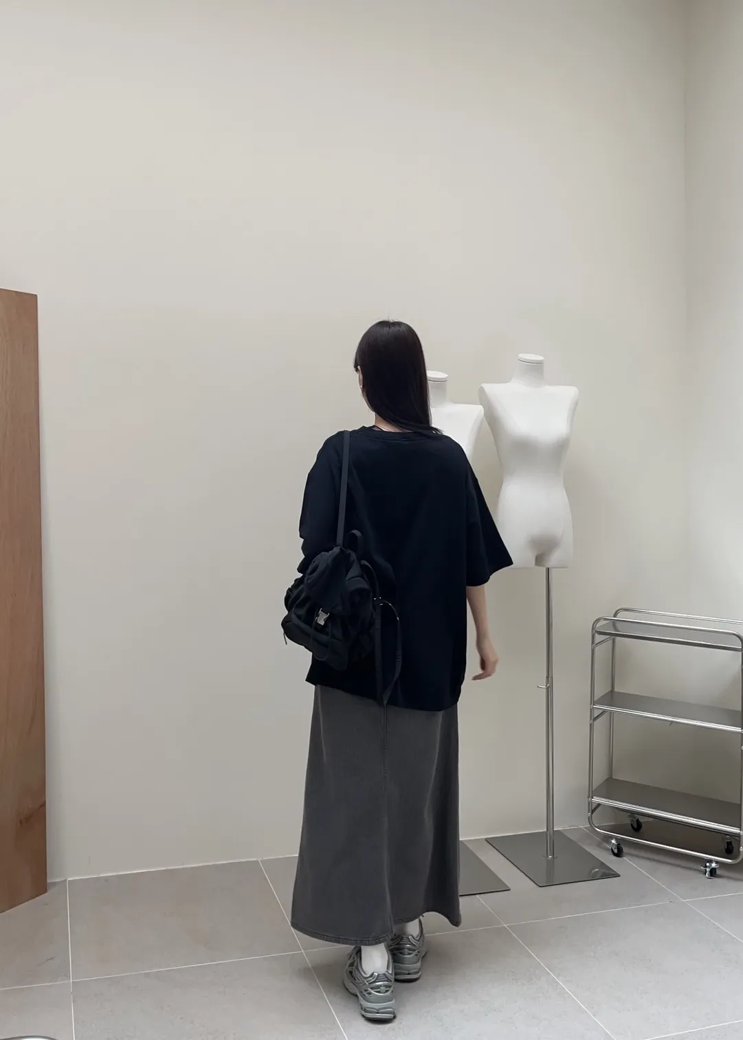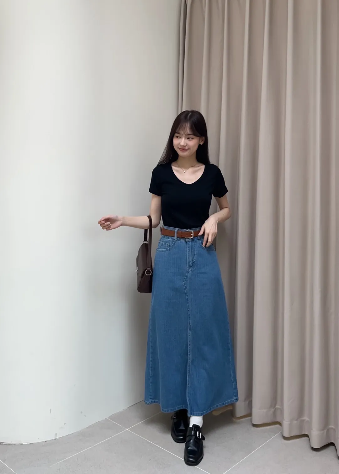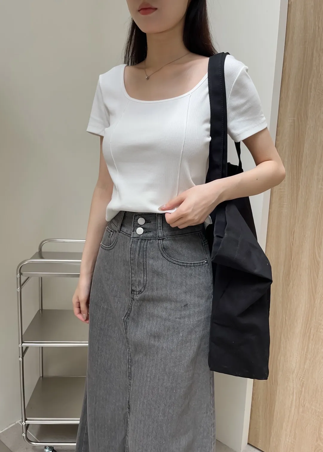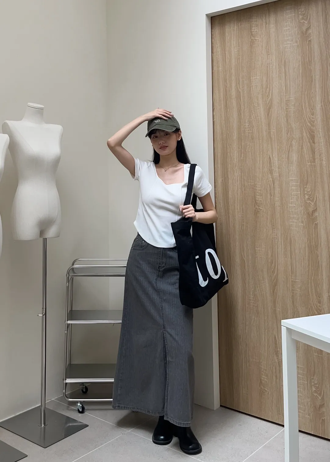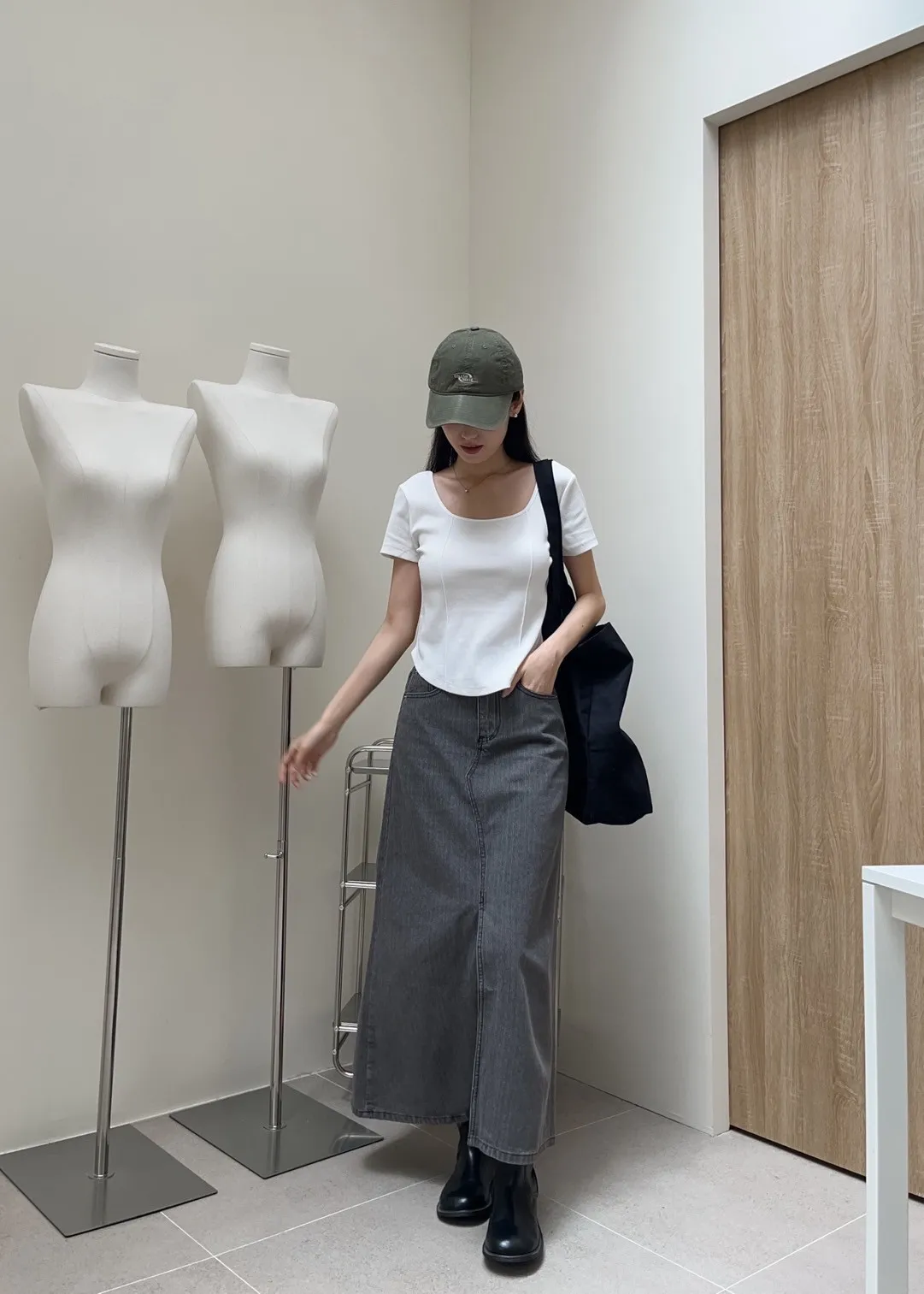 R0074[S-XL]立體直紋前開岔牛仔長裙(藍/灰)(售完不補)
