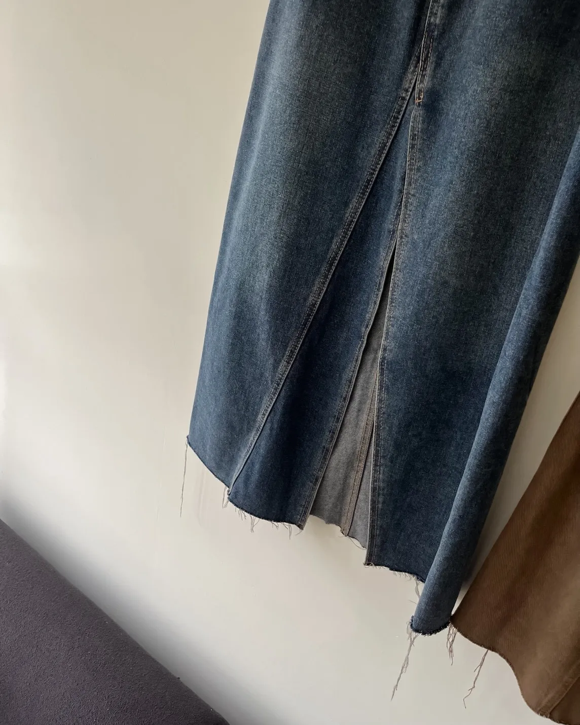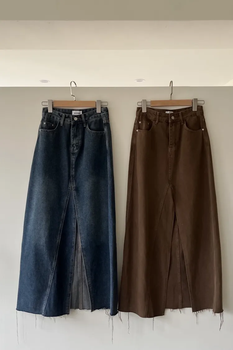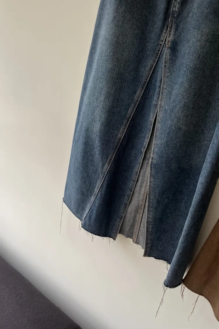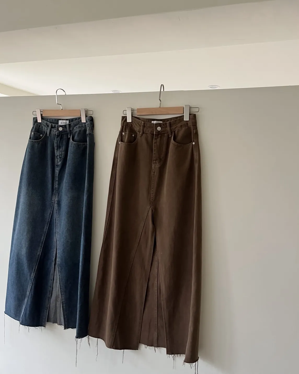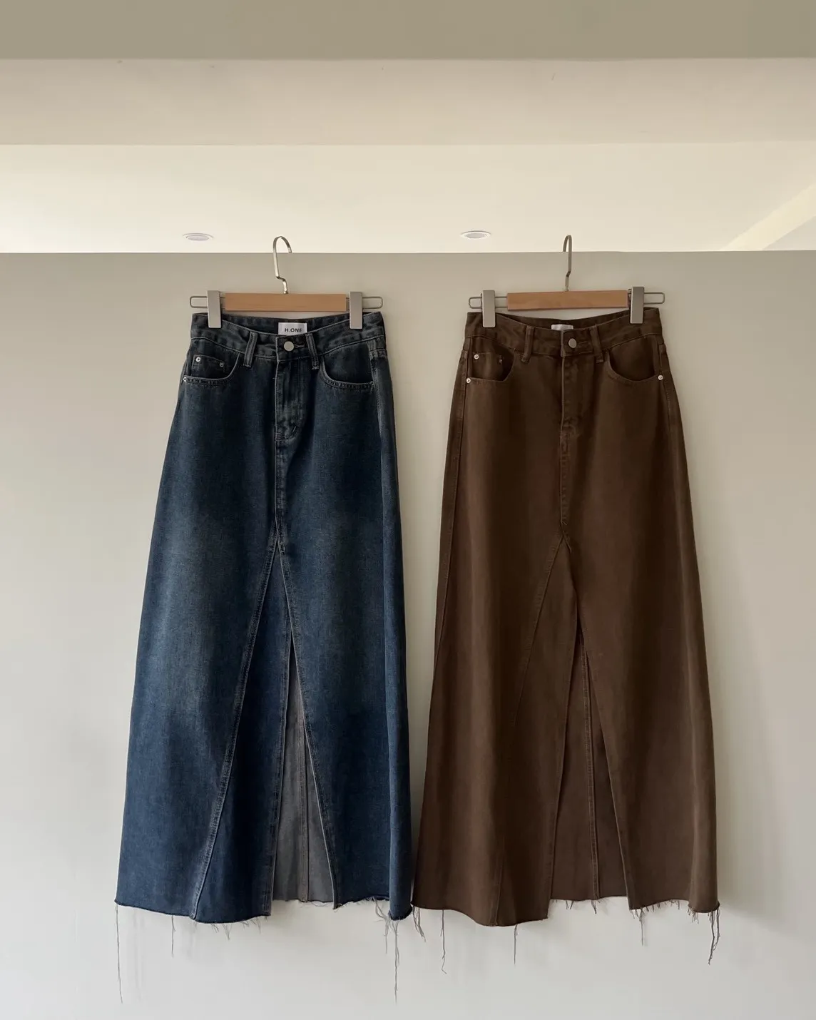 V0085回頭率up高衩抽鬚牛仔裙(咖啡/深藍)