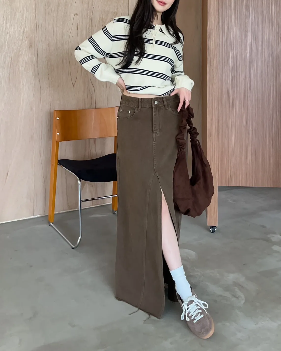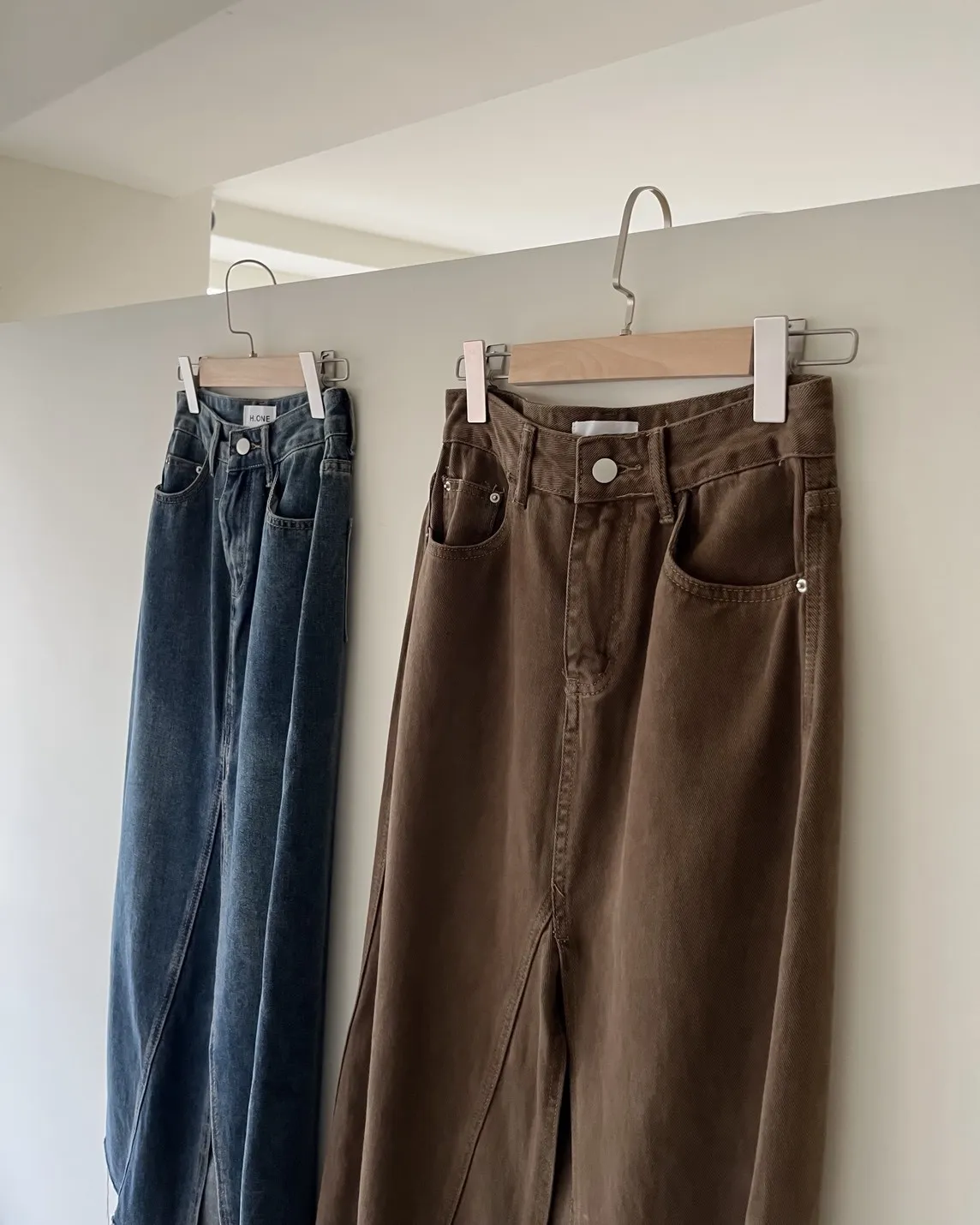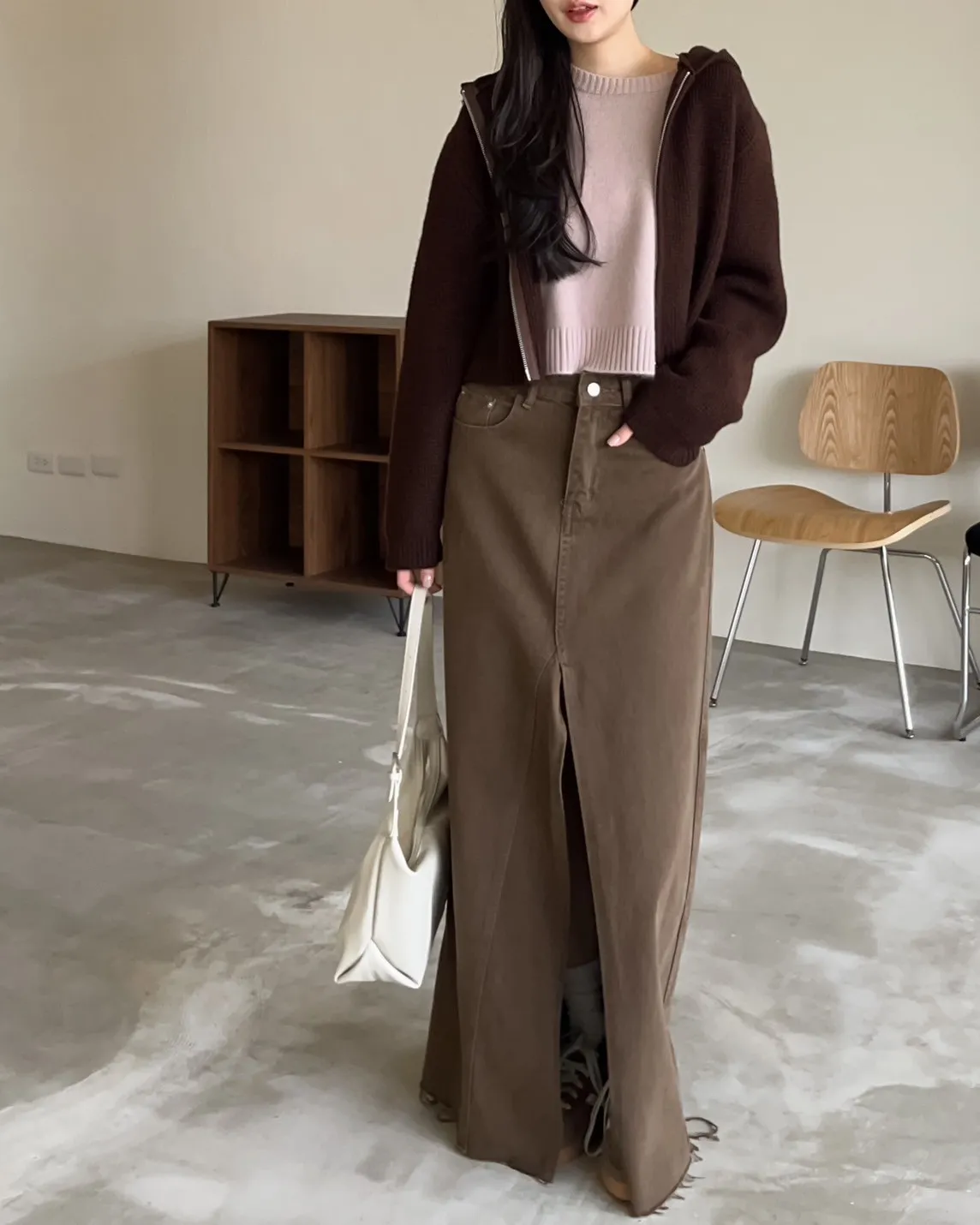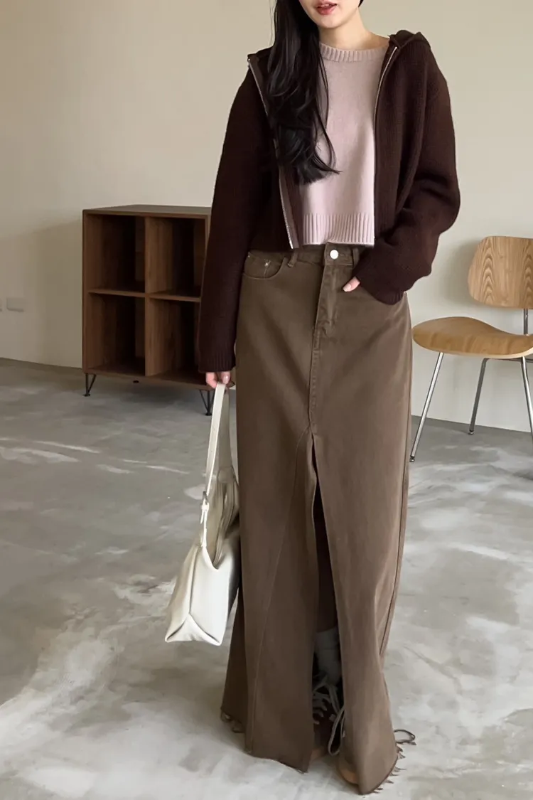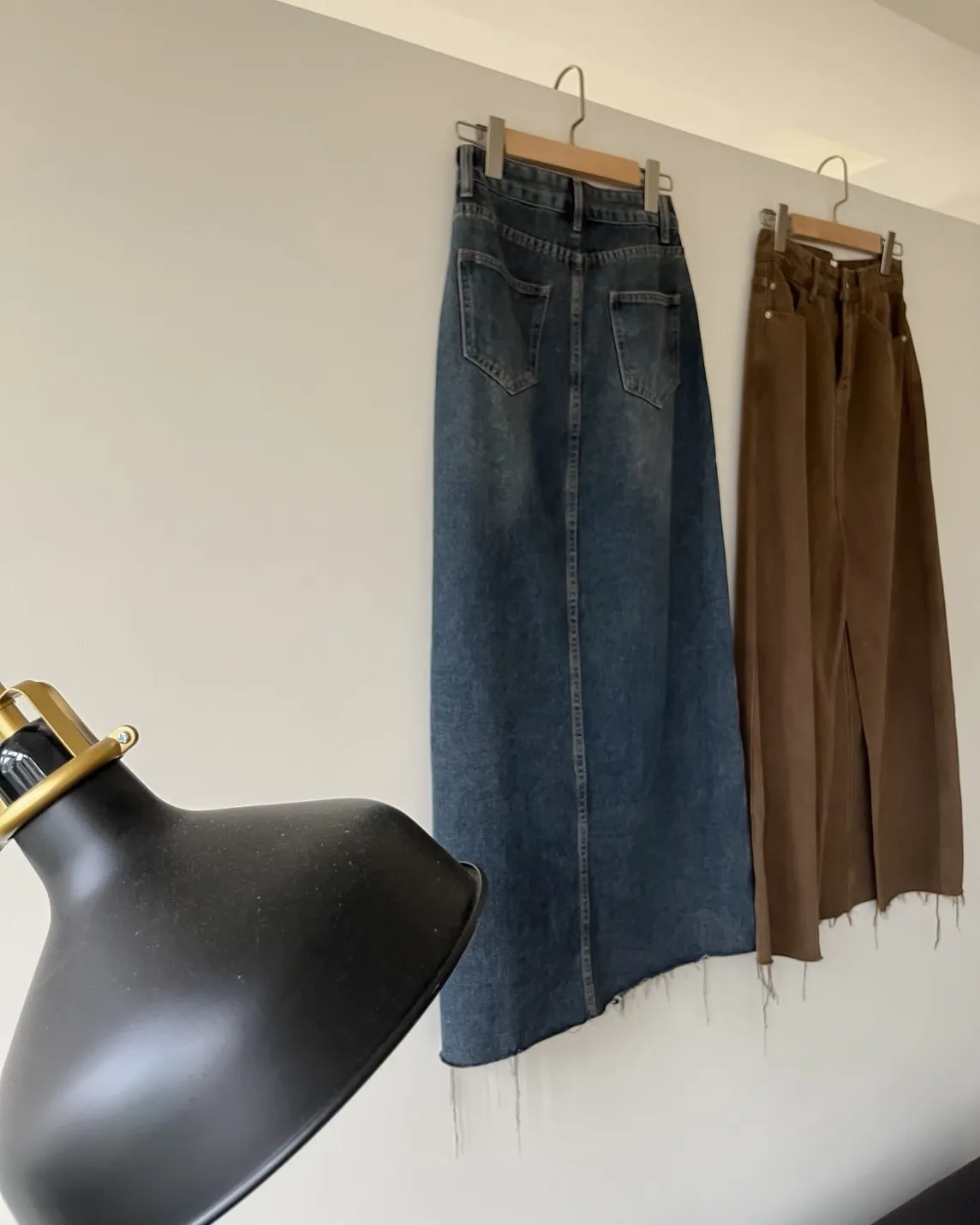 V0085回頭率up高衩抽鬚牛仔裙(咖啡/深藍)