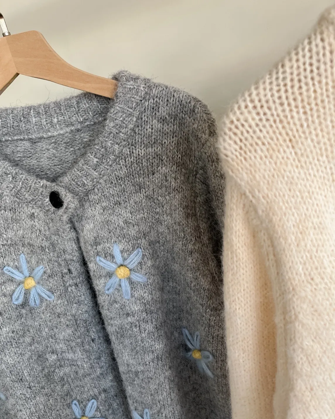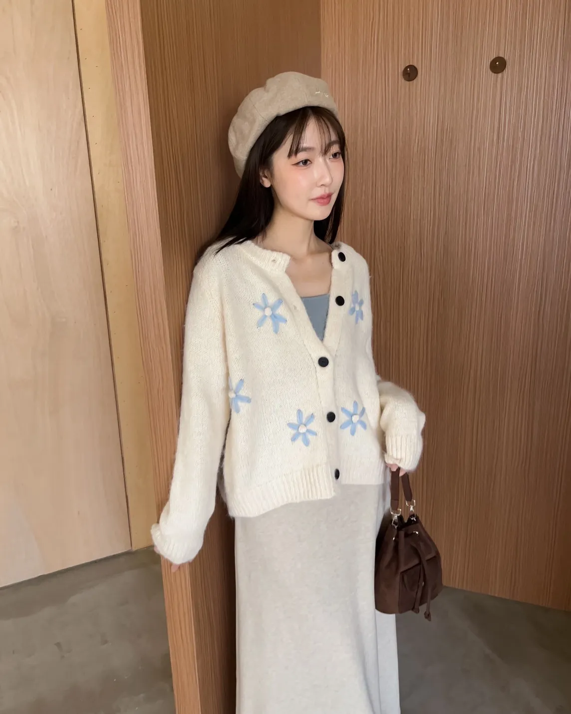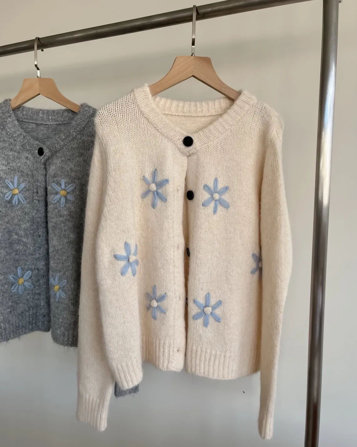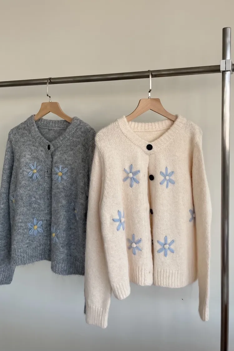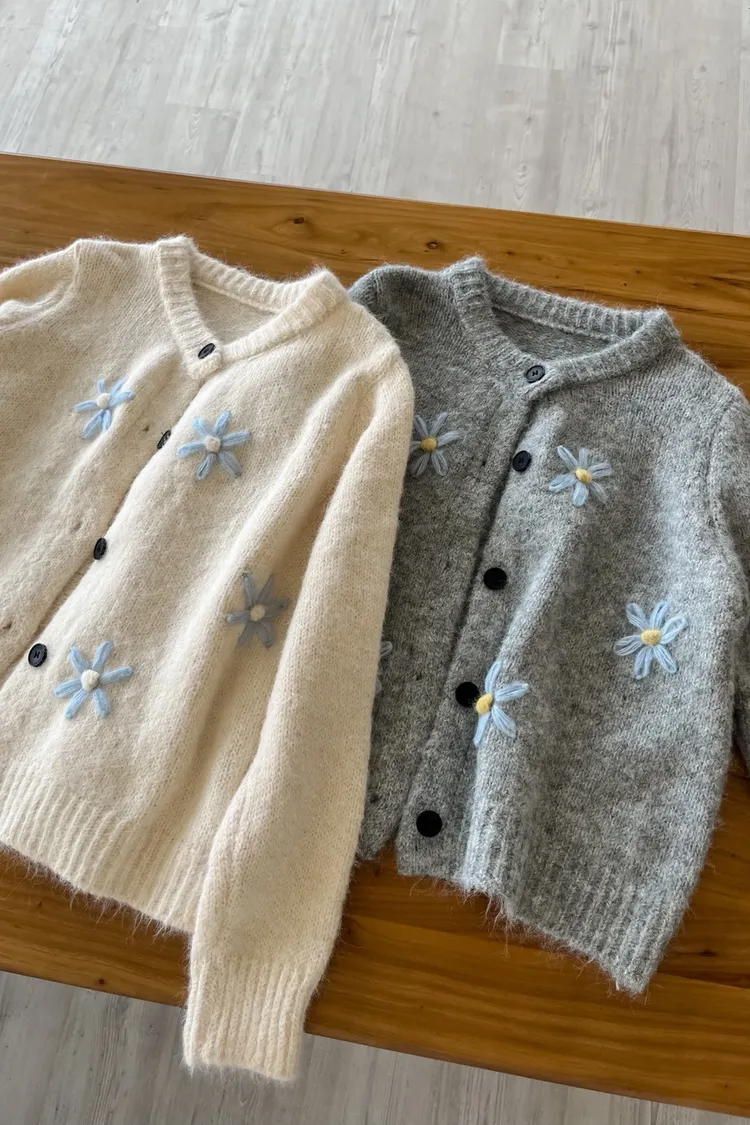 W0016毛線小藍花鈕扣毛衣外套(米/灰)