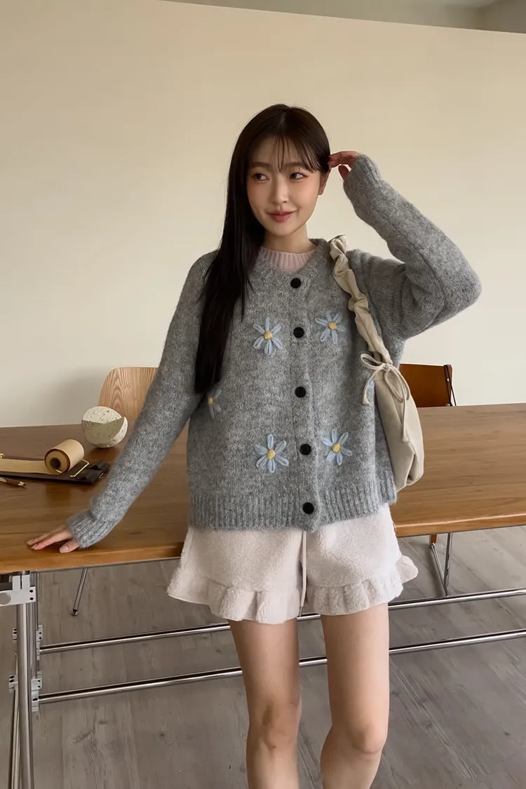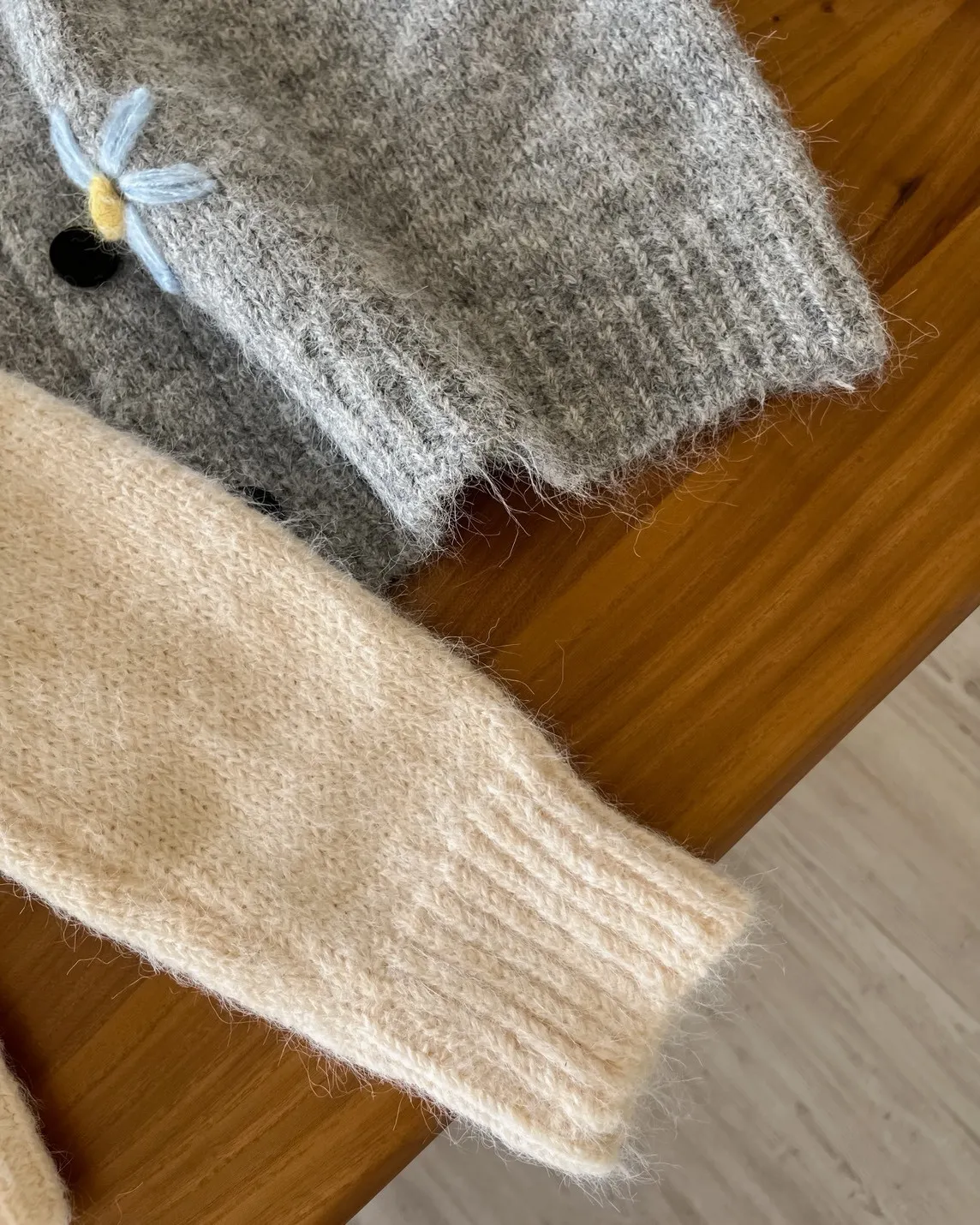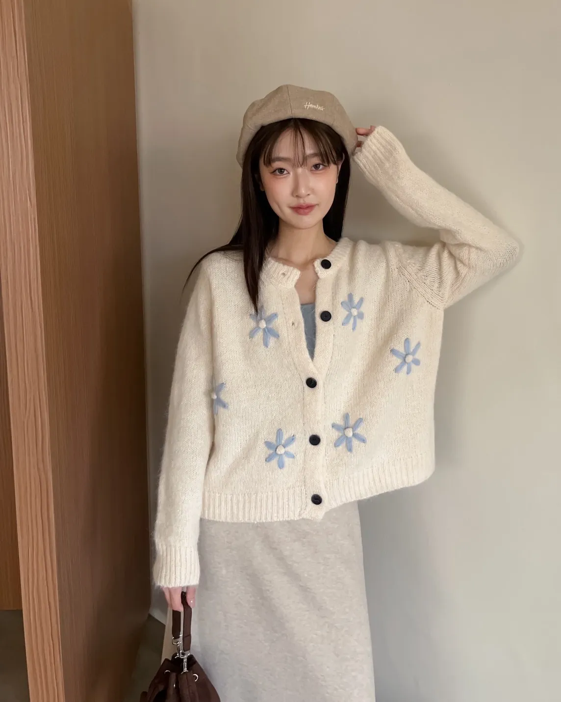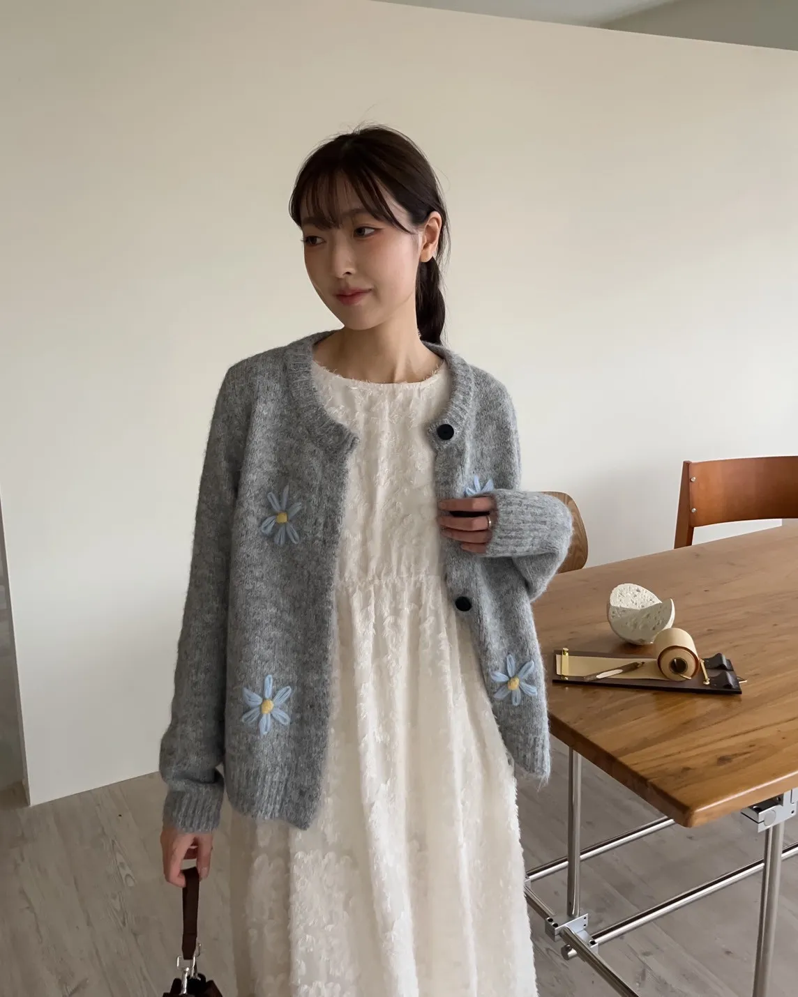 W0016毛線小藍花鈕扣毛衣外套(米/灰)