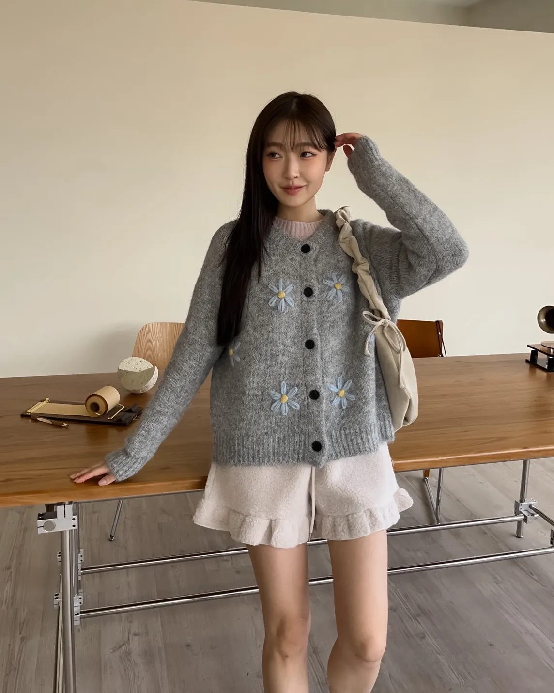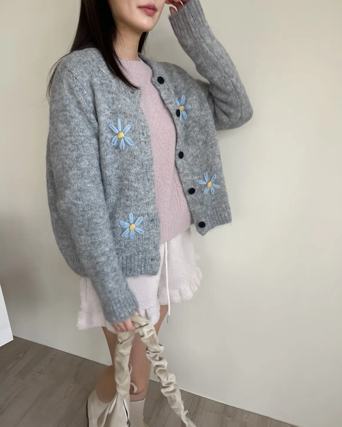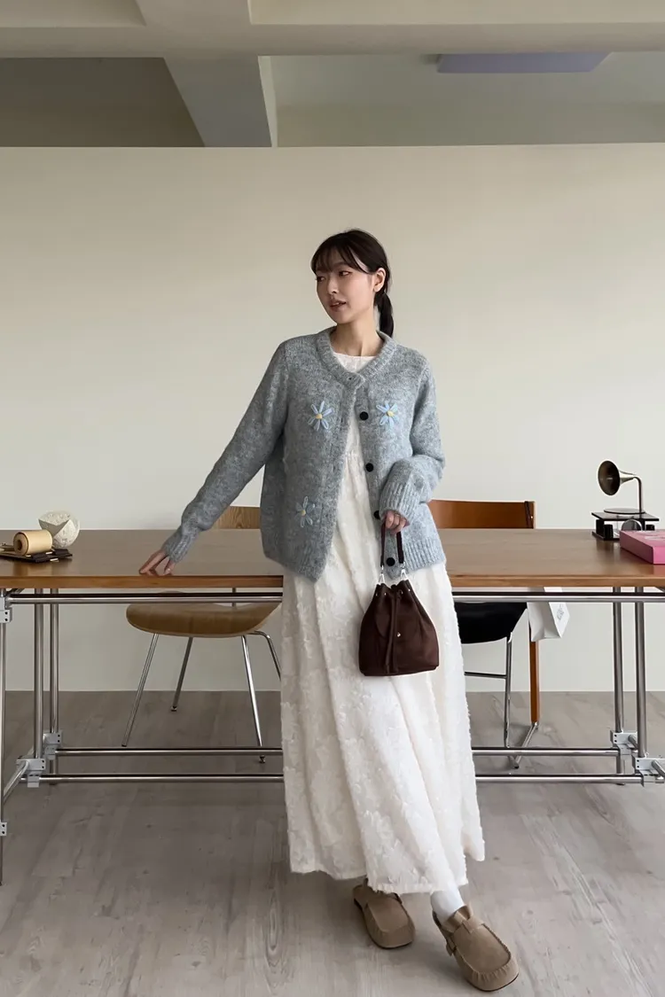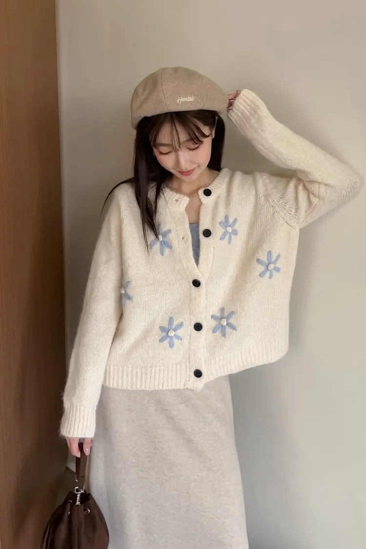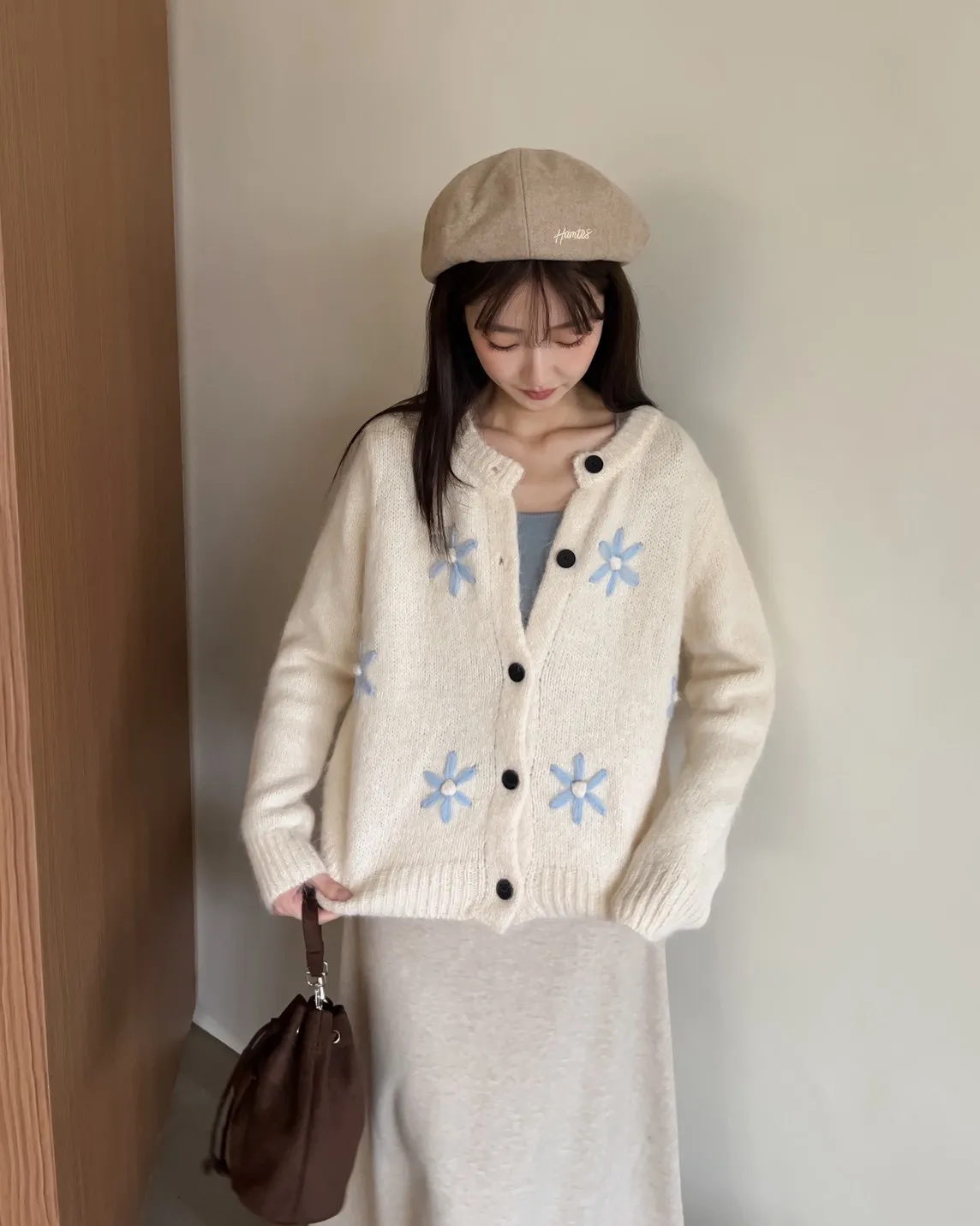 W0016毛線小藍花鈕扣毛衣外套(米/灰)