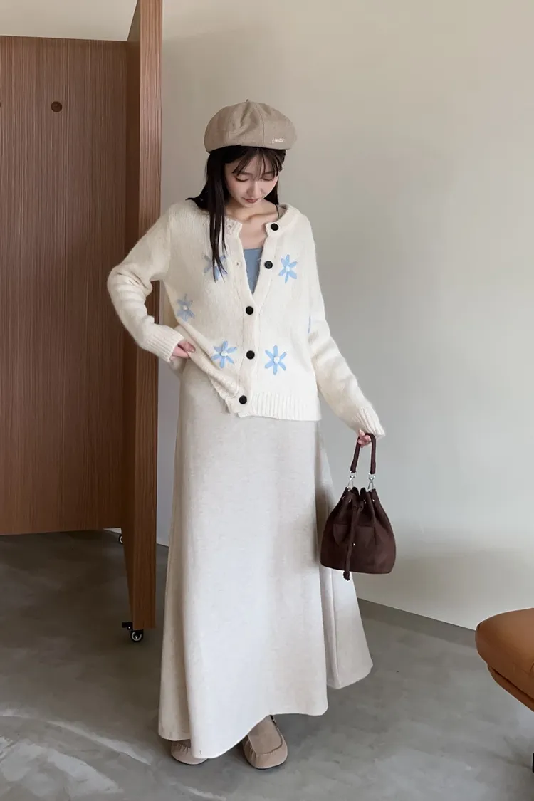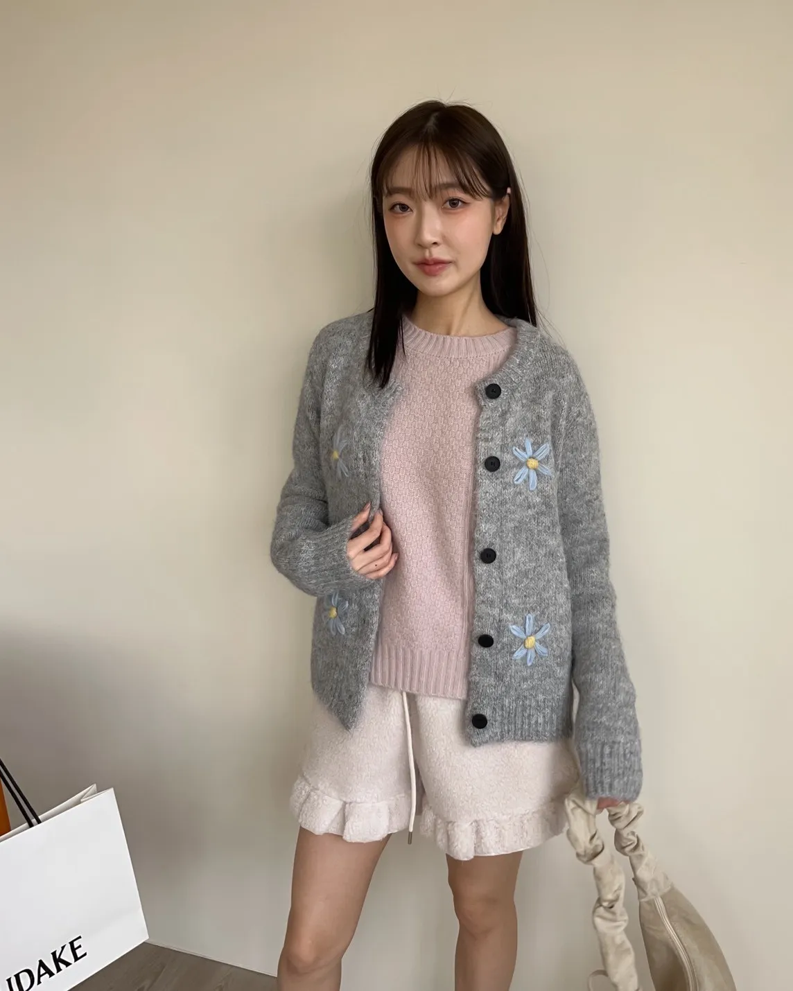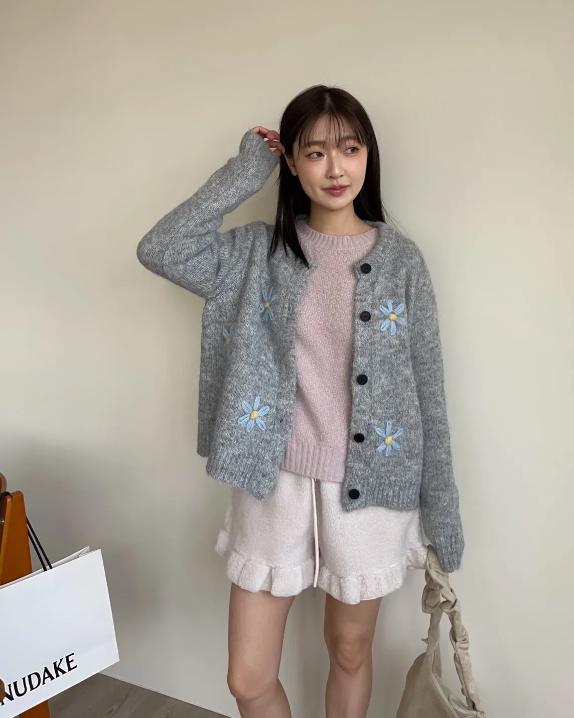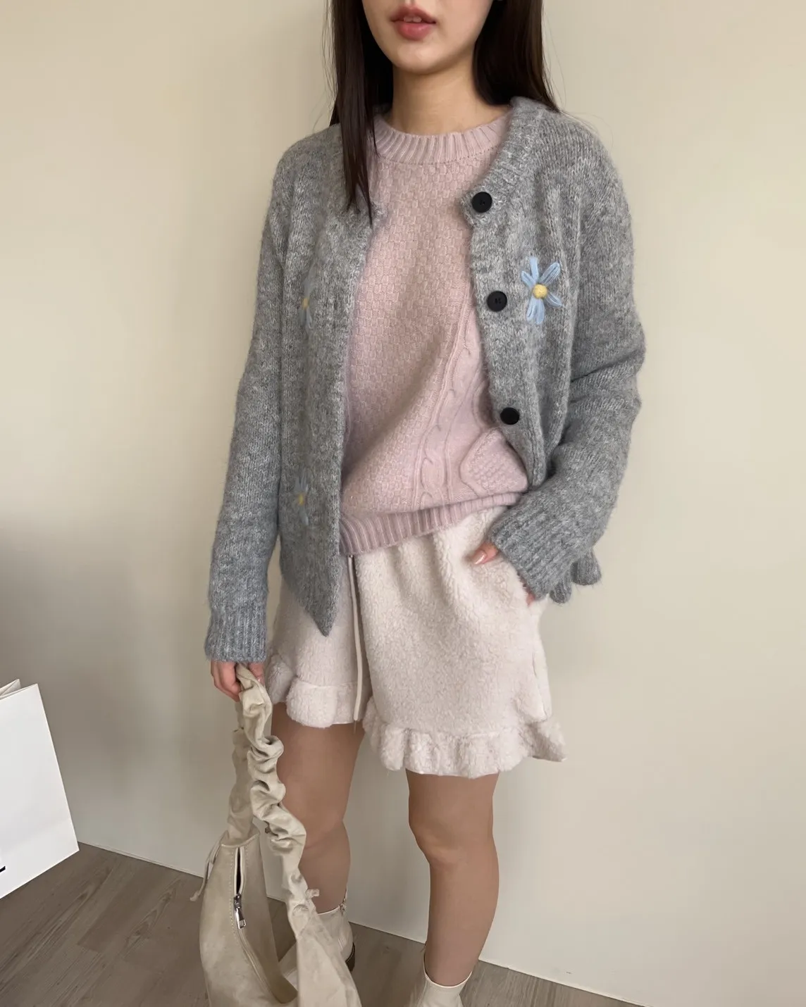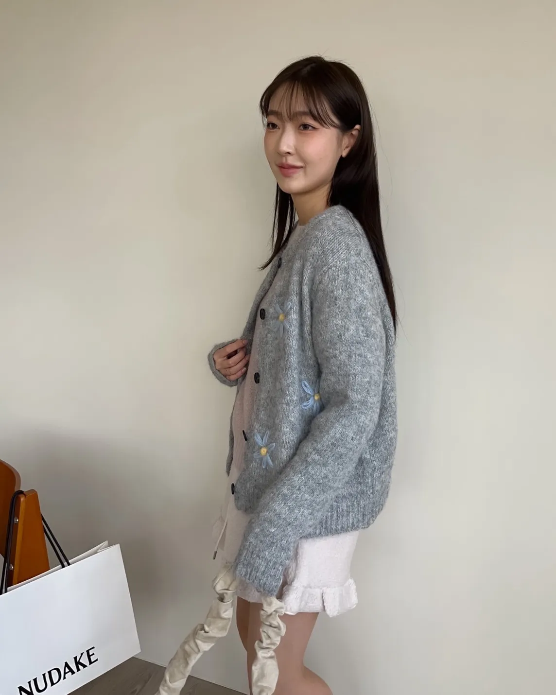 W0016毛線小藍花鈕扣毛衣外套(米/灰)