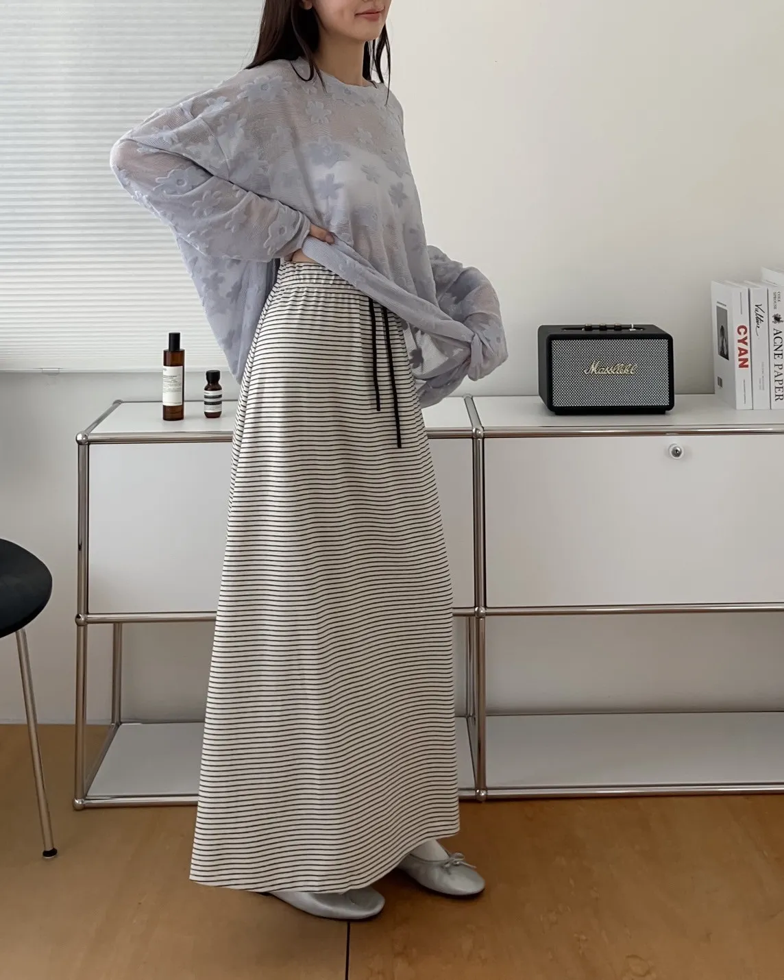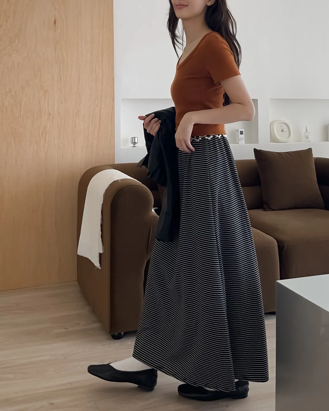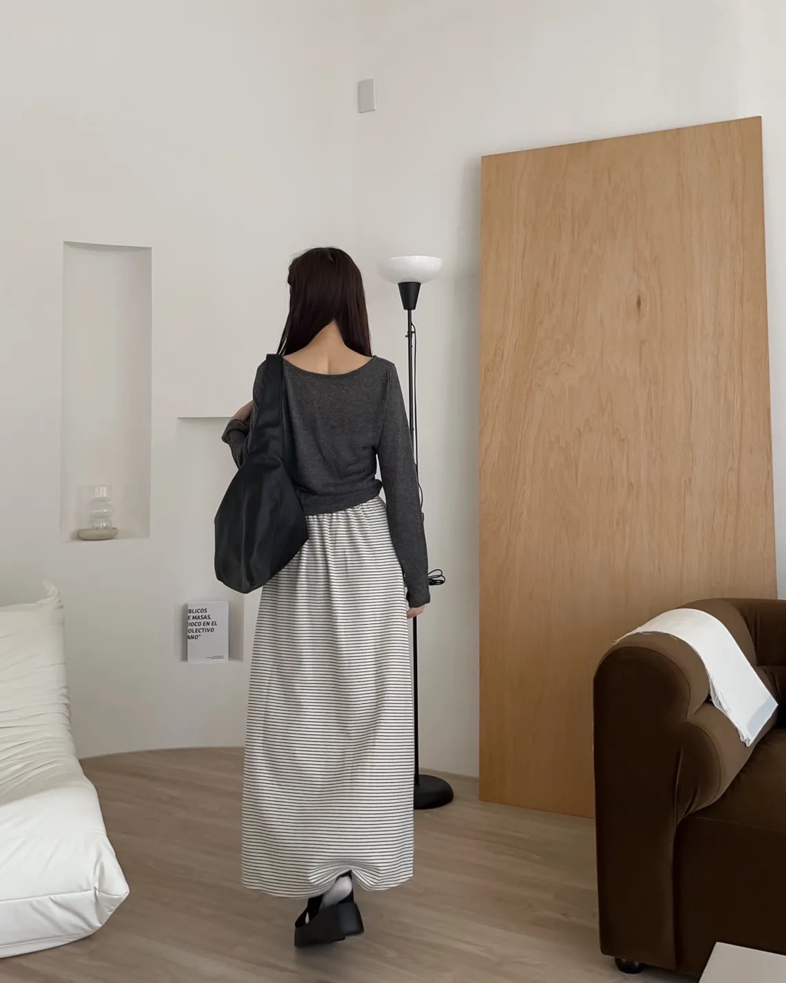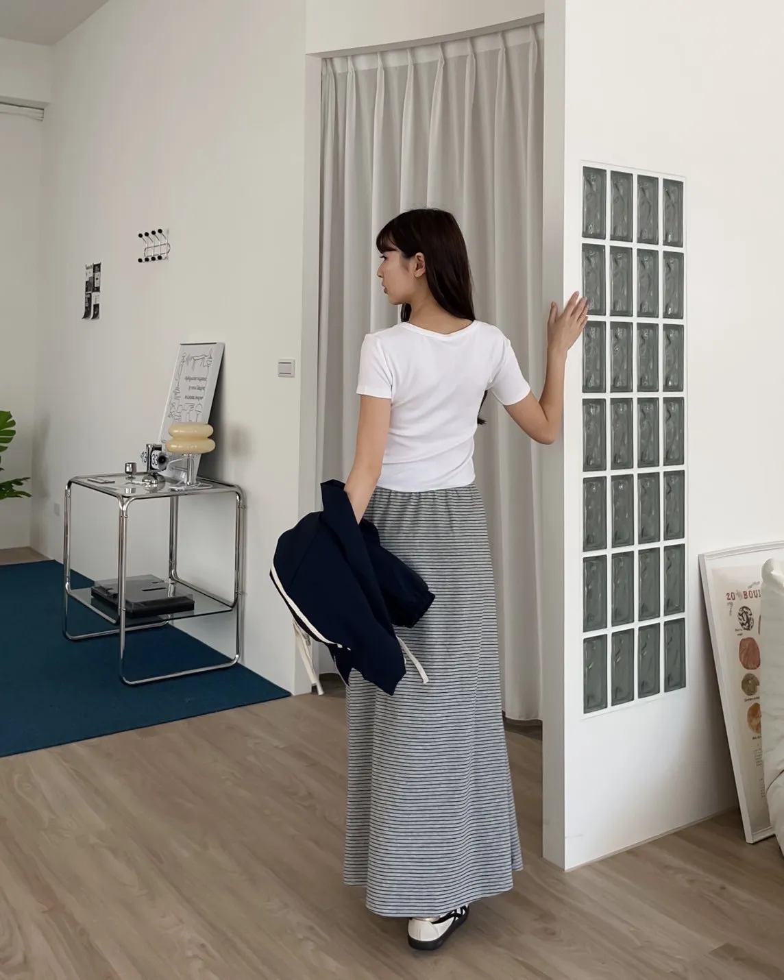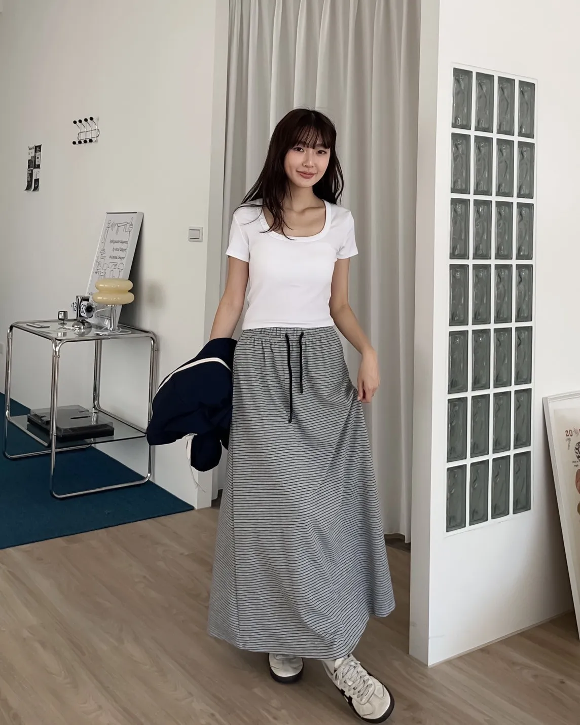 U0005想睡午覺條紋鬆緊A字裙(米白/灰/黑)(售完不補)