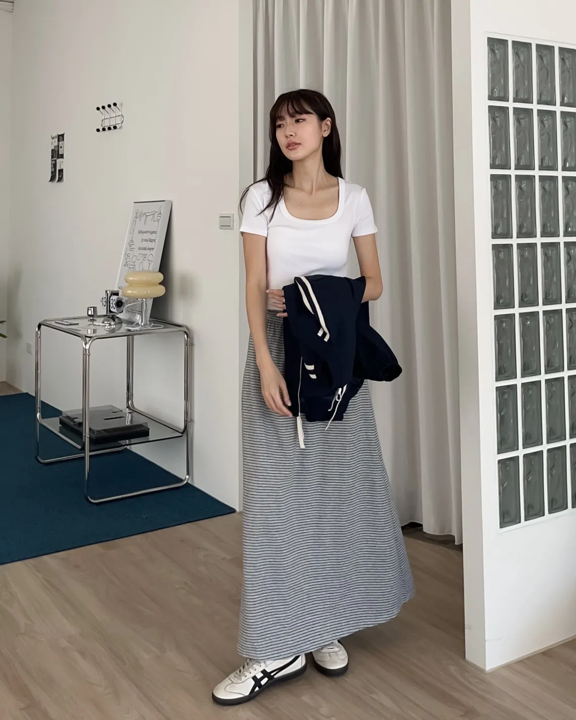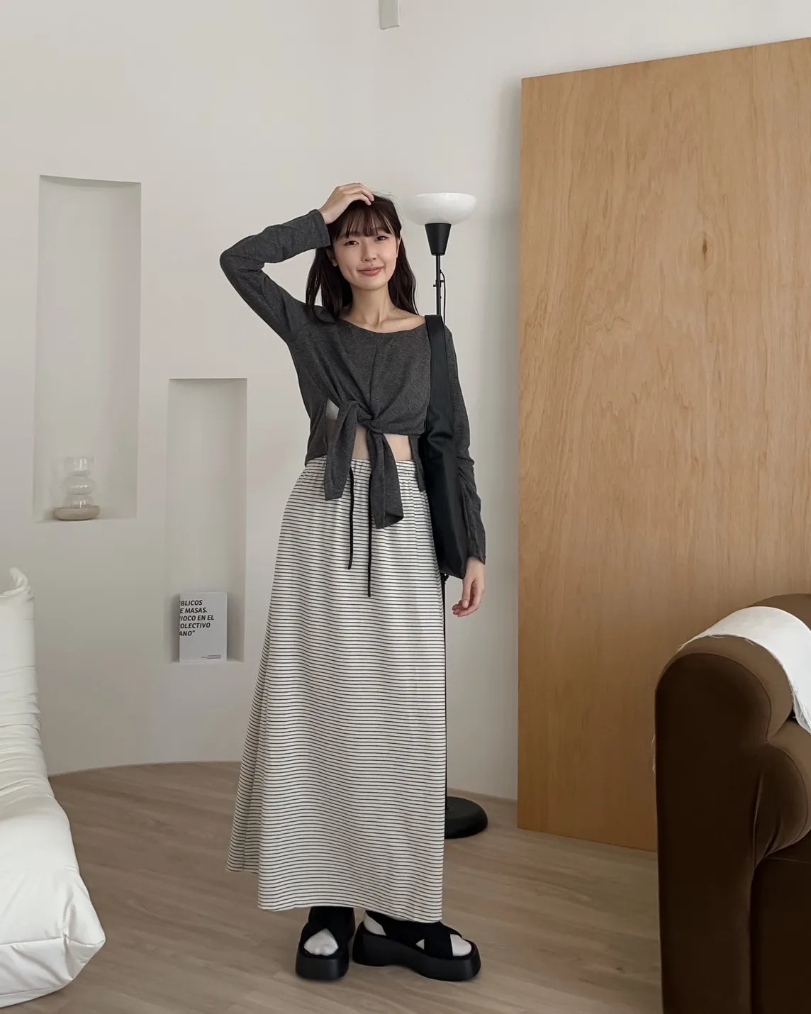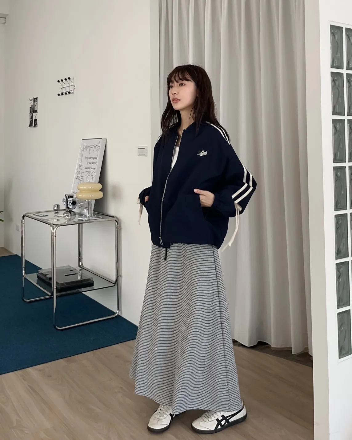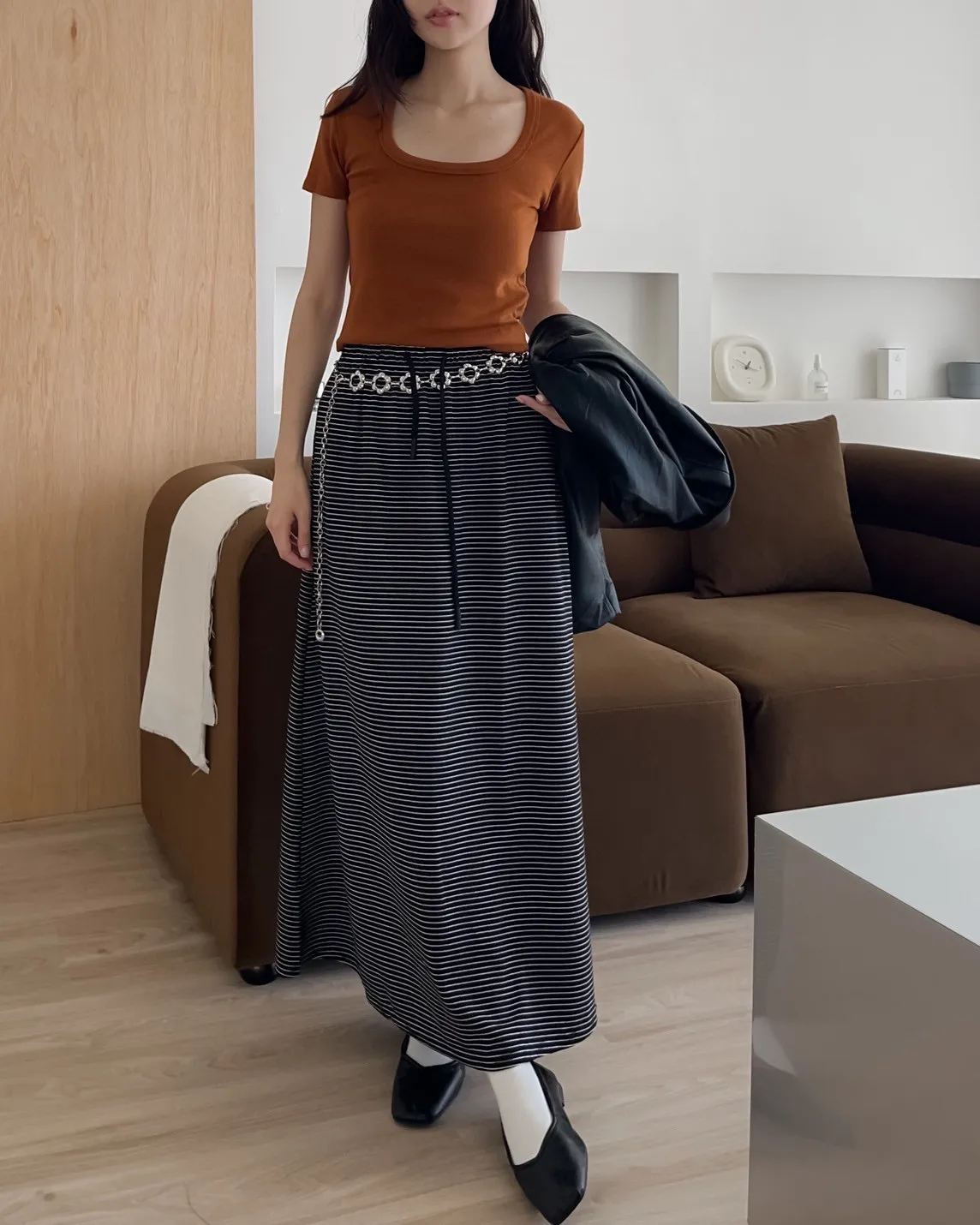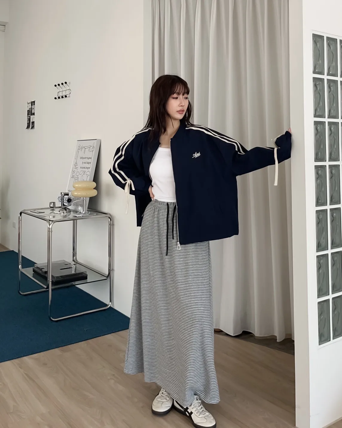 U0005想睡午覺條紋鬆緊A字裙(米白/灰/黑)(售完不補)