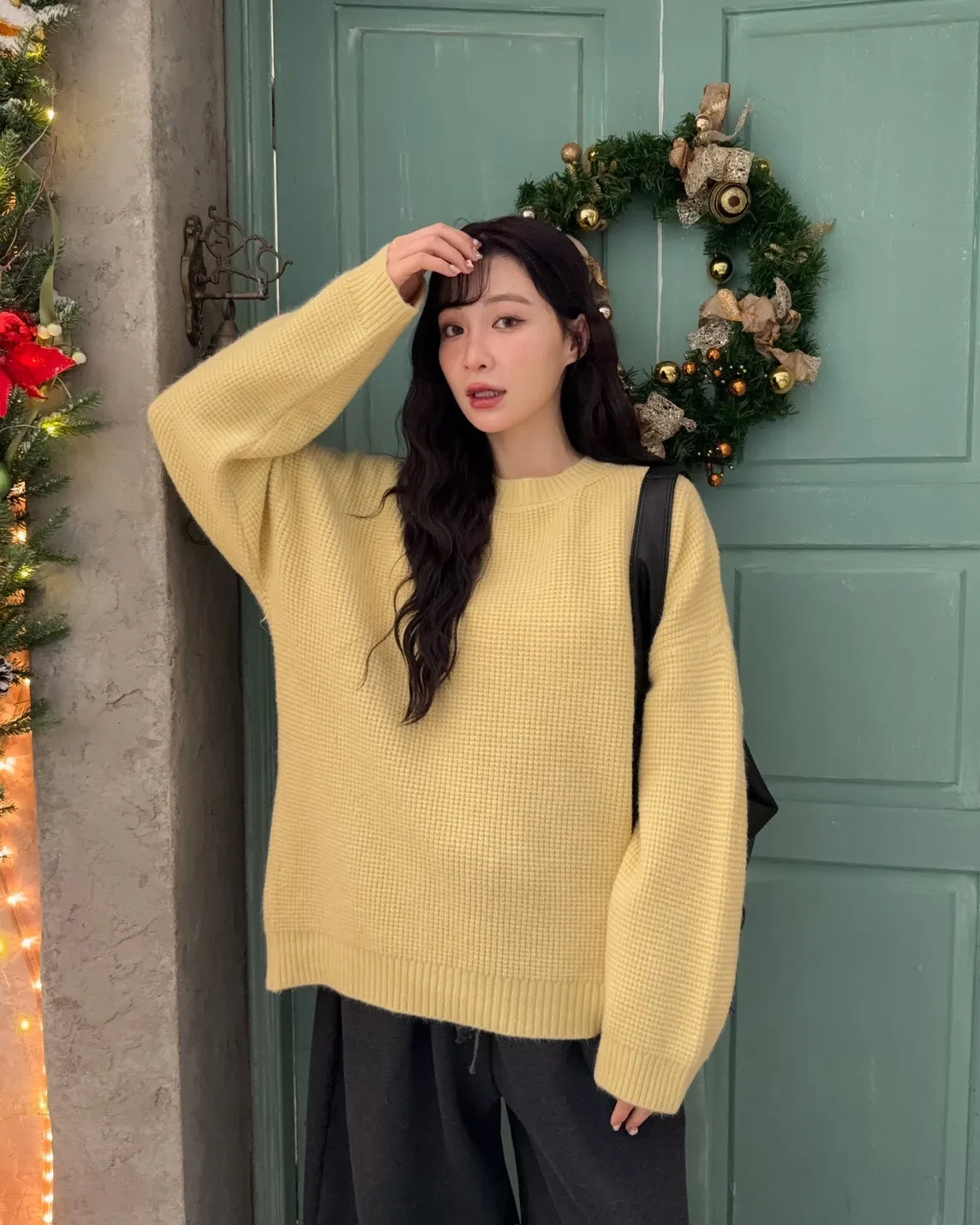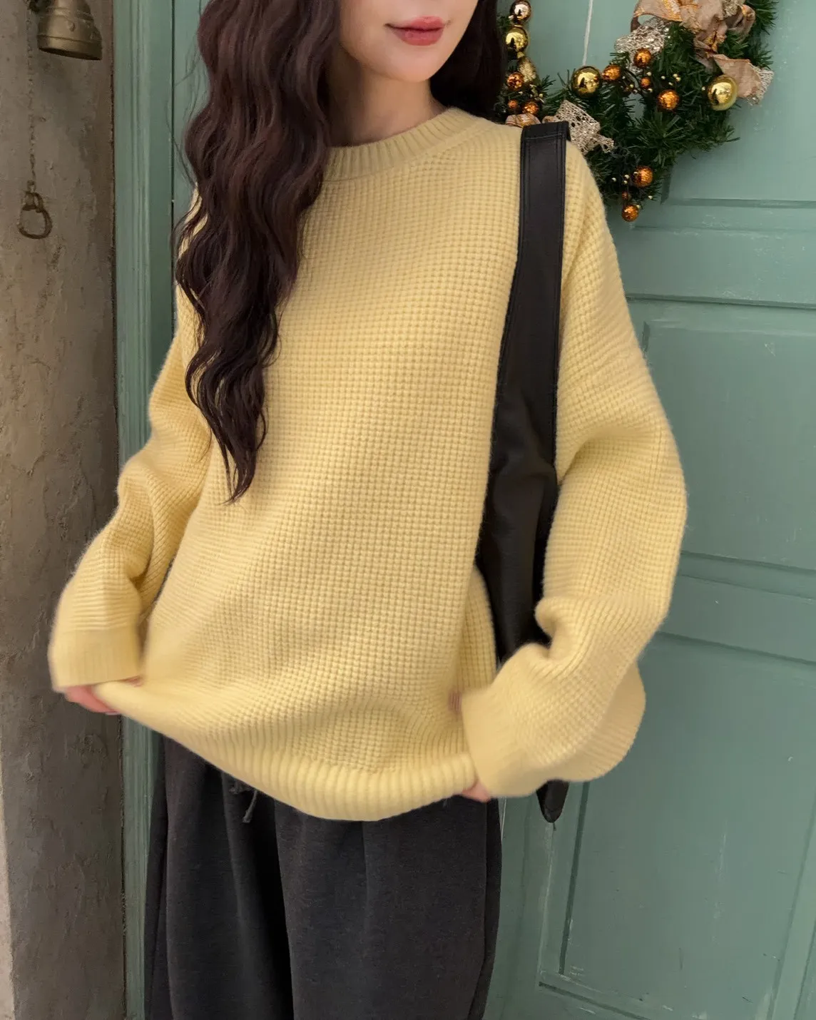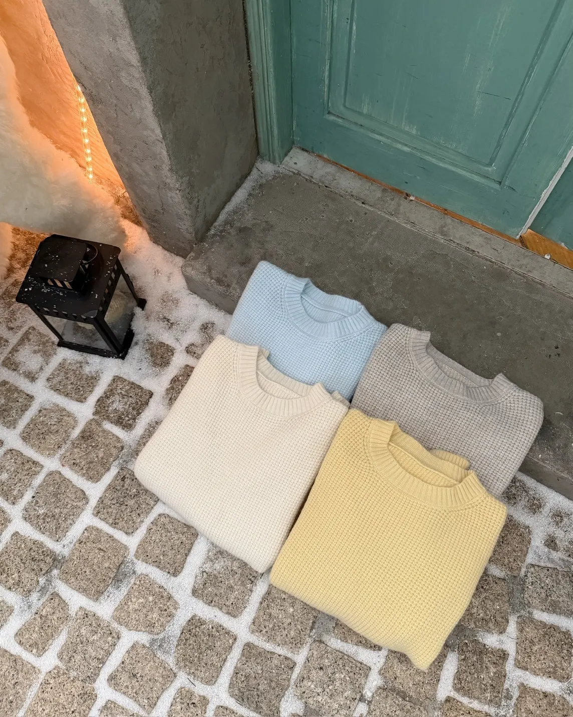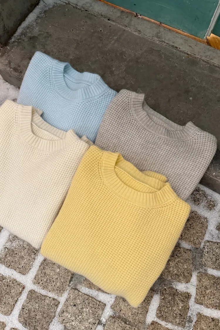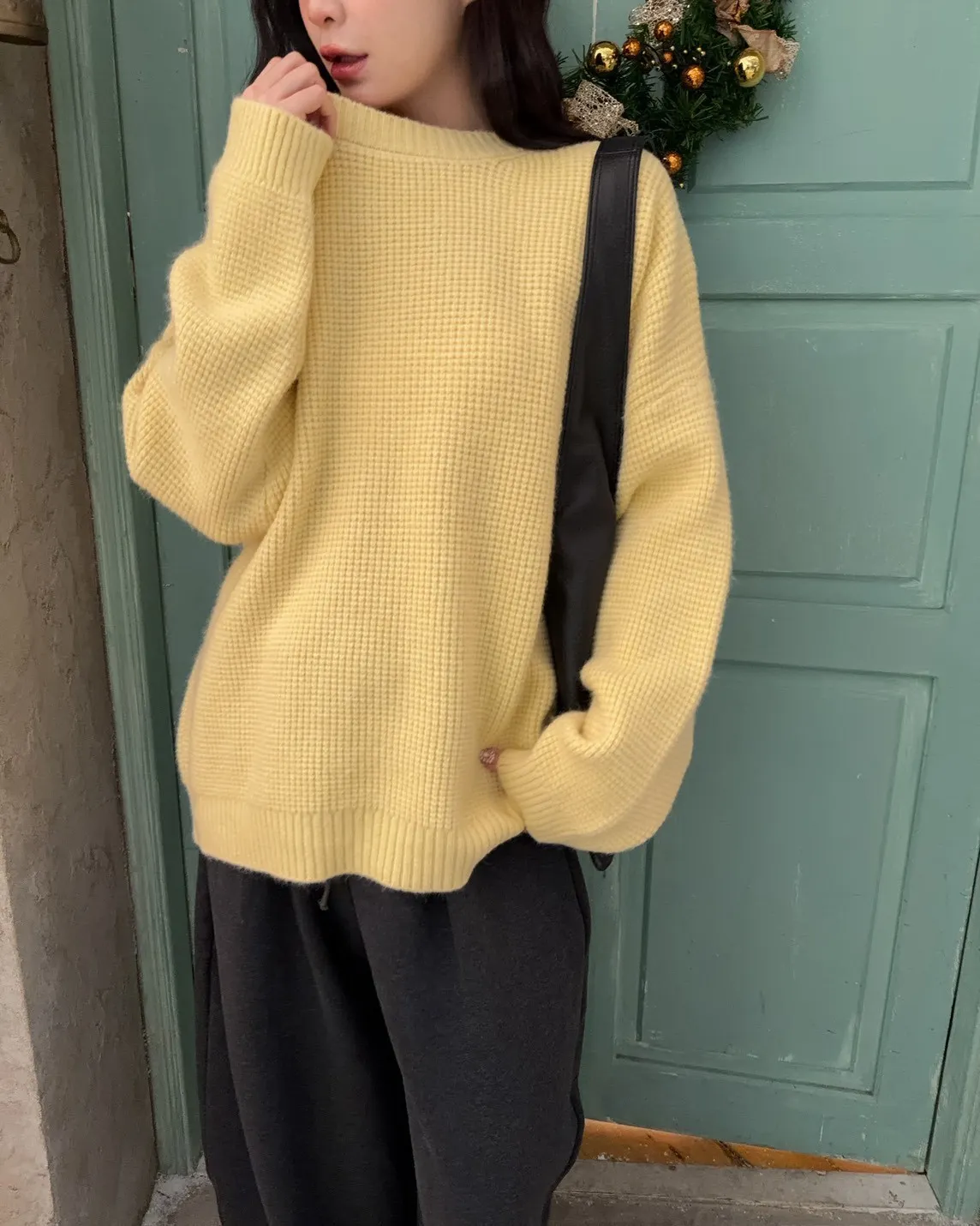 X0052鬆餅格寬鬆毛衣(米白/黃/淺藍/灰)