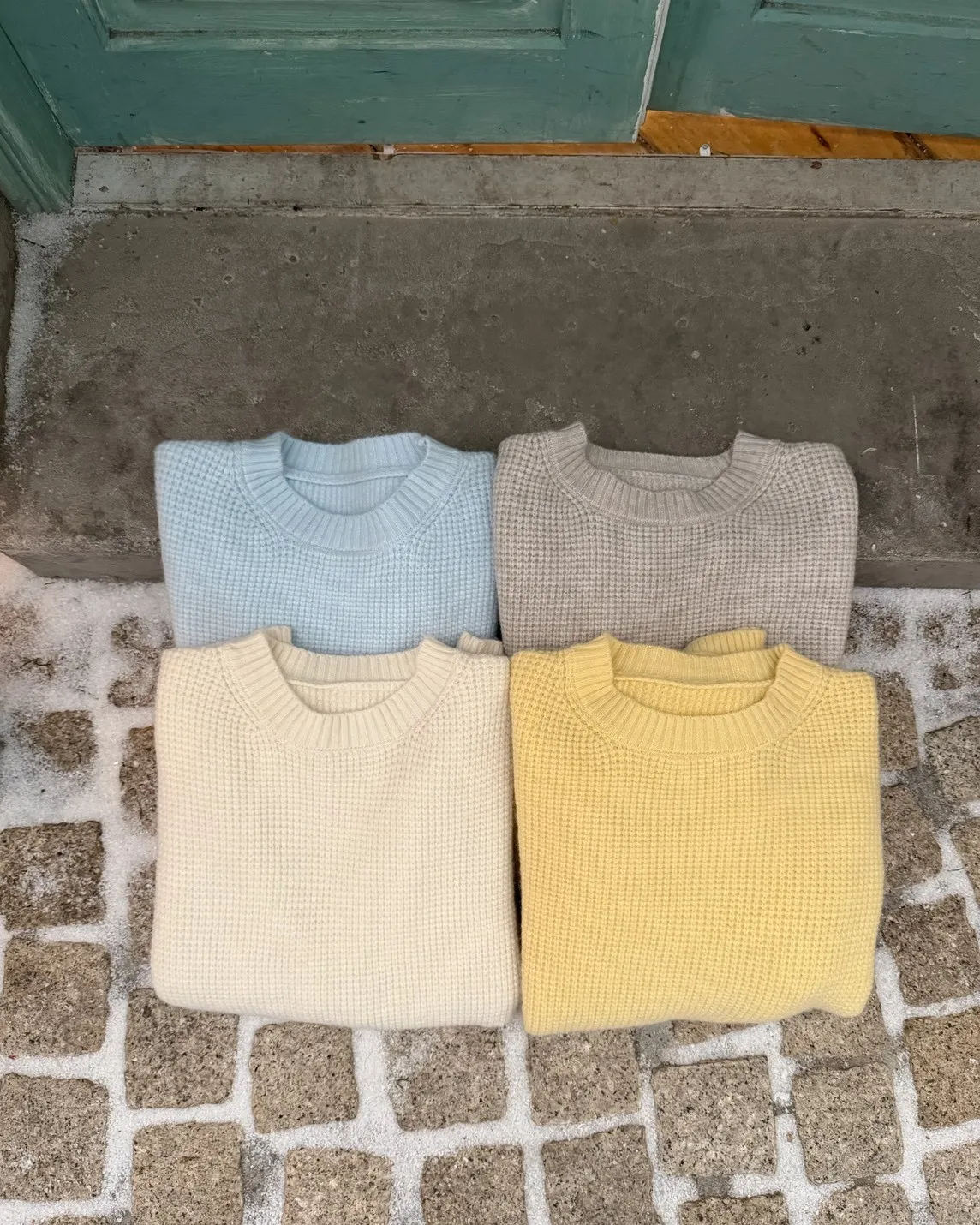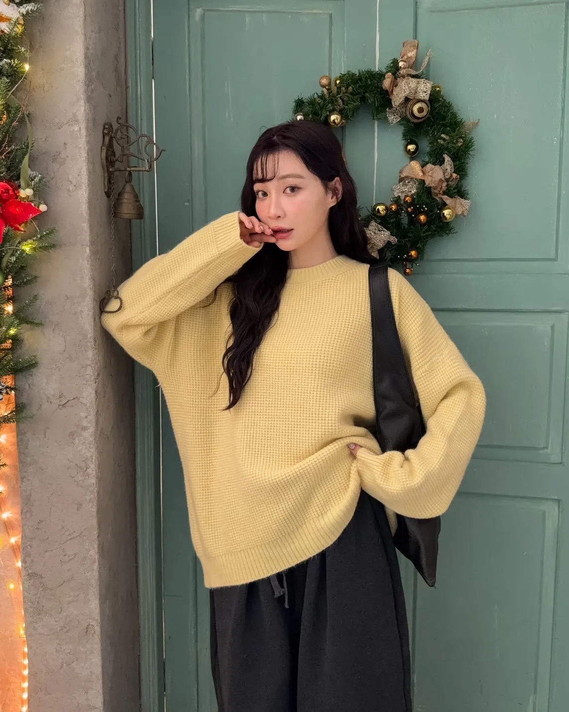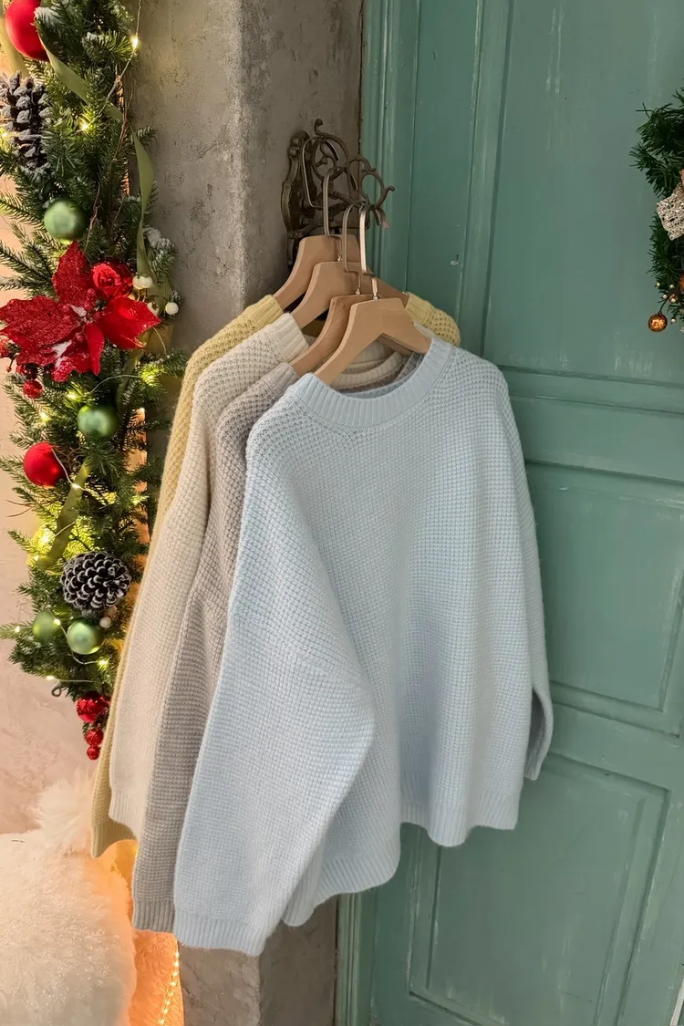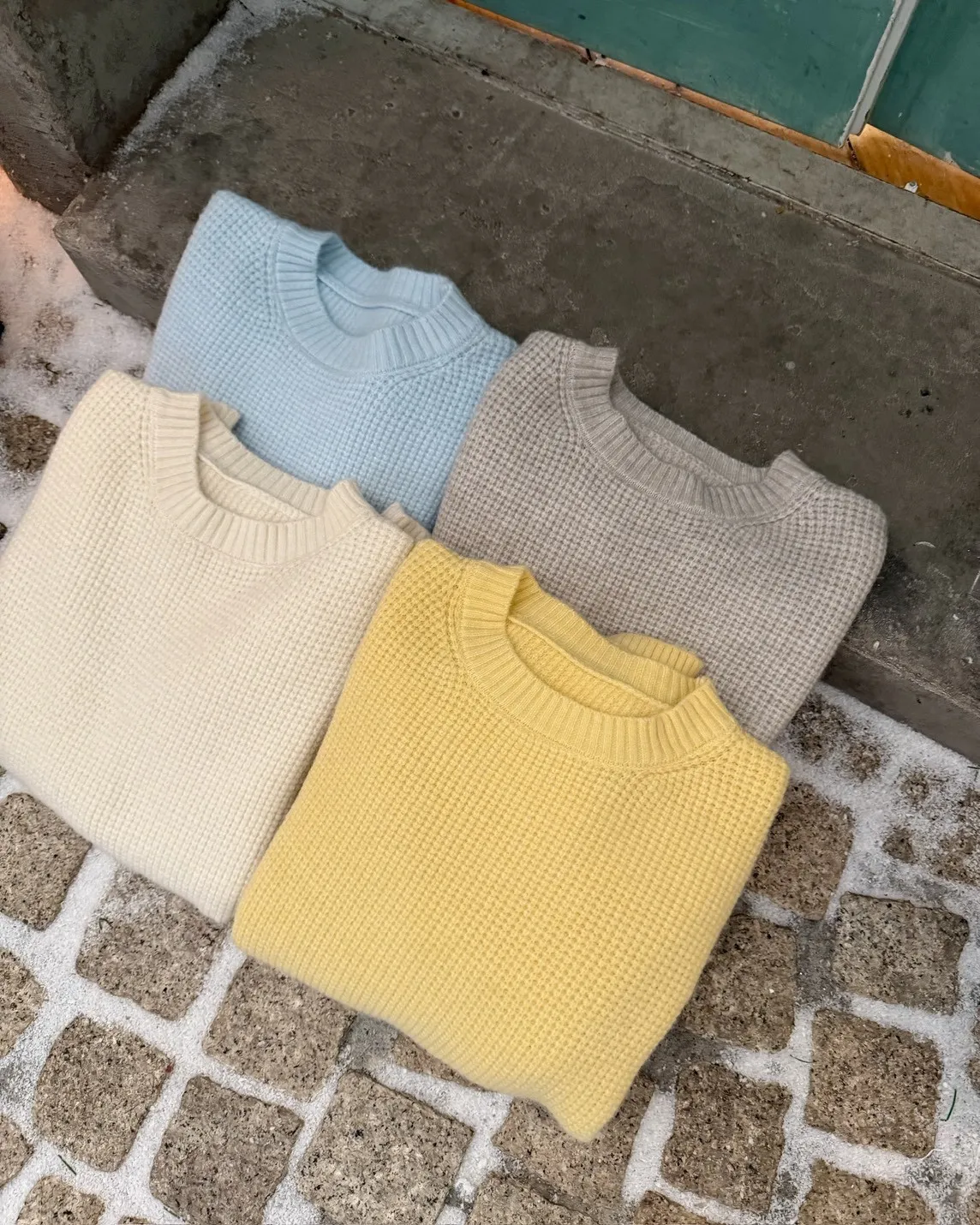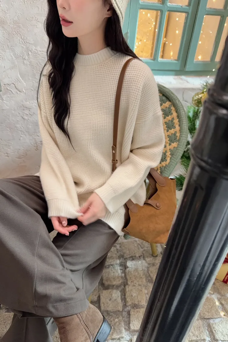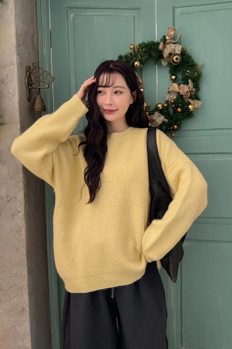 X0052鬆餅格寬鬆毛衣(米白/黃/淺藍/灰)