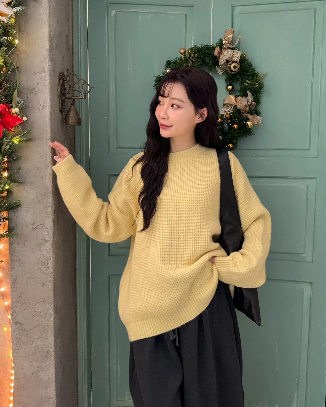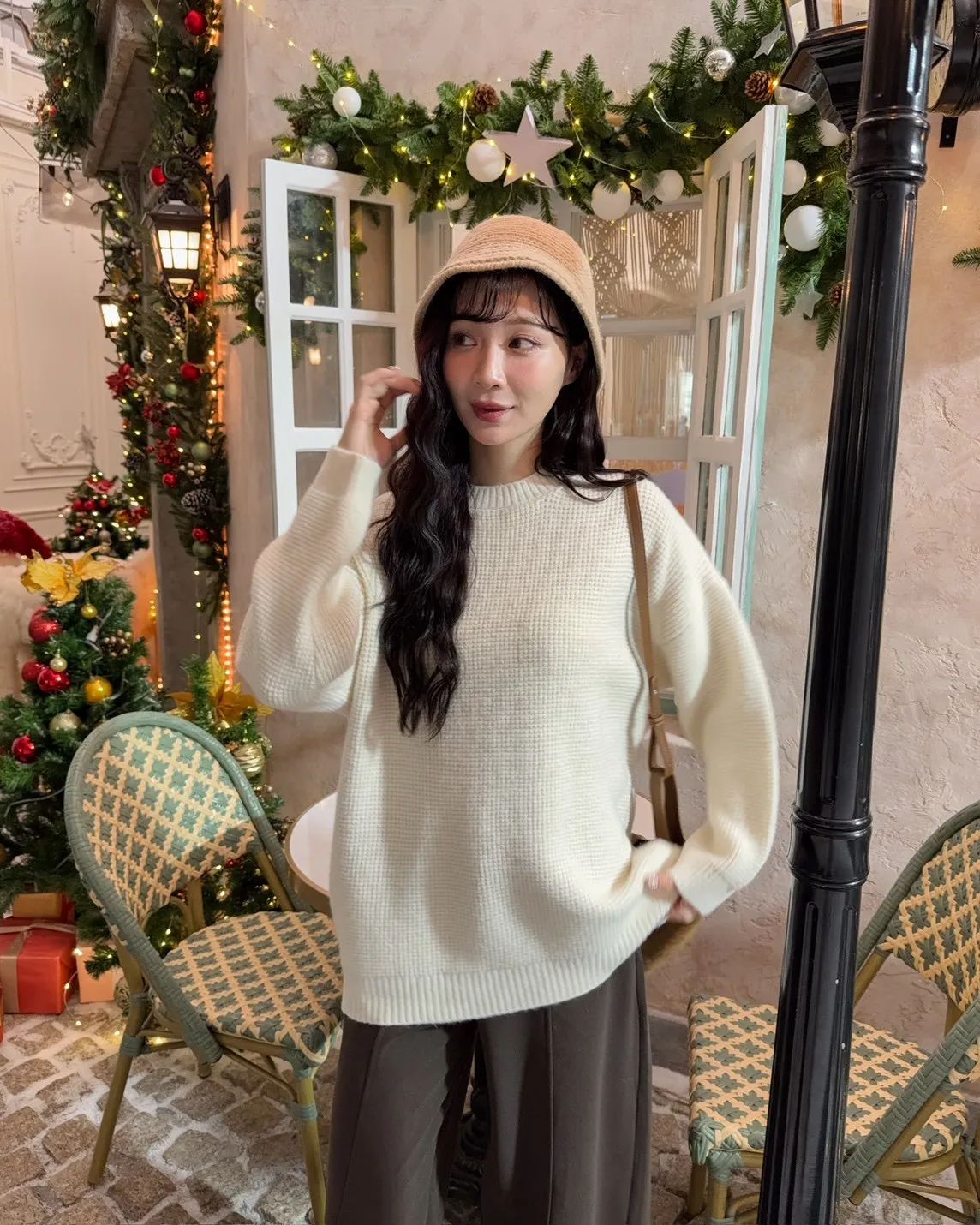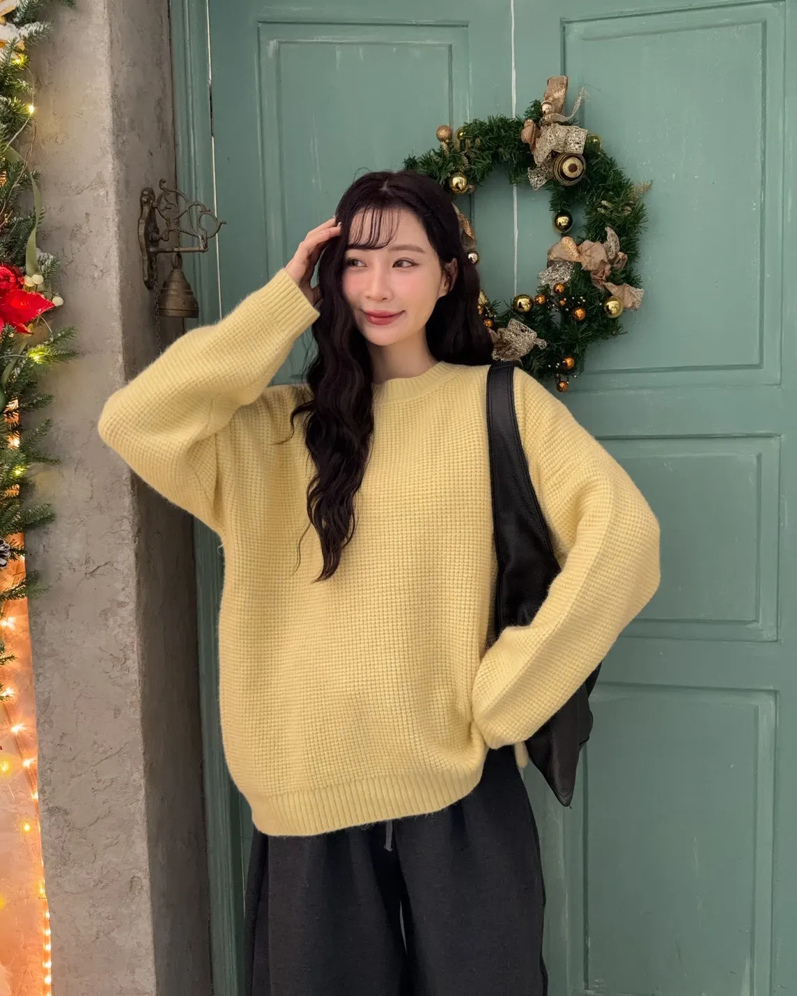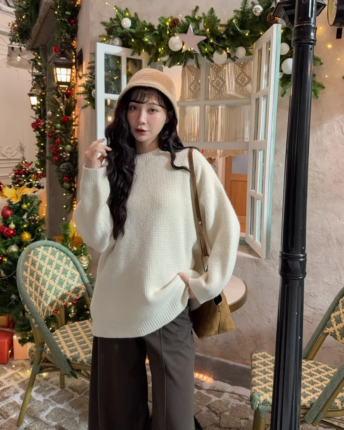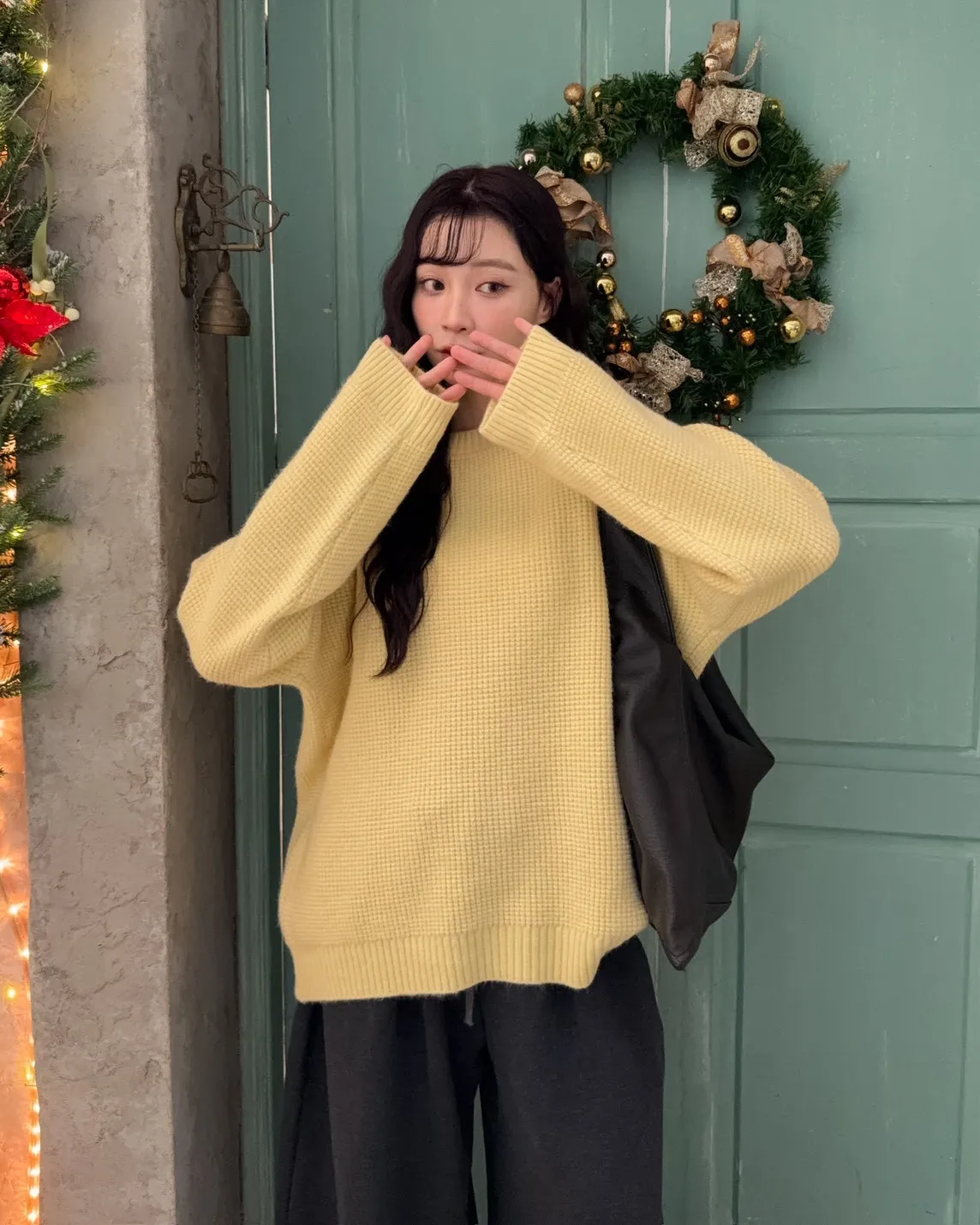 X0052鬆餅格寬鬆毛衣(米白/黃/淺藍/灰)