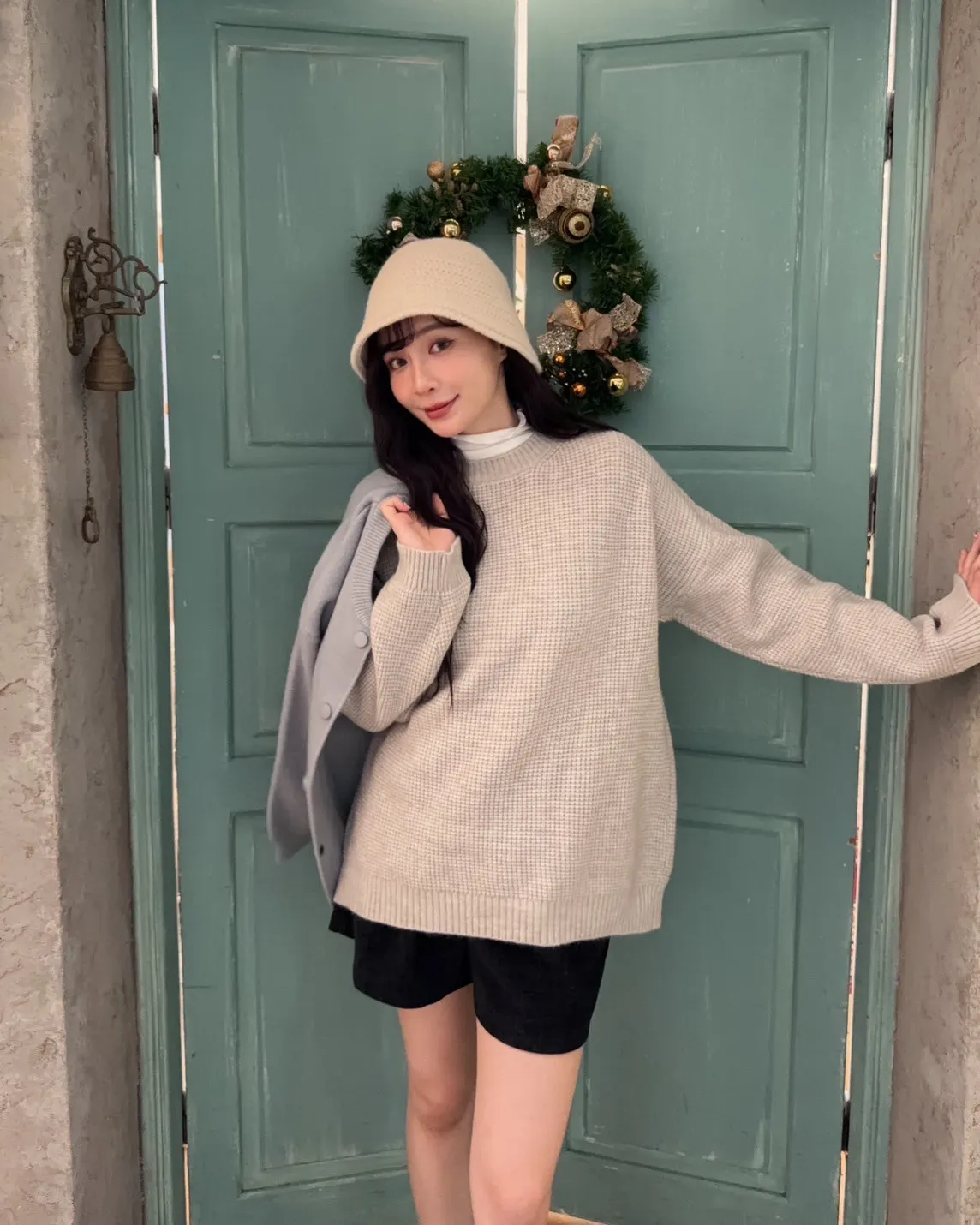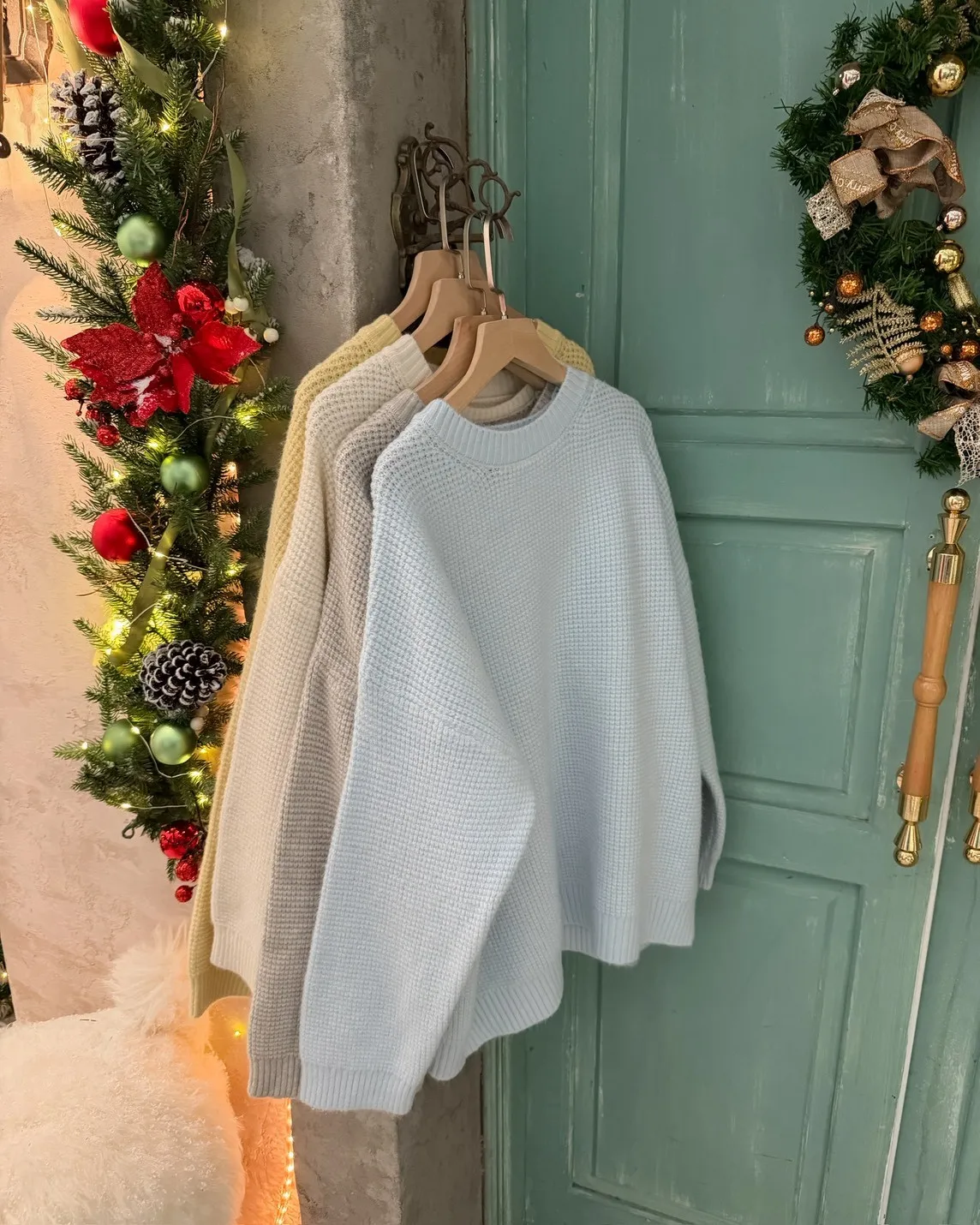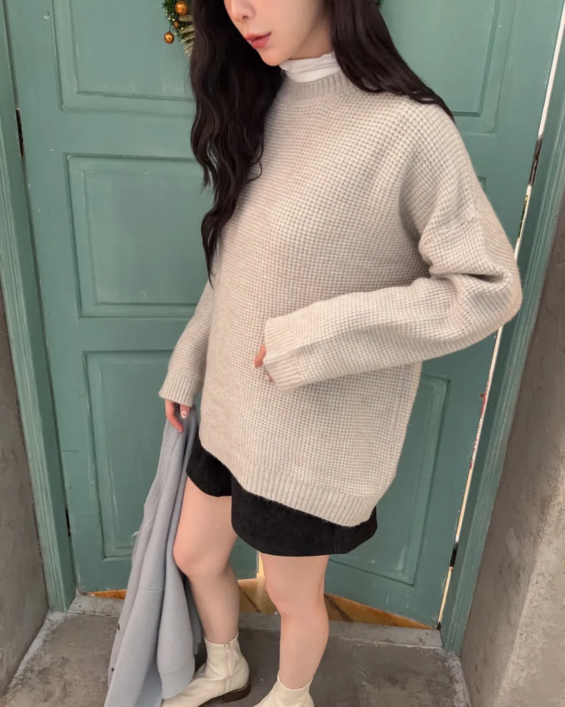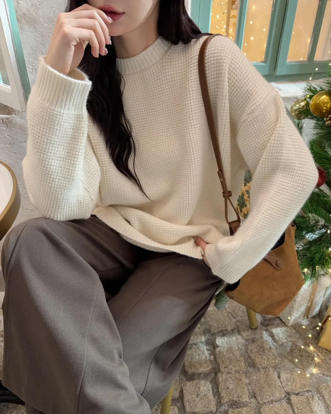X0052鬆餅格寬鬆毛衣(米白/黃/淺藍/灰)