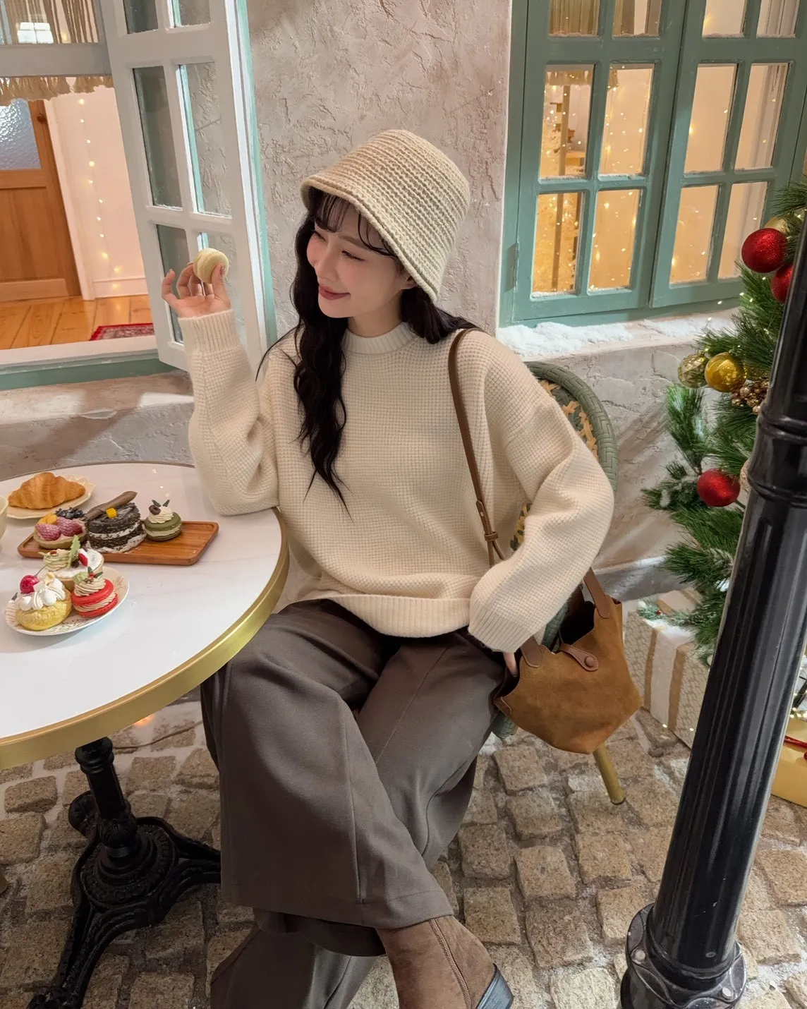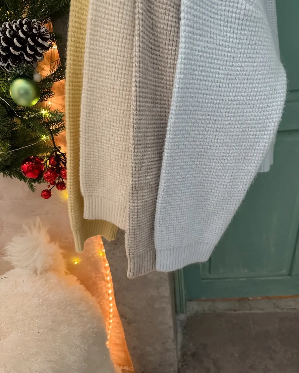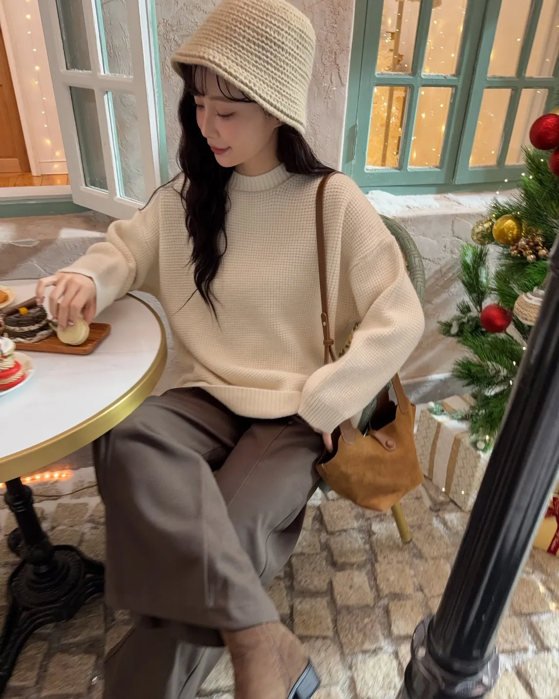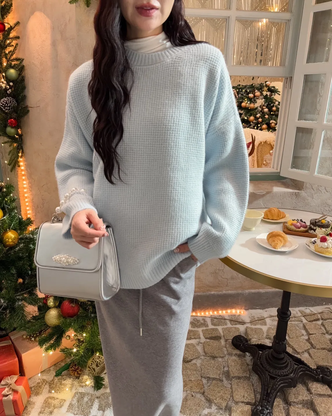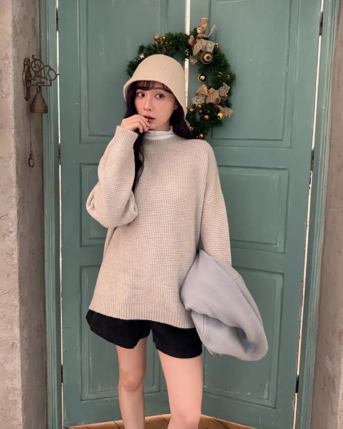 X0052鬆餅格寬鬆毛衣(米白/黃/淺藍/灰)