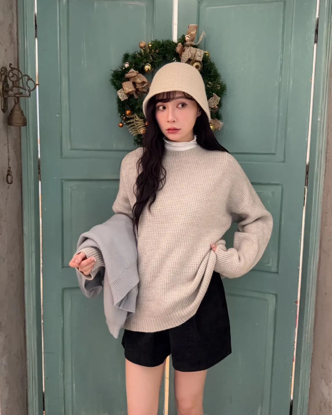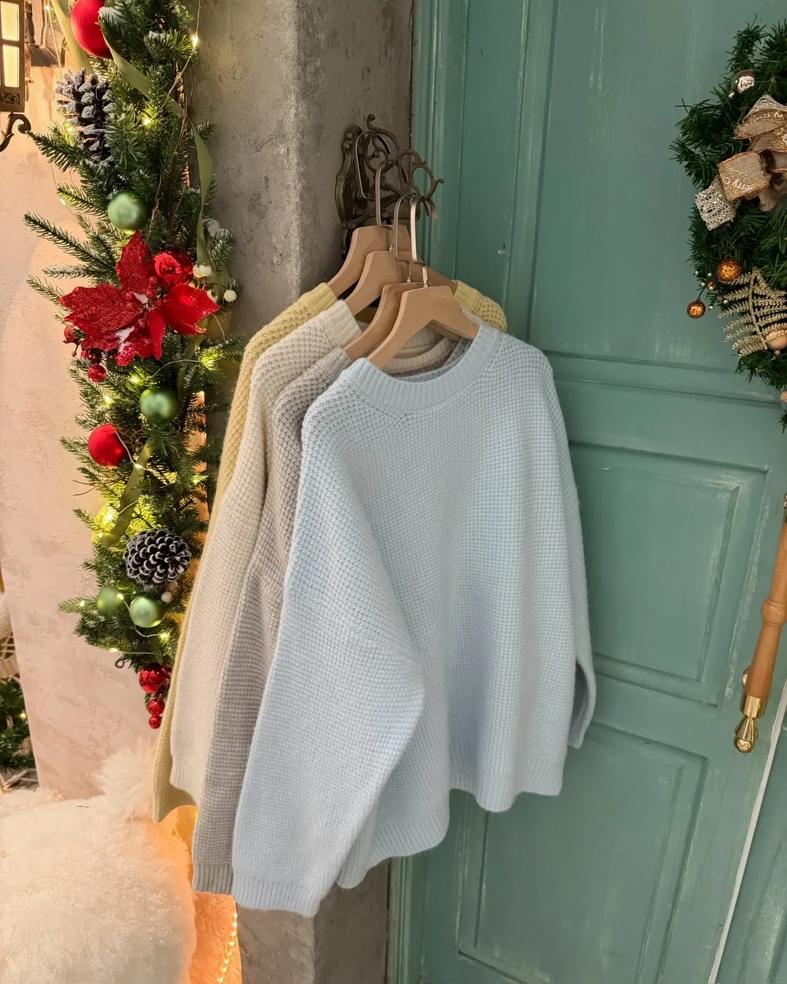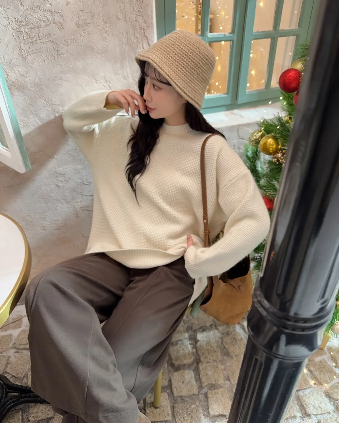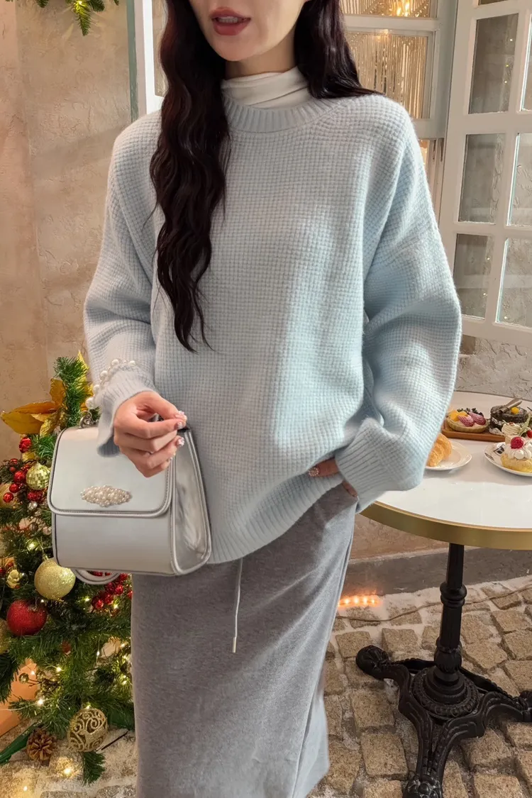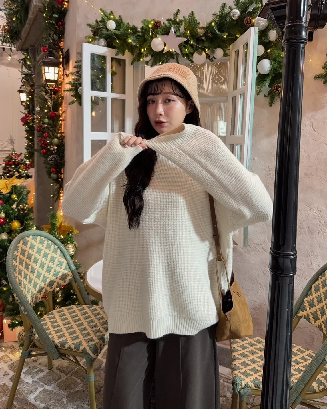 X0052鬆餅格寬鬆毛衣(米白/黃/淺藍/灰)