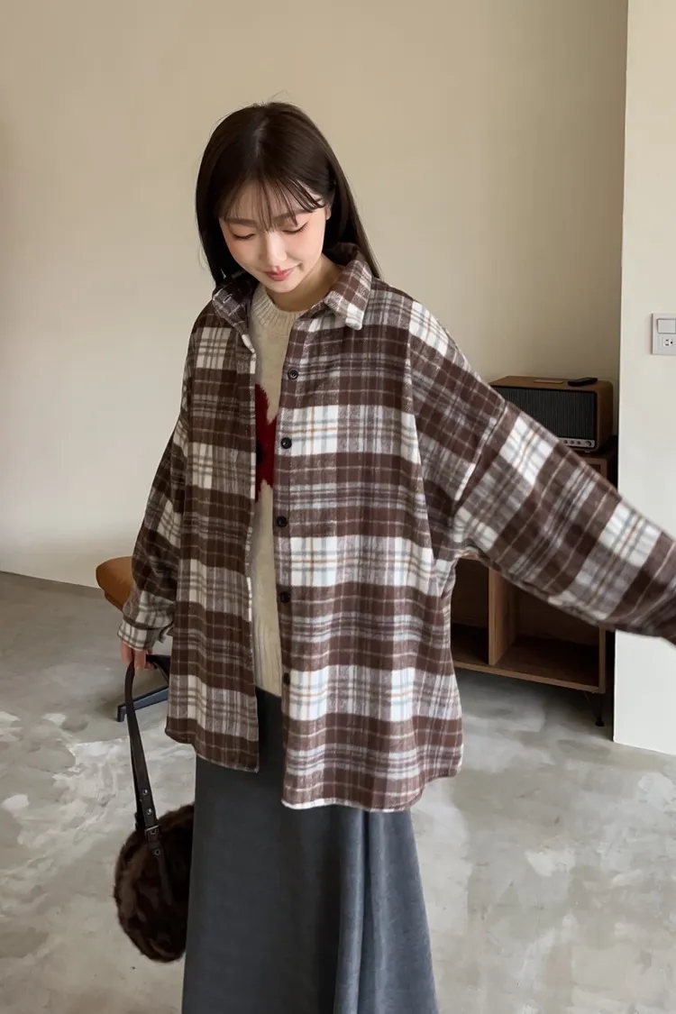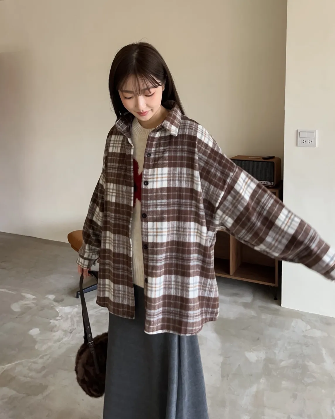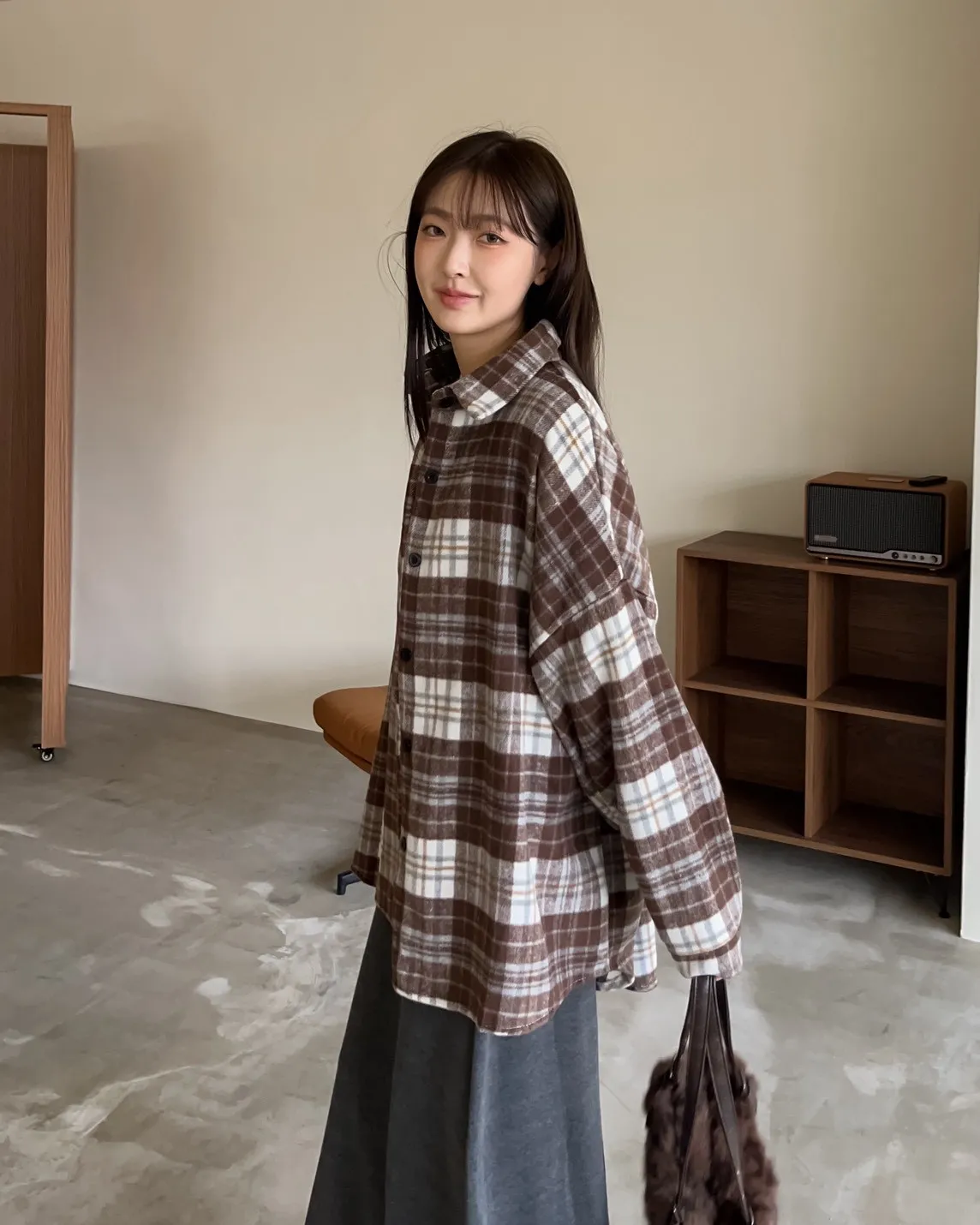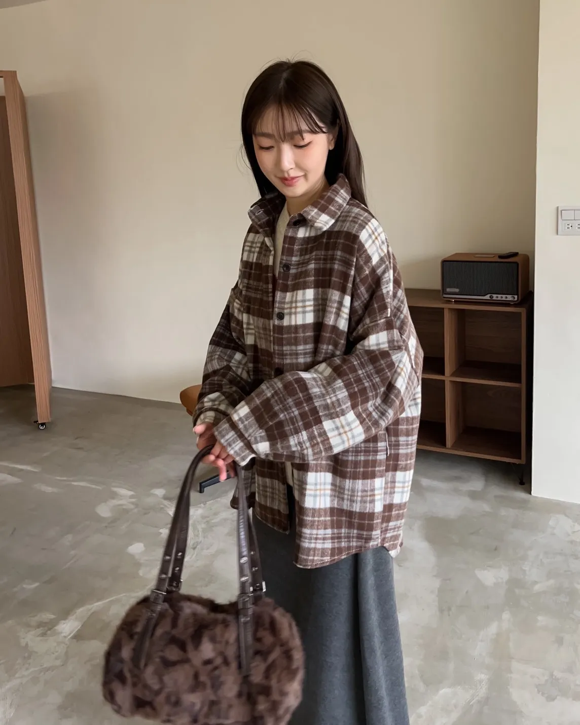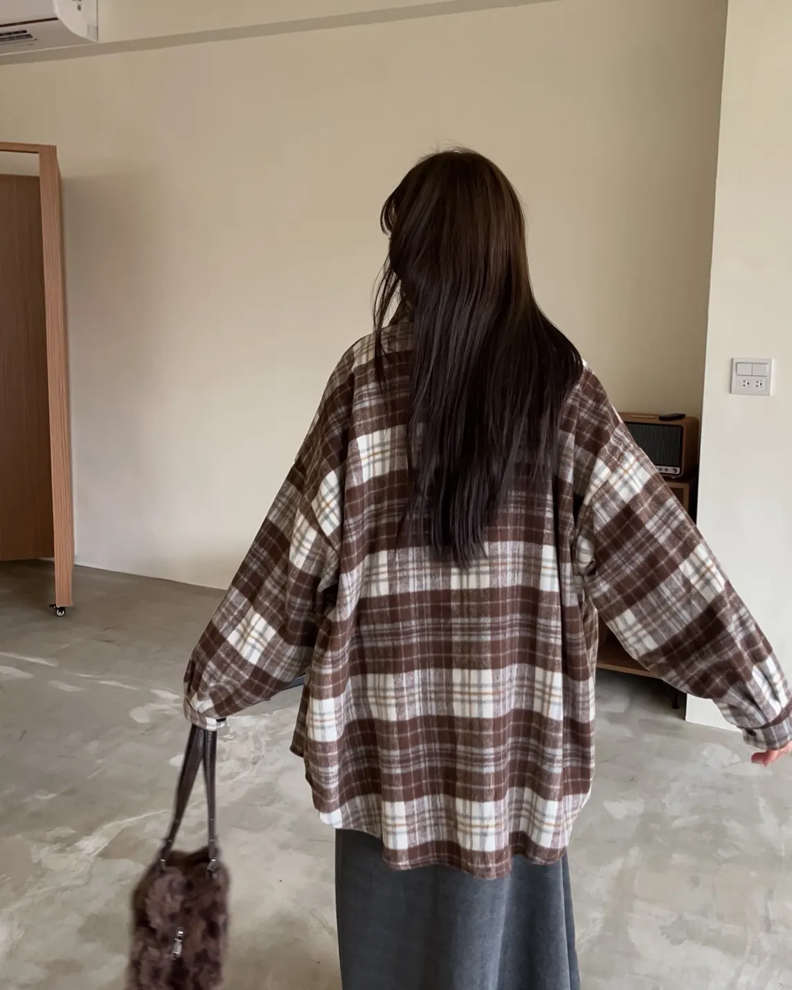 W0003格子控!!大件圓弧絨毛襯衫(淺咖啡/深咖啡/深灰)