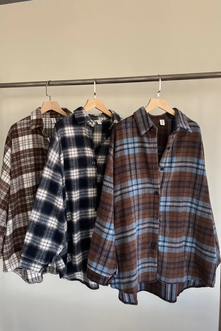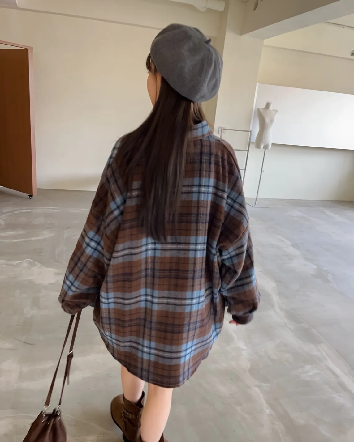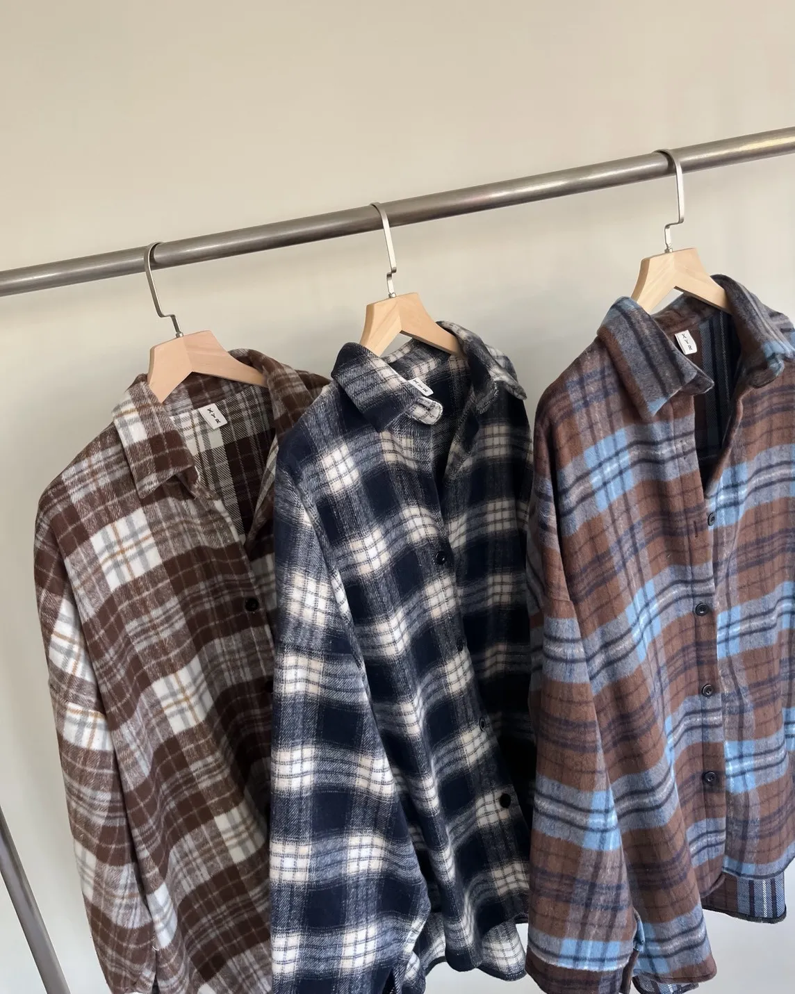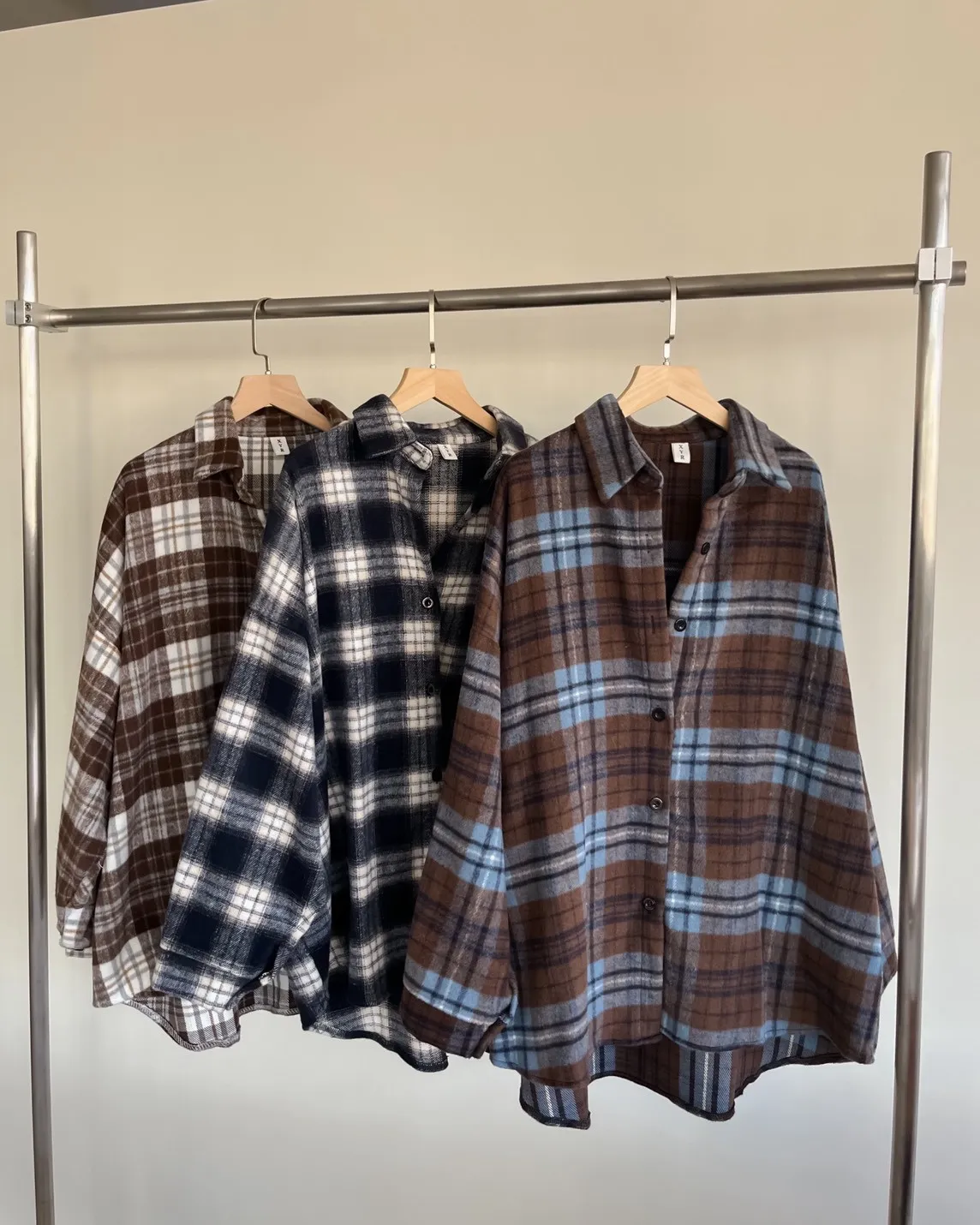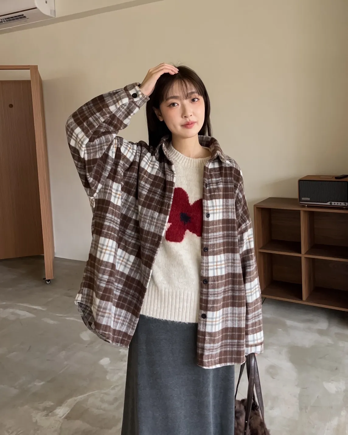 W0003格子控!!大件圓弧絨毛襯衫(淺咖啡/深咖啡/深灰)