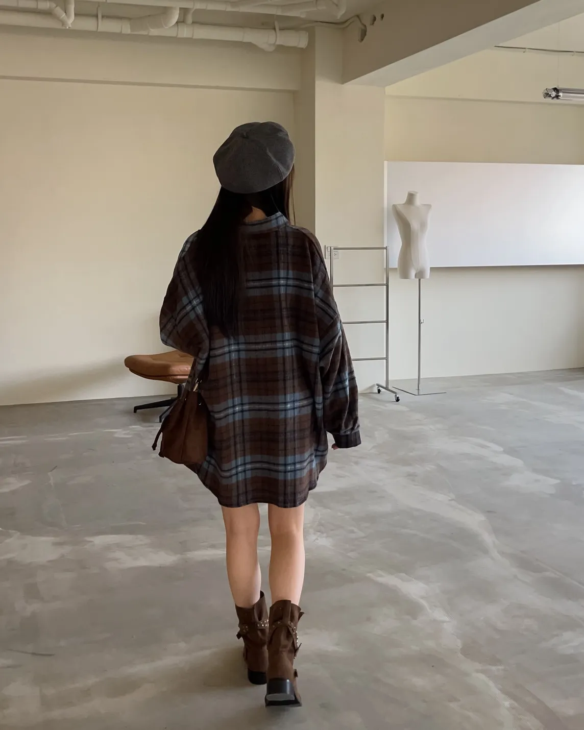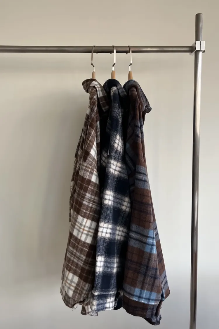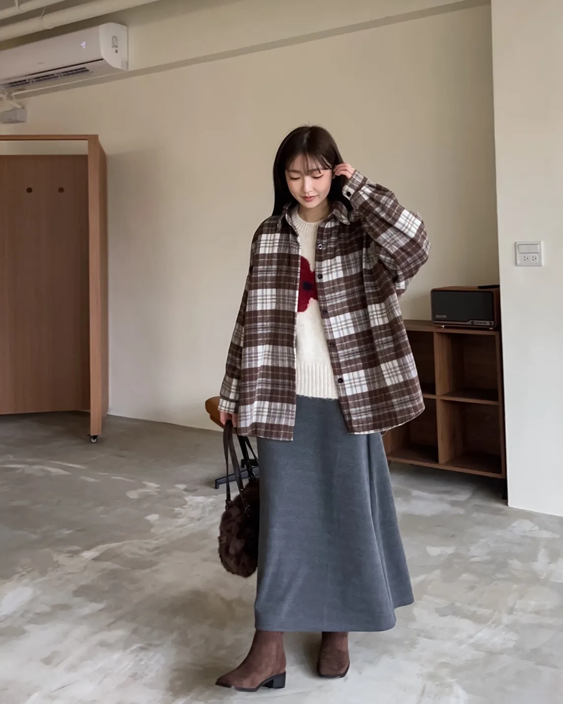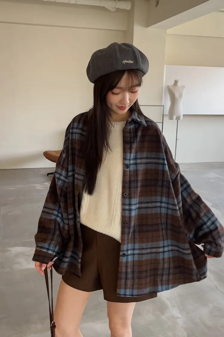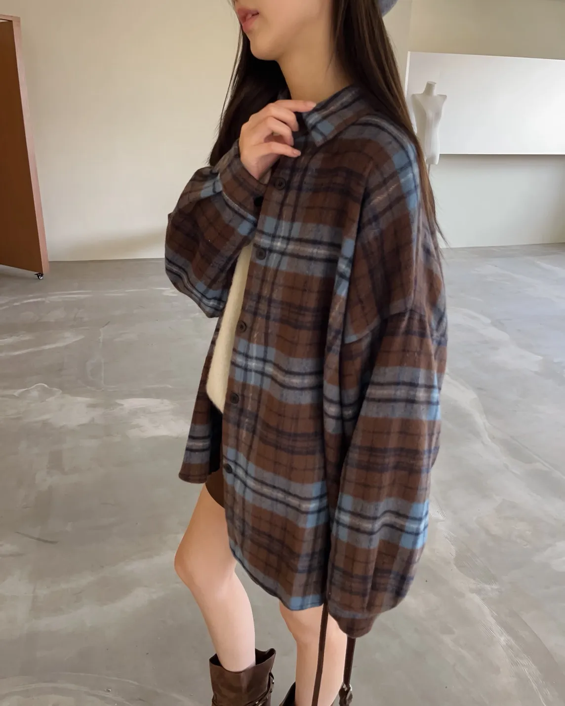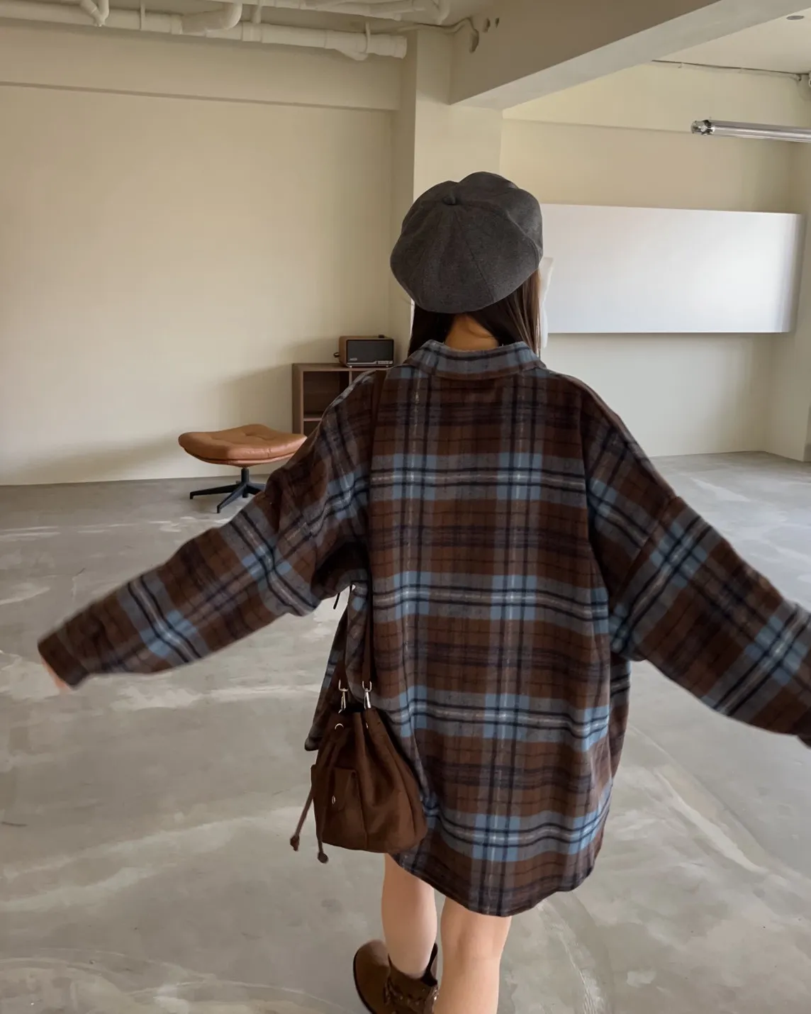 W0003格子控!!大件圓弧絨毛襯衫(淺咖啡/深咖啡/深灰)