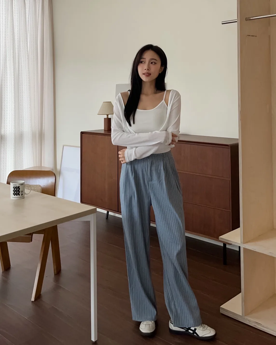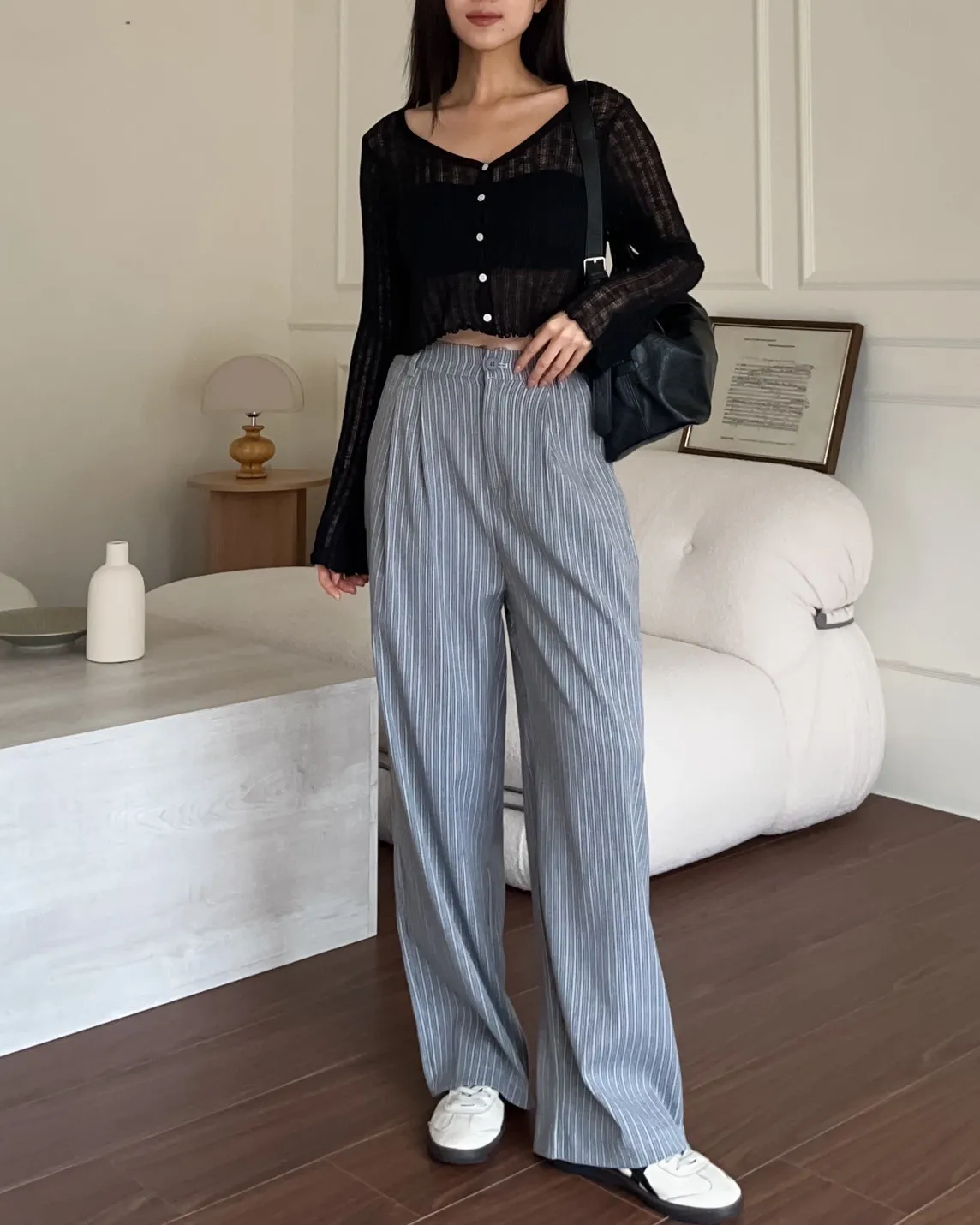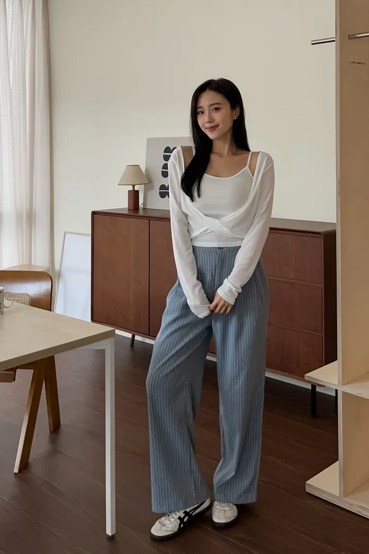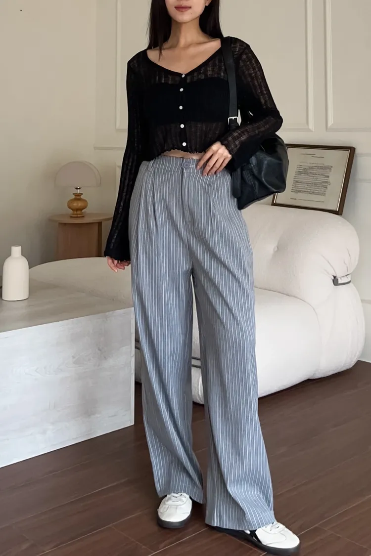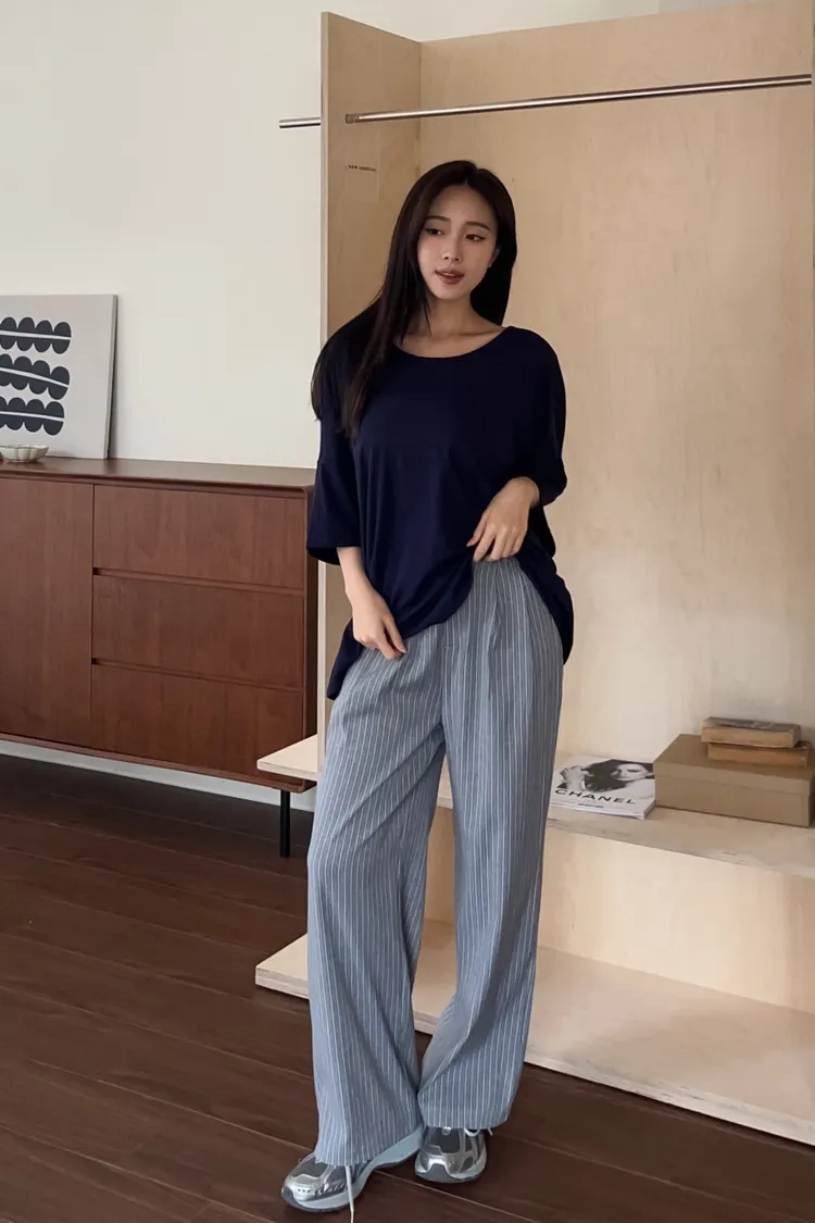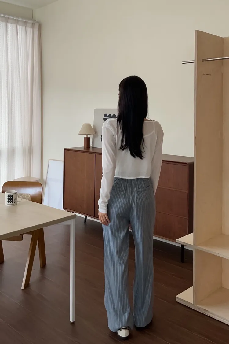 T0054細格後鬆緊西裝直筒褲(藍/灰)