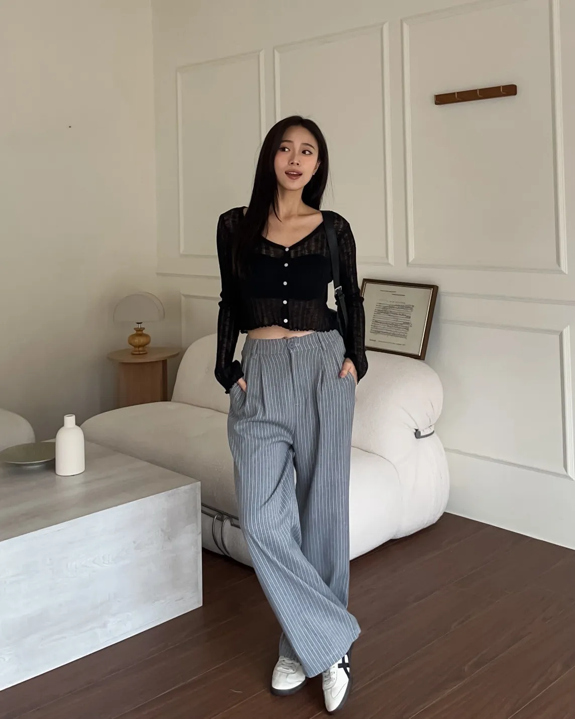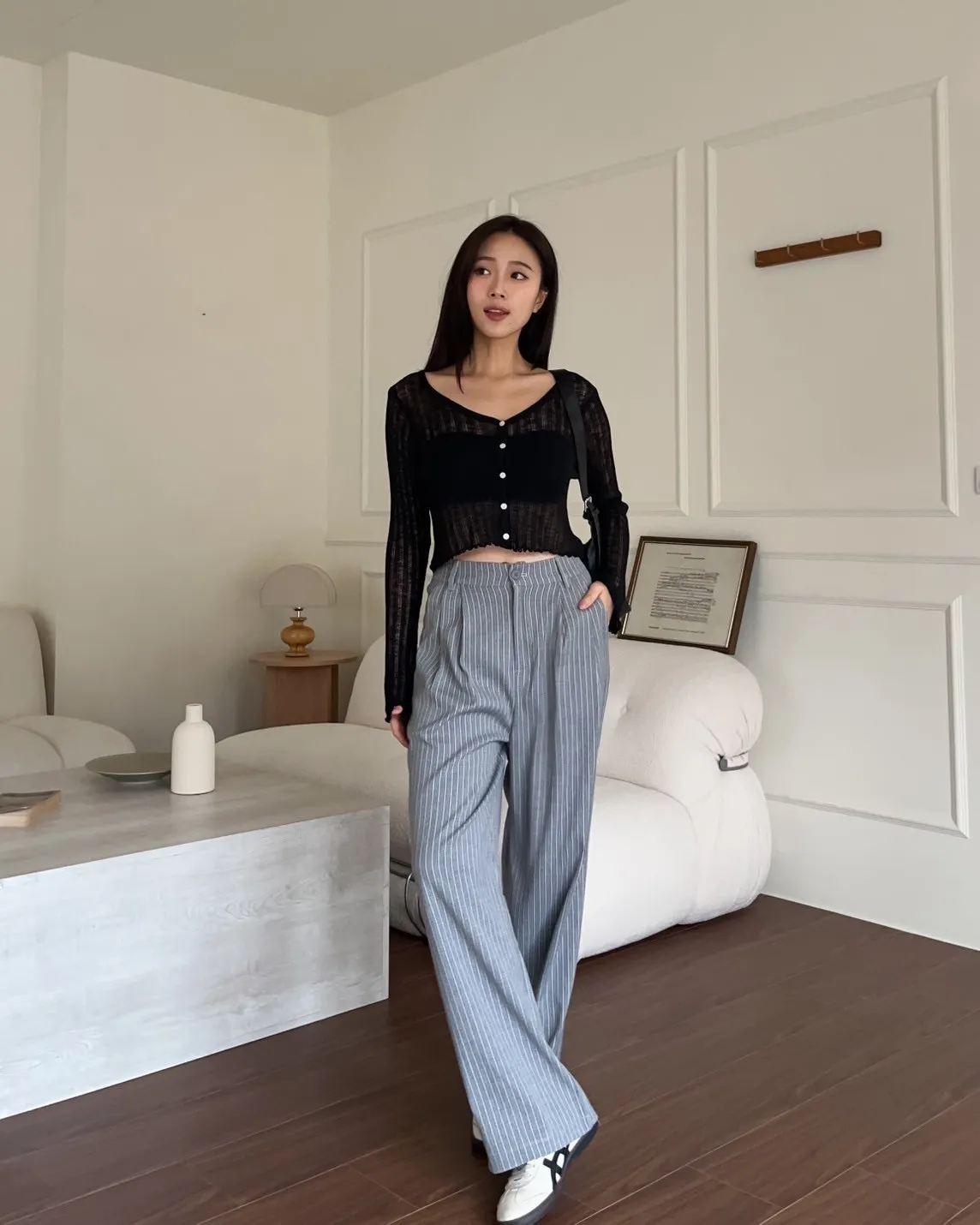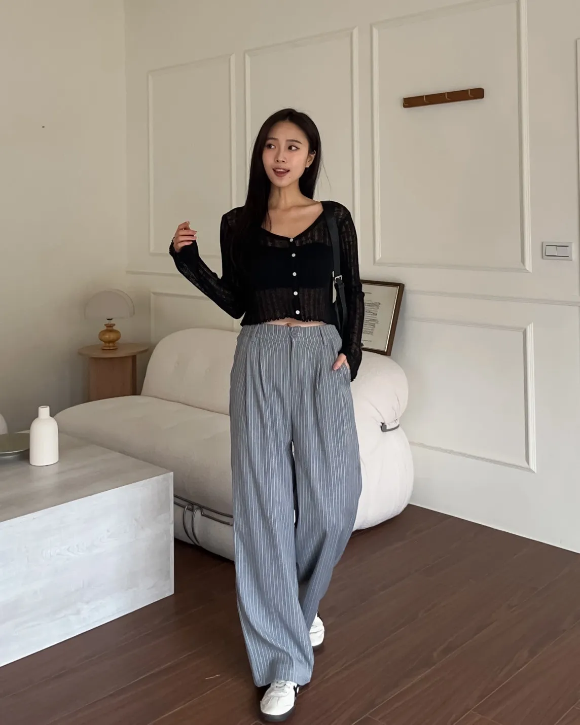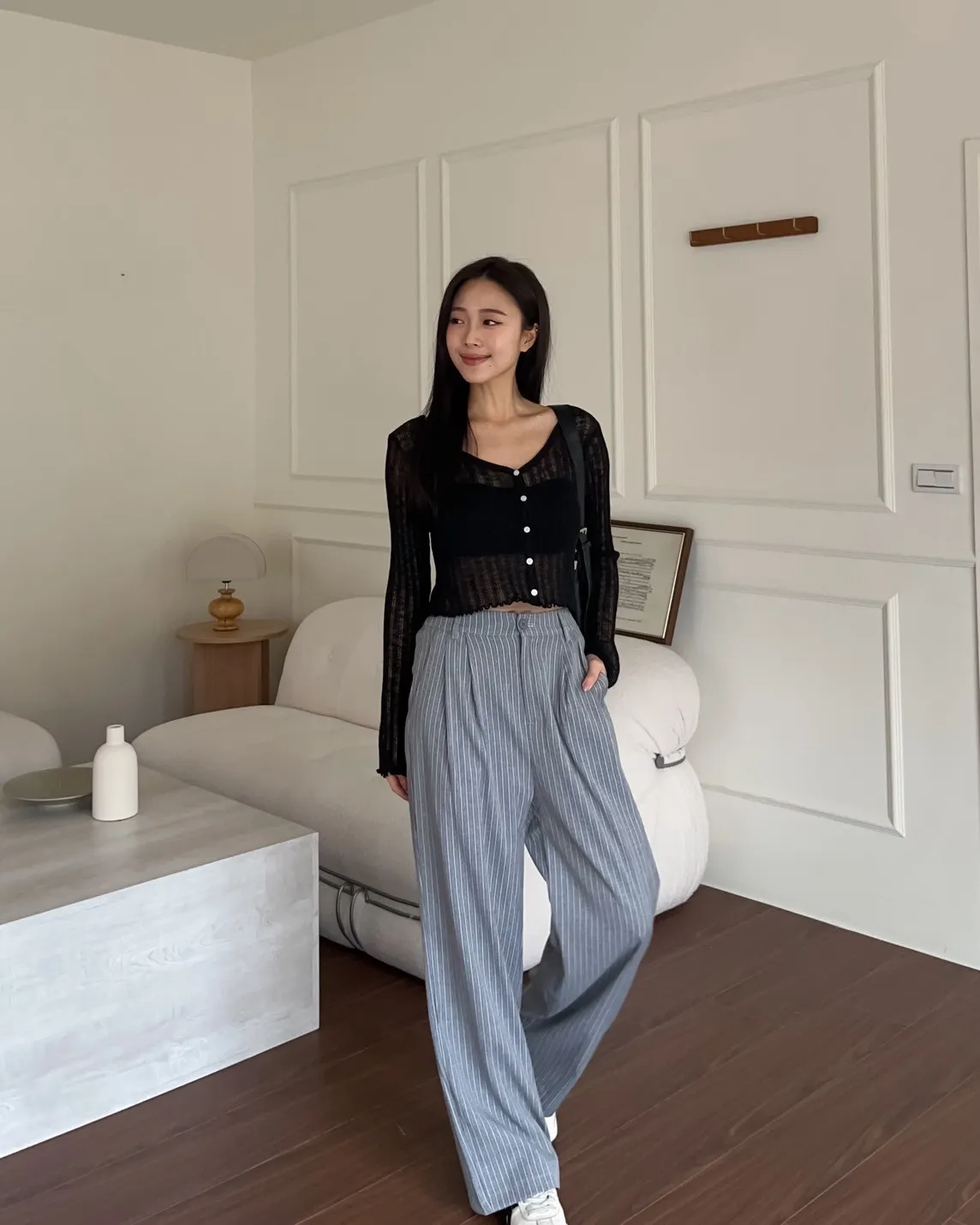 後鬆緊 建議尺寸S-小L 兩側口袋 後假口袋裝飾 前打折 細細格紋 布料本身無彈性