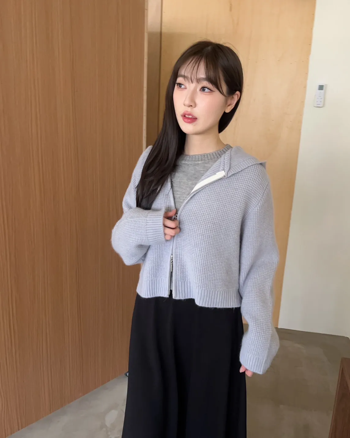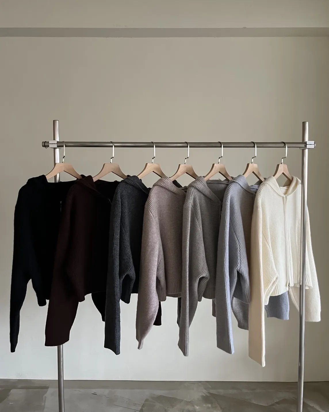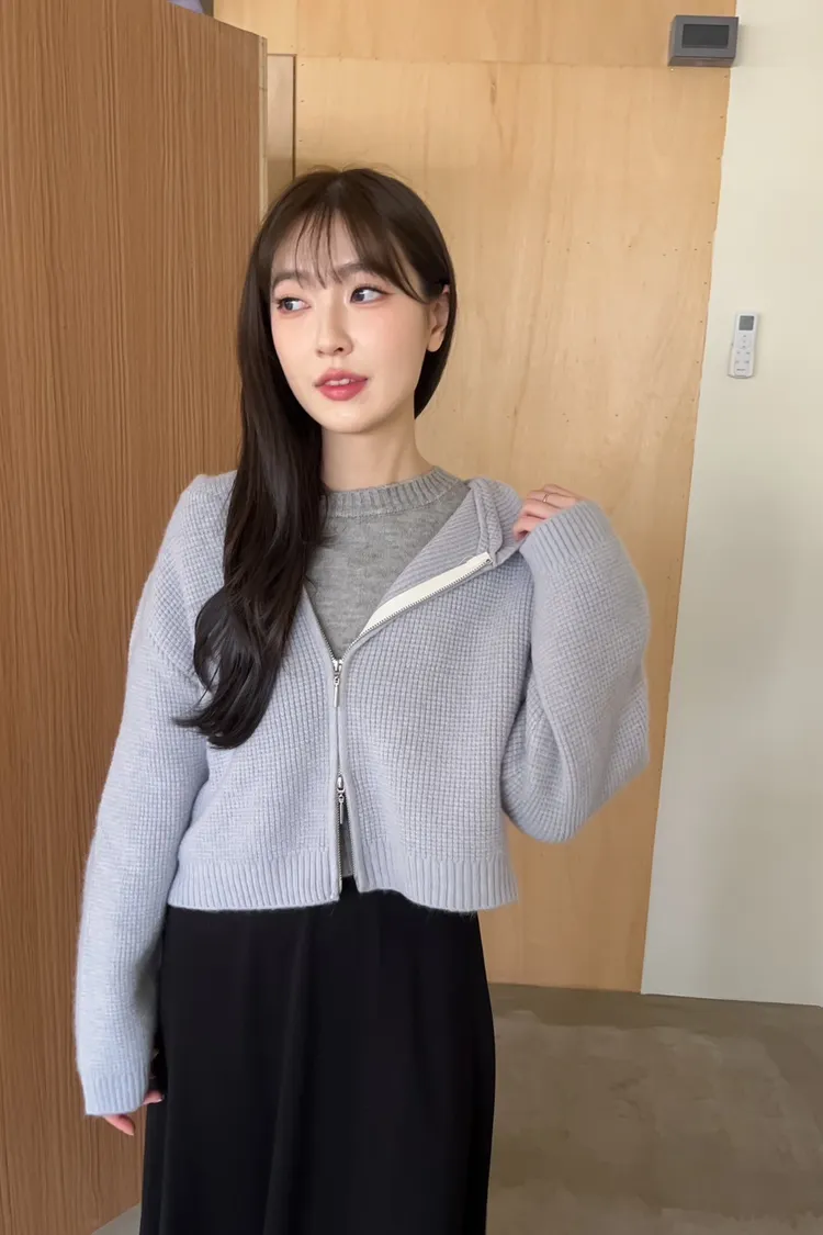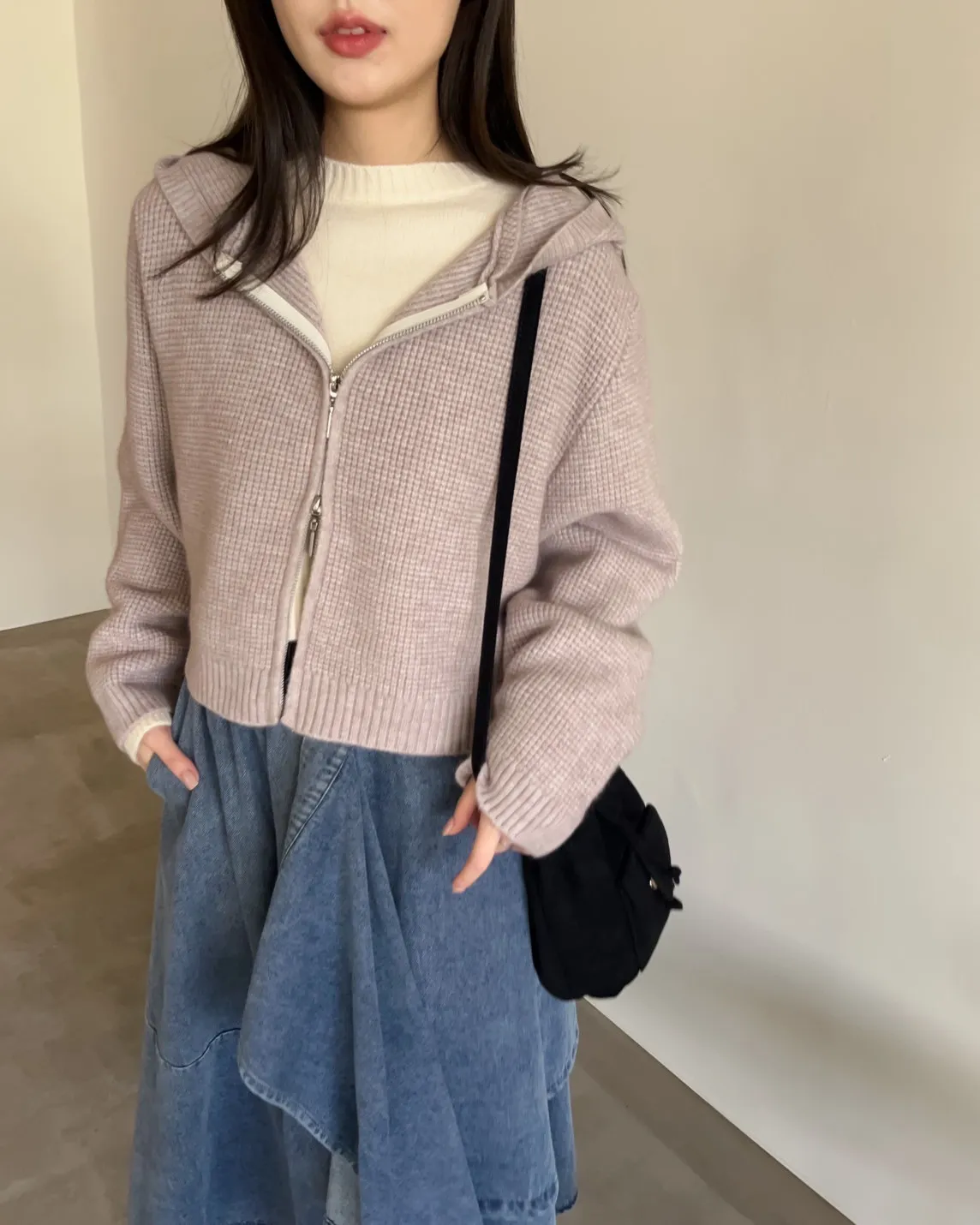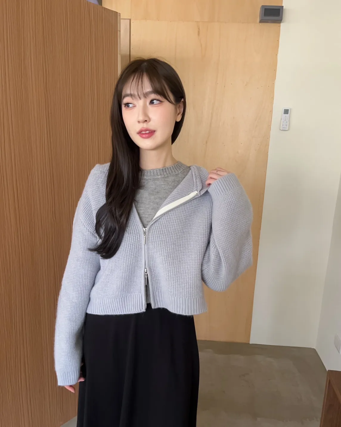 V0076(七色)華夫格雙拉鏈連帽針織外套(米白/咖啡/藍/粉紅/淺灰/深灰/黑)
