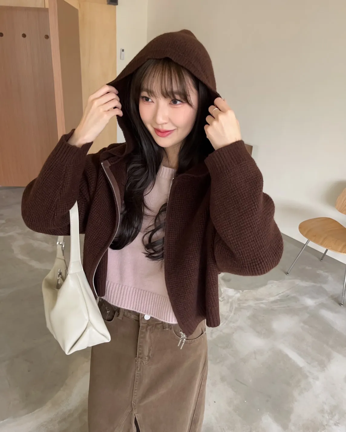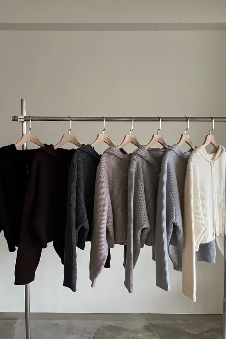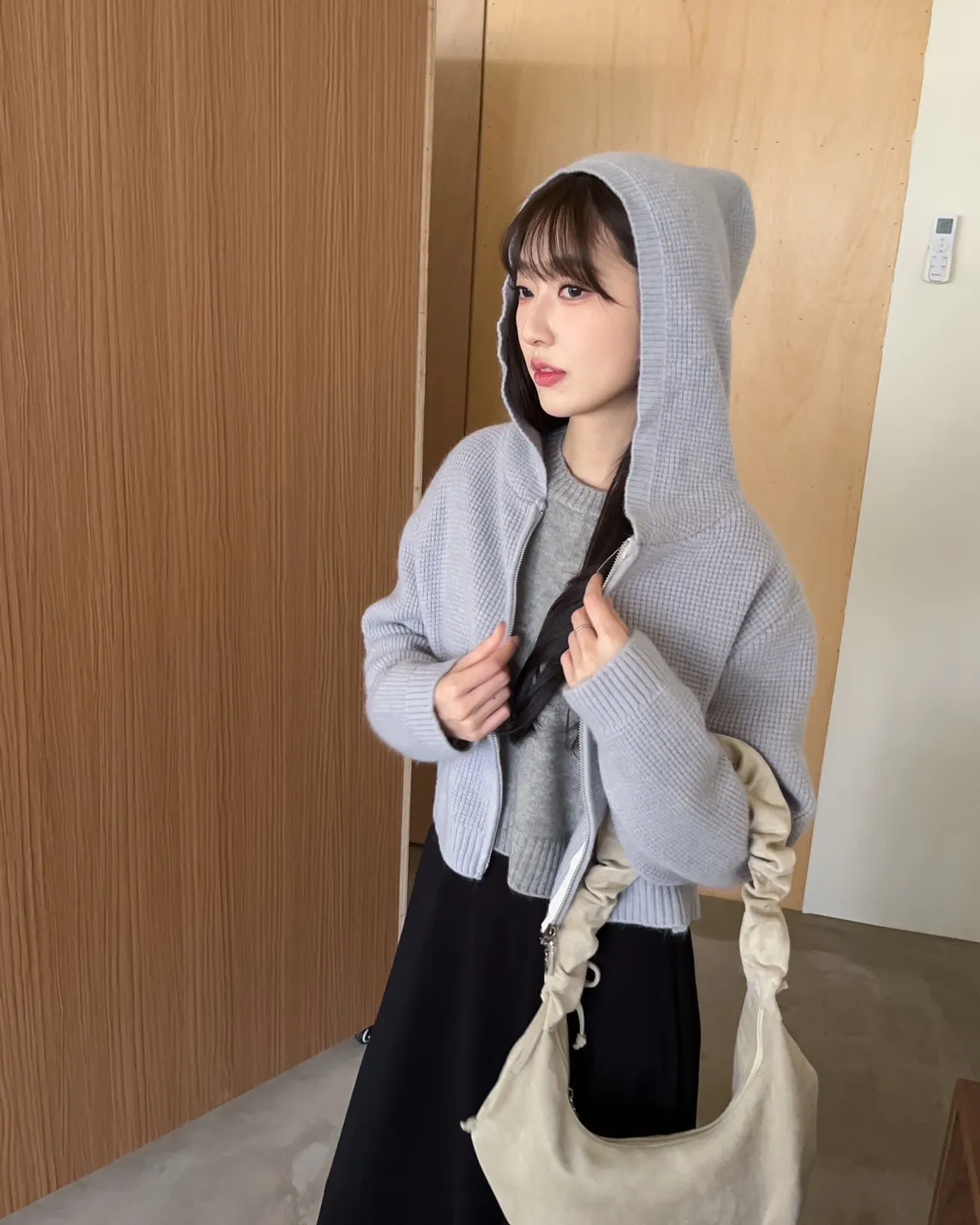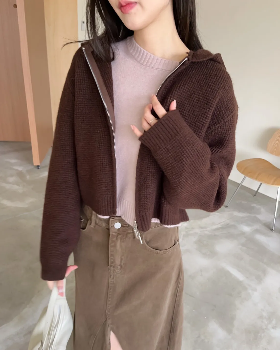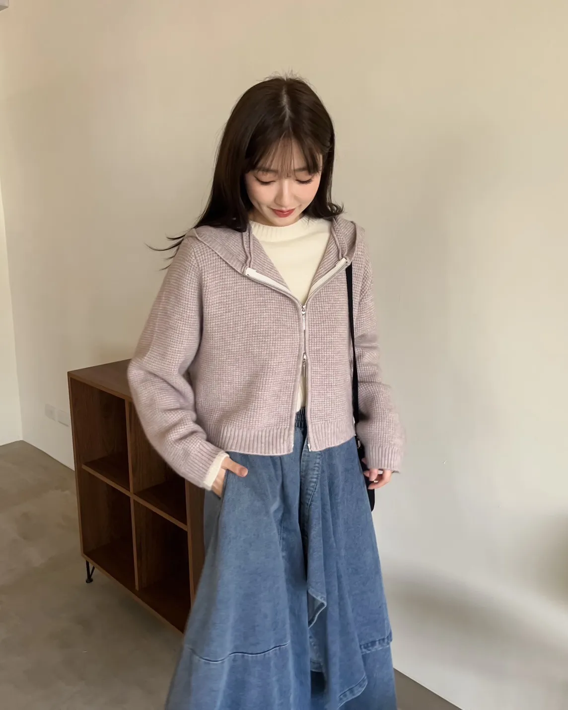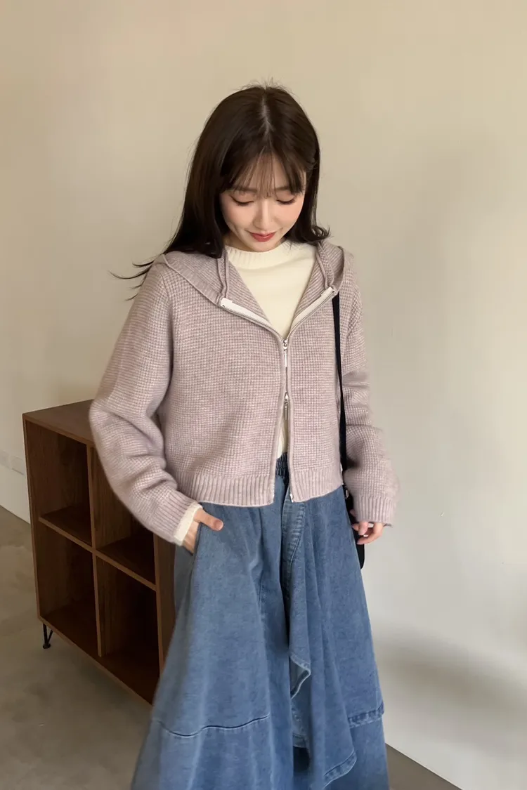 V0076(七色)華夫格雙拉鏈連帽針織外套(米白/咖啡/藍/粉紅/淺灰/深灰/黑)