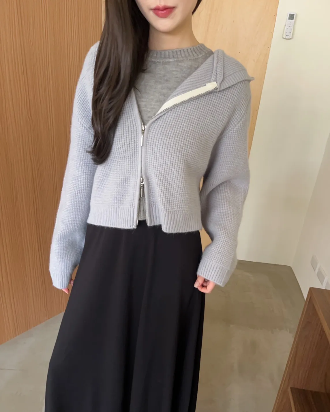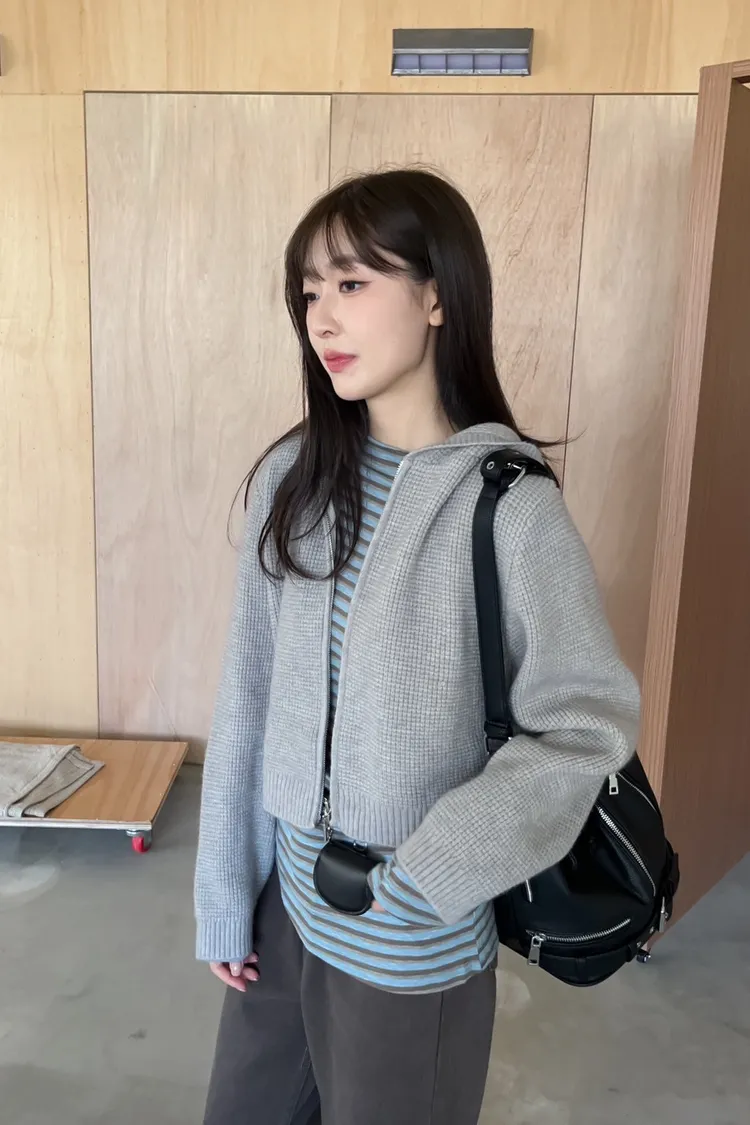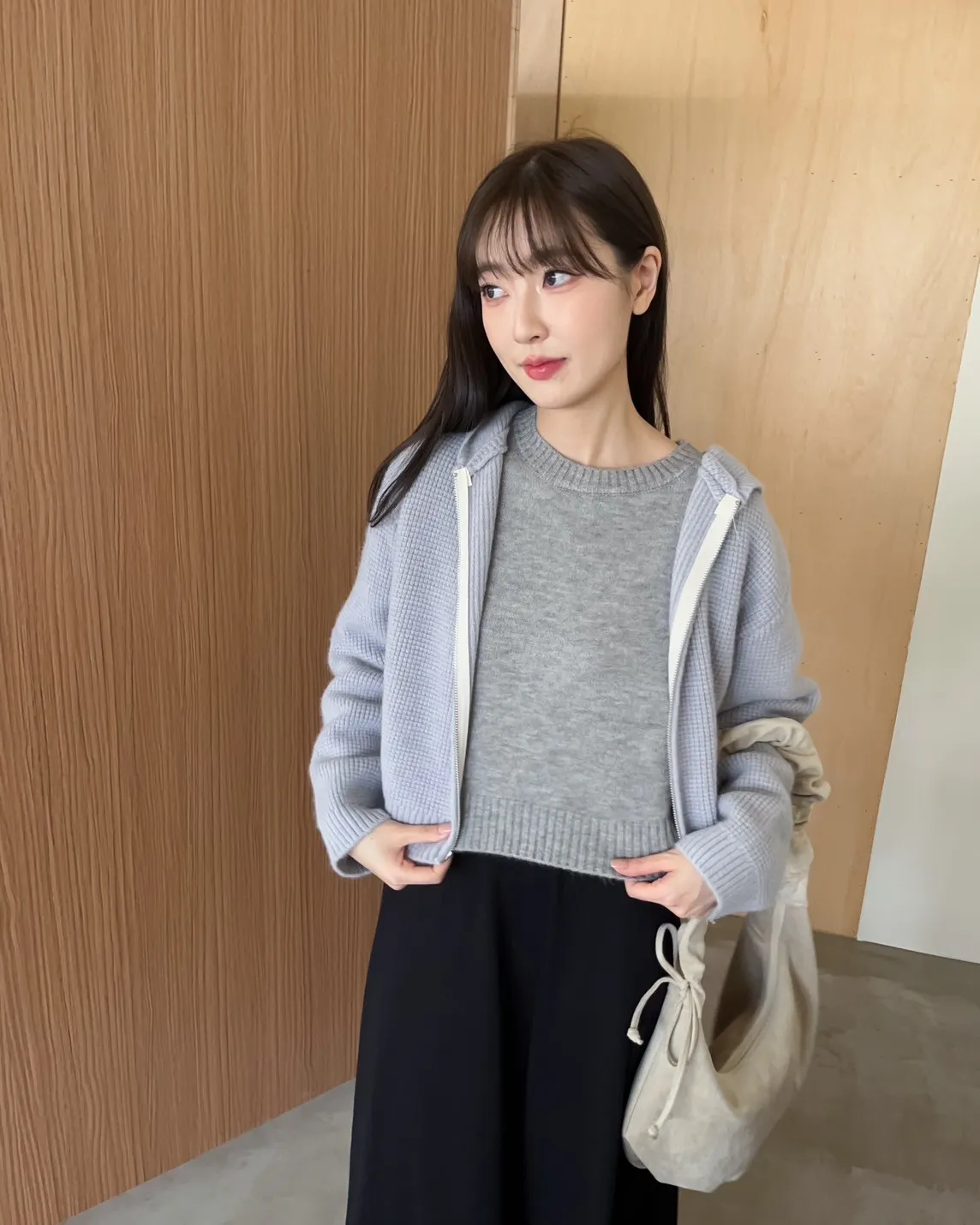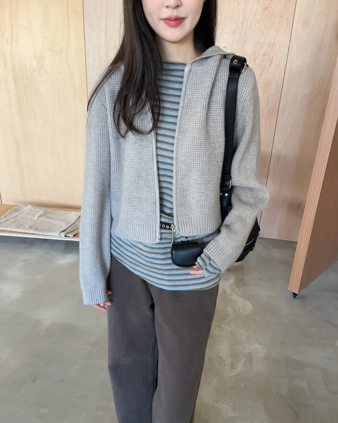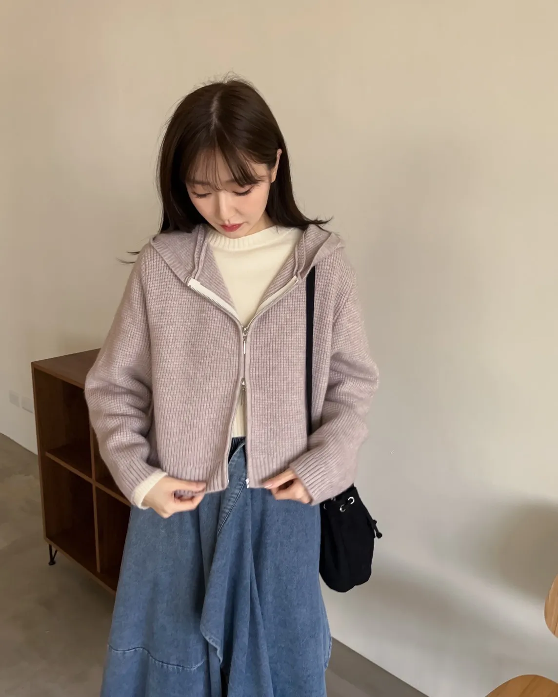 V0076(七色)華夫格雙拉鏈連帽針織外套(米白/咖啡/藍/粉紅/淺灰/深灰/黑)