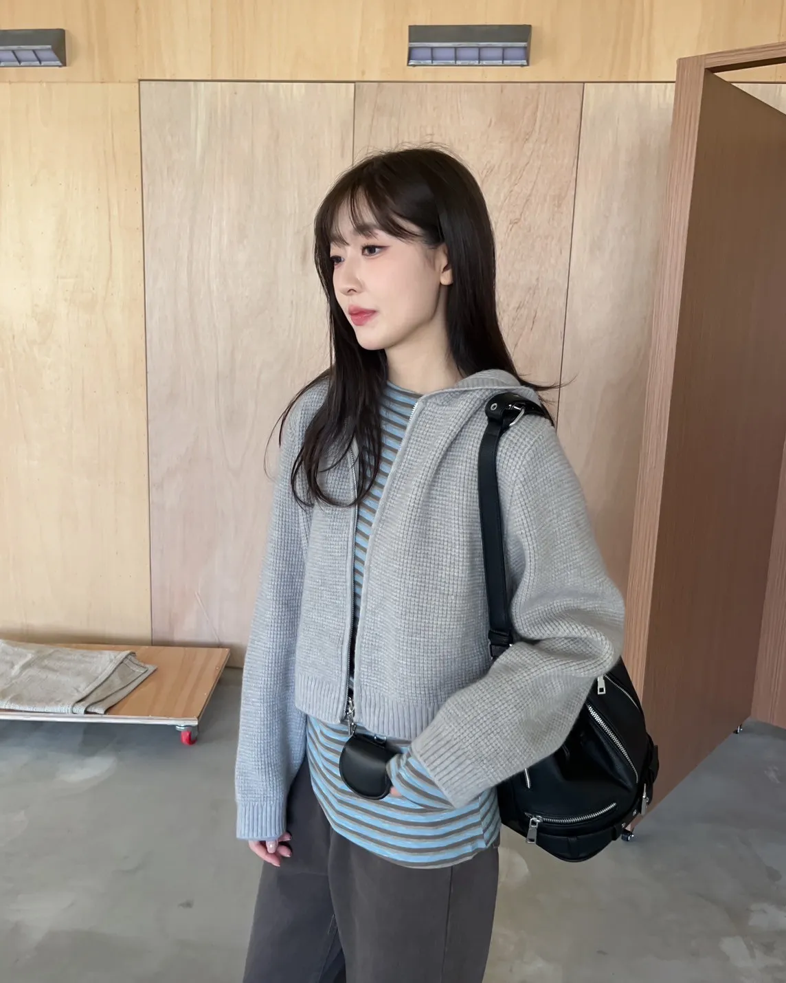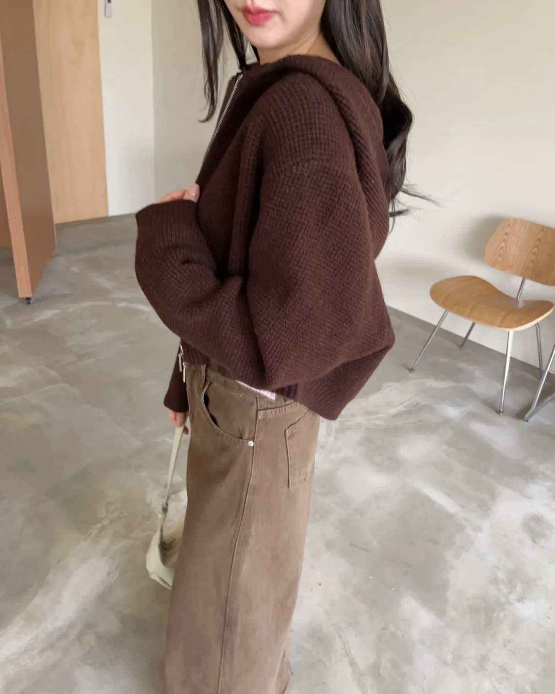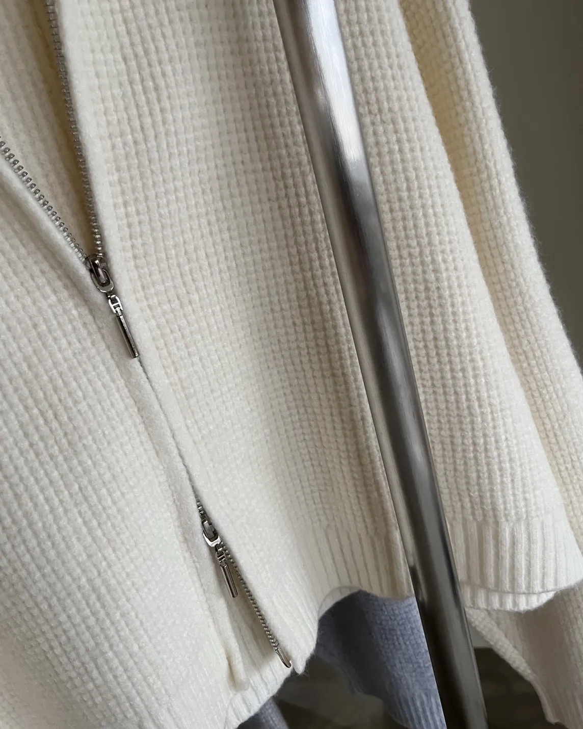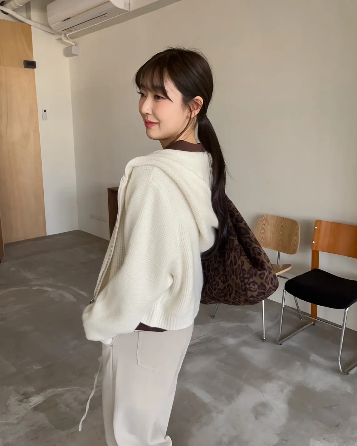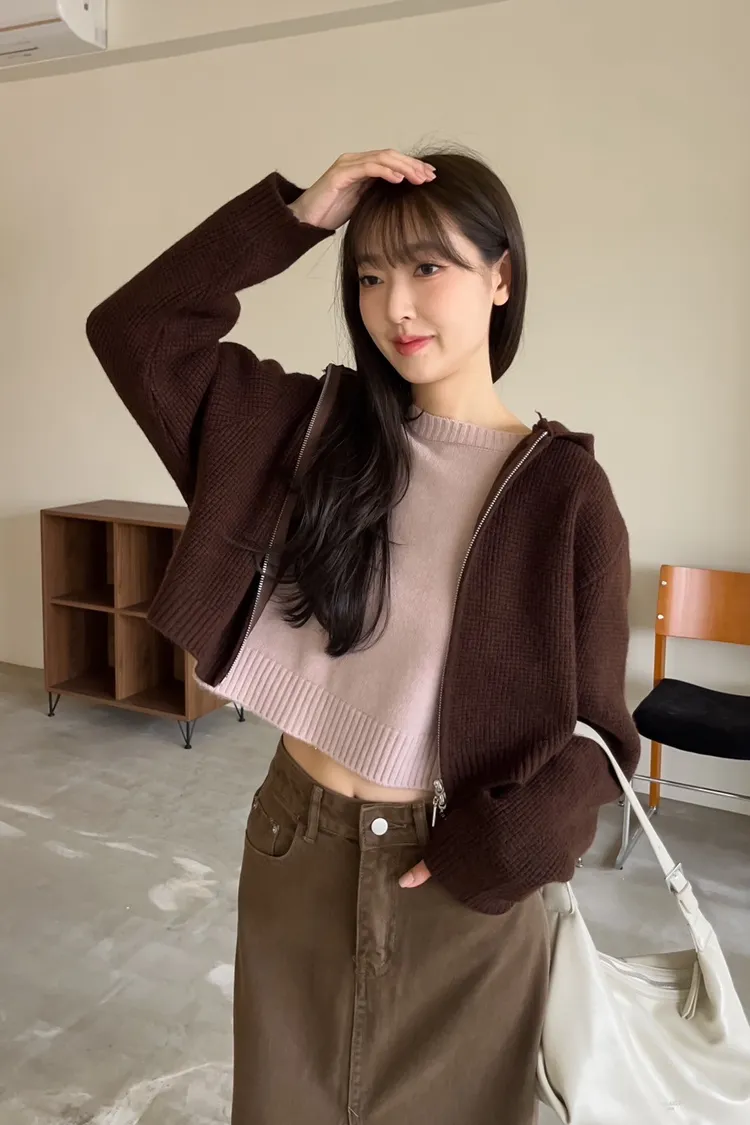 V0076(七色)華夫格雙拉鏈連帽針織外套(米白/咖啡/藍/粉紅/淺灰/深灰/黑)